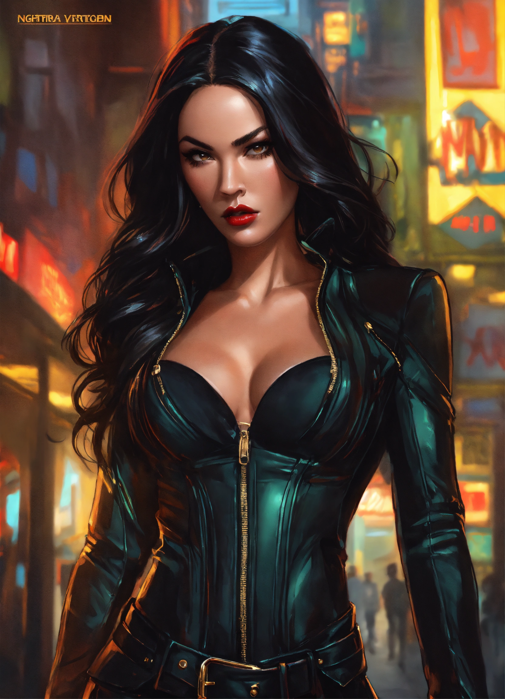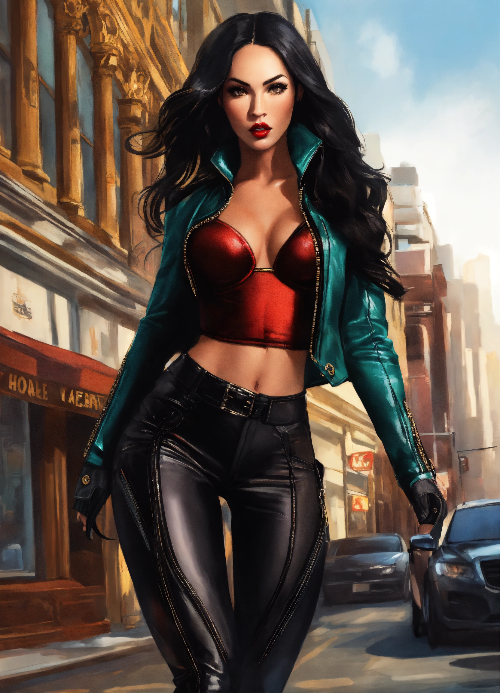 Concept art of beautiful woman, megan fox, tan skin, realistic, gold eyes, very long waist length long curled black hair, sabine rich, artgerm, j scott campbell, artgerm, full body, perfect body, black tight fitted leather jacket, detailed, intricate, beautiful, very low cut neckline, fitted, tight black pants, knee high black tight fitted stiletto high heel boots, round face, slim nose, long black eyelashes, red lips, perfect detailed face, realistic, cinematic, full body, low cut black lace crop top, very long loose curled hair, honey birdette, black lacy crop top, victoria secret top, attractive, lace, nightwear, yandy, black lace, honey birdette outfit, tight fitted, voluminous long flowing dark black hair, red honey birdette crop top, bustier, tight black pants, knee high boots, turquoise city background, fitted, shimmer lace, baddie, selina kyle, honey birdette top, leather heel boots, mazikeen smith outfit, standing, lace bodysuit, walking down street, mazikeen