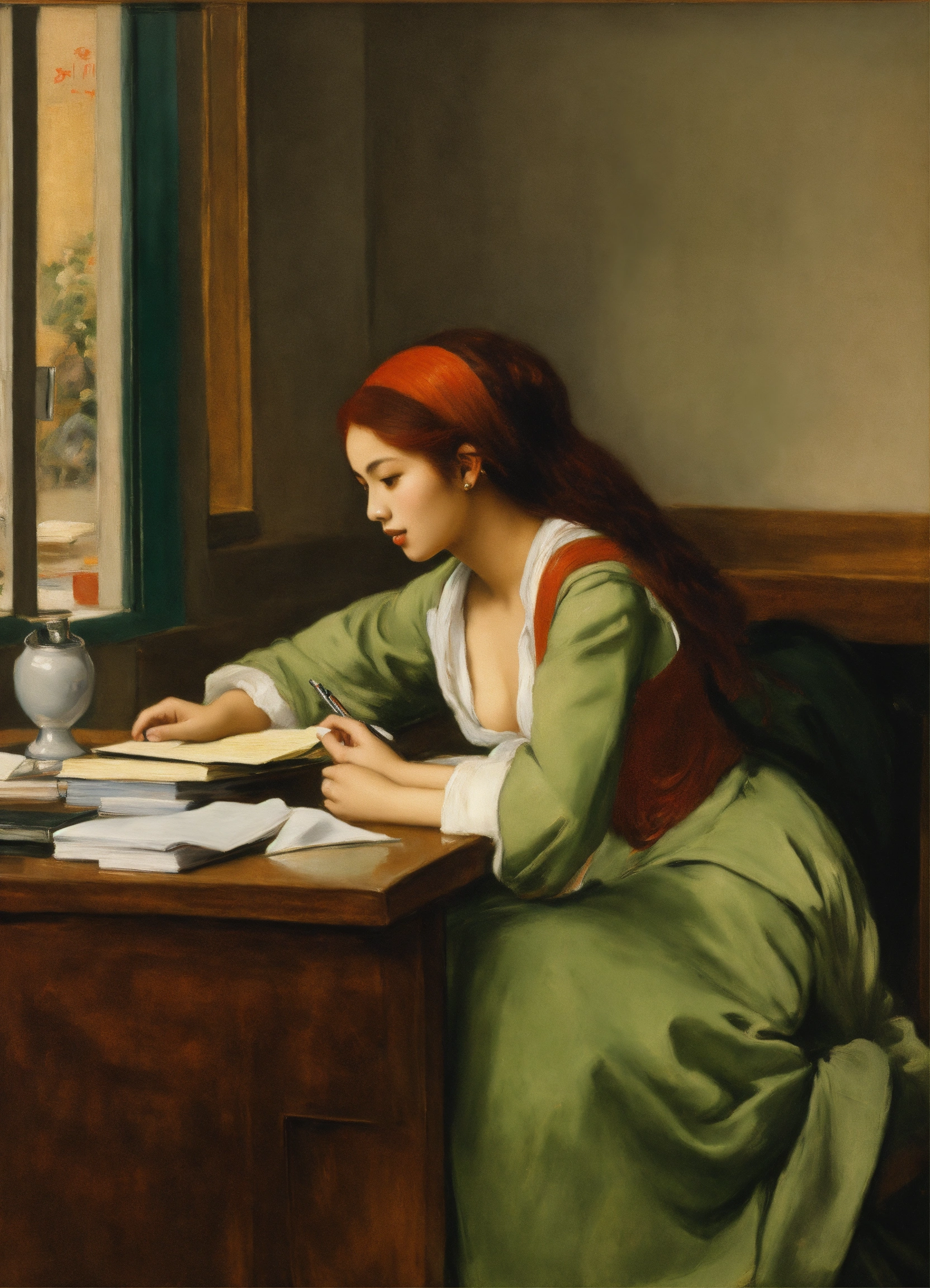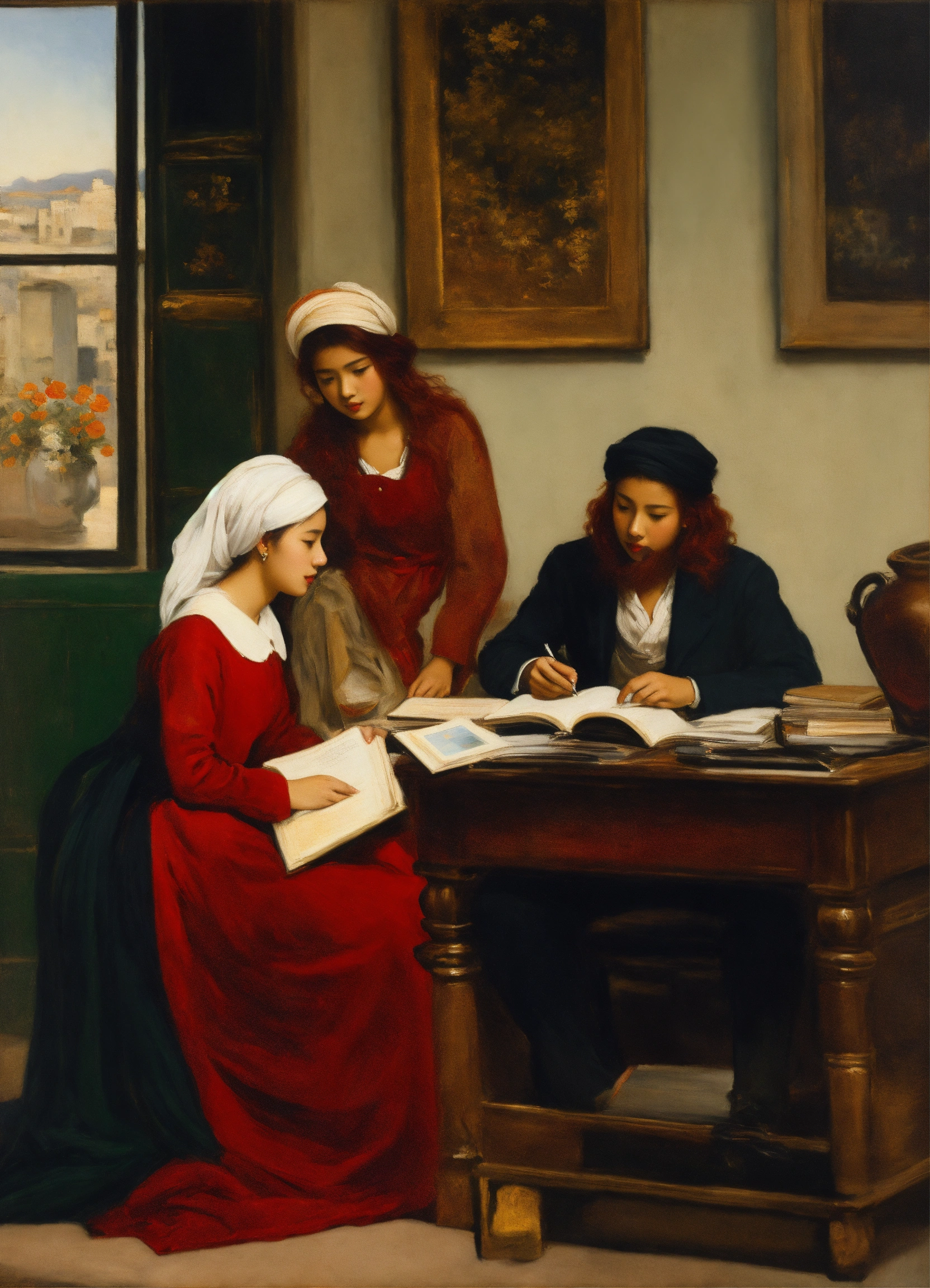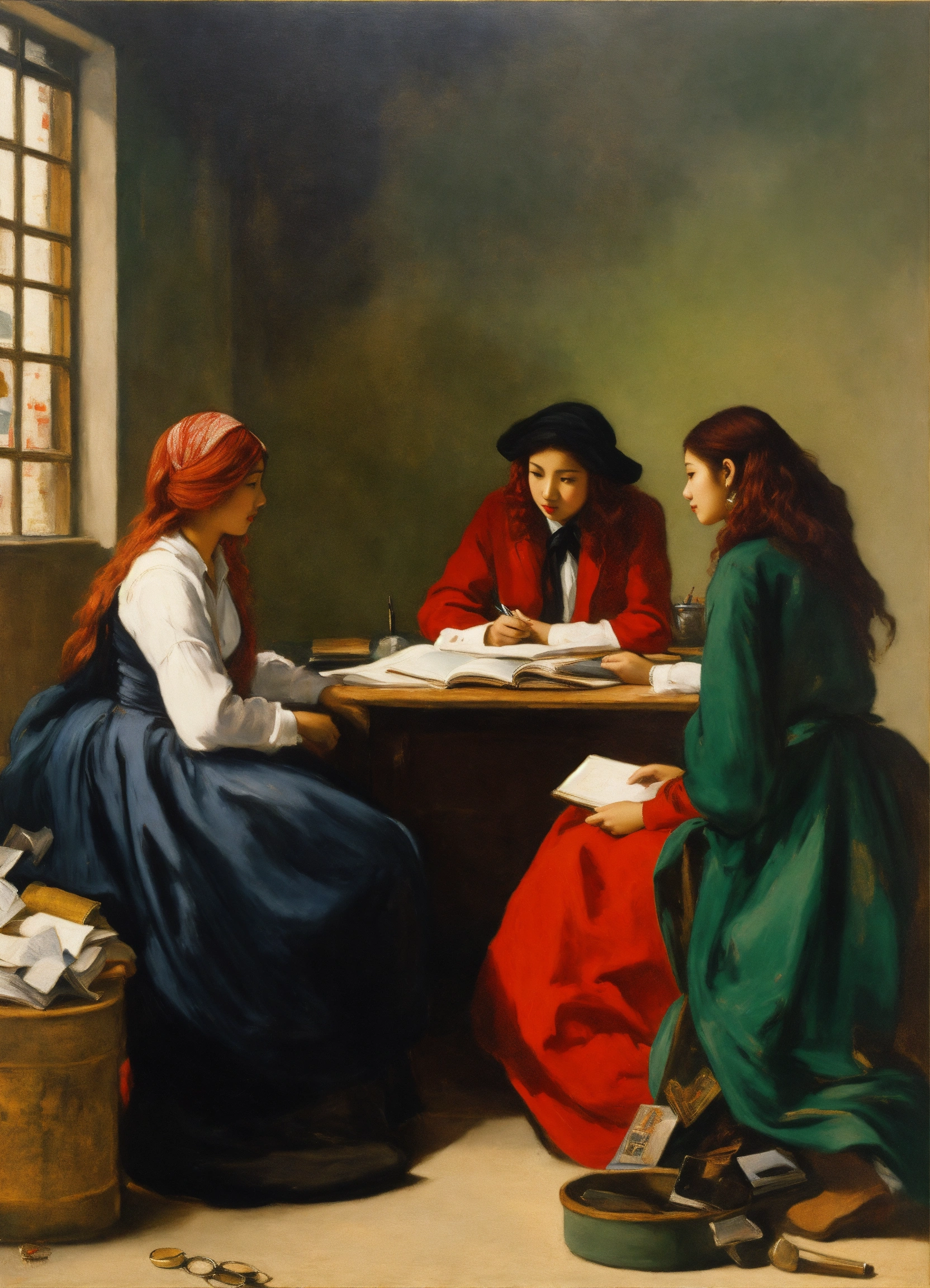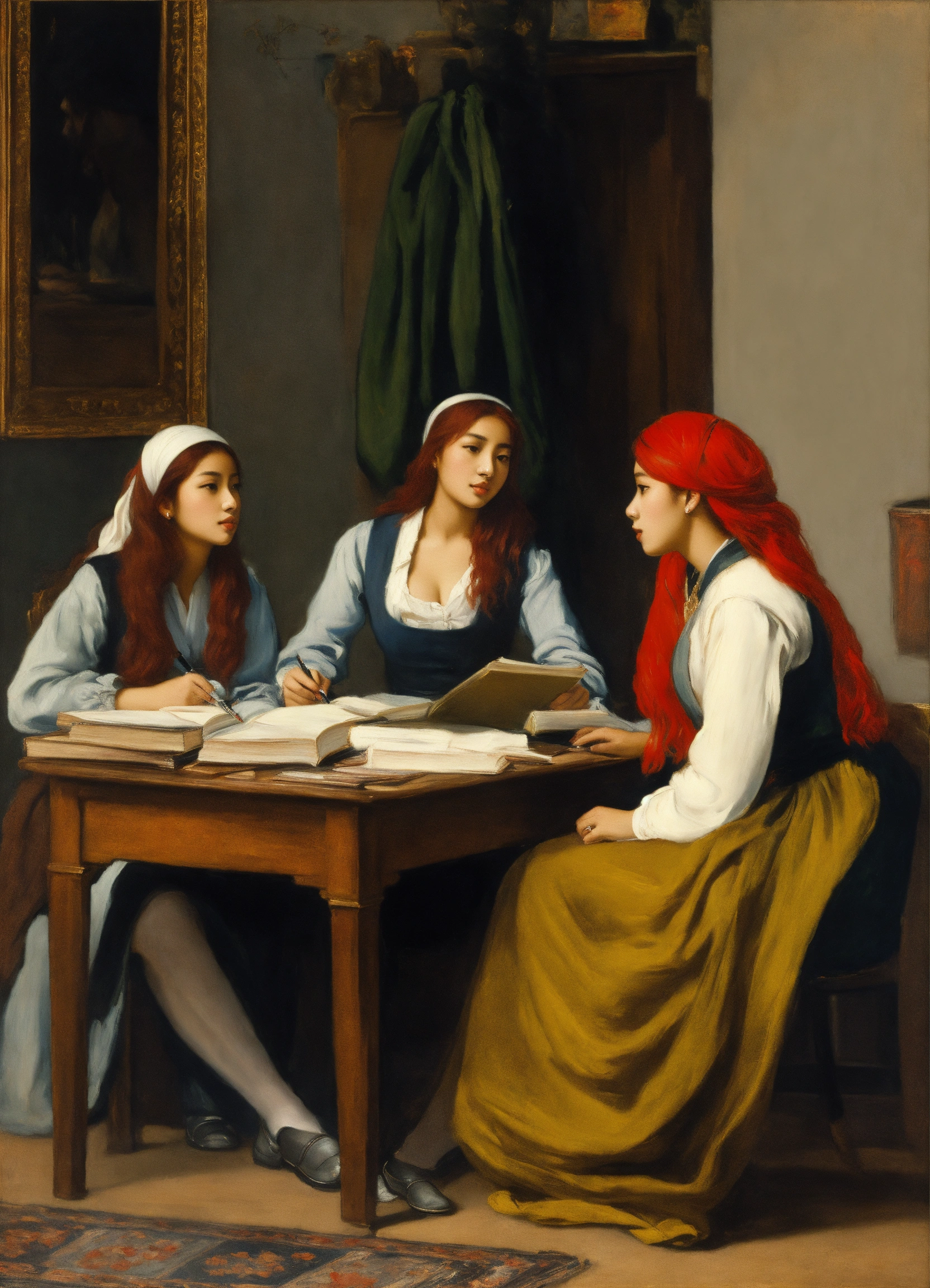 Artwork by gustave courbet middle eastern young woman sitting and talking french girl with red hair and white skin asian woman and young male accountant in office