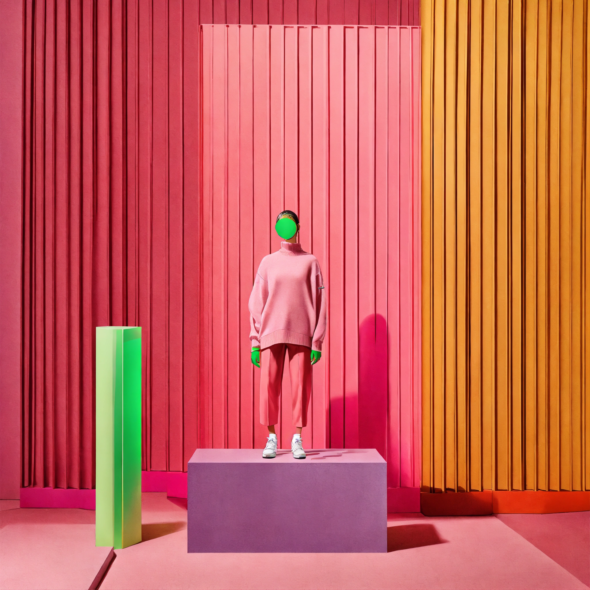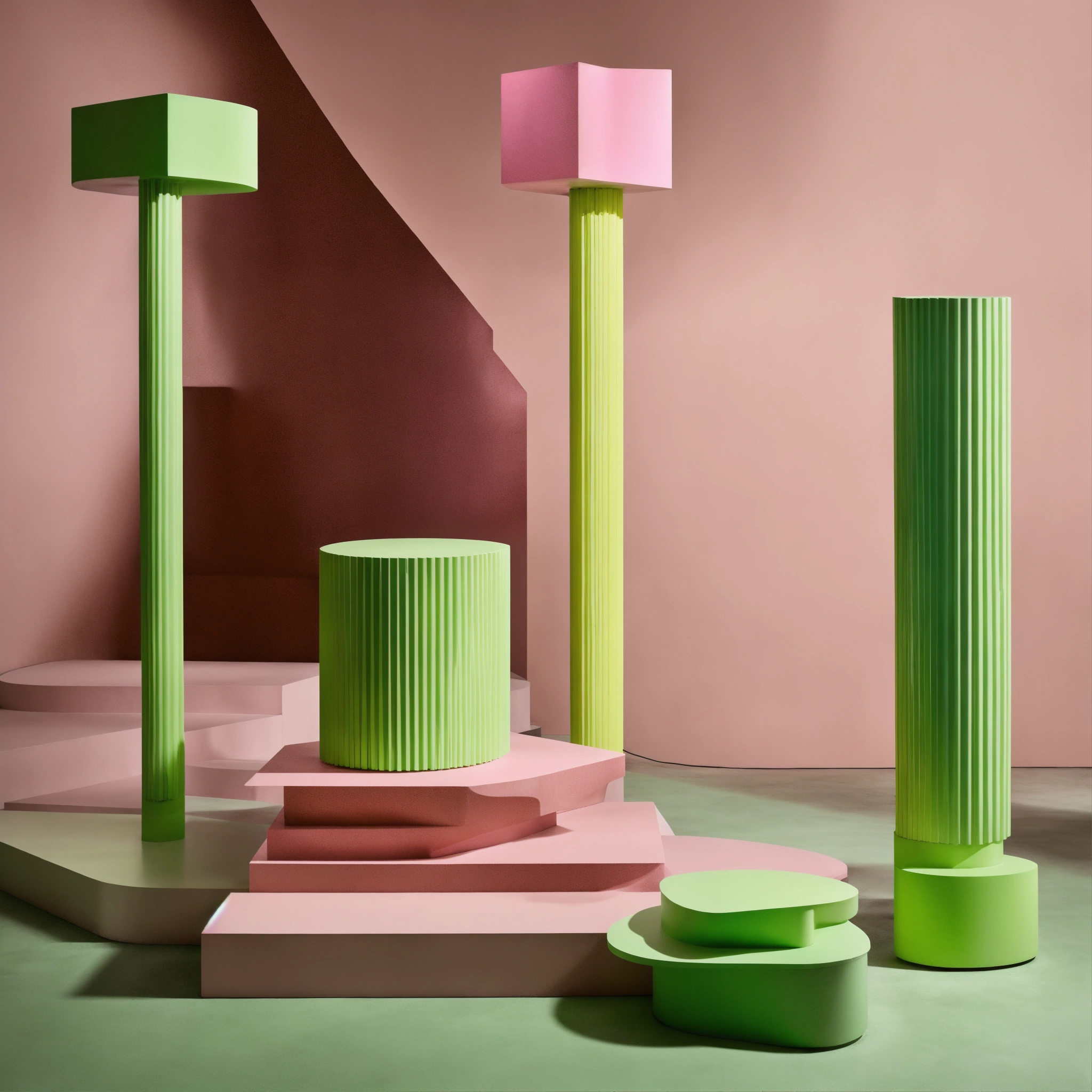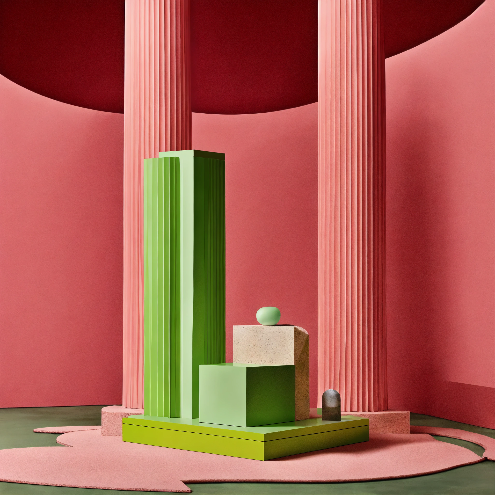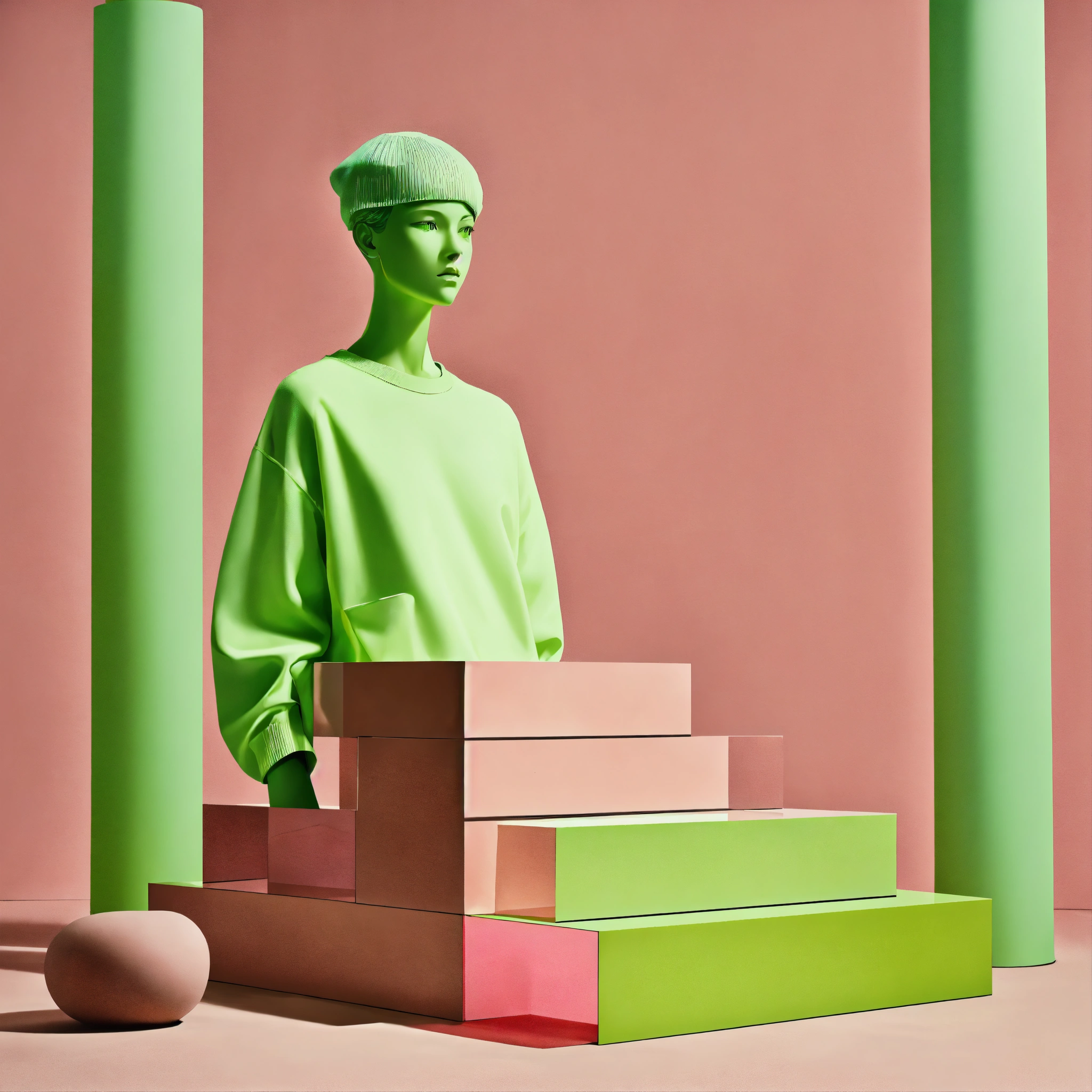 Store product display, acne studios, studio photography, minimal, stacked sweaters on abstract shape podium, resin material, neutral tones, pop of neon green, roman pillars! sculpture! no pink!