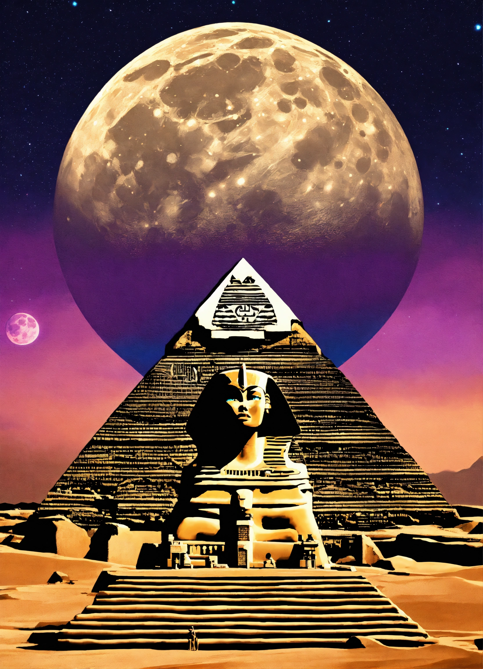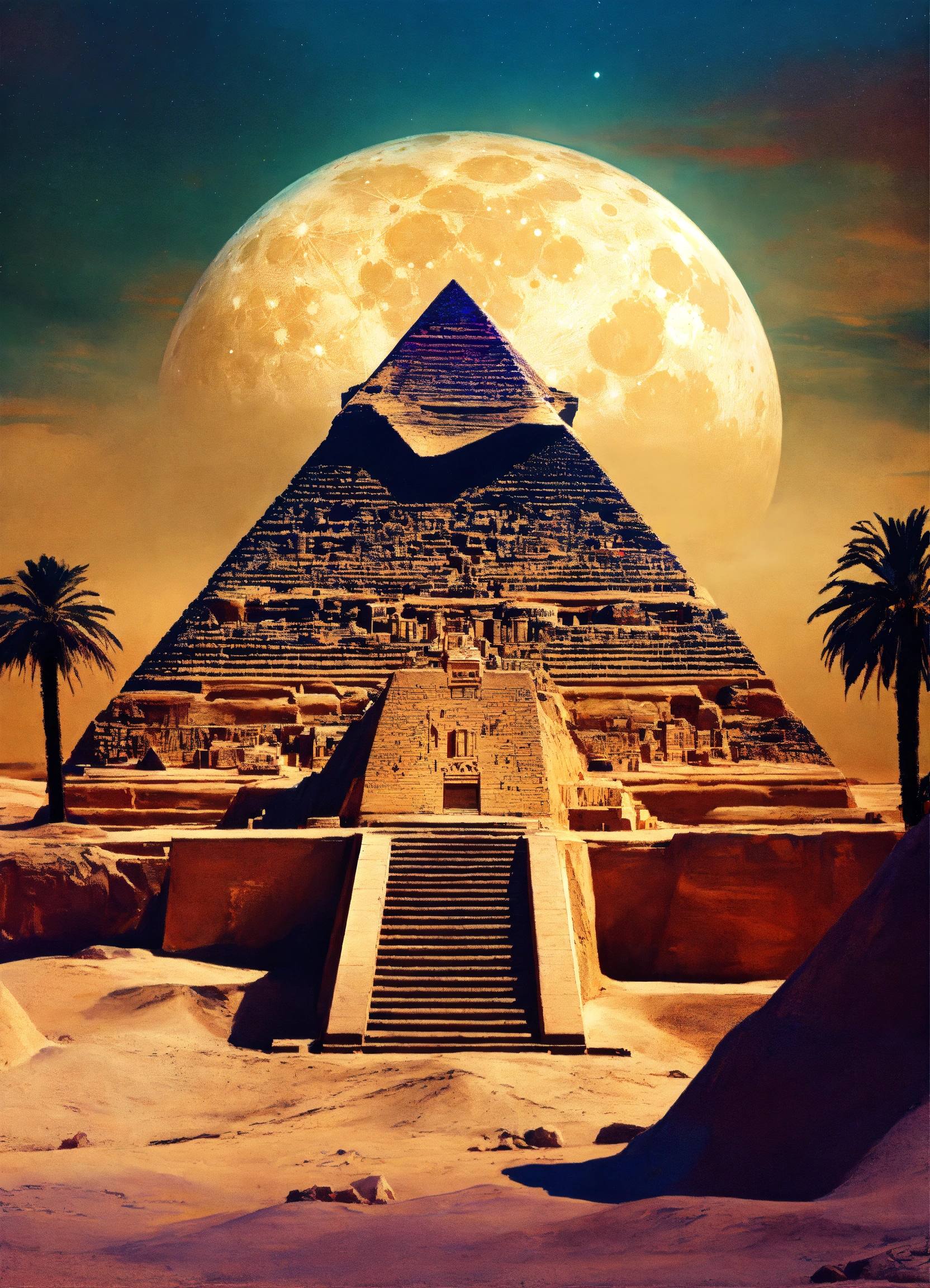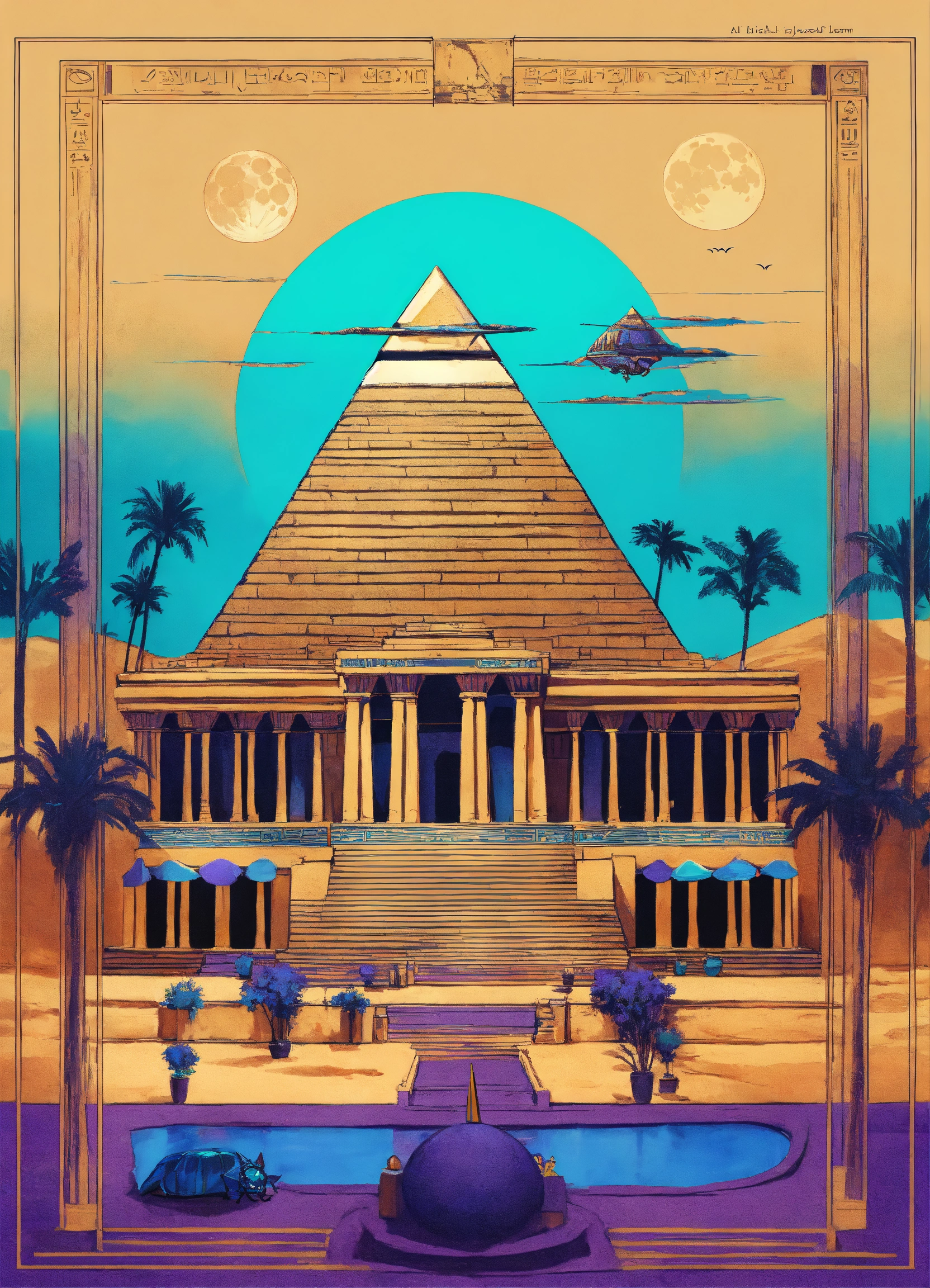 All superrealism style urban egyptian gizeh pyramid vampire style egyptian big scarab outdoor big blue moon cream beige purple turquoise royal blue glow