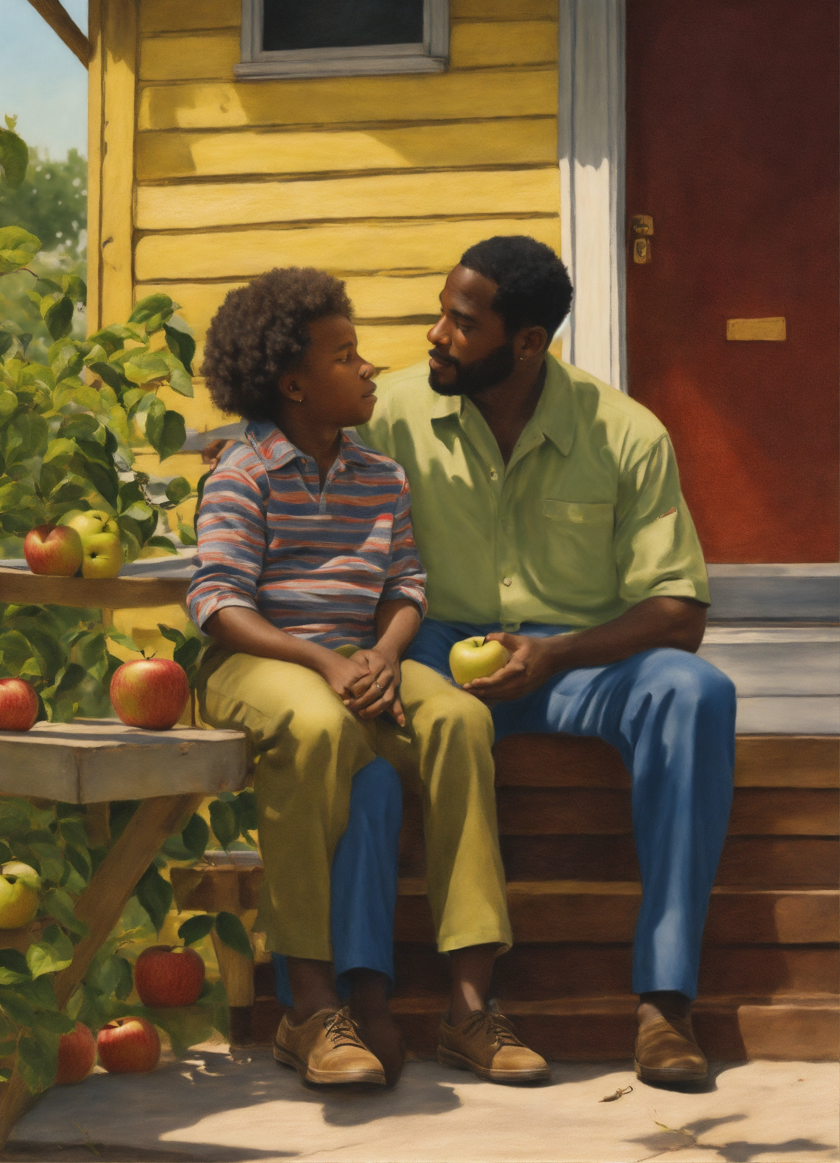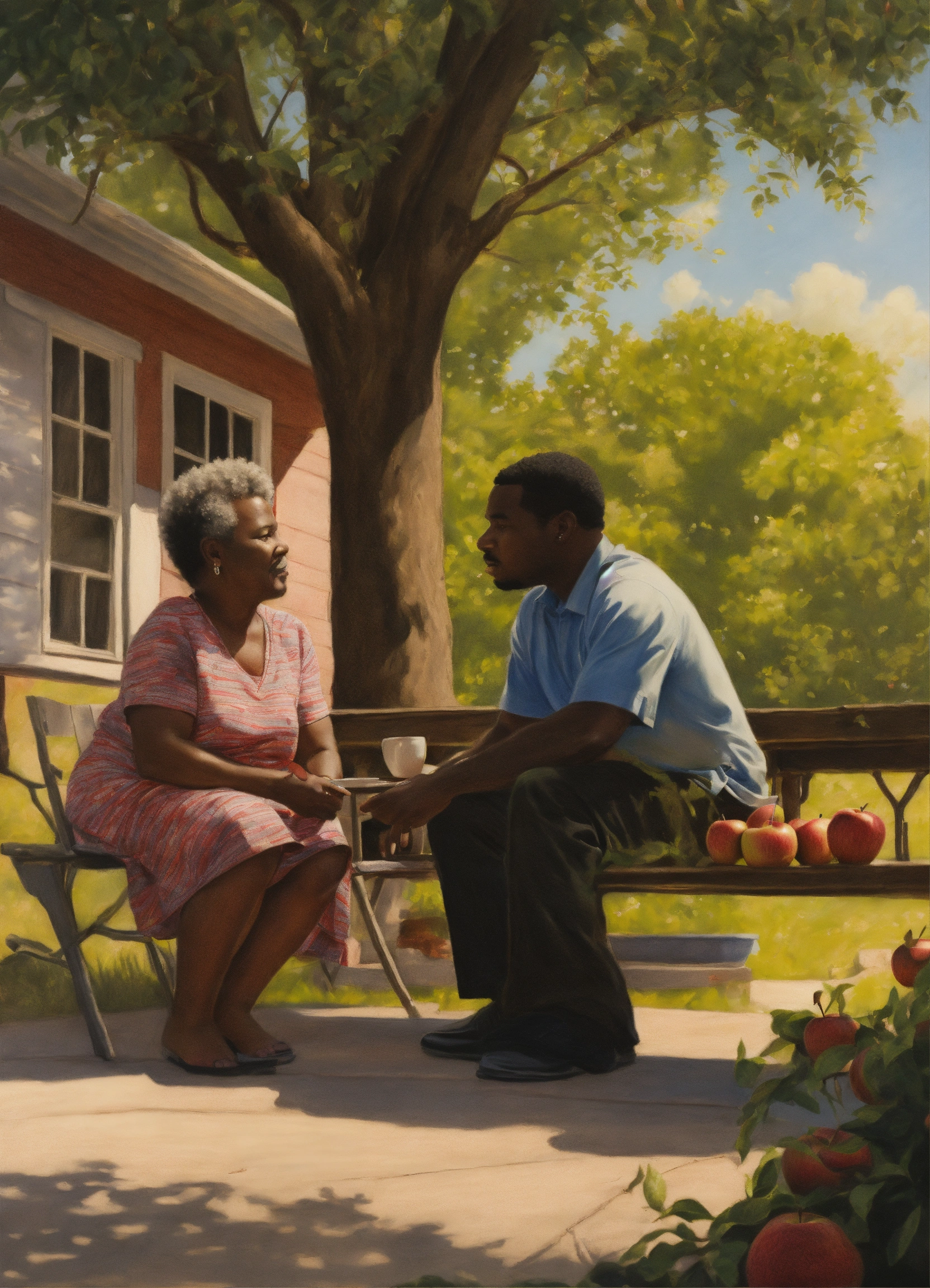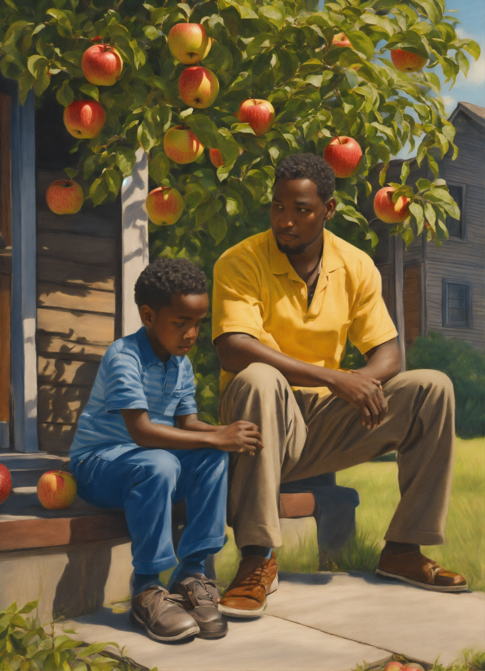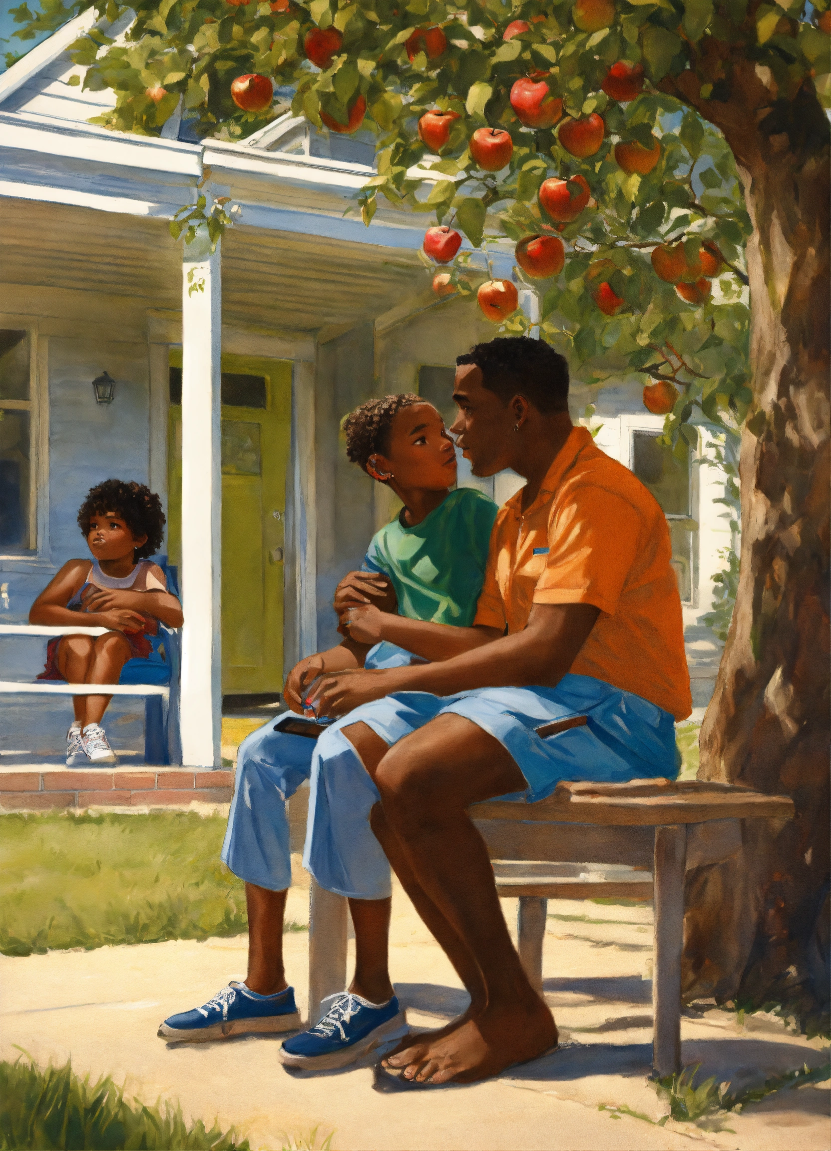 Realism drawing. outside, on the porch, a six-year-old black boy sits on a 50-year-old black woman's lap. a 25-year old black man talks to a 50-year-old man under an apple tree.