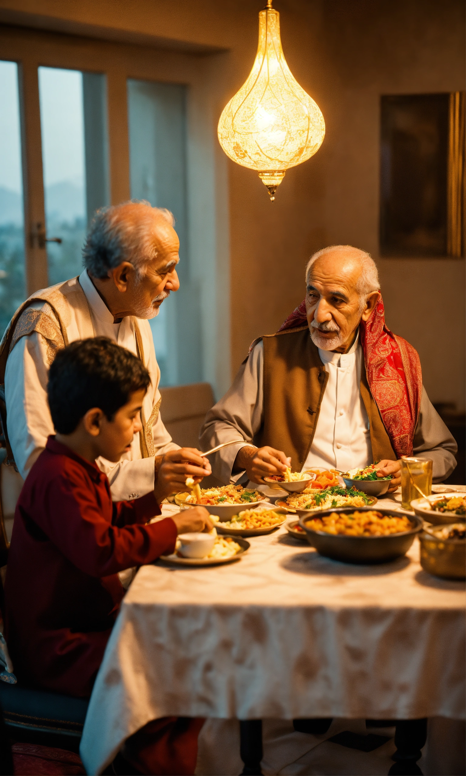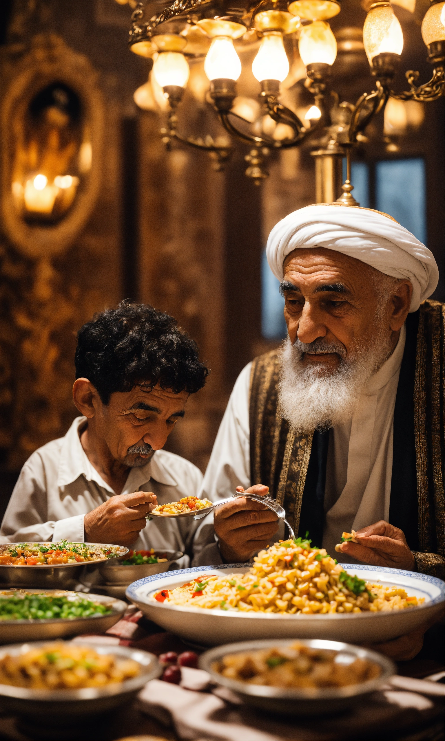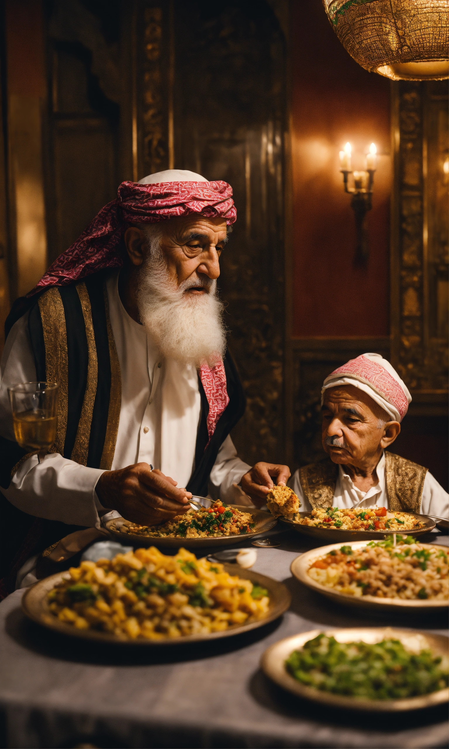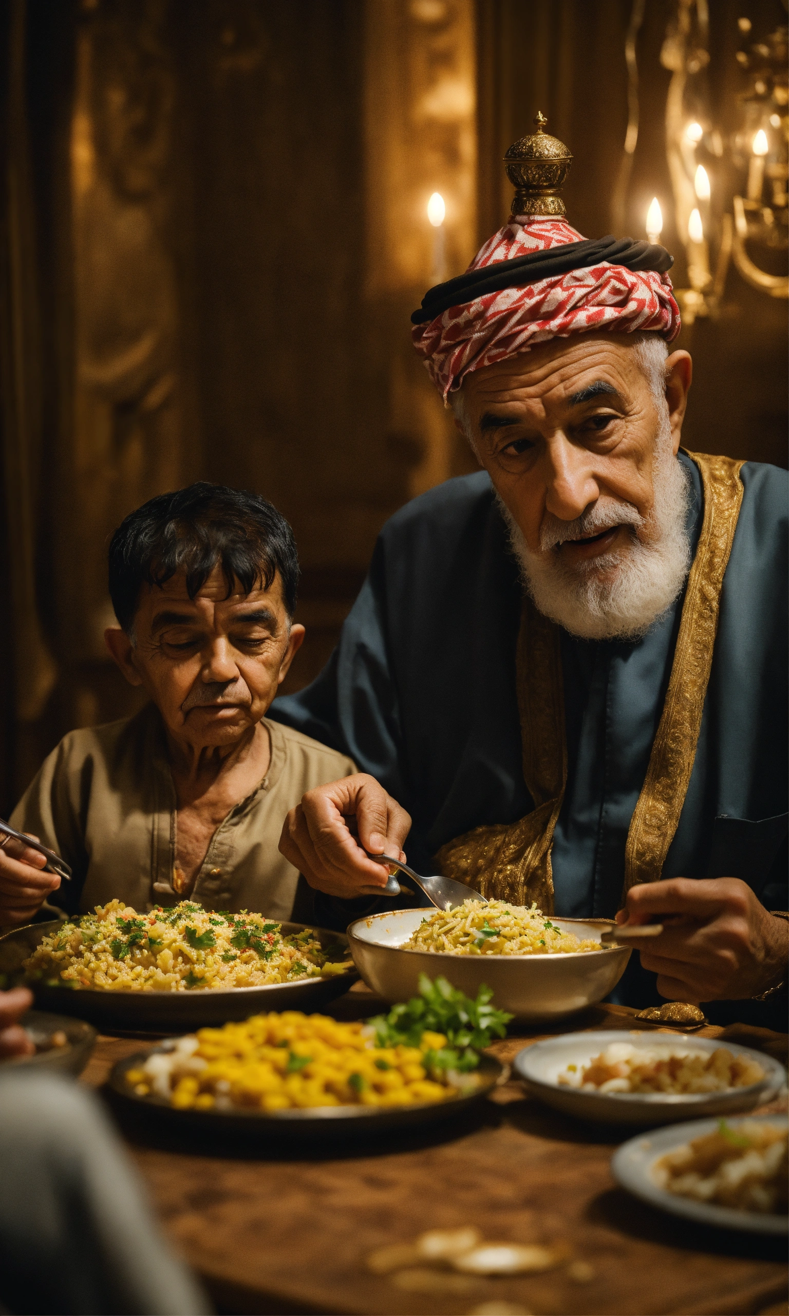 A wealthy middle eastern old man eating with his young son on a long table full of food, surreal photo, fujifilm xt3, indoor, good lighting, raw photo, 8k uhd, film grain, unreal engine 5, ray trace