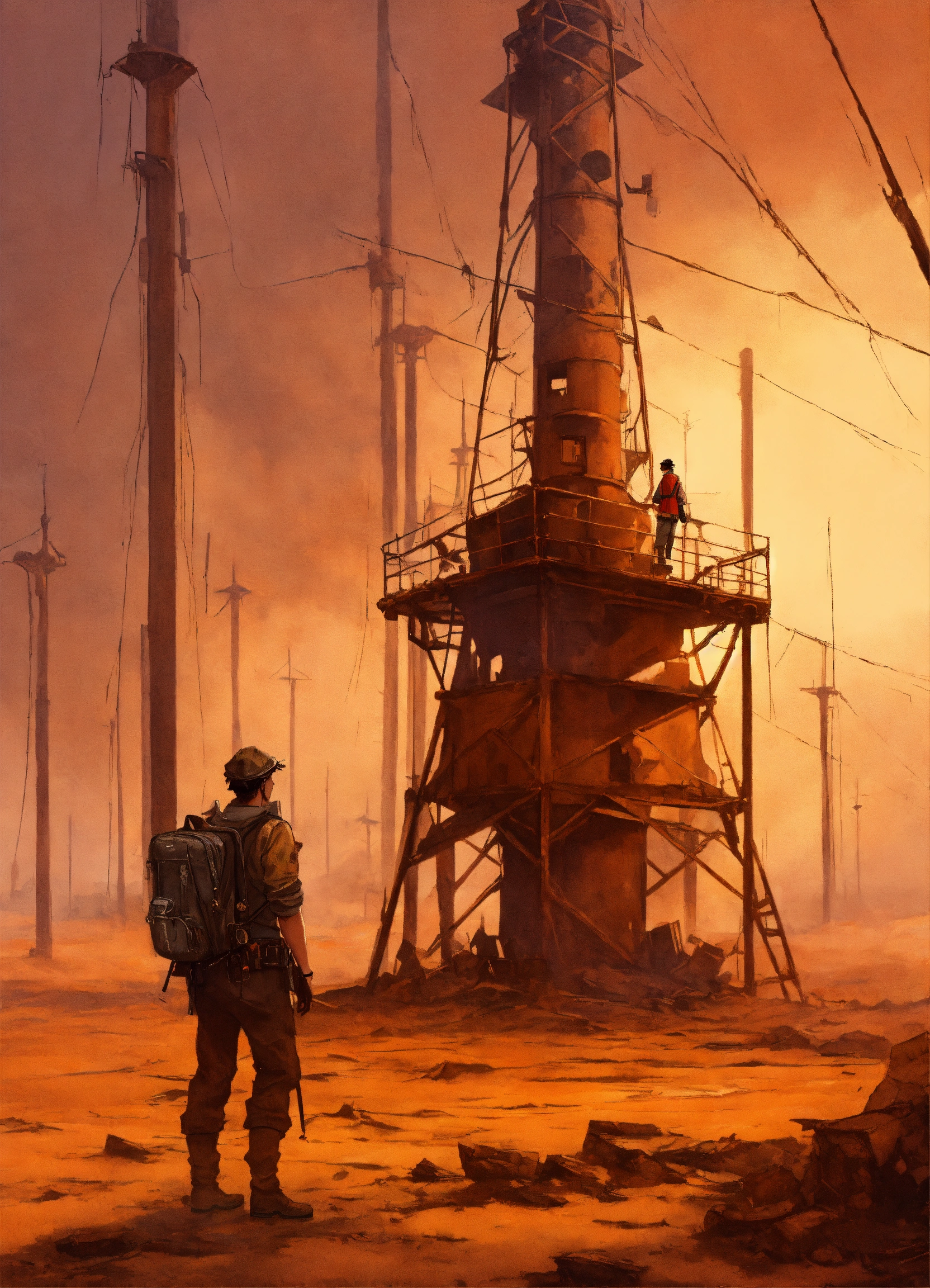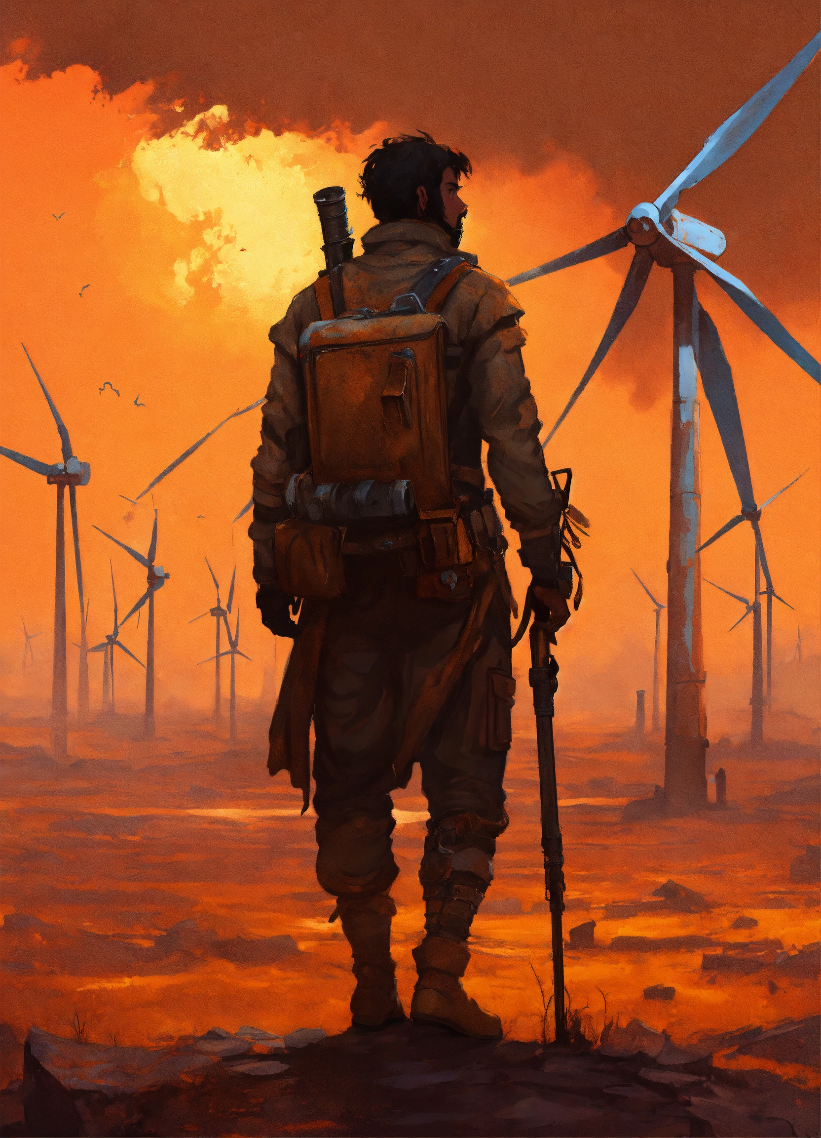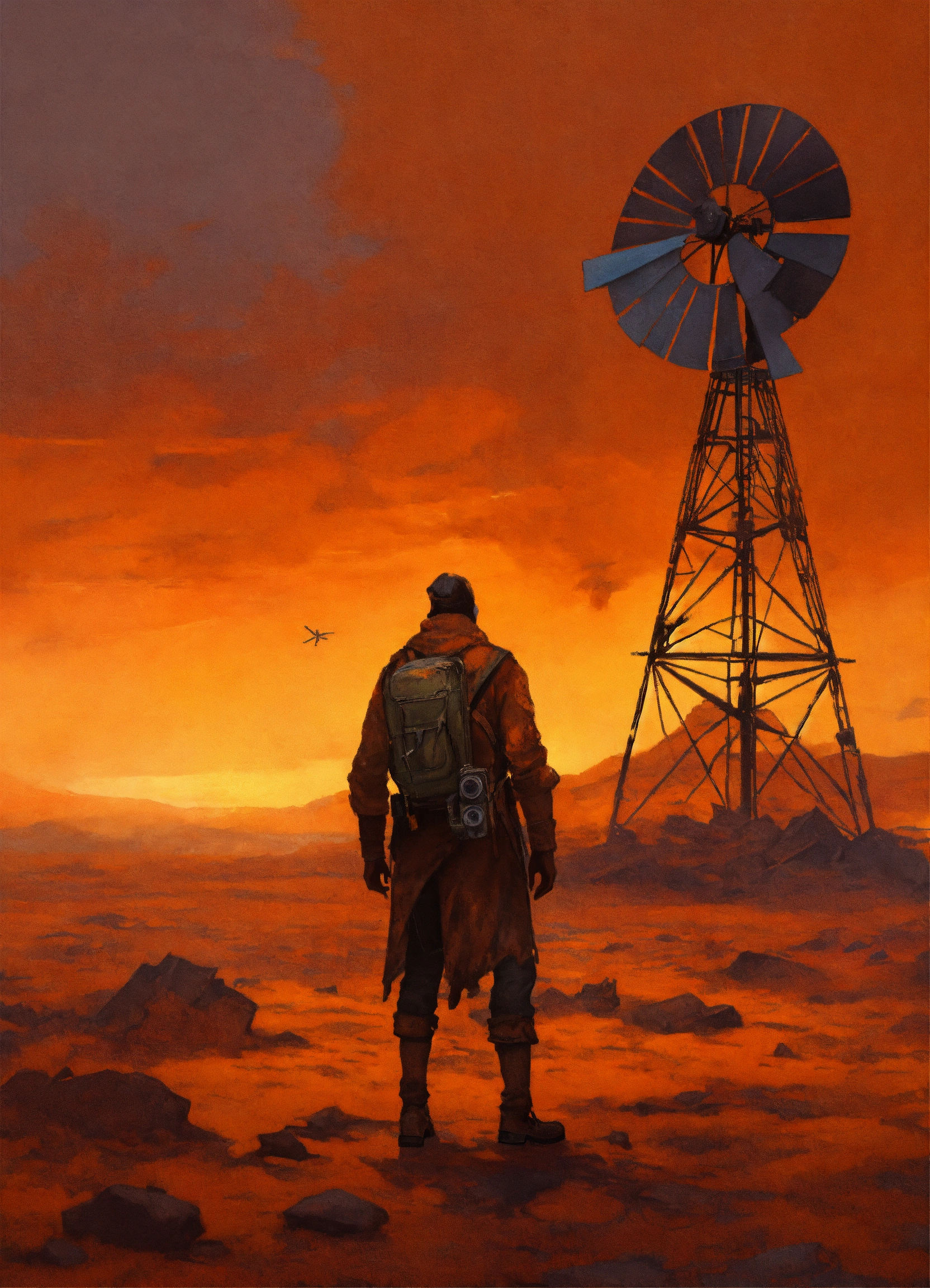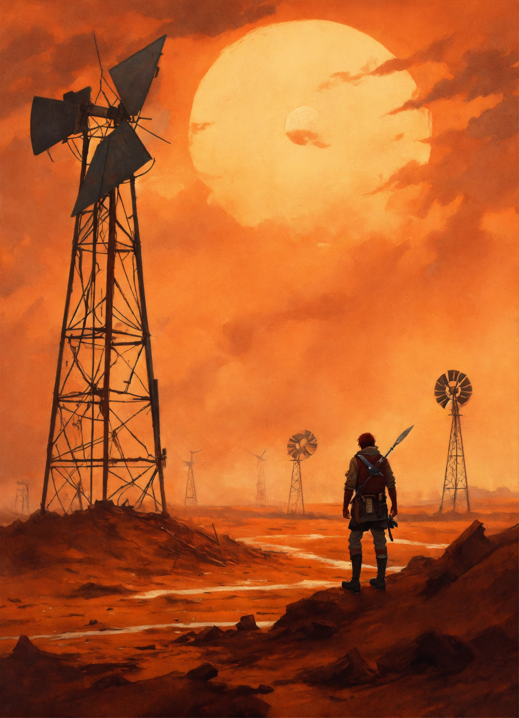 Depict an isolated adventurer standing among crumbling, rust-coated wind generators under a burnt sienna sky of a forsaken earth