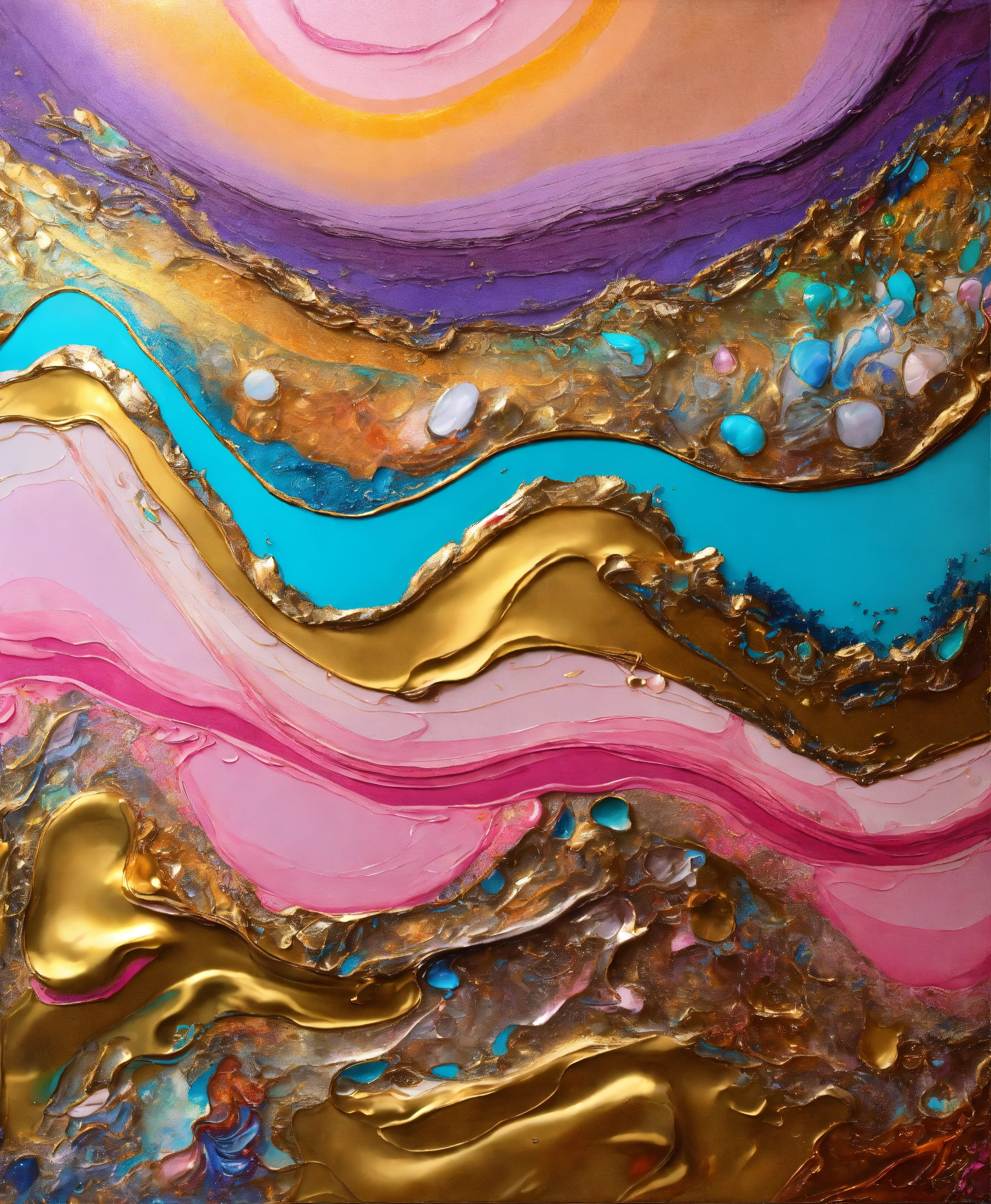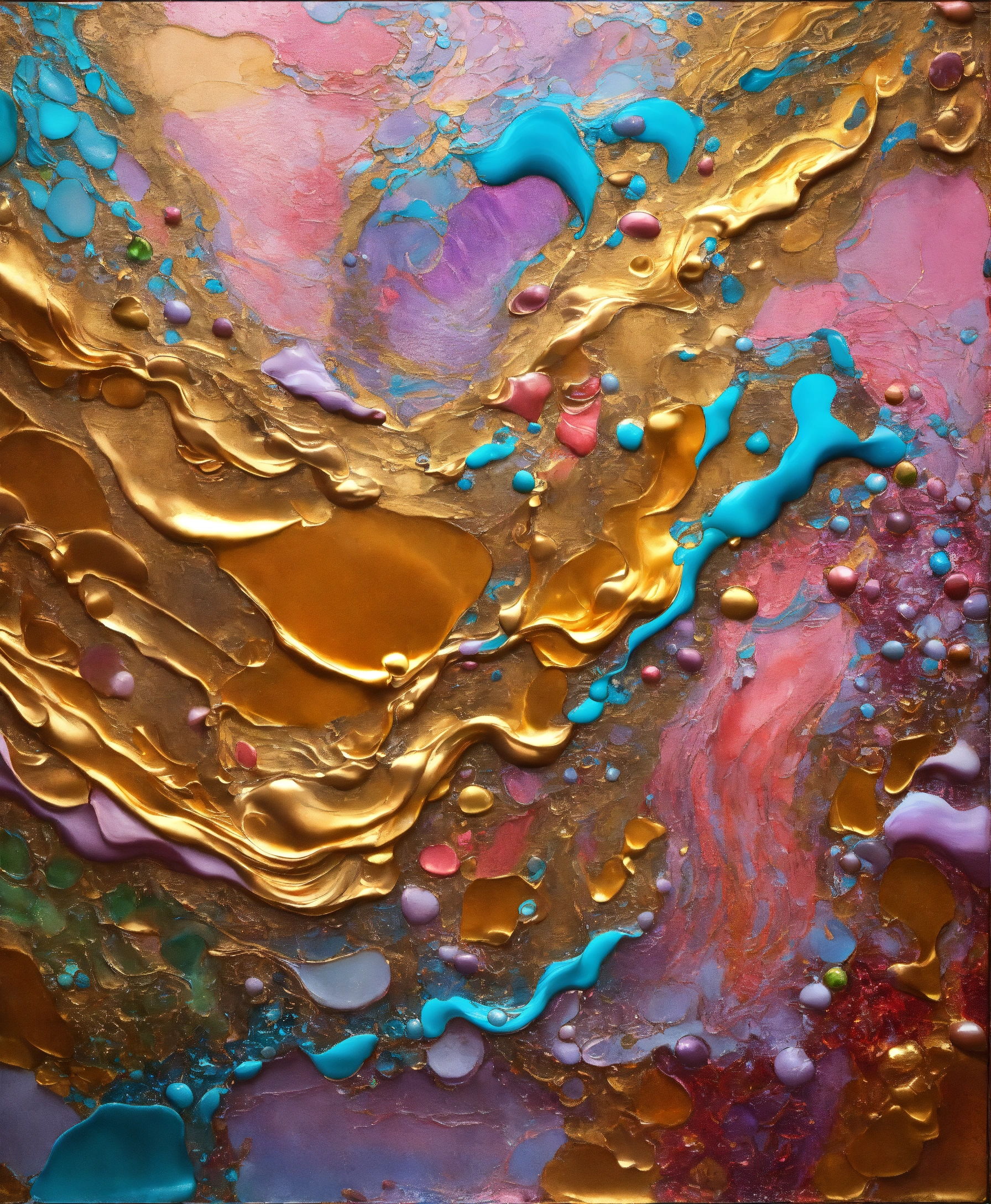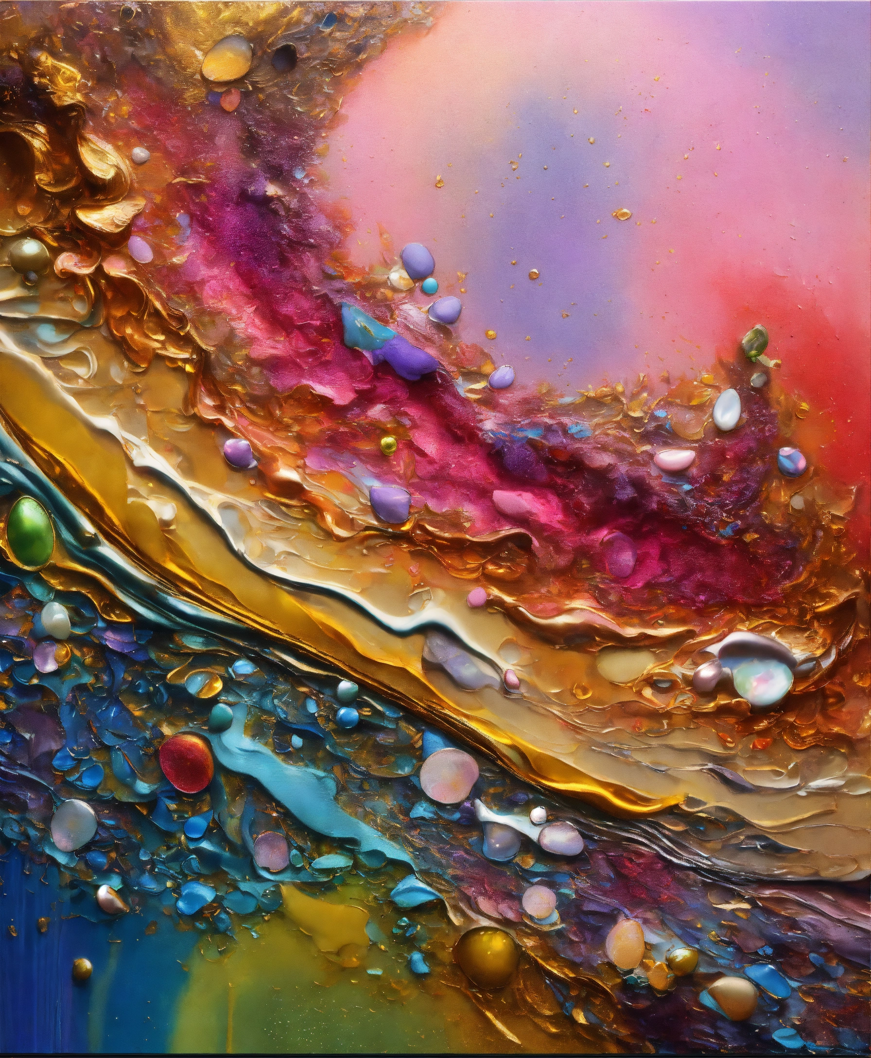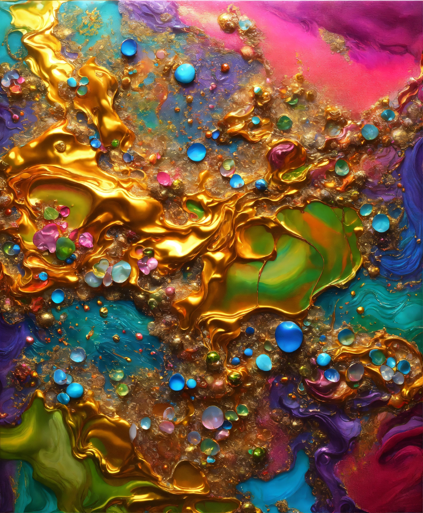 Colorful abstract painting oil and water complex complicated bright vivid colors beautiful opulent wealthy intricate all hues primary secondary and tertiary colors pink peridot sky blue lilac green magenta orange gold silver bronze copper mother of pearl magnificent amazing sublime delicate hyperdetailed masterpiece complex extraordinary metallic sheen elaborate awesome 24k gold and silver trim everywhere oil and water abstract art molten metal intricate complex 8k
