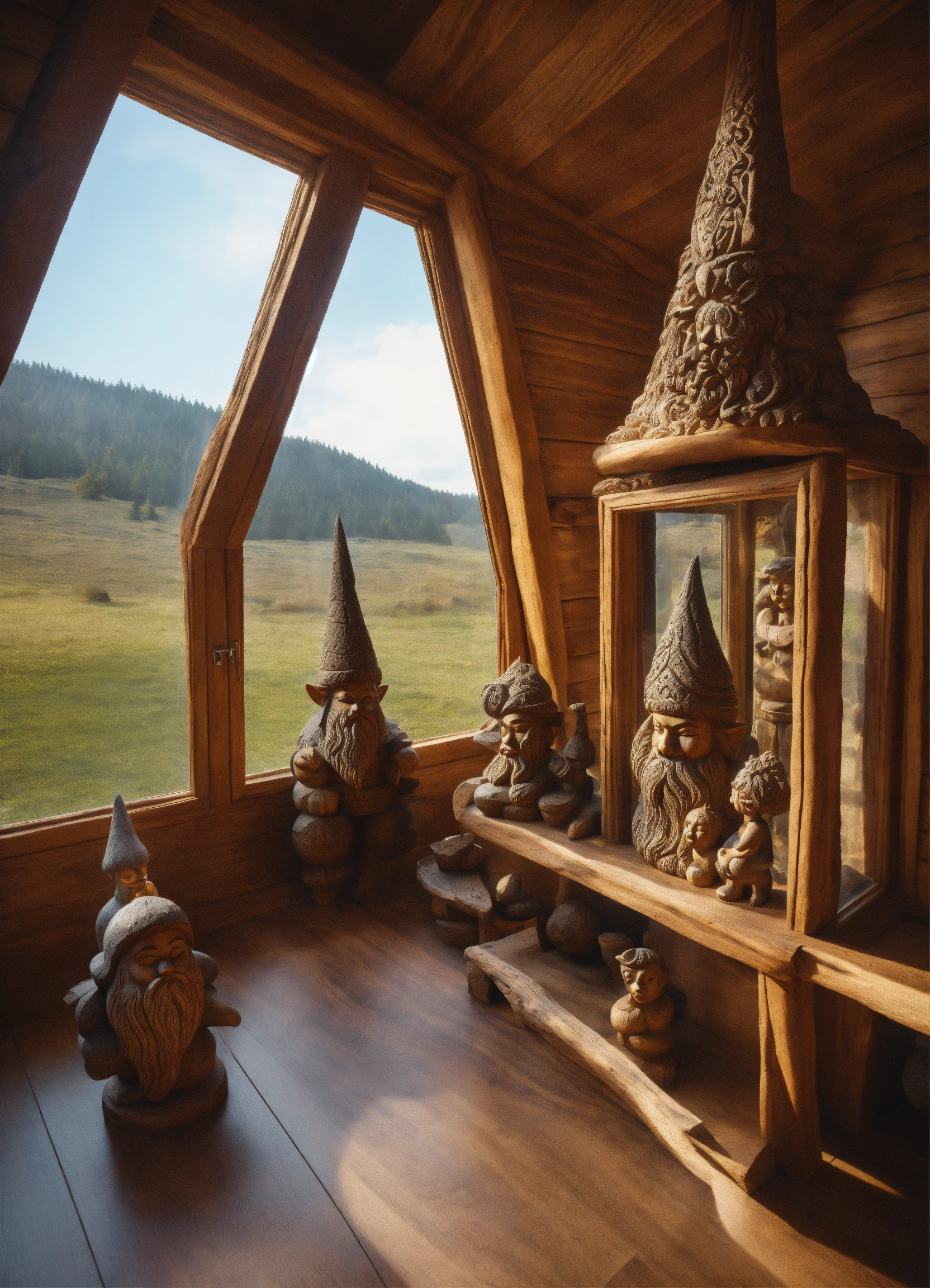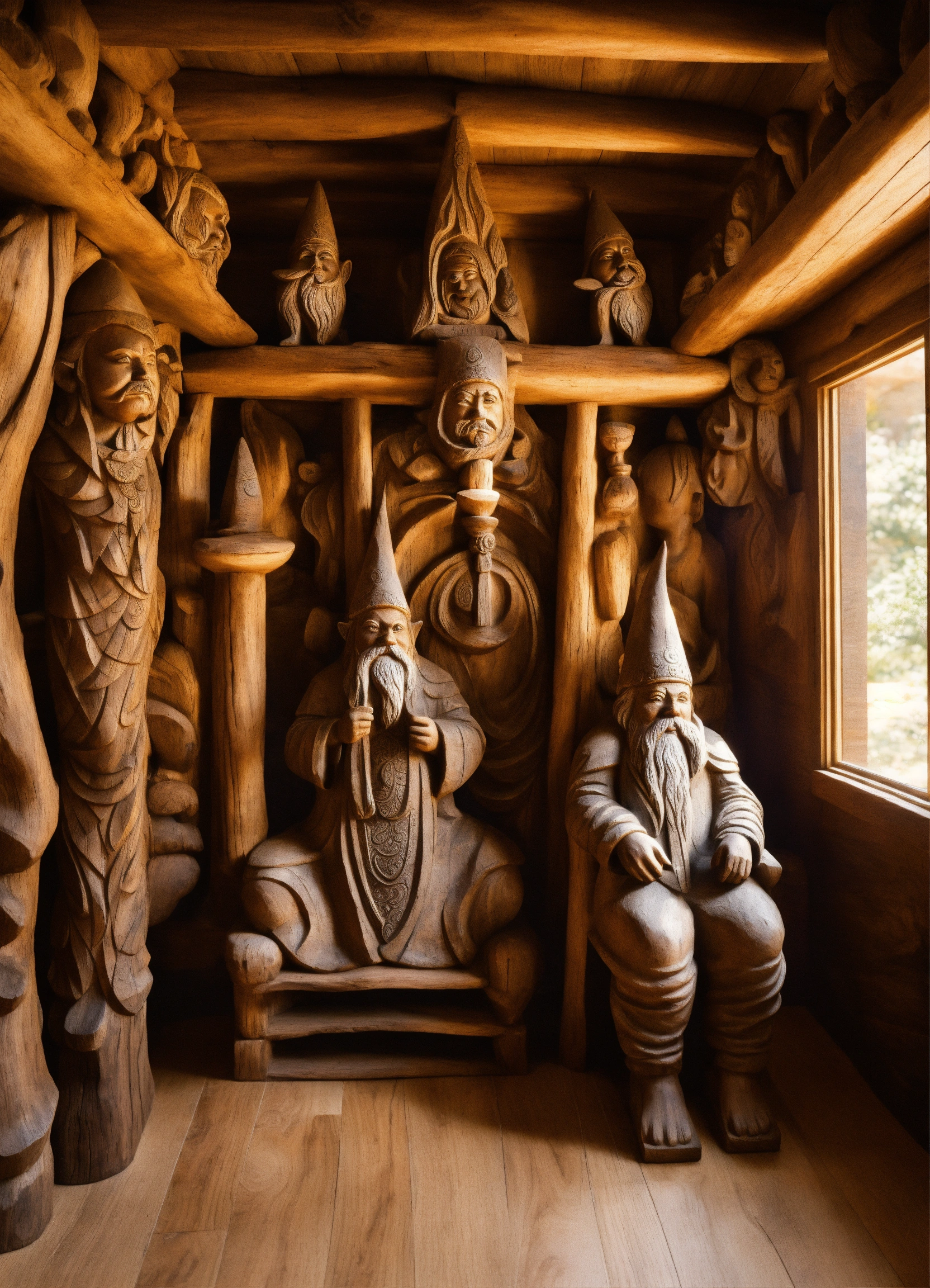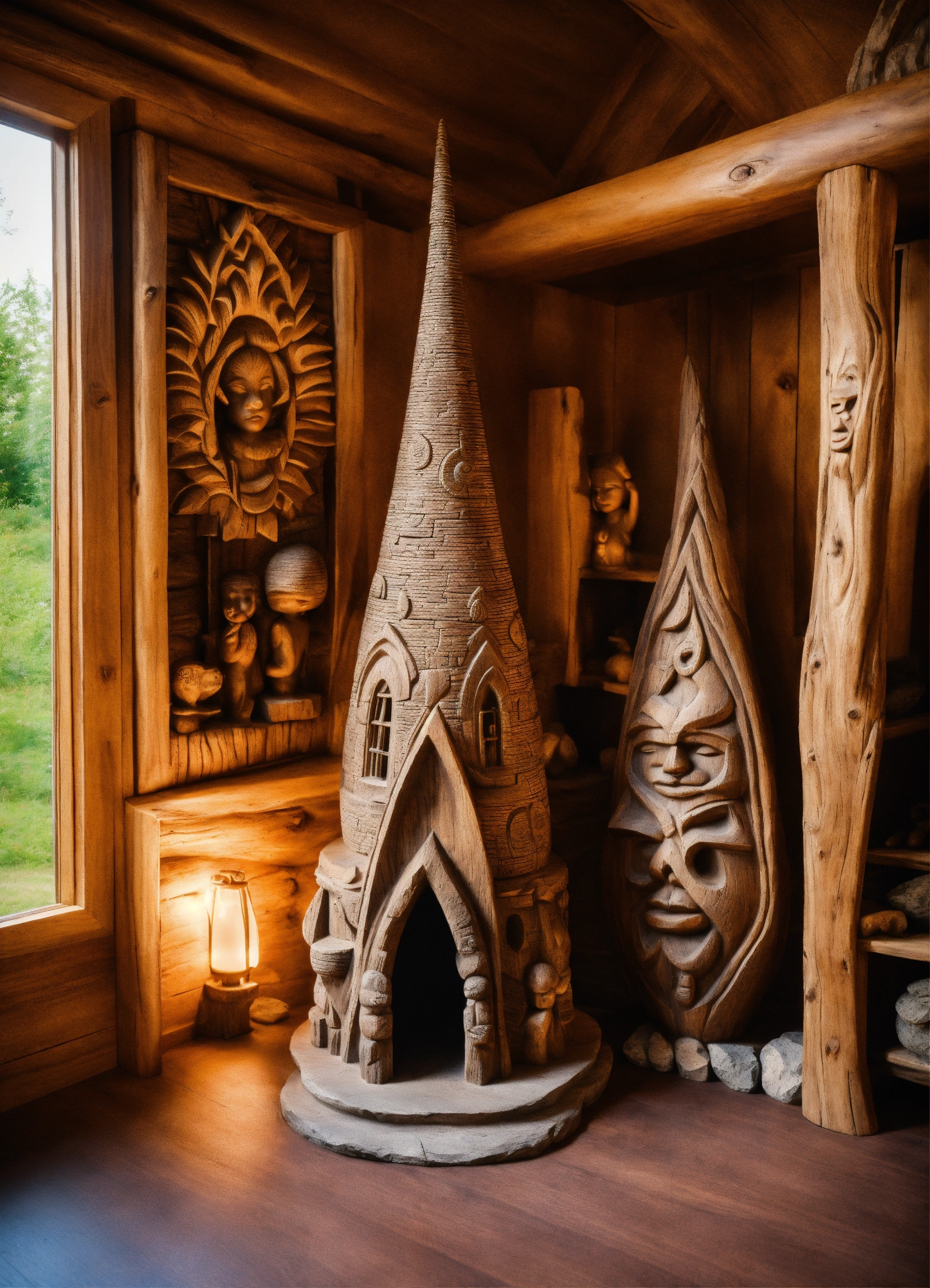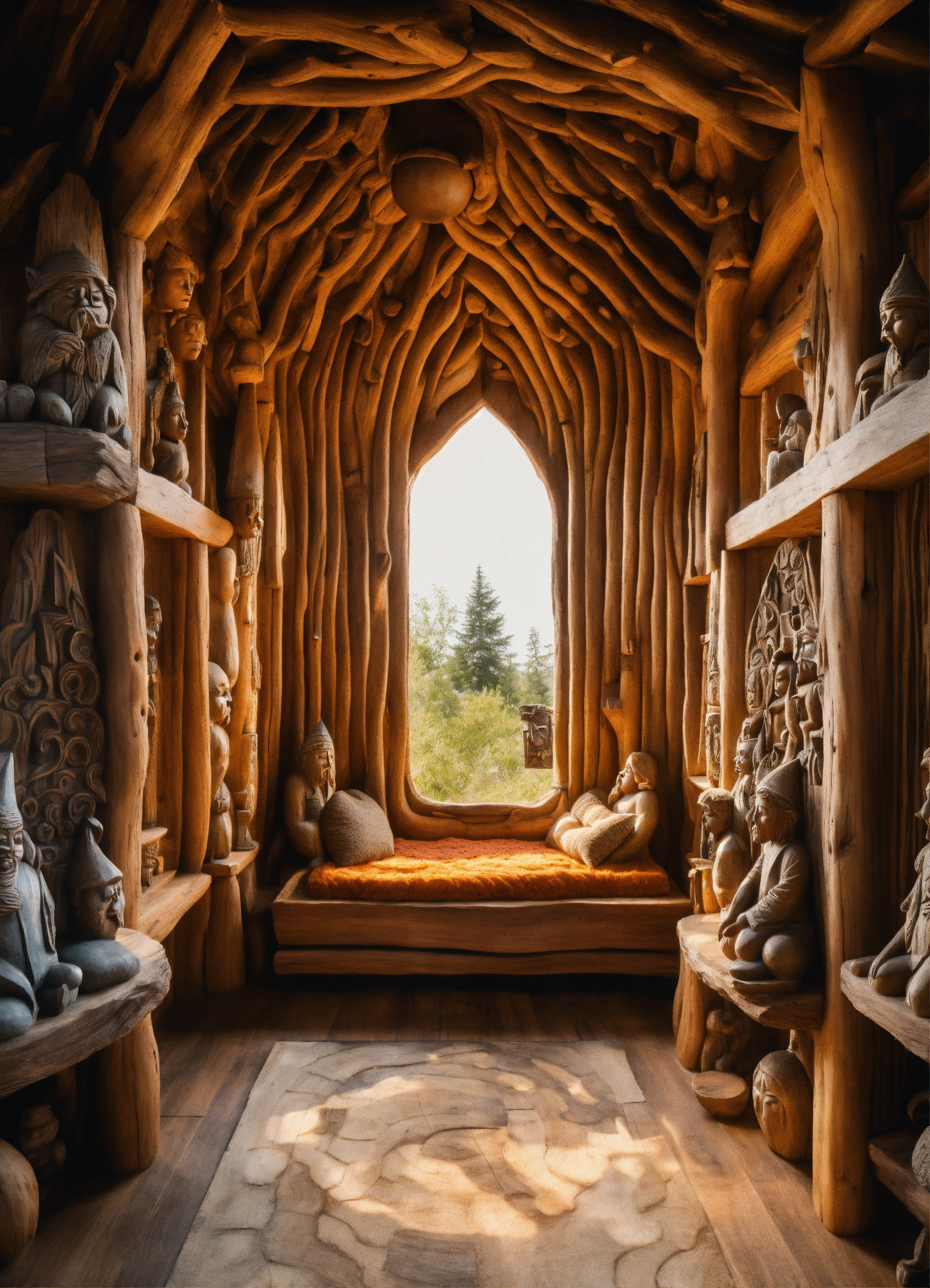 An ancient style spiritual gnomes a frame house wooden interior looking outside.sculptured . style of alex grey, giger.unreal engine.totem sculptures.swirling patterned.wood.stone/driftwood.statues. artistic sculpture.air bnb tiny house