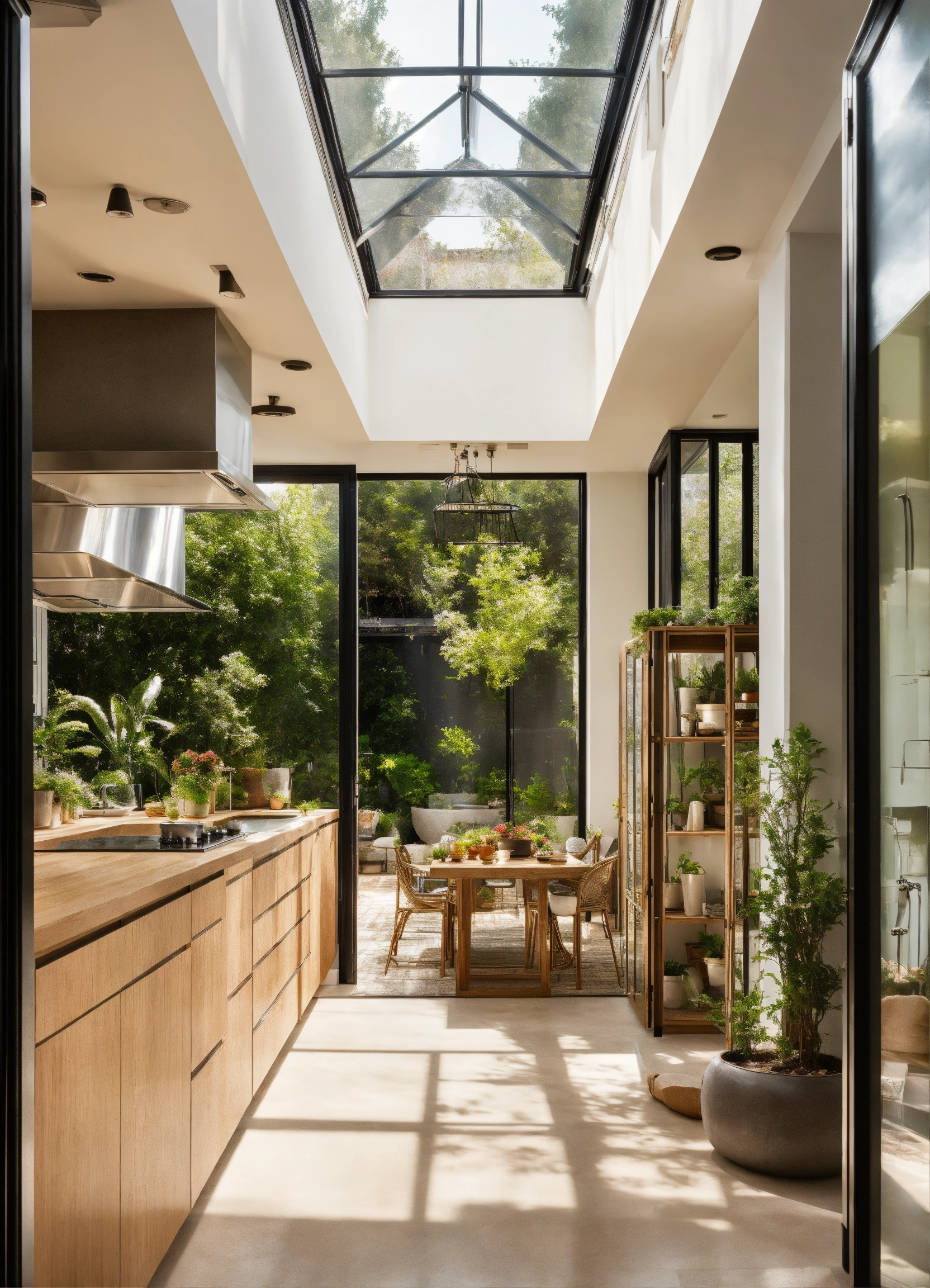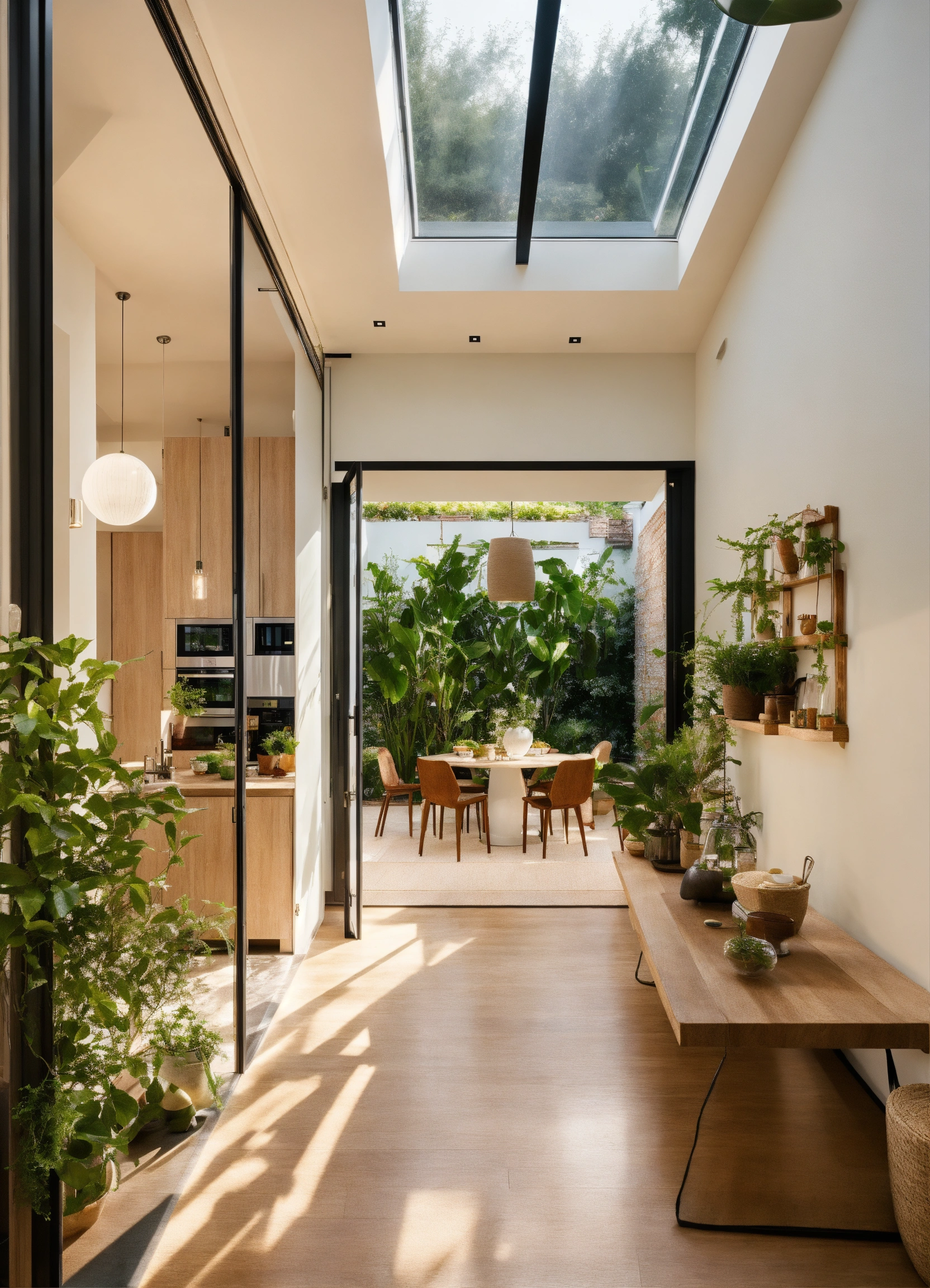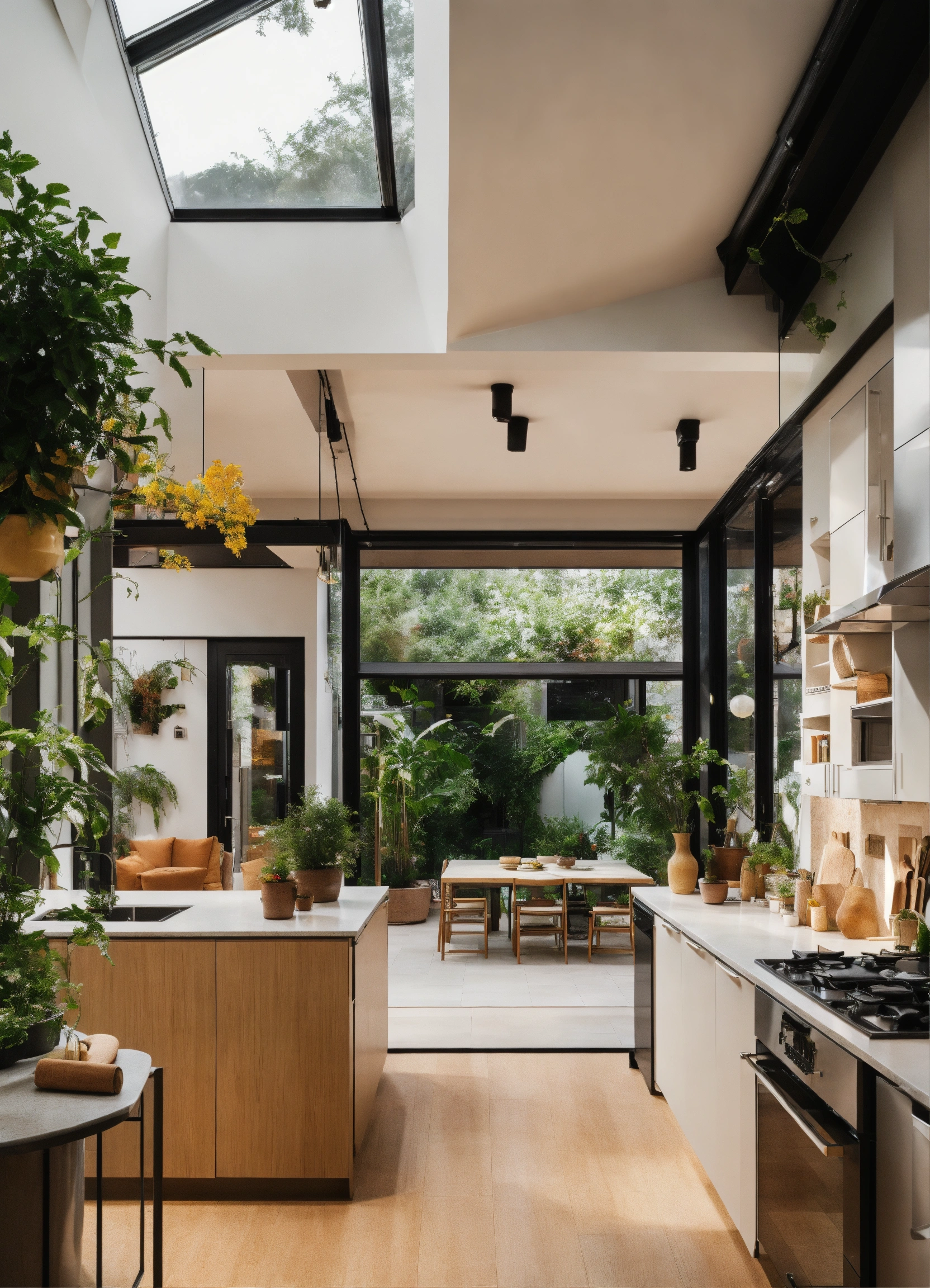 Feng shui warm plants interior design kitchen interior designer and client light colours front door view open plan glass roof