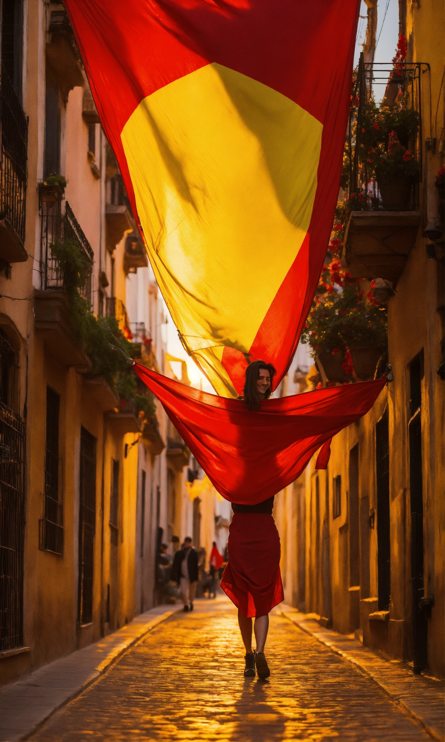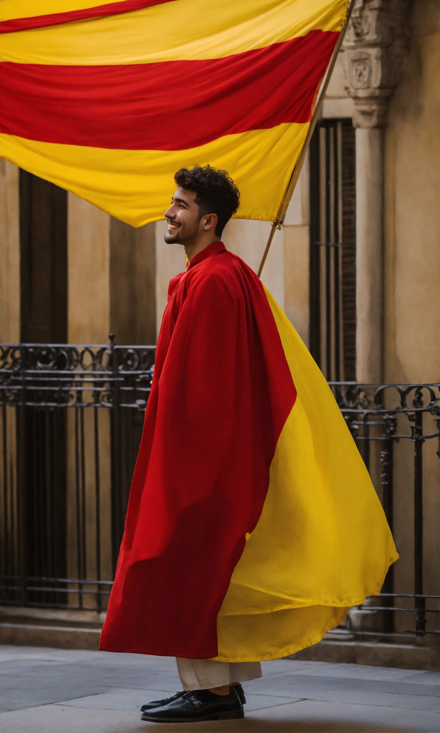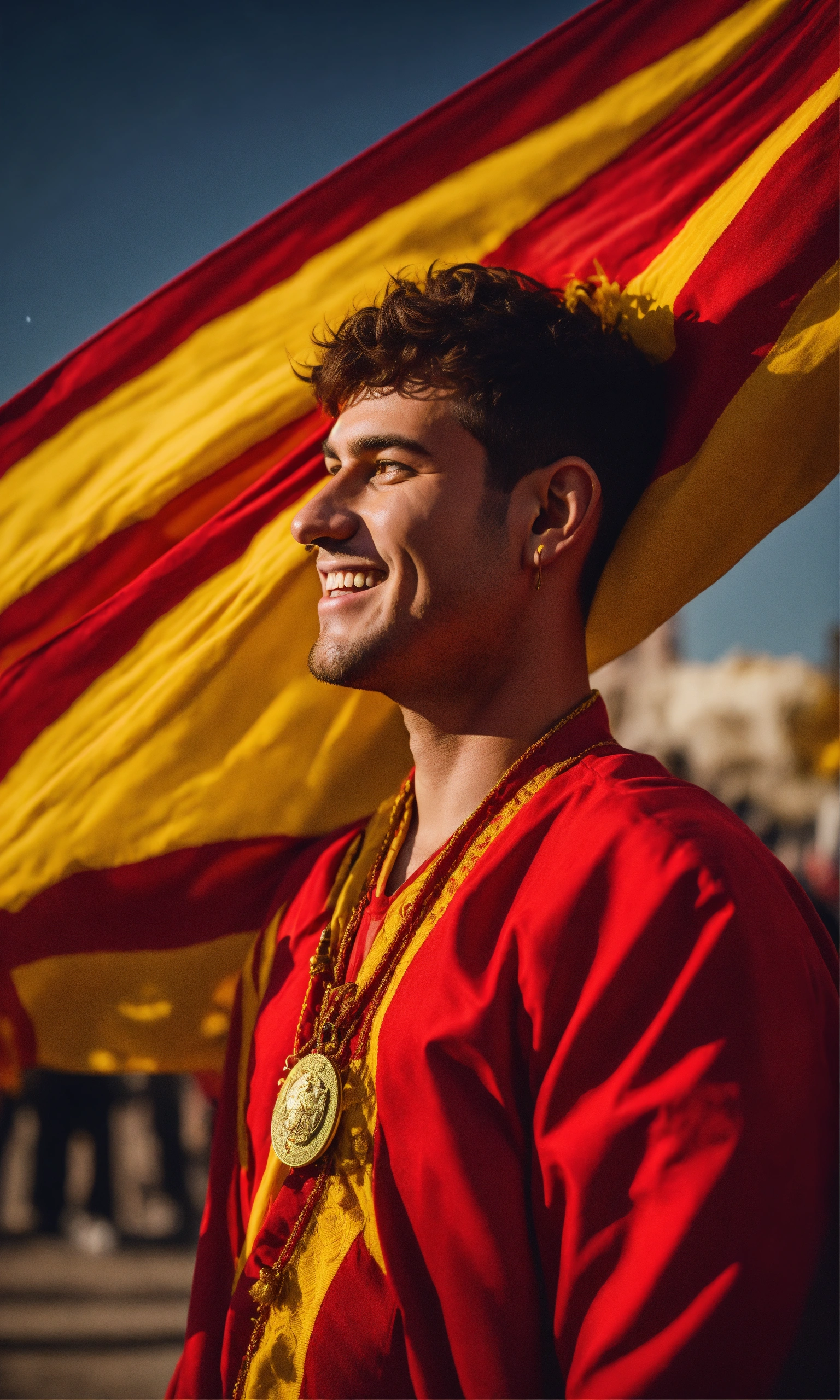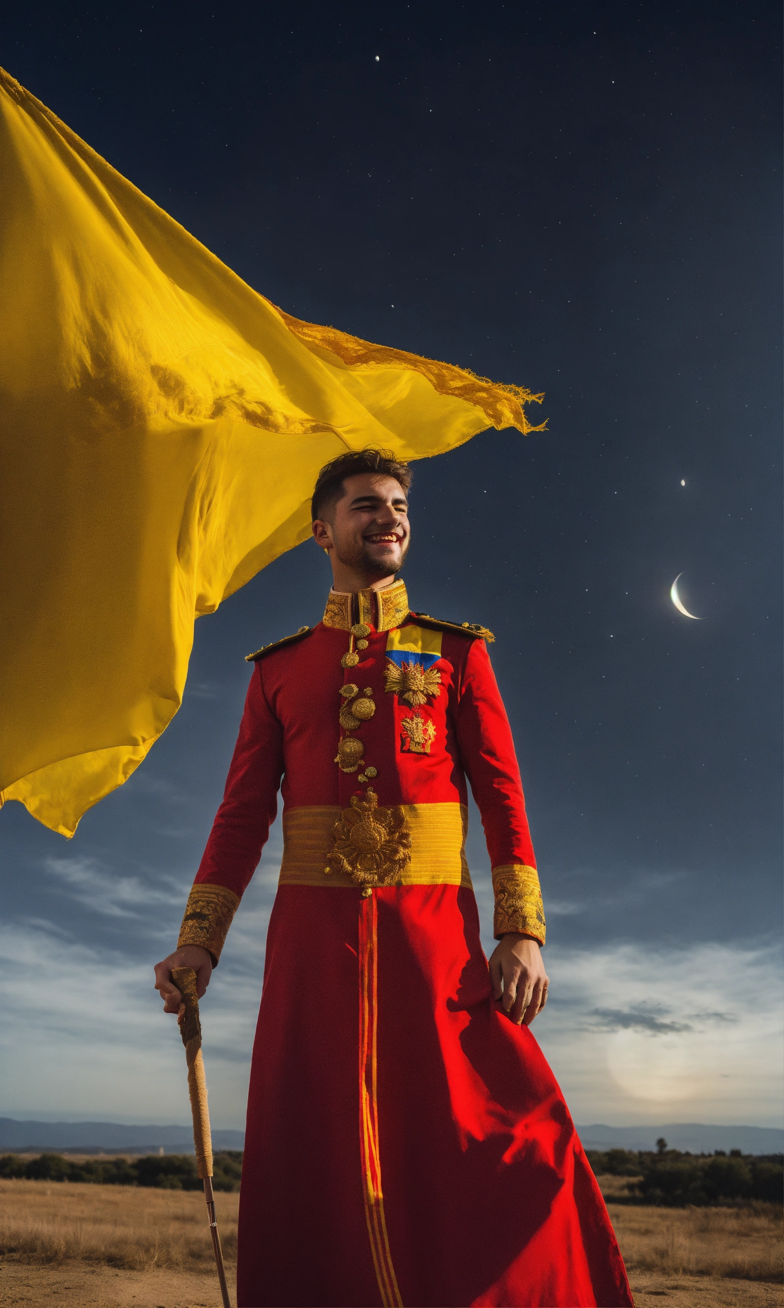 Hombre muy gordo y sonriente joven vestido de rojo y amarillo lleva una bandera de españa que tiene dos bandas rojas exteriores y una amarilla interior, se ve la luna enorme y está muy feliz