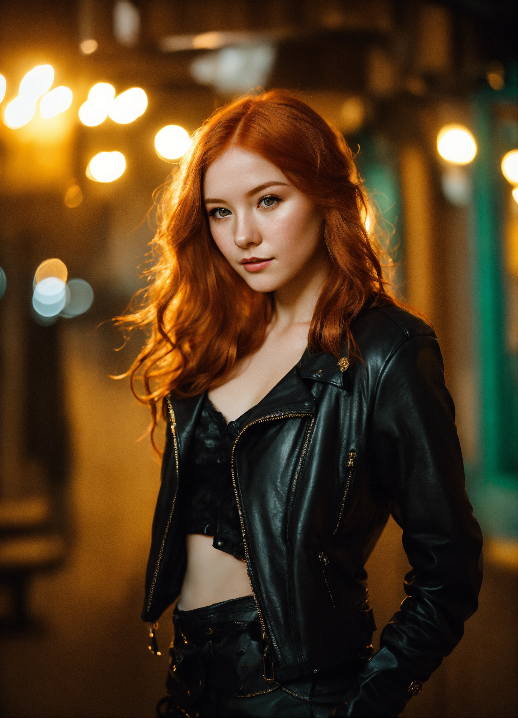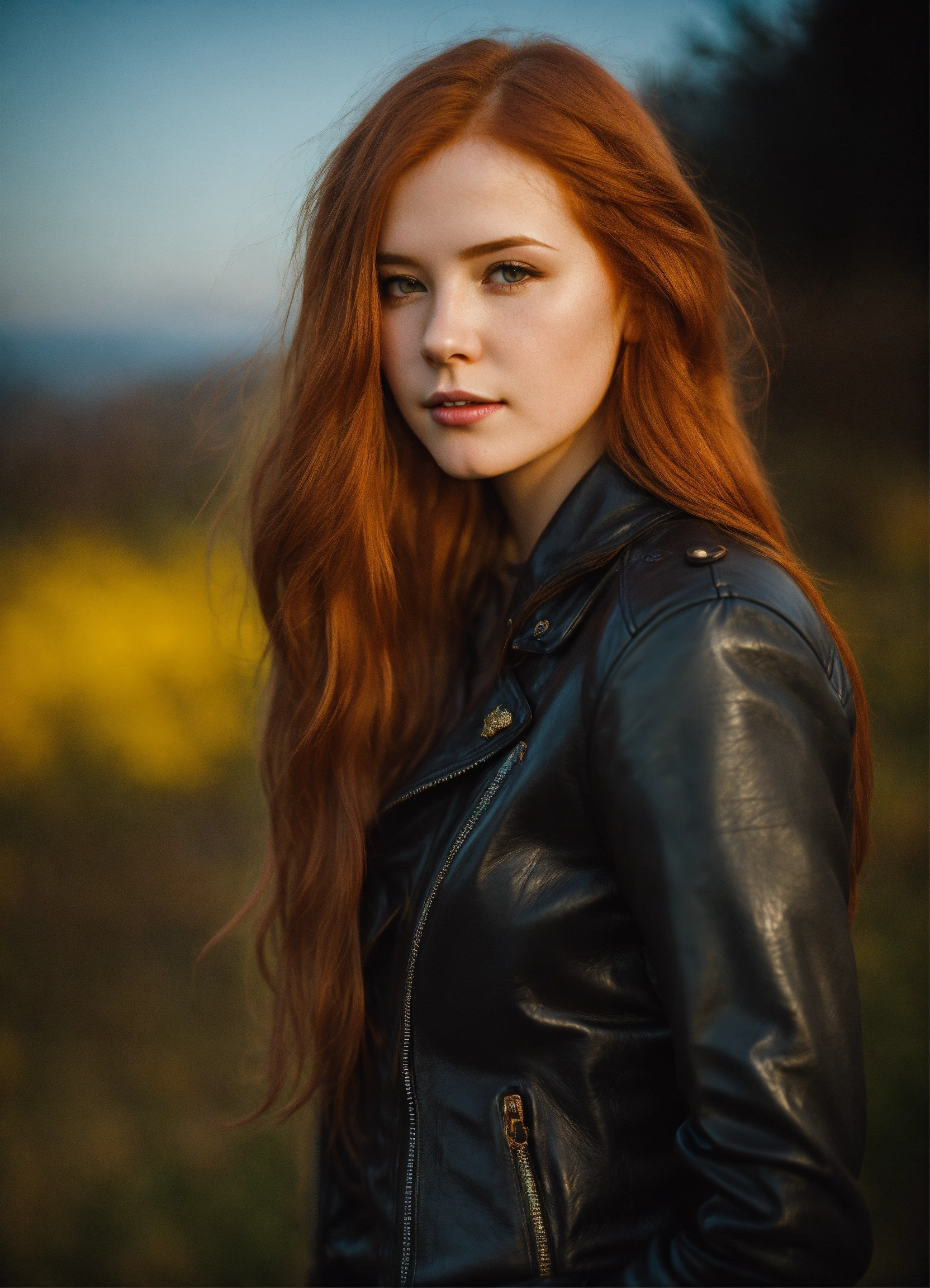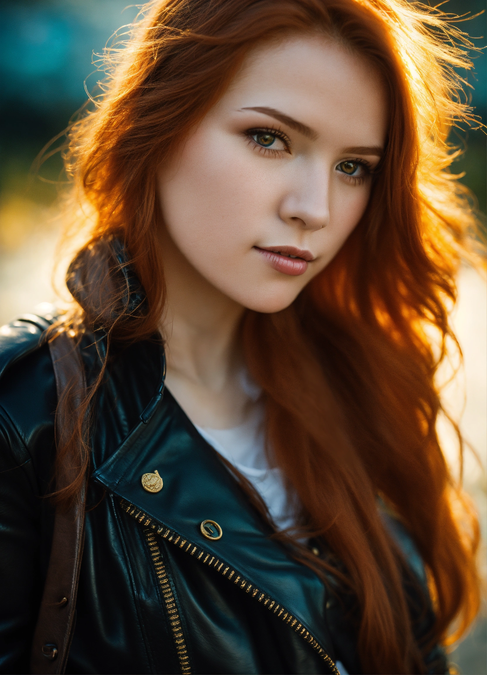 Cute young redhead irish girl, fantasy, exquisite detail, 30 - catch light, low - contrast, high - sharpness, depth - of - field, golden - hour, ultra - detailed photography, wearing a black leather jacket pants and gloves very long hair