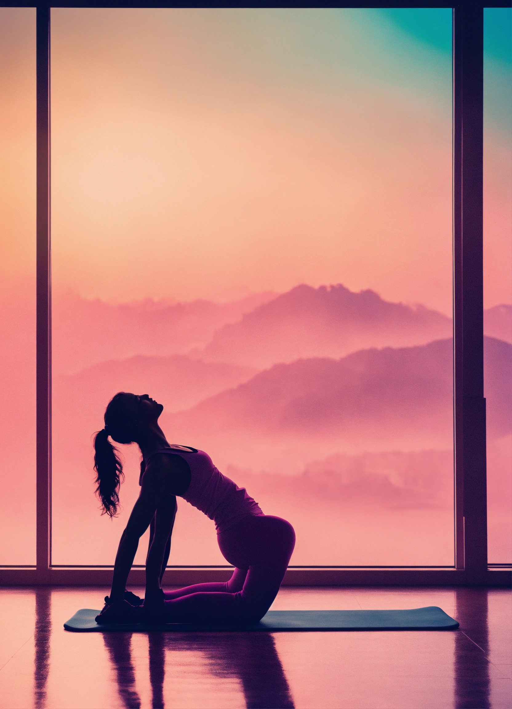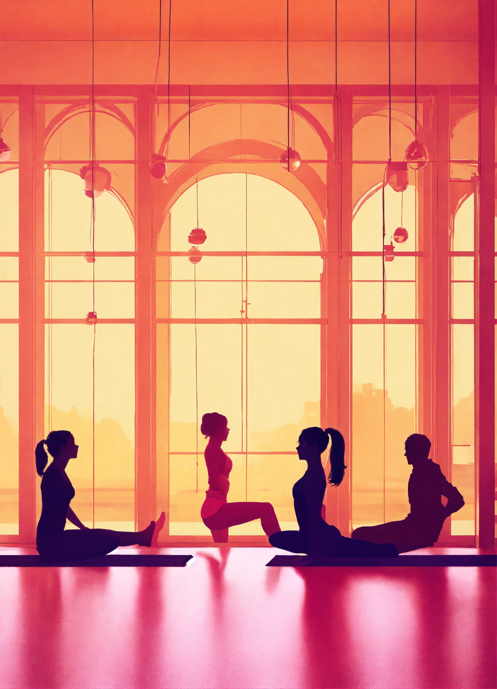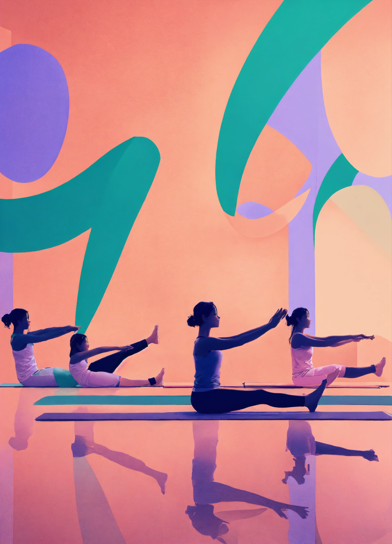 Silhouettes people doing pilates together, overlay background, pastel shades, hi res image, overlay technique, add arch