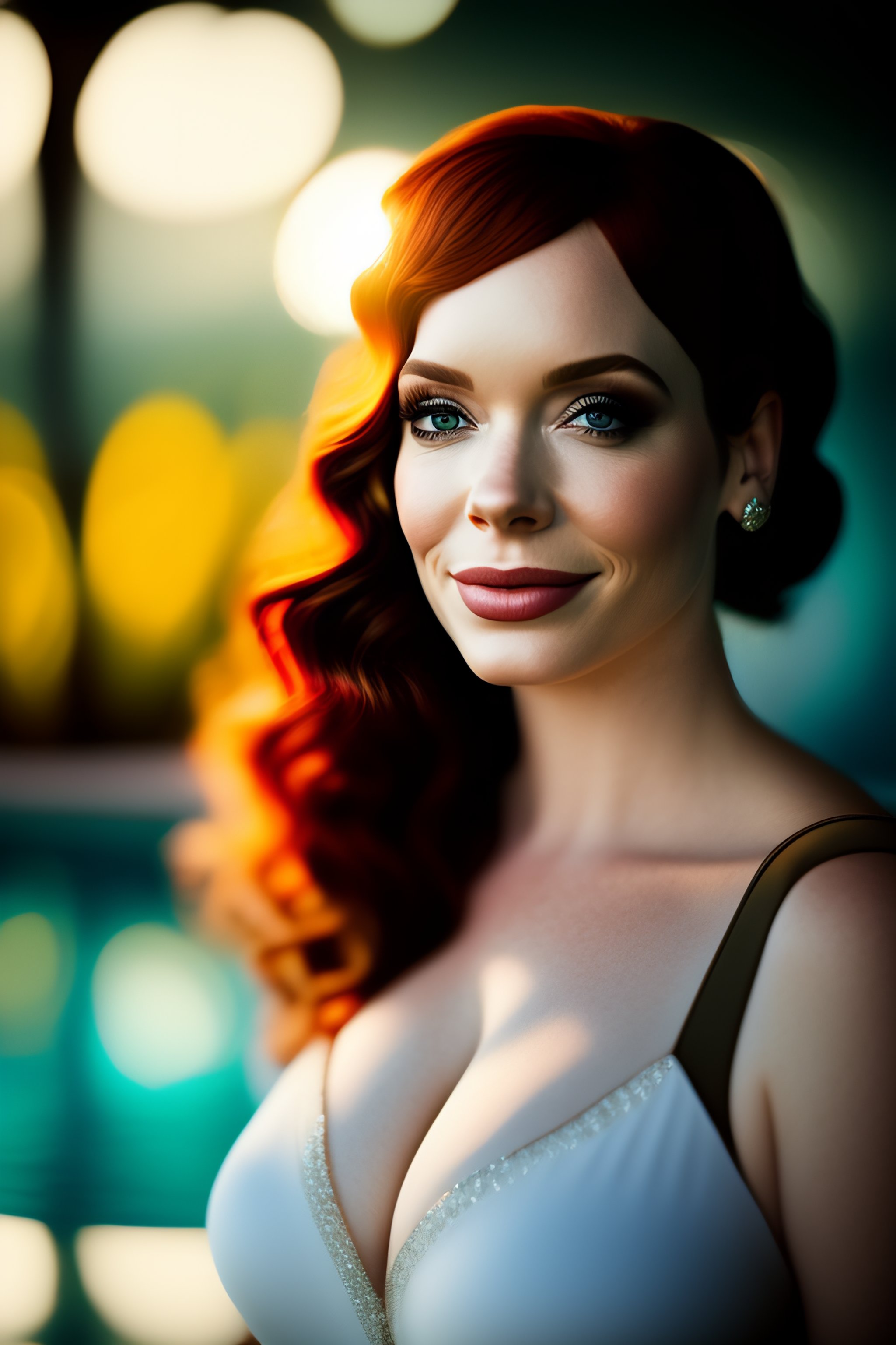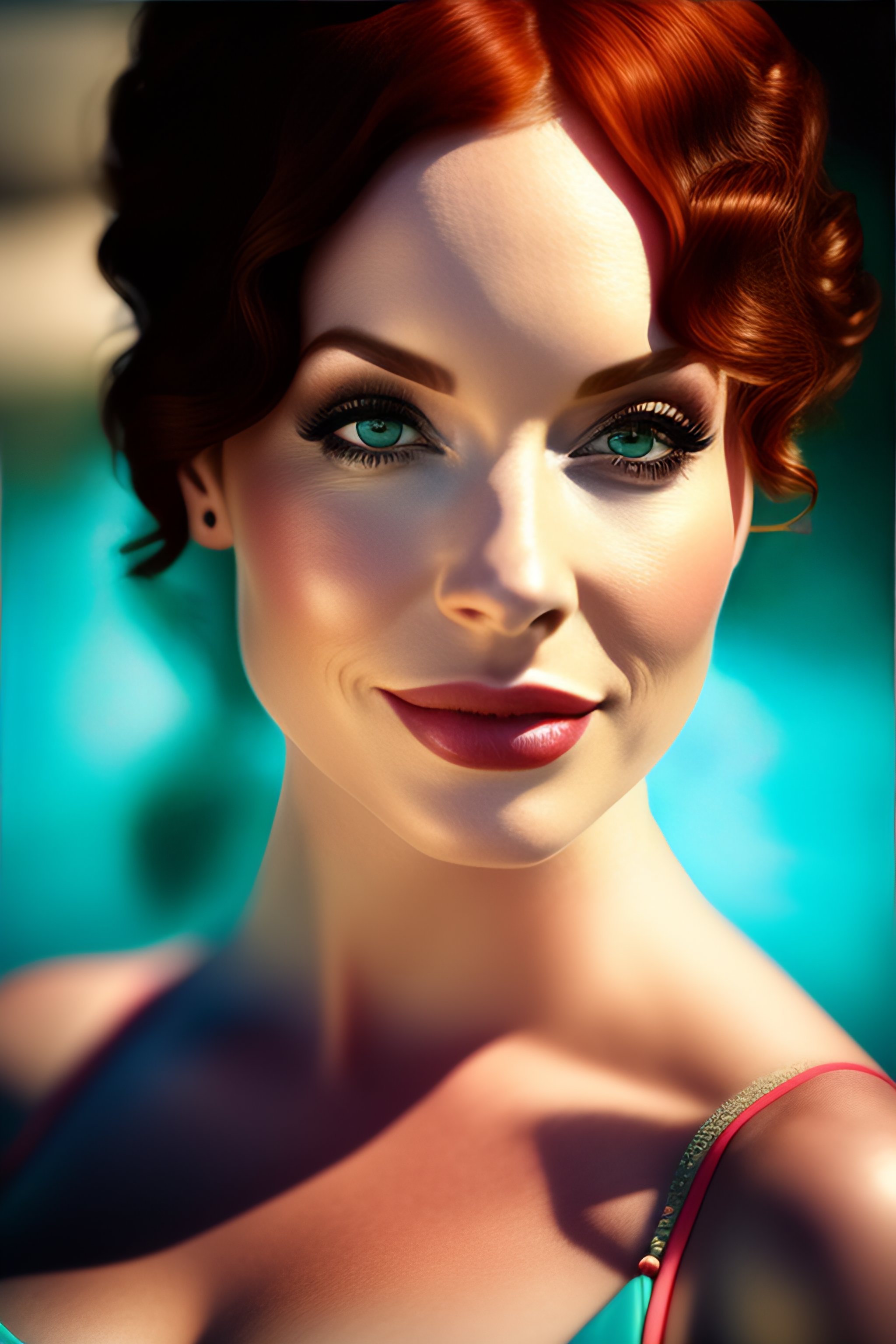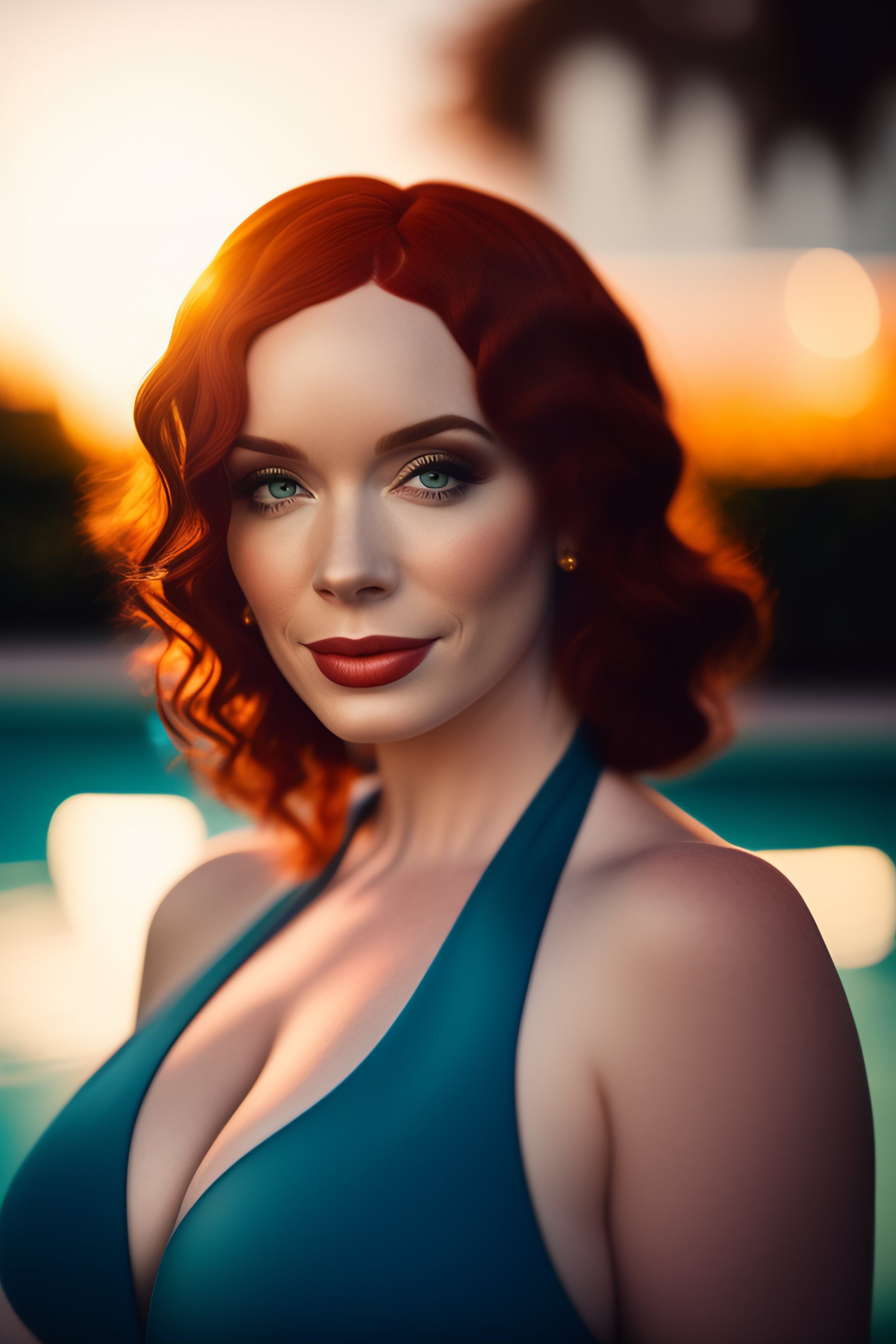 Christina hendricks, los angeles, pool, young, dslr, 50mm lens f/2.8, shutter speed 1/60, soft light source