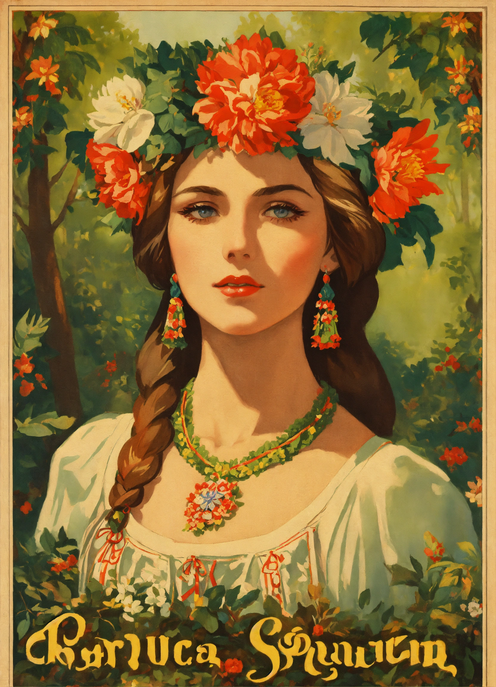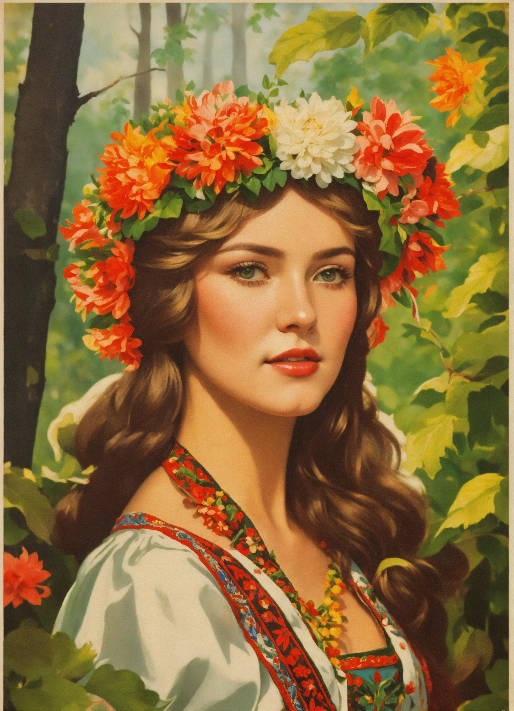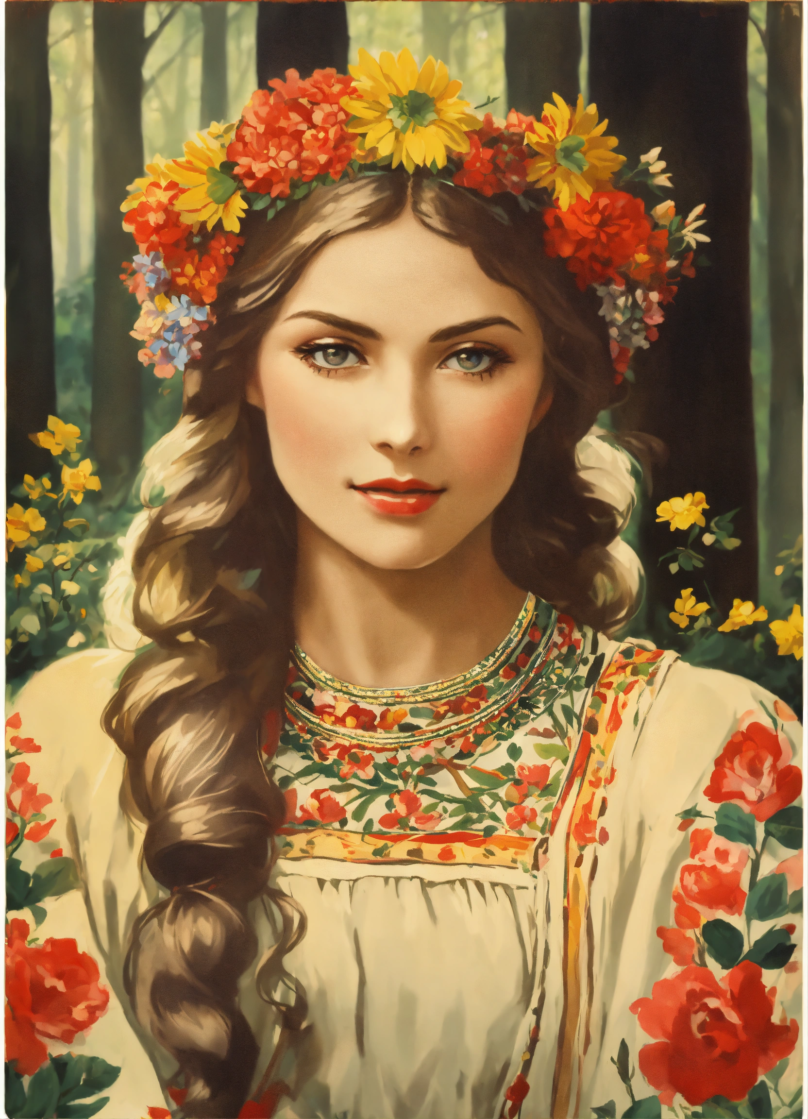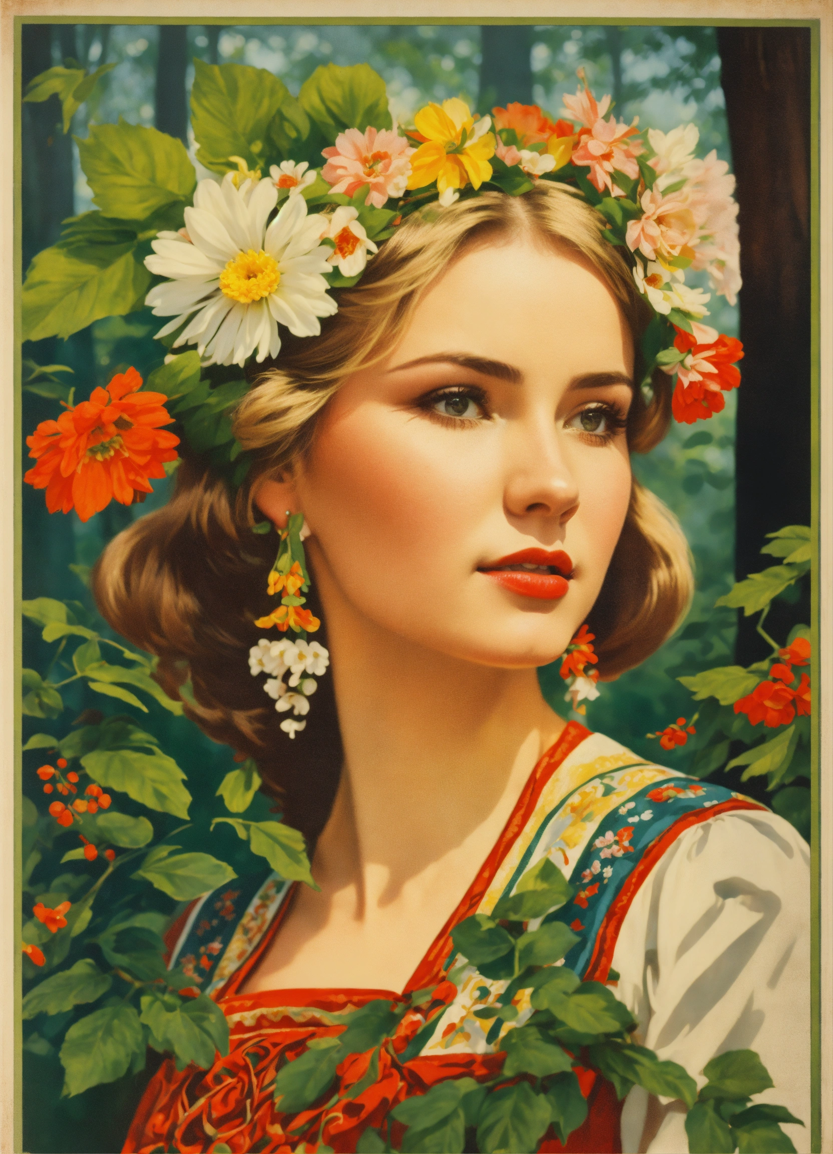 Vintage poster of a beautiful slavic woman’s face in traditional slavic costume, flower crown, dancing in the forest