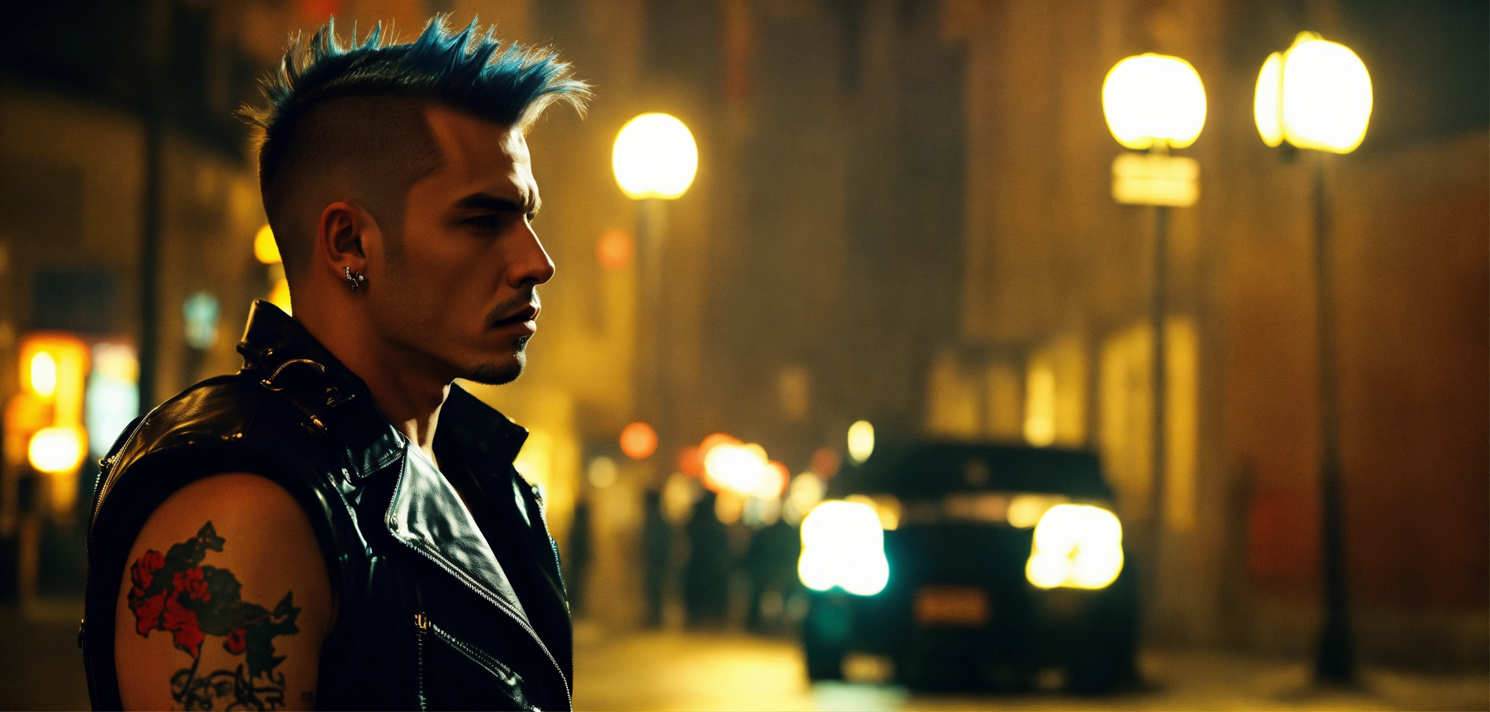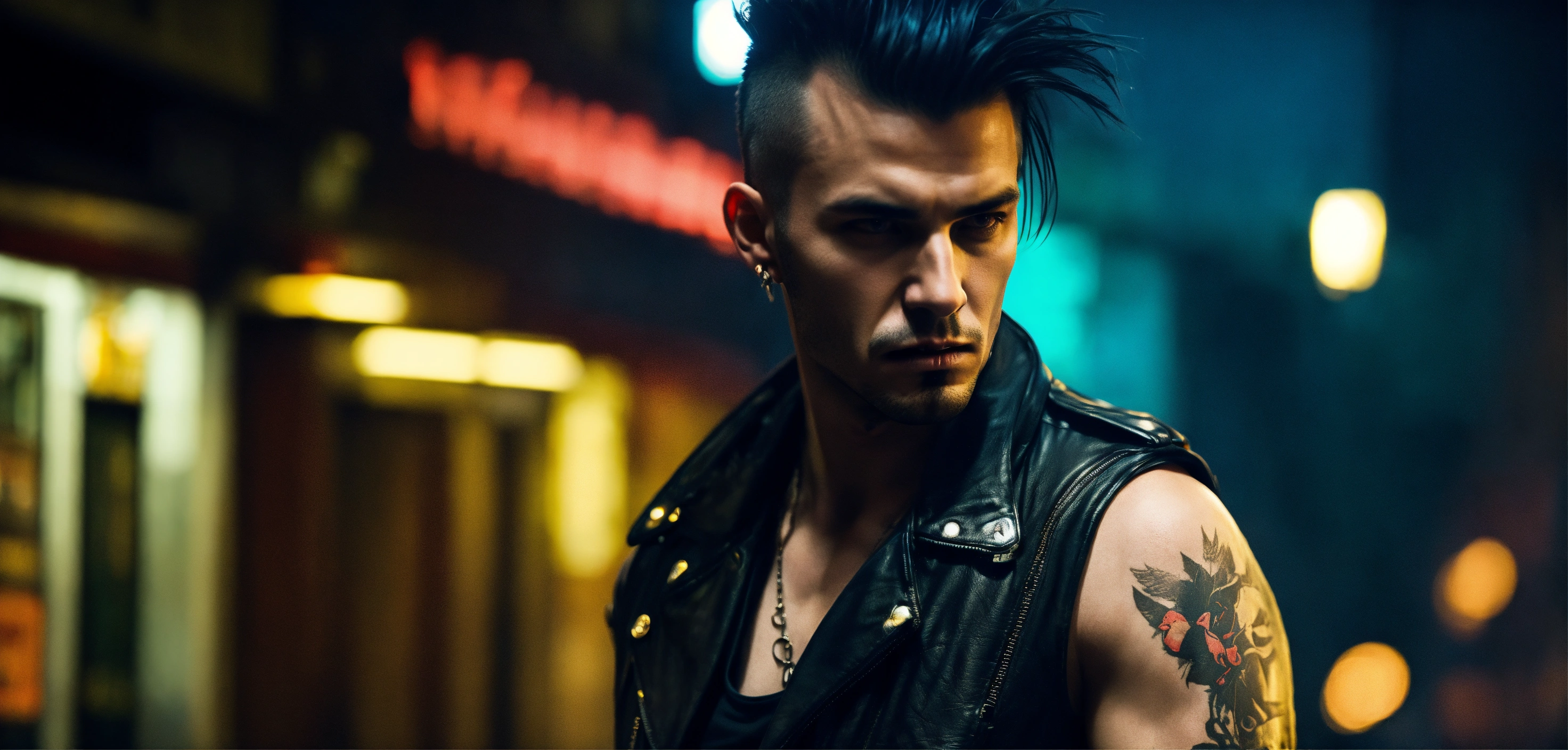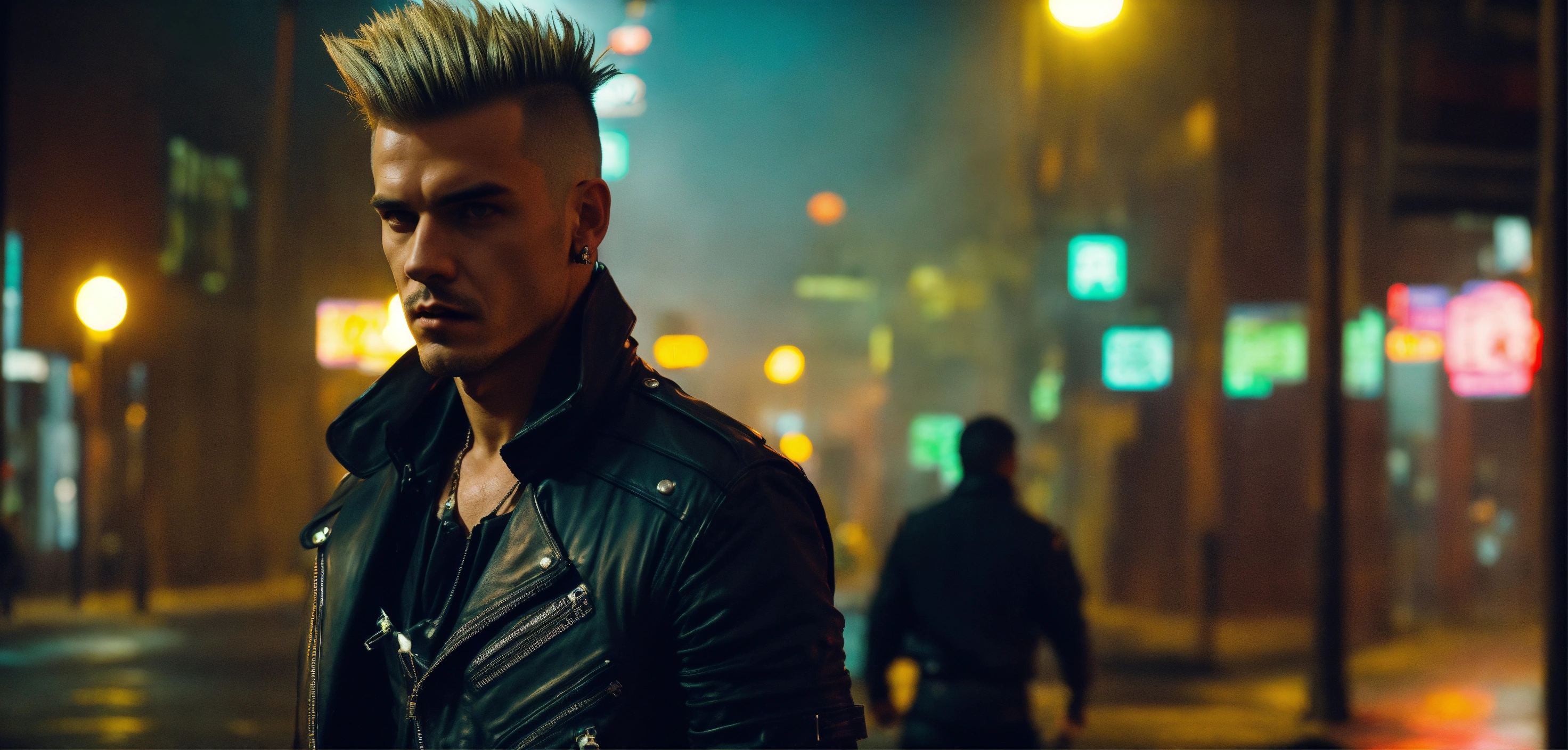 Cinematic look, male punk, leathr biker vest, undercut hairstyle, urban city street by night, haze, underworld vampire movie style