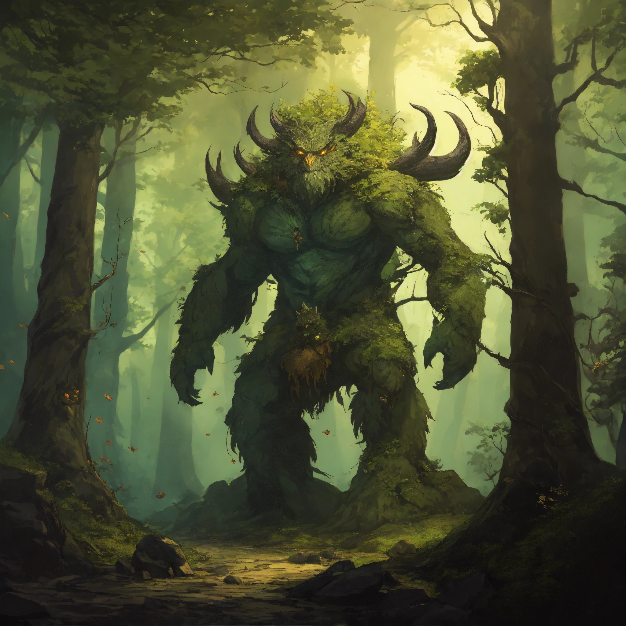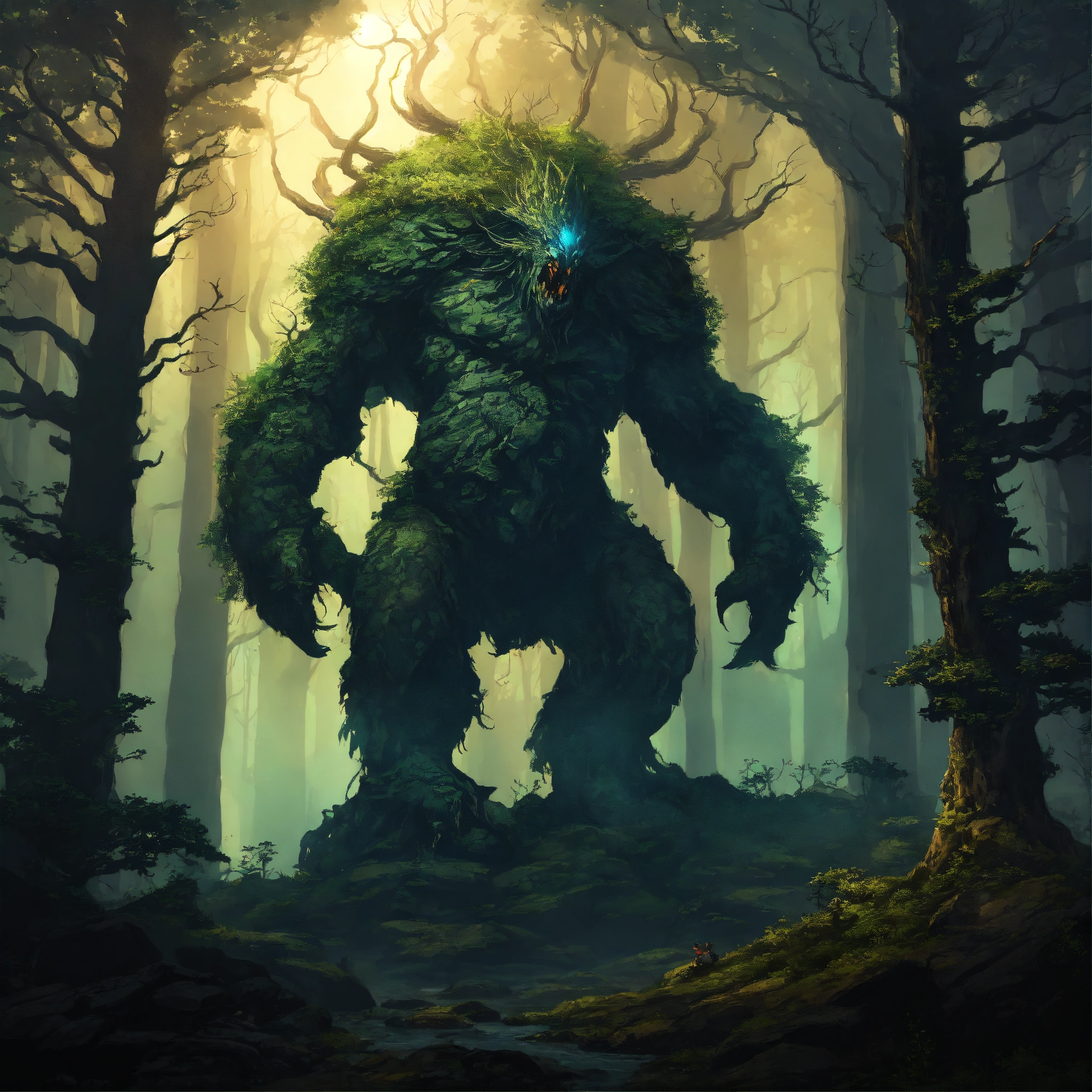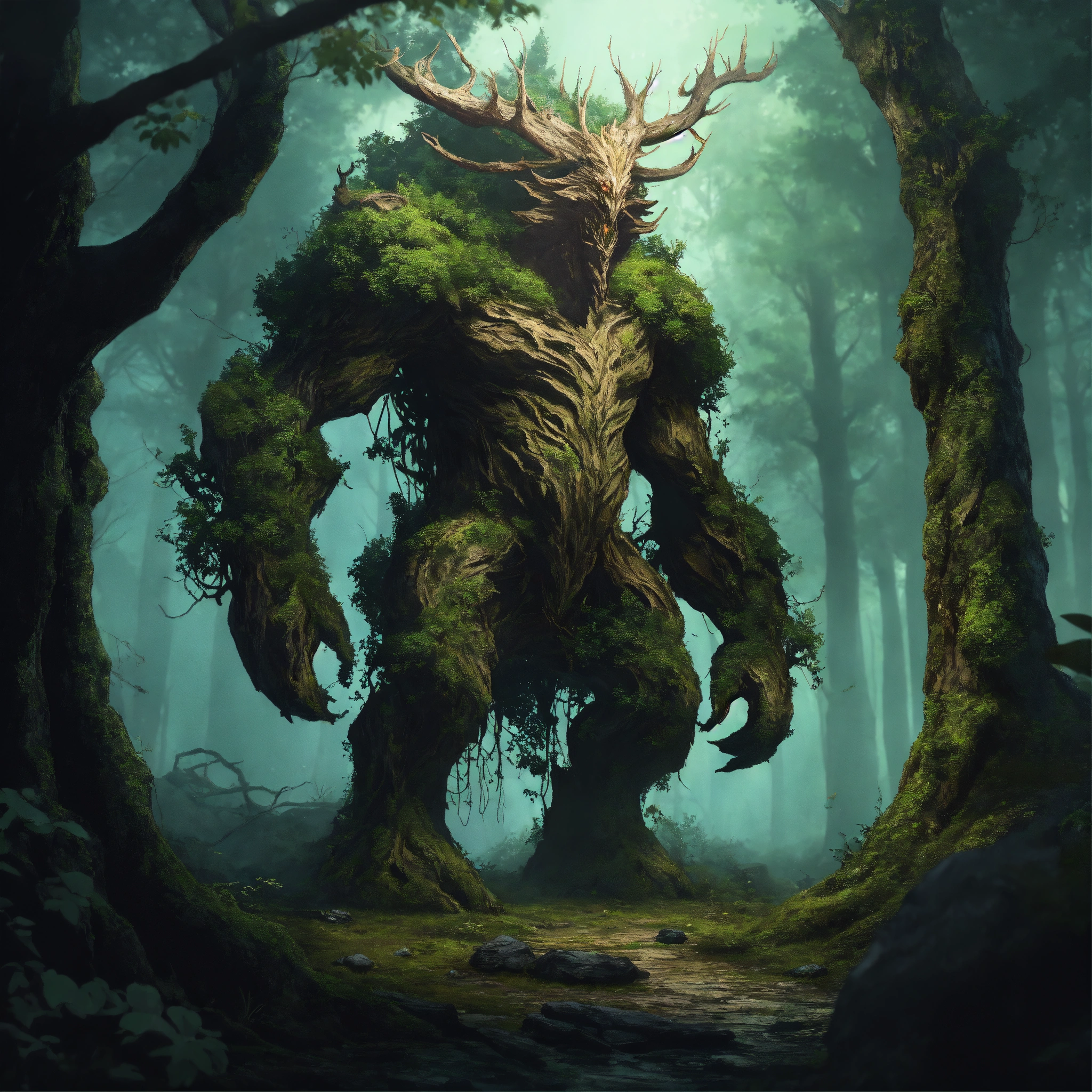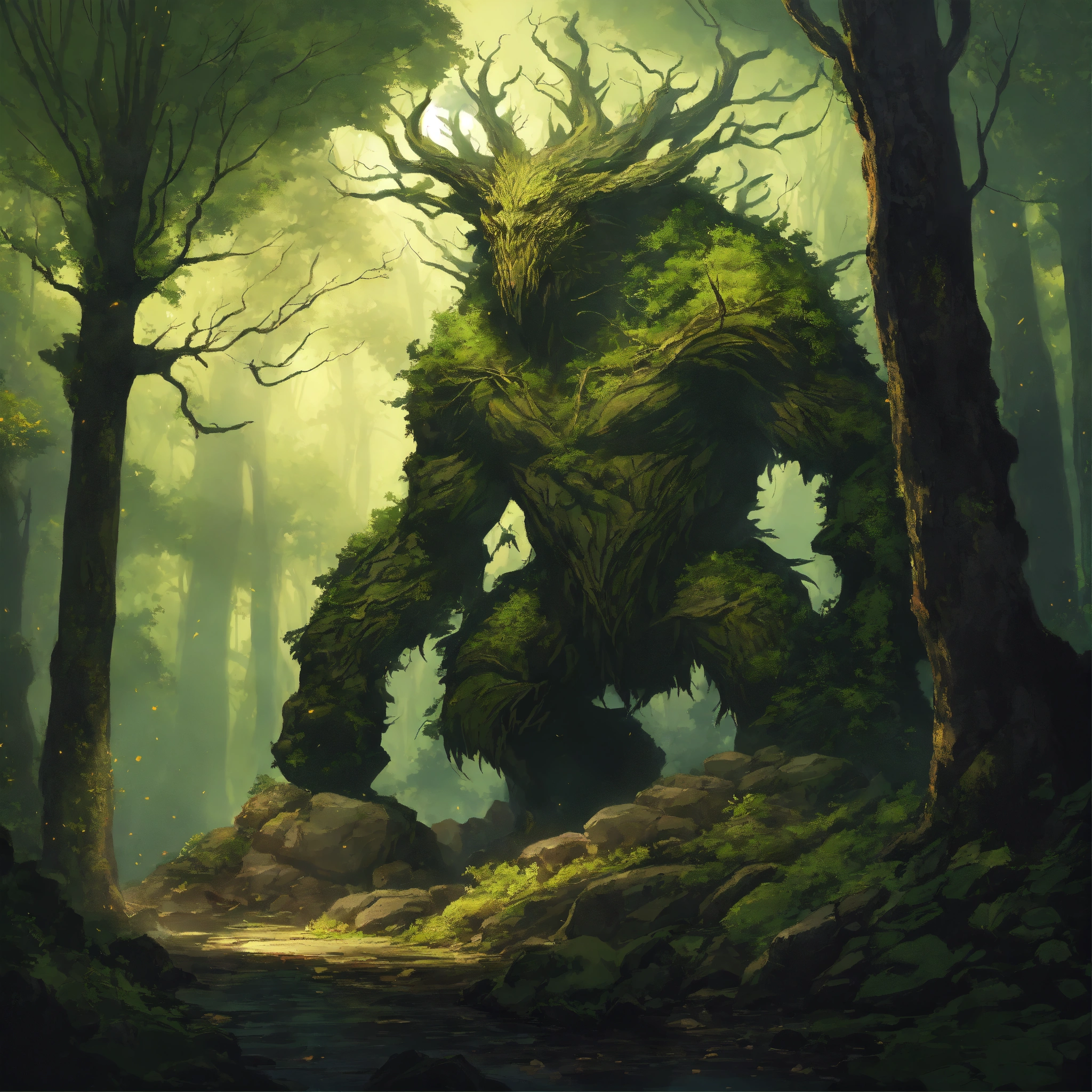 A fantasy monster that is a guardian of the forest, large in stature, looks like a tree and rocks attached to its body, background dark forest, graphic novel art