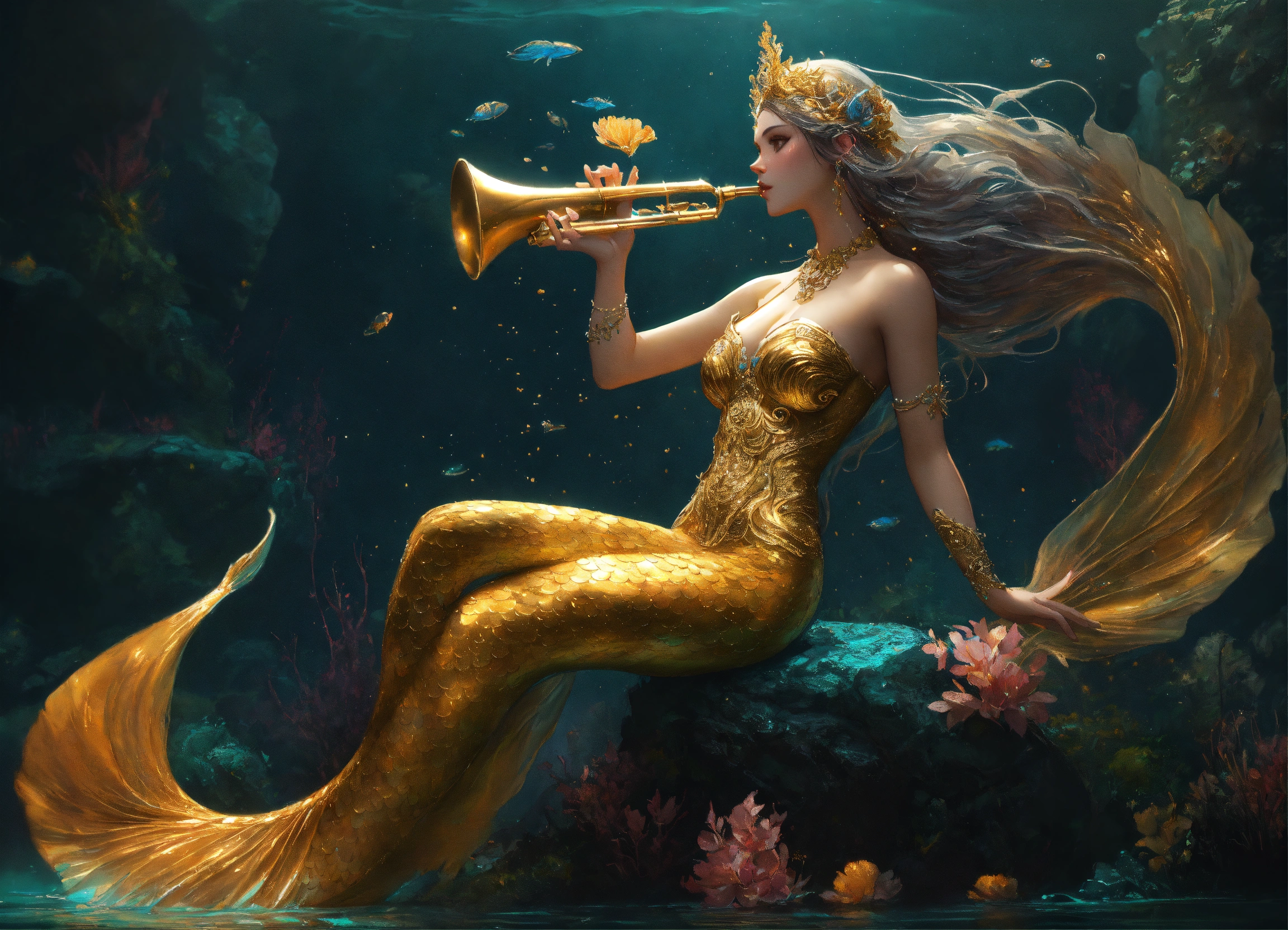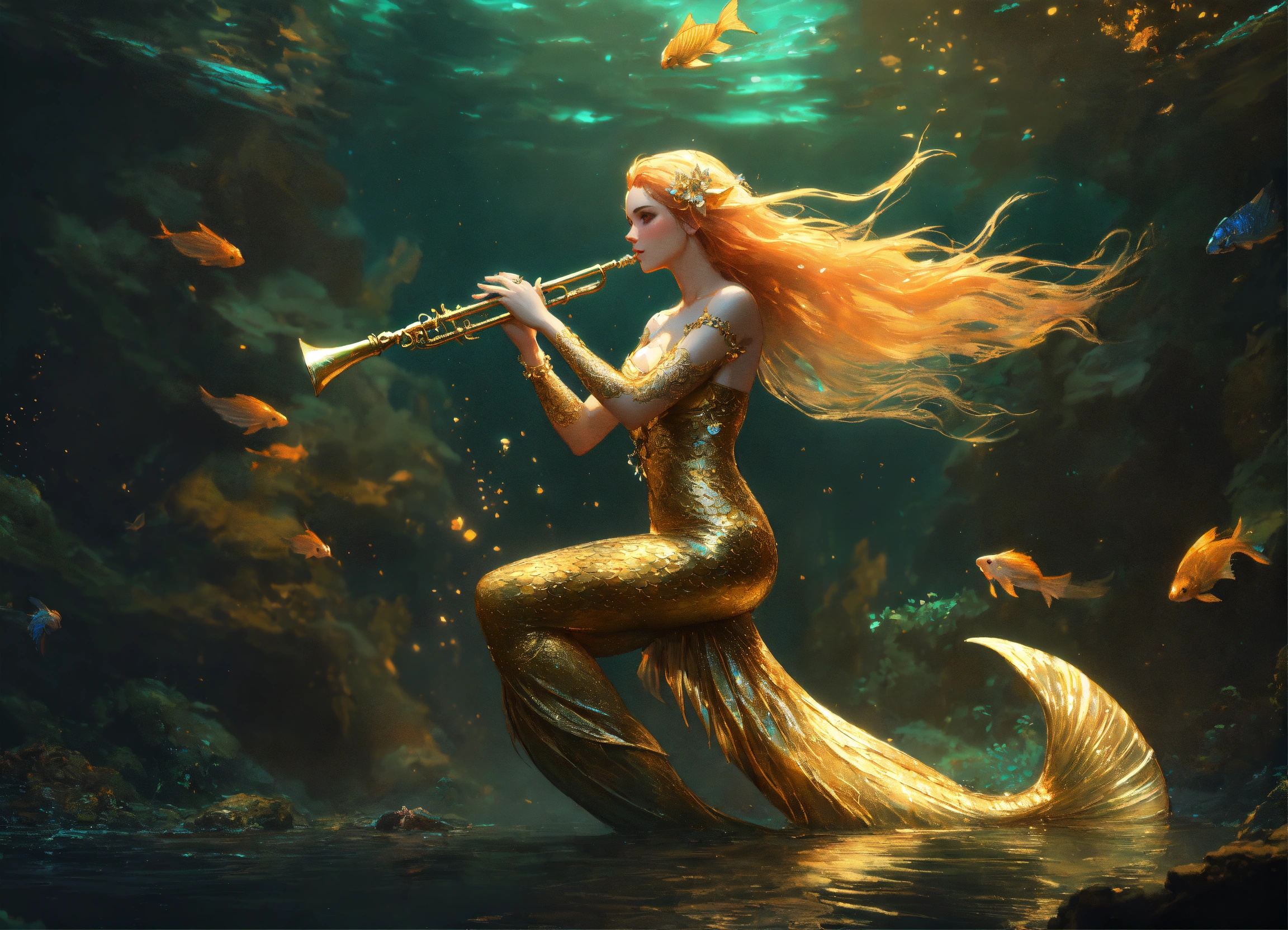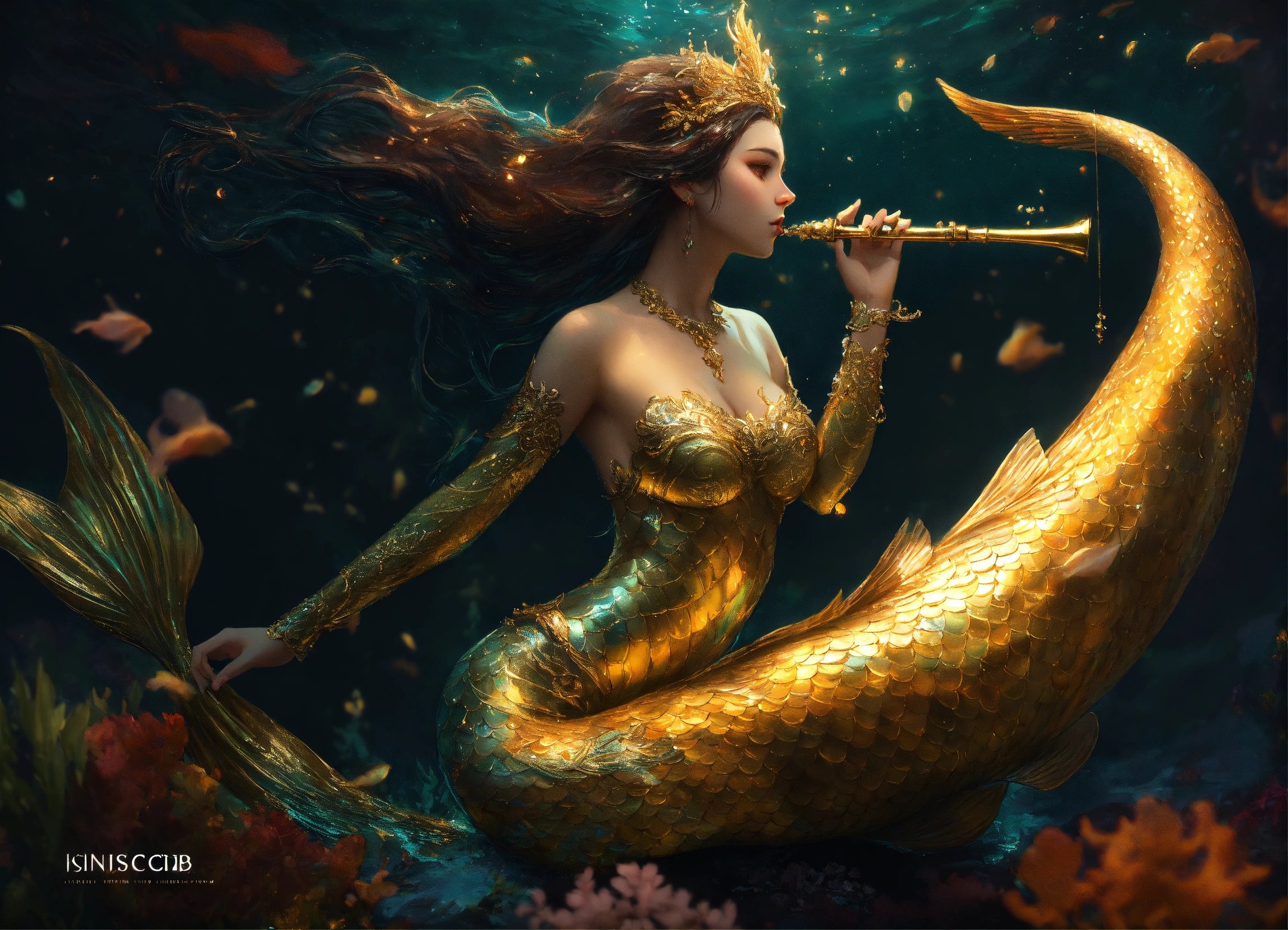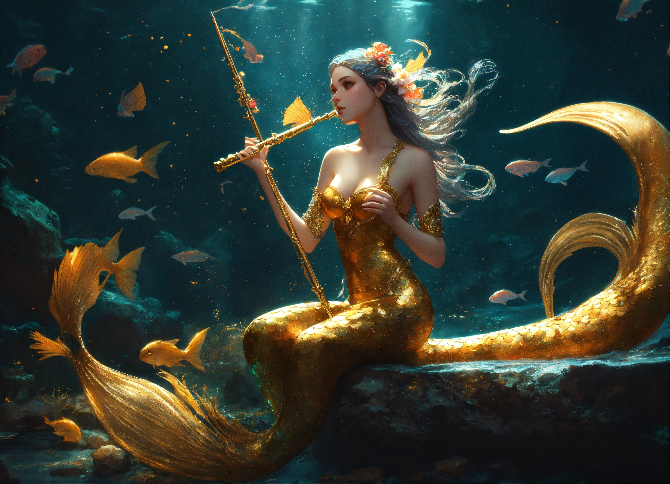 Insanely detailed illustration of a full body majestic mesmerizing mermaid playing a golden flute, flowing perfect mermaid tail, shimmering, black background, ethereal, intricate and hyperdetailed painting by ismail inceoglu, huang guangjian, cgsociety, zbrush central, fantasy concept art, 64 megapixels, 8k resolution, hdr, photorealistic, a masterpiece, ultra high quality