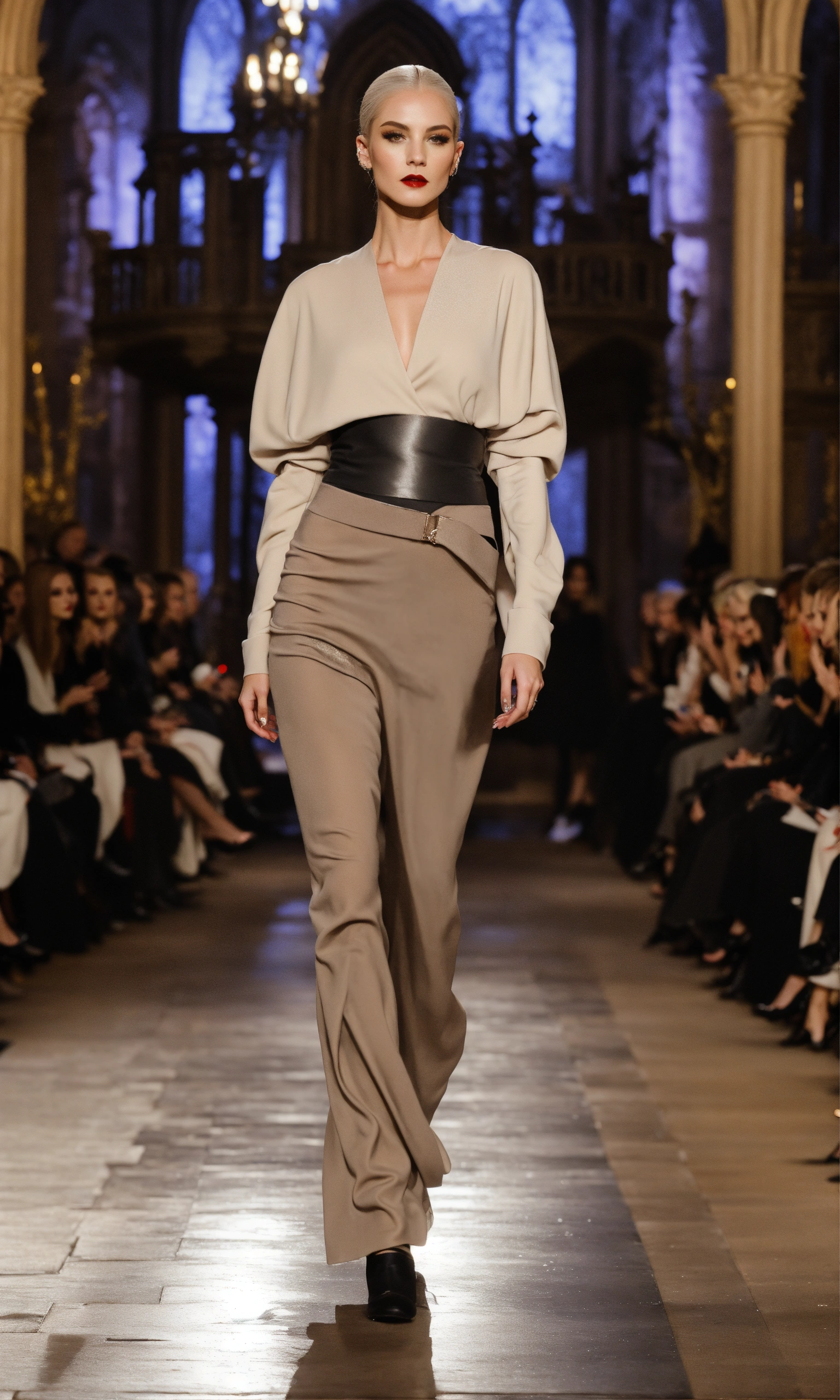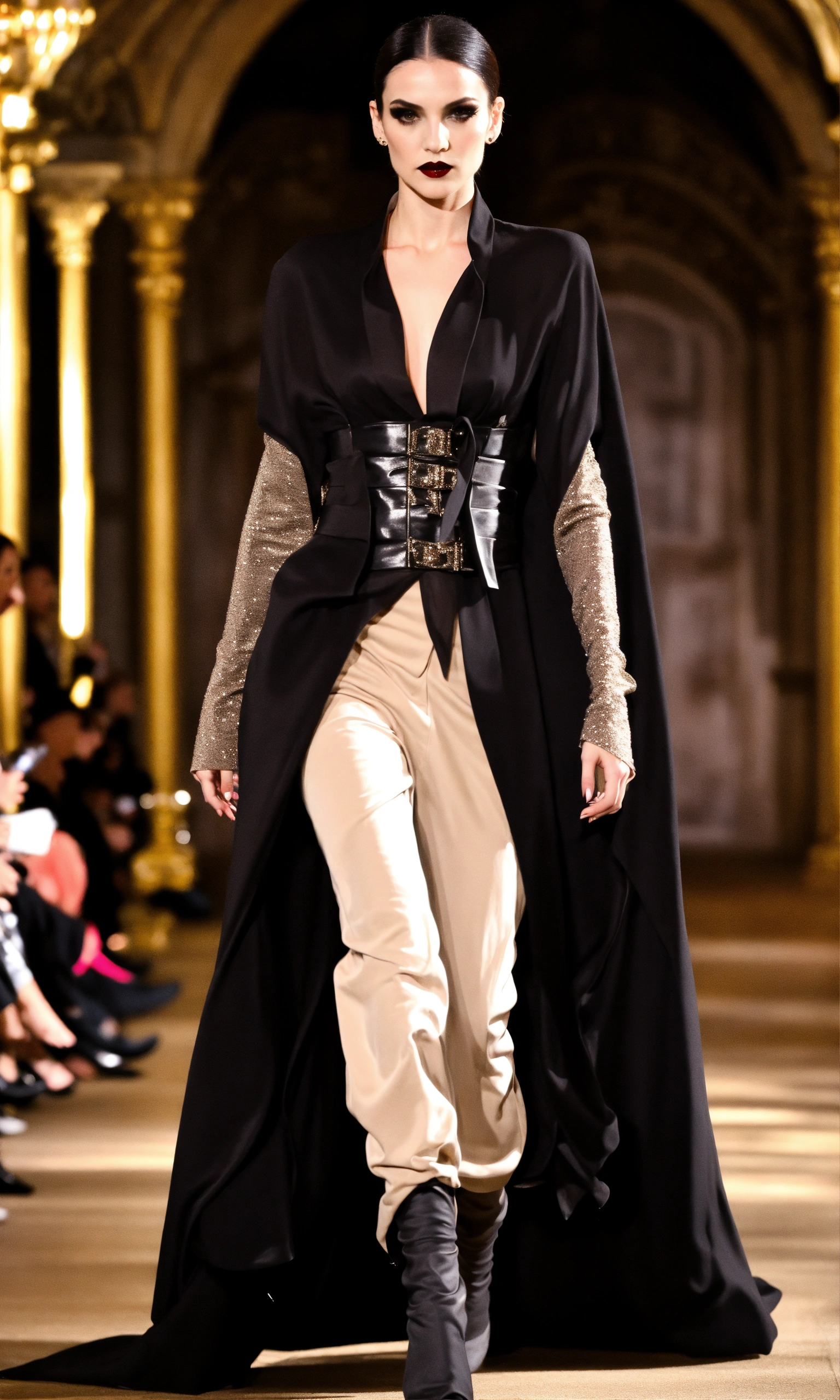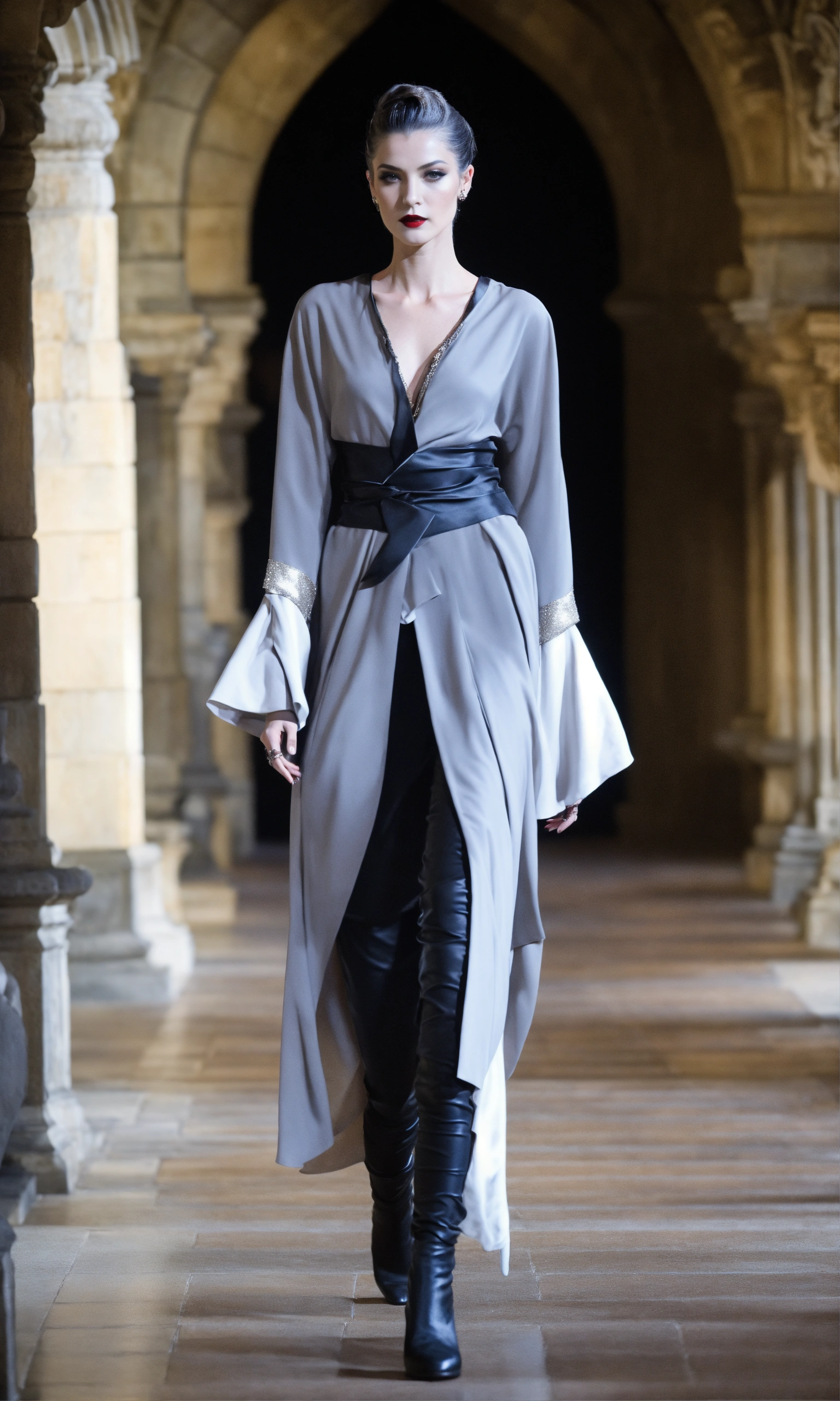 Lothlorien androgynous royal vampire walking runway during vamp fashion week wearing dolman sleeve dark donna karan vamp fashion in black, white, grey, beige, stone, metallics, shimmer walking runway at a goth castle