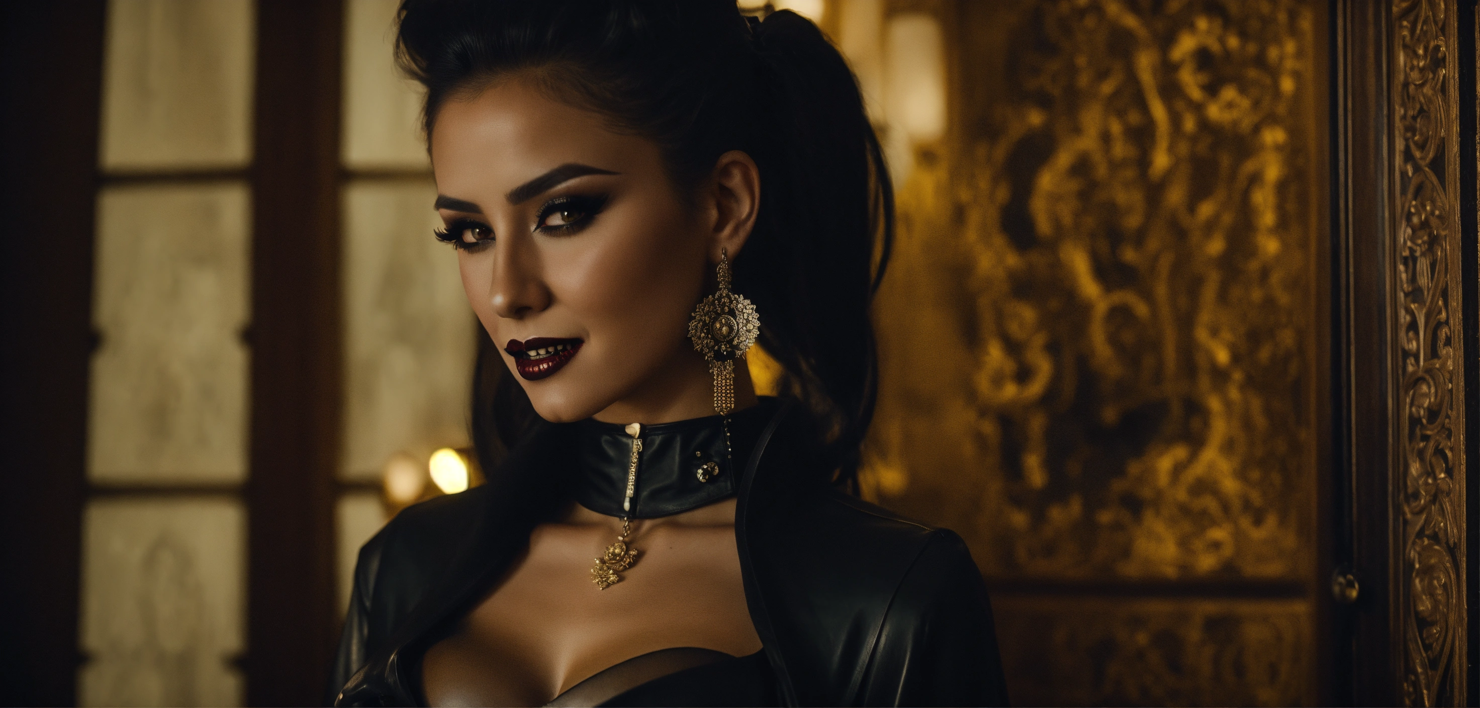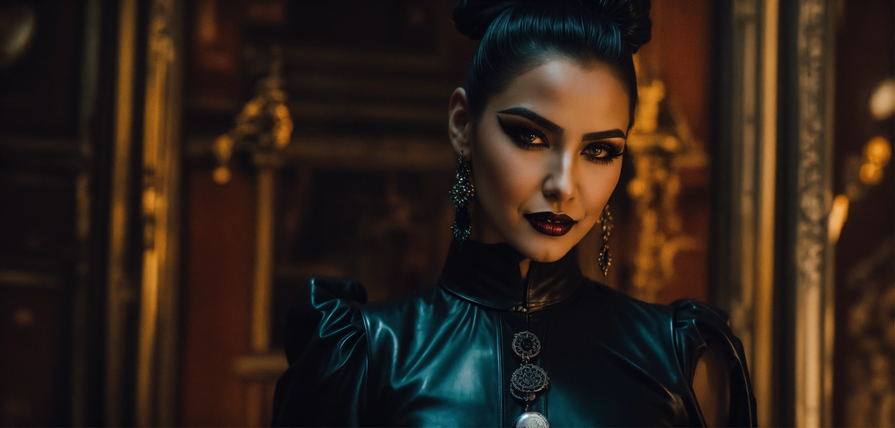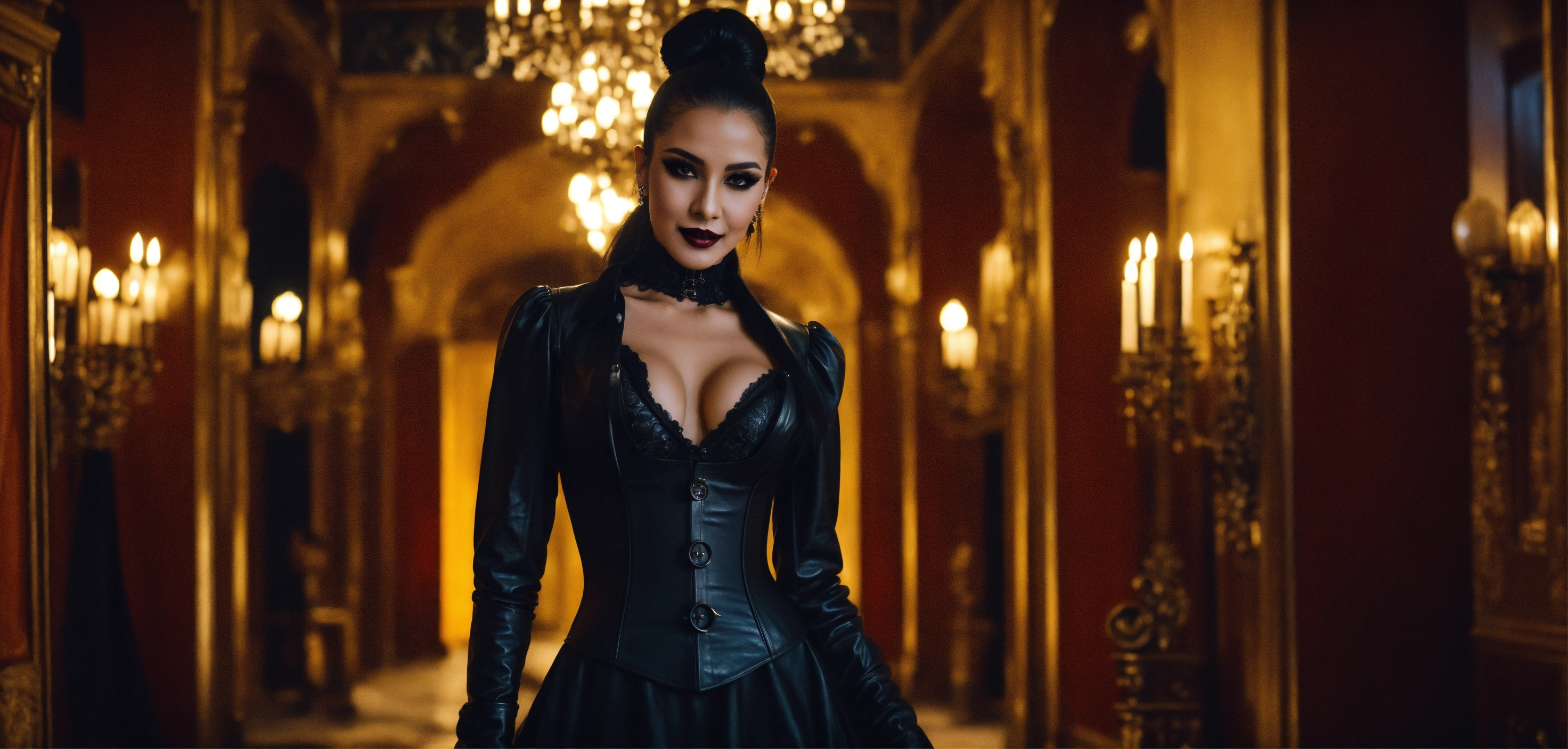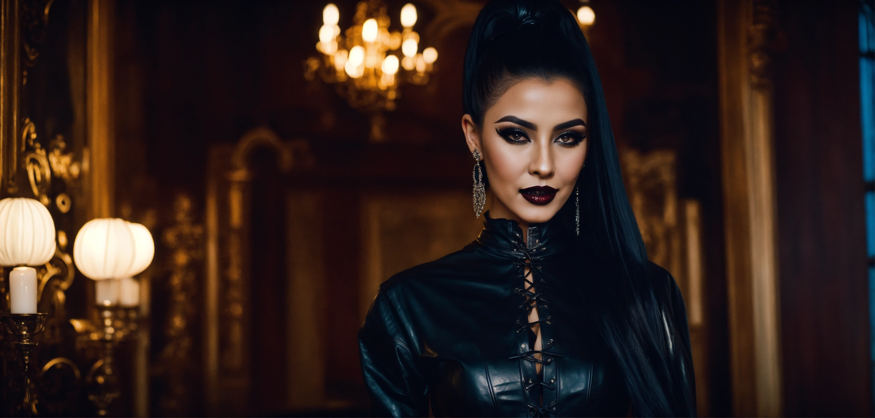 Cinematic look, stunning arab seductress woman fashion model, arrogant evil smile from above, black straight high ponytail hair, black leather corset, long strict victorian wide black long leather shirt dress with long big puff sleeves and big buttons, mansion hall by night haze, eyeliner makeup, underworld vampire movie style