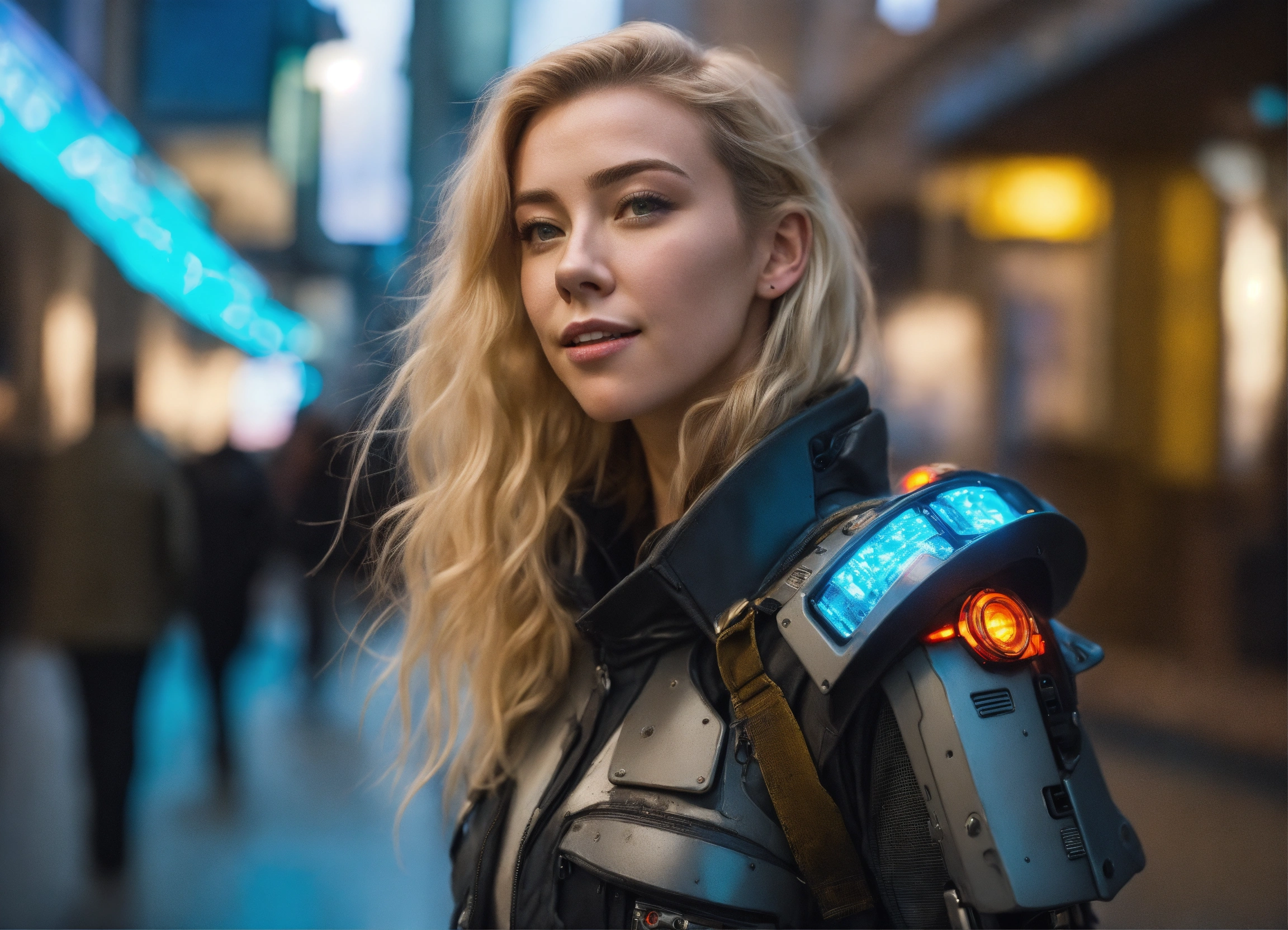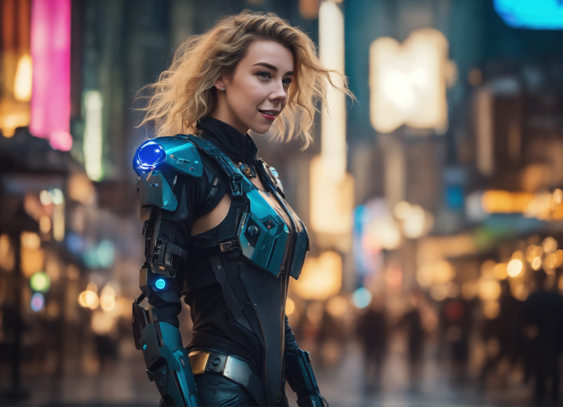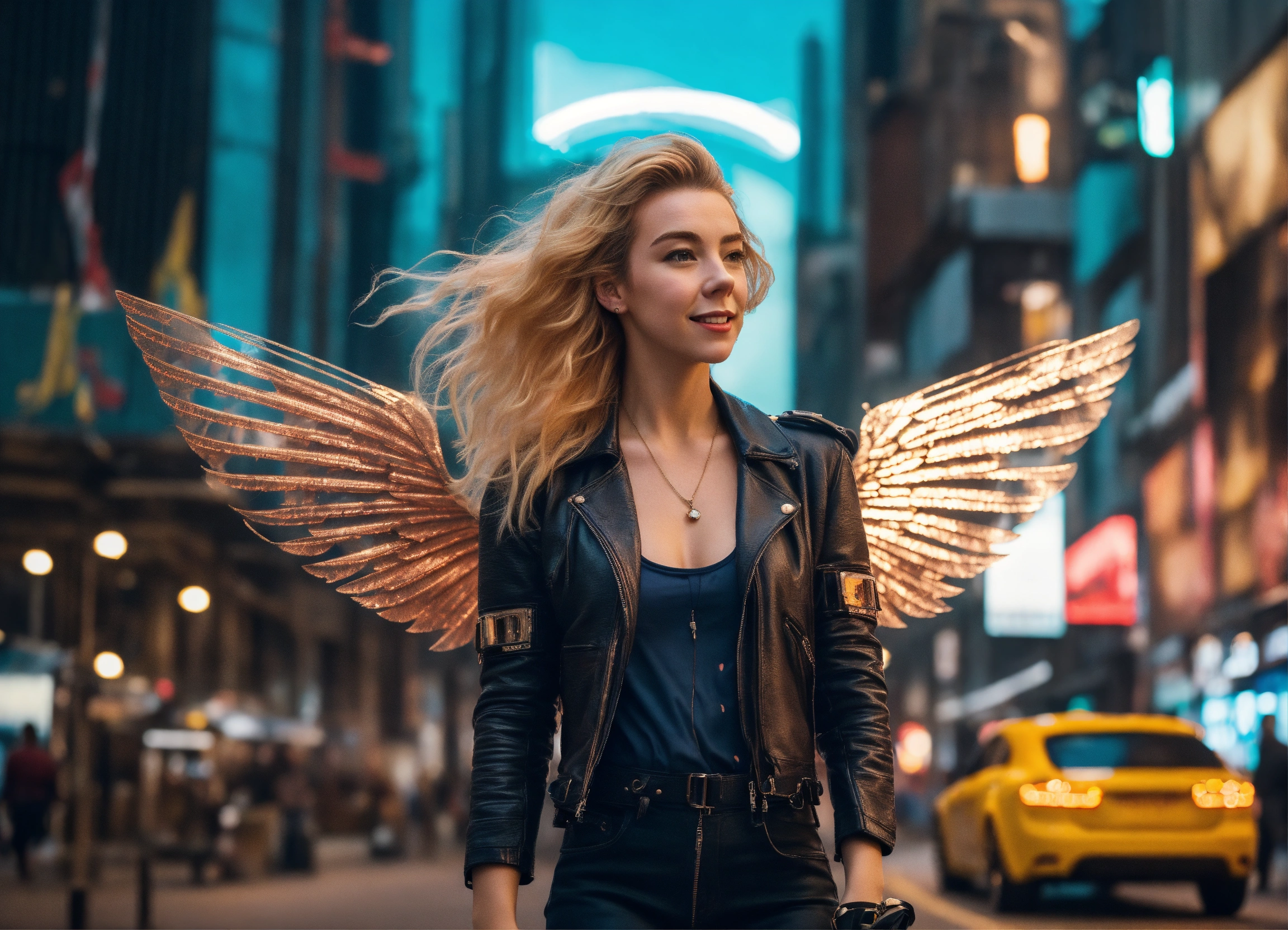 Text full body top view real life photo of a women looking happy she looks a bit like vanessa kirby has blond hair 18 year old woman with big angelwing's wearing mechsuite in a cyberpunk like city