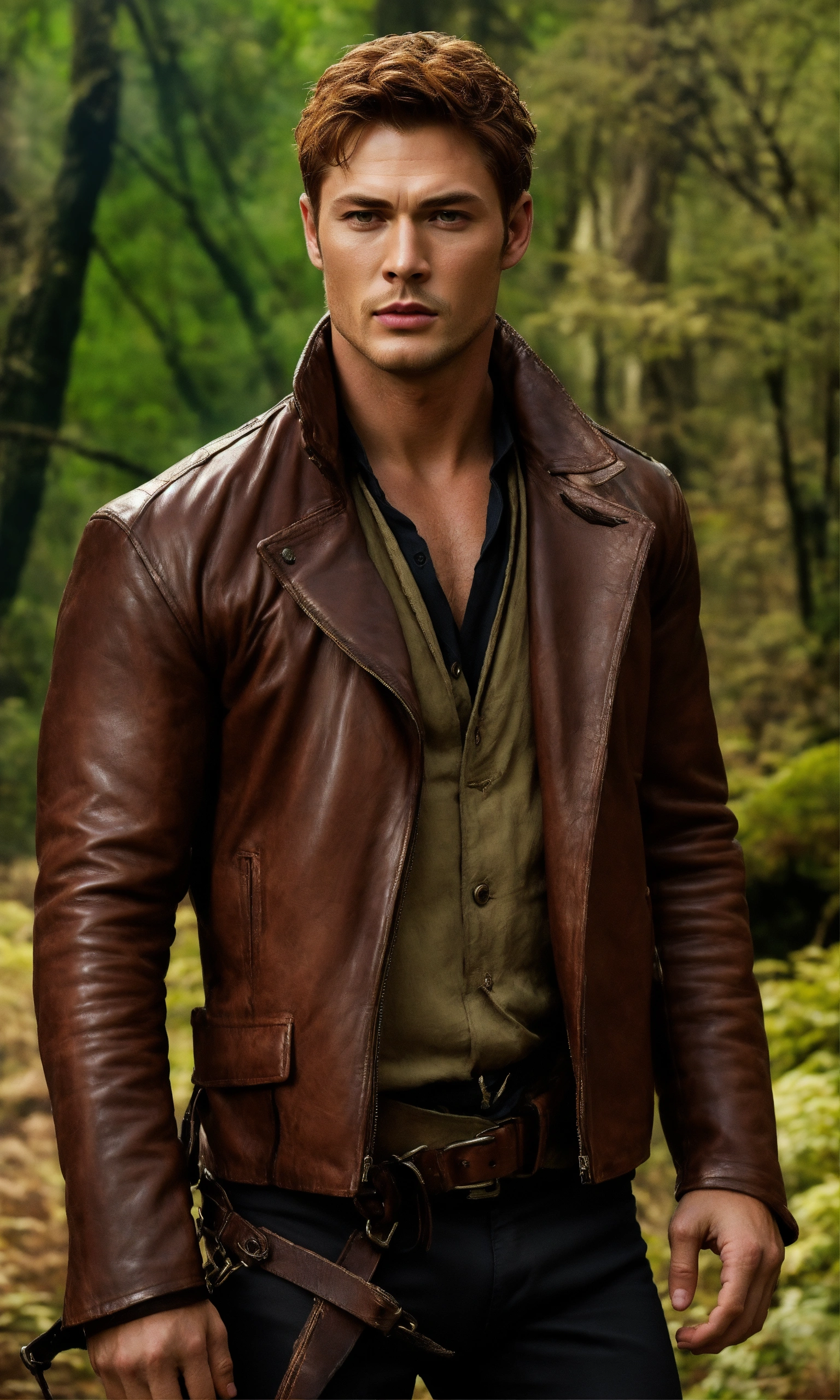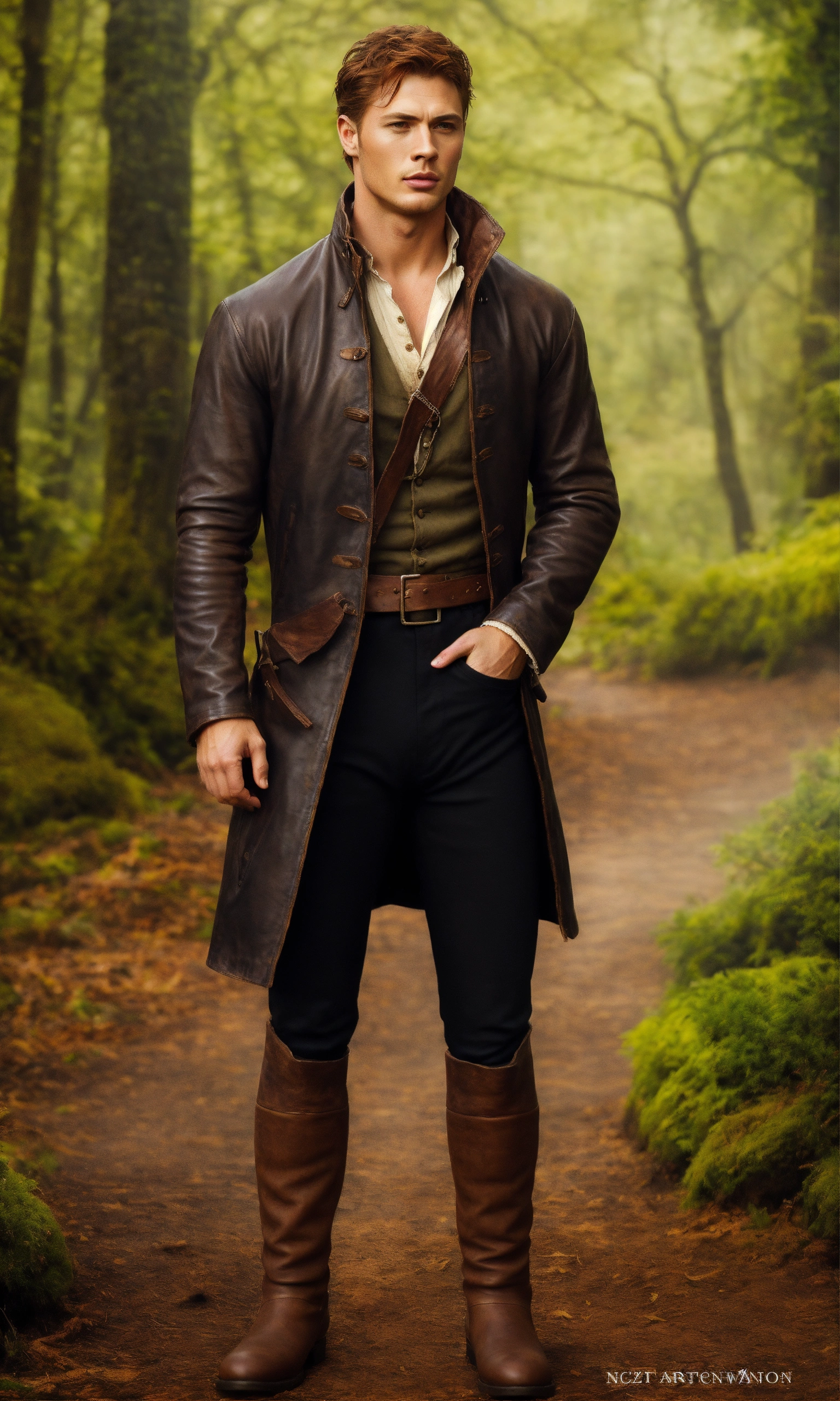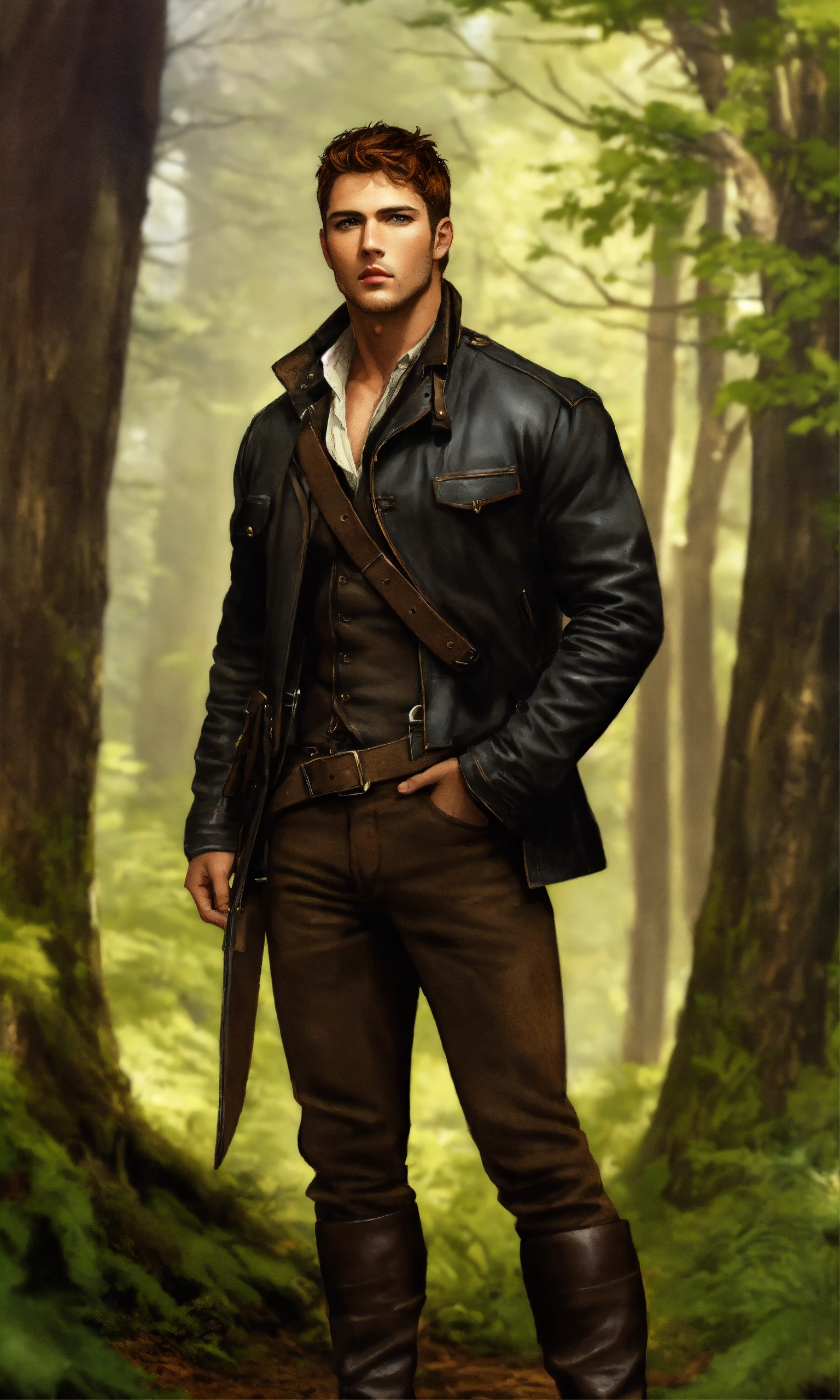 Concept art of handsome period man, poldark, poldark, megan fox, jamie fraser, outlander, period man in forest farm, short ginger red hair, very tan skin, hazel green eyes, jenson ackles, jenson ackles, realistic illustration, sabine rich, artgerm, j scott campbell, perfect body, sharp facial features, slim nose, black eyelashes, perfect full lips, sharp jawline, sharp high cheekbones, dark brown weathered leather jacket, perfect detailed face, cinematic, full body, full body outfit view, flower forest cottage background, full body, fitted black weathered pants, tight fitted knee high boots, detailed, realistic illustration, colonial american, casual, dean winchester, short straight hair, dean winchester, short buzz cut hair, black fitted shirt, dean winchester's leather jacket, hyper realistic, dark weathered clothes, dark fabric, dark, dean winchester, jenson ackles face, buzz cut, straight hair, period man, straight hair, dean winchester, black pants