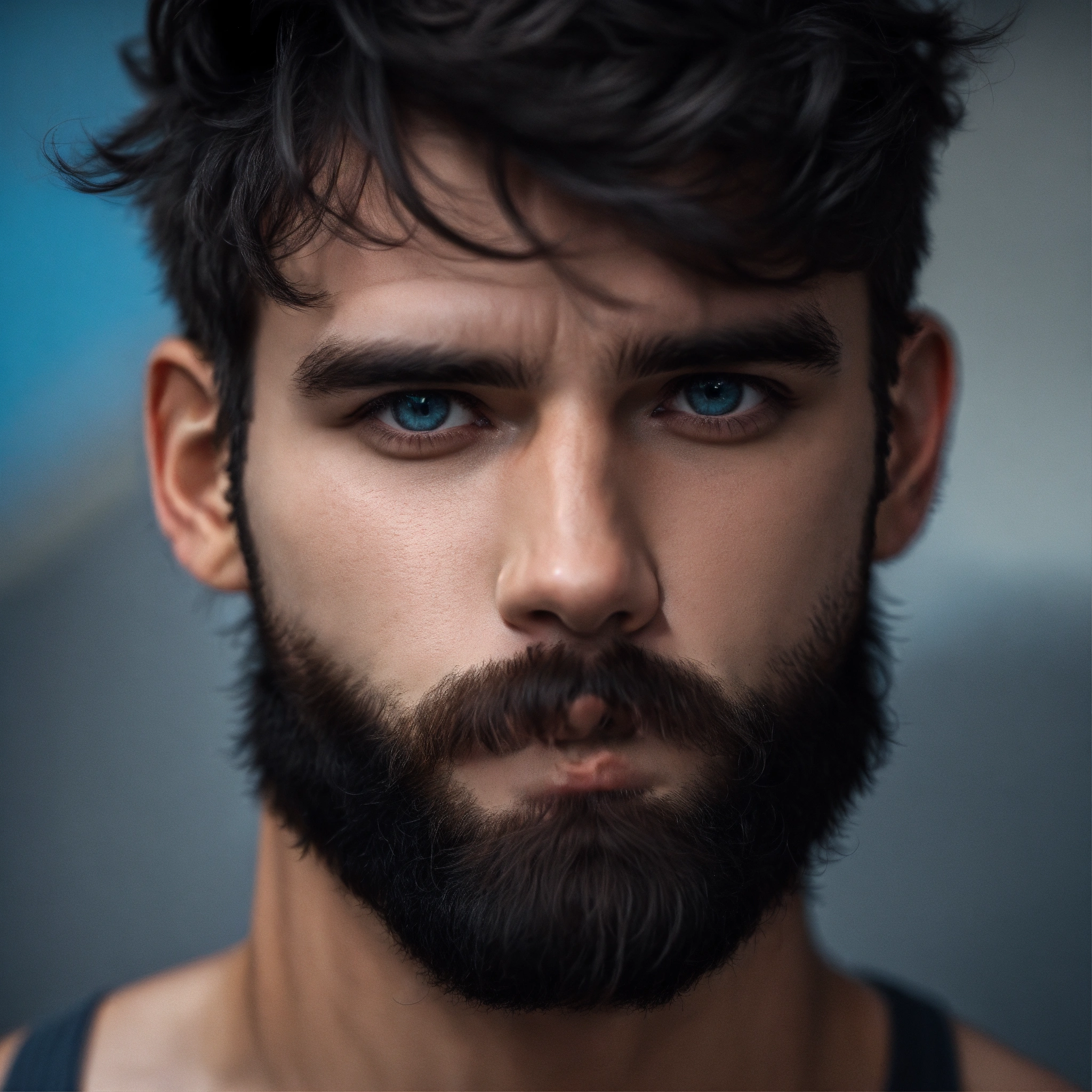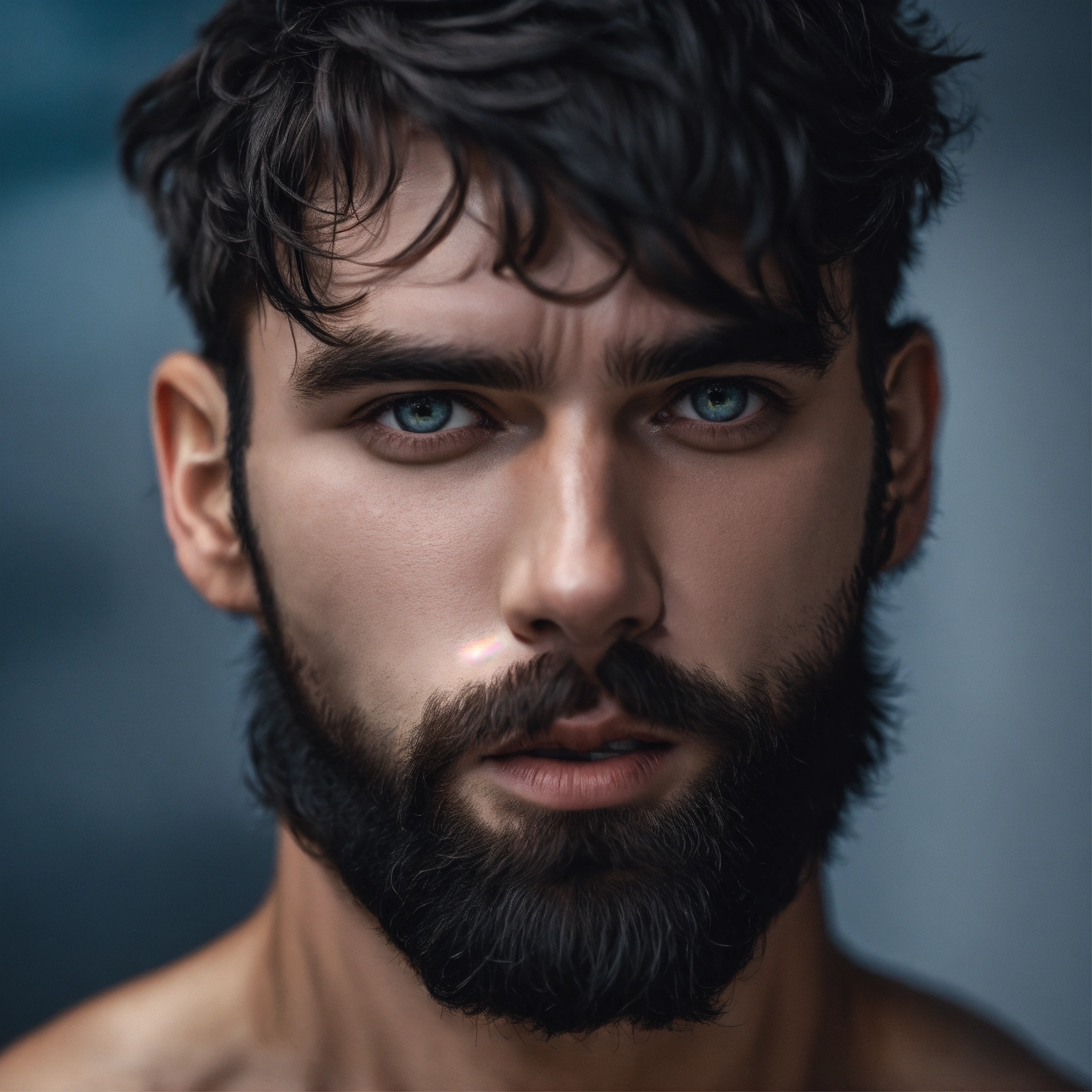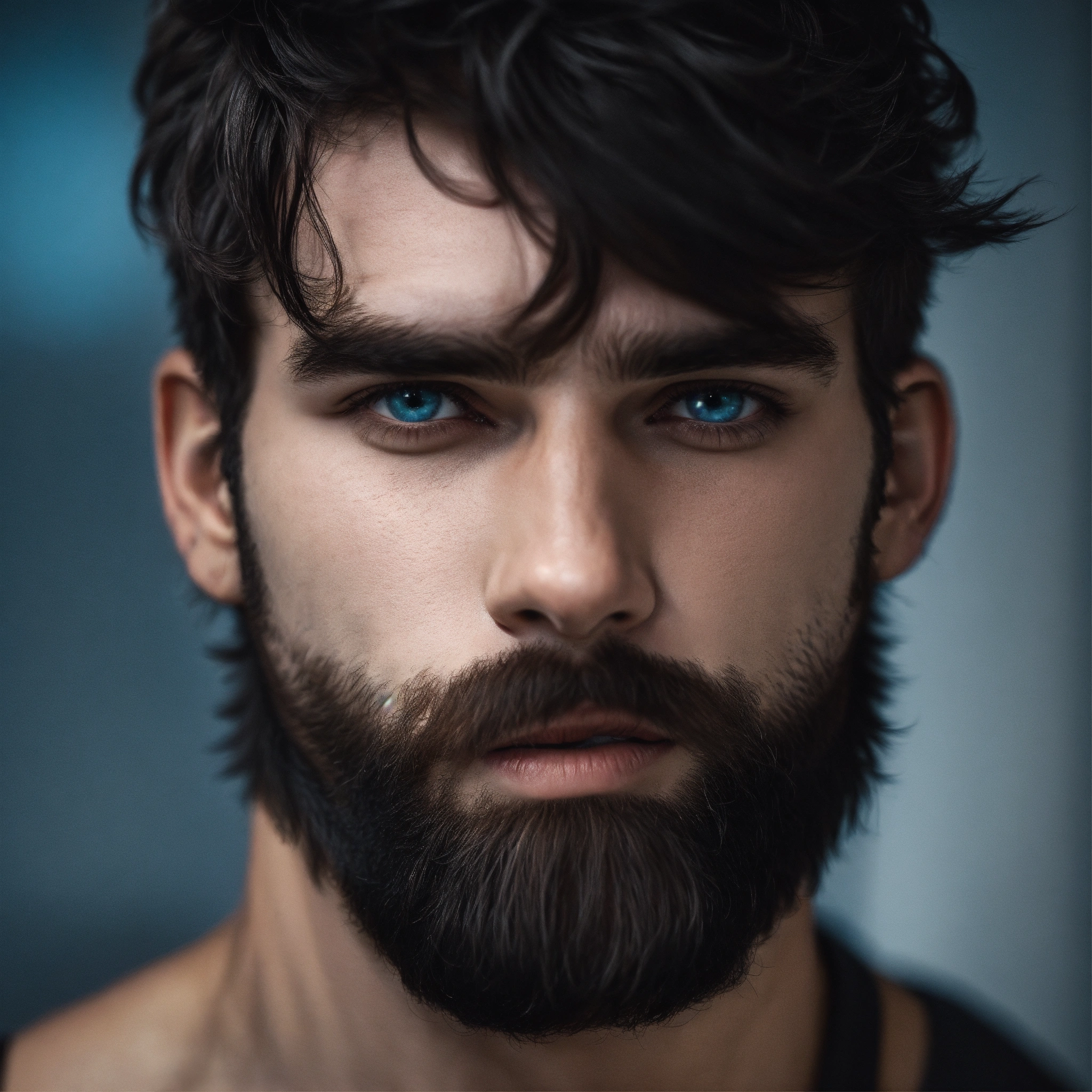 Hot white boy face blue ayes black hair muscular face and beard dark background