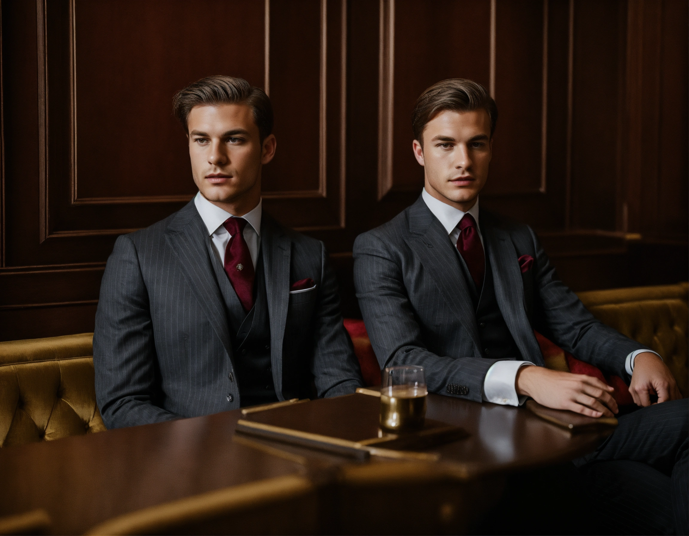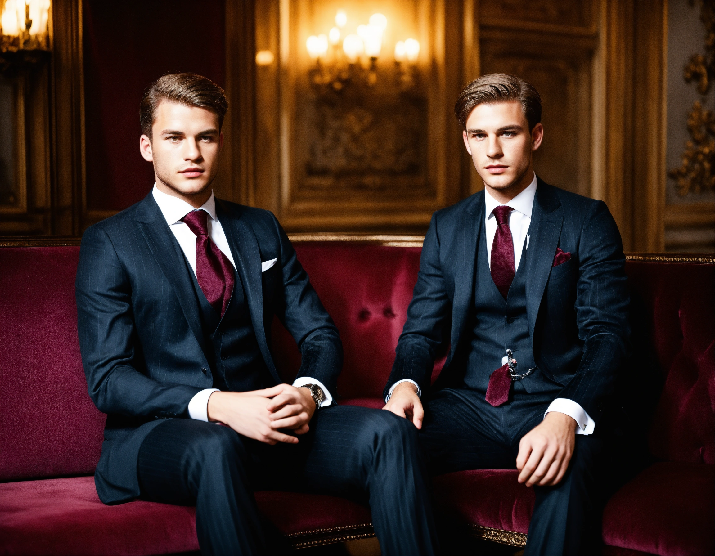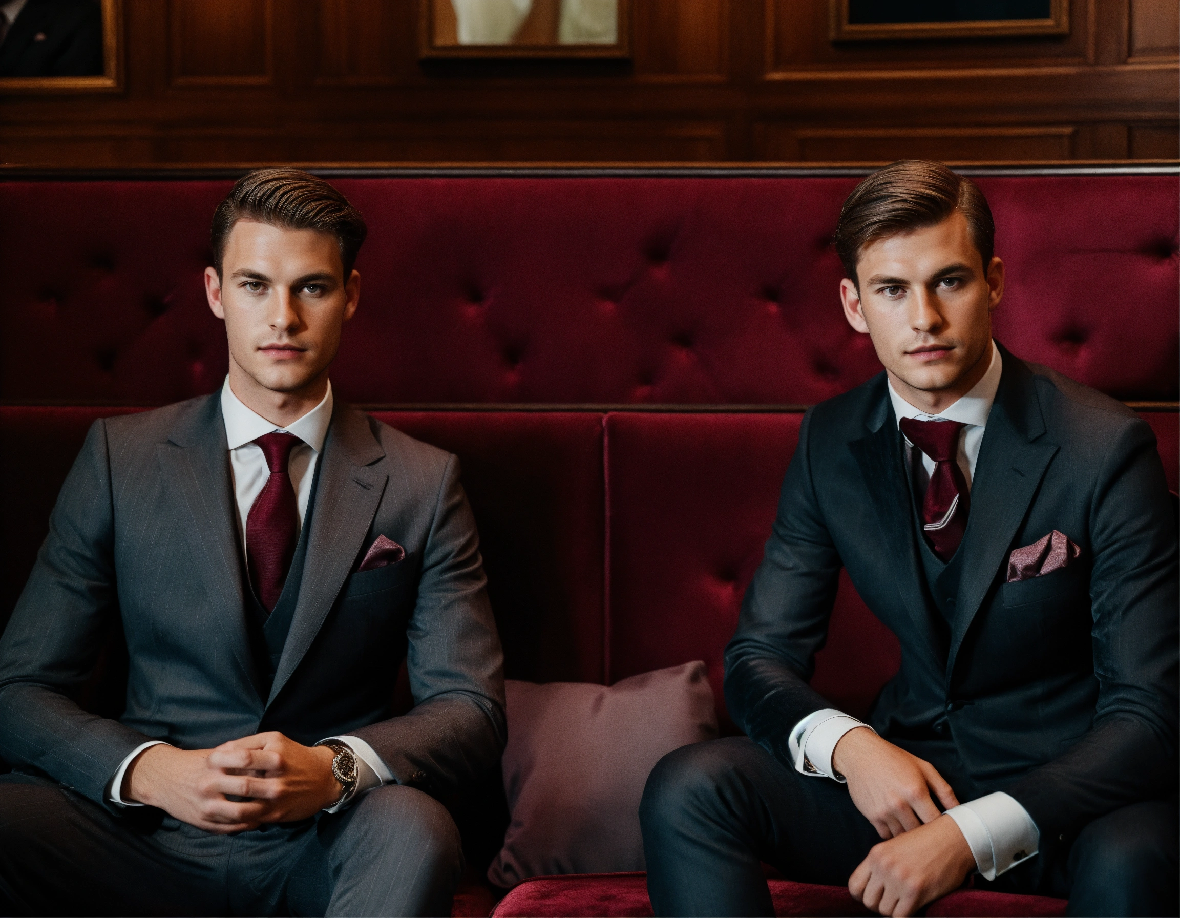 Two young german businessmen in dark grey pinstripe vested suit, burgundy club tie, seating on a velvet sopha