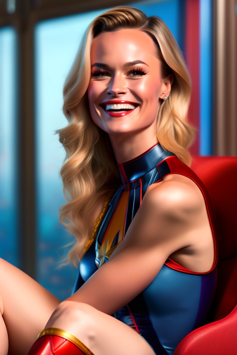 Brie larson as captain marvel sitting in an high fashion posefull body photo, attractive woman, beautiful hair, sexy outfit, photorealistic, victoria secret model, pale light skin, laughing, gorgeous face, very detailed, long legs, white lingerine, industrial background, cinematic, red lips, posing, kneesocks, stockings
