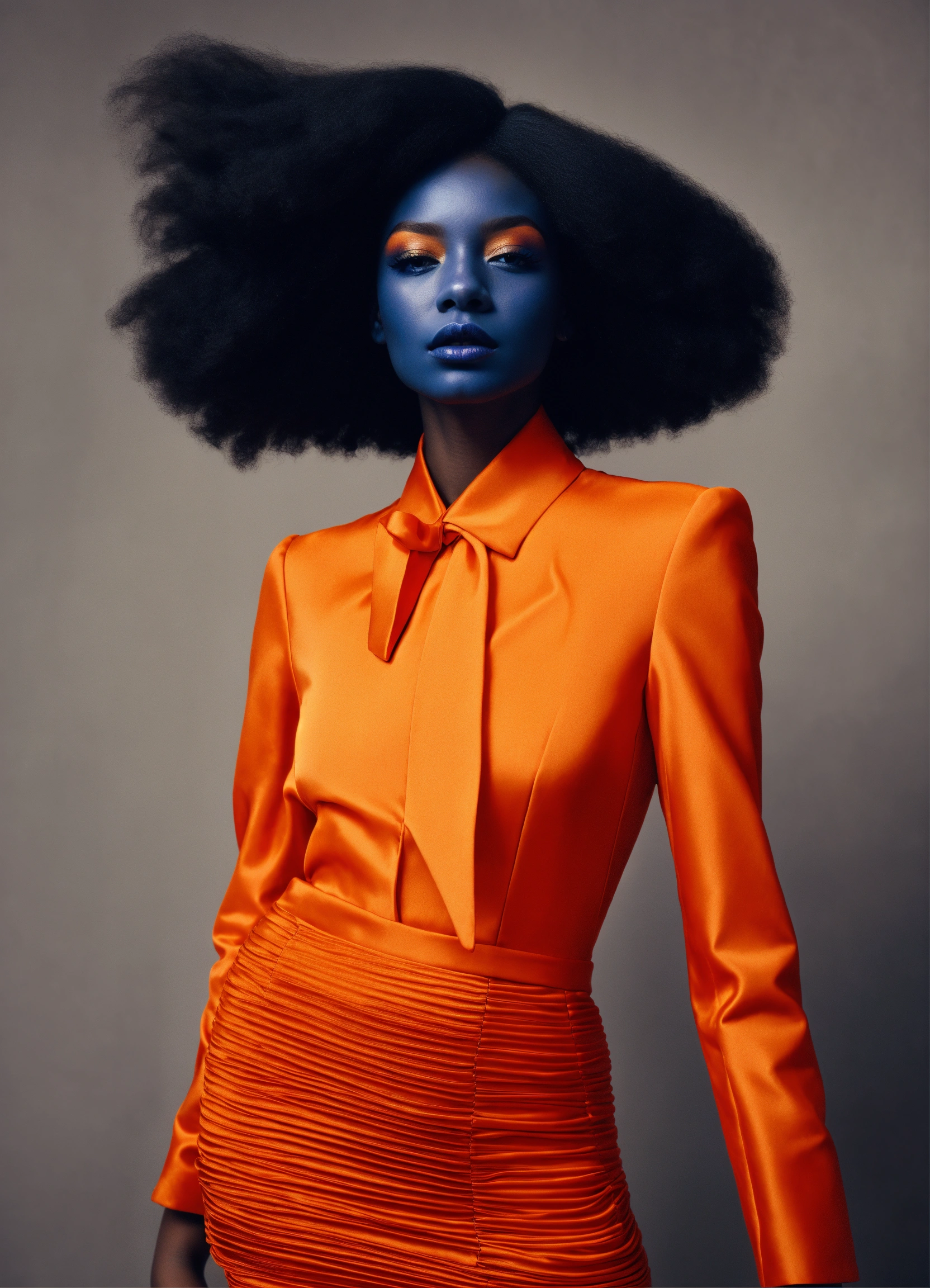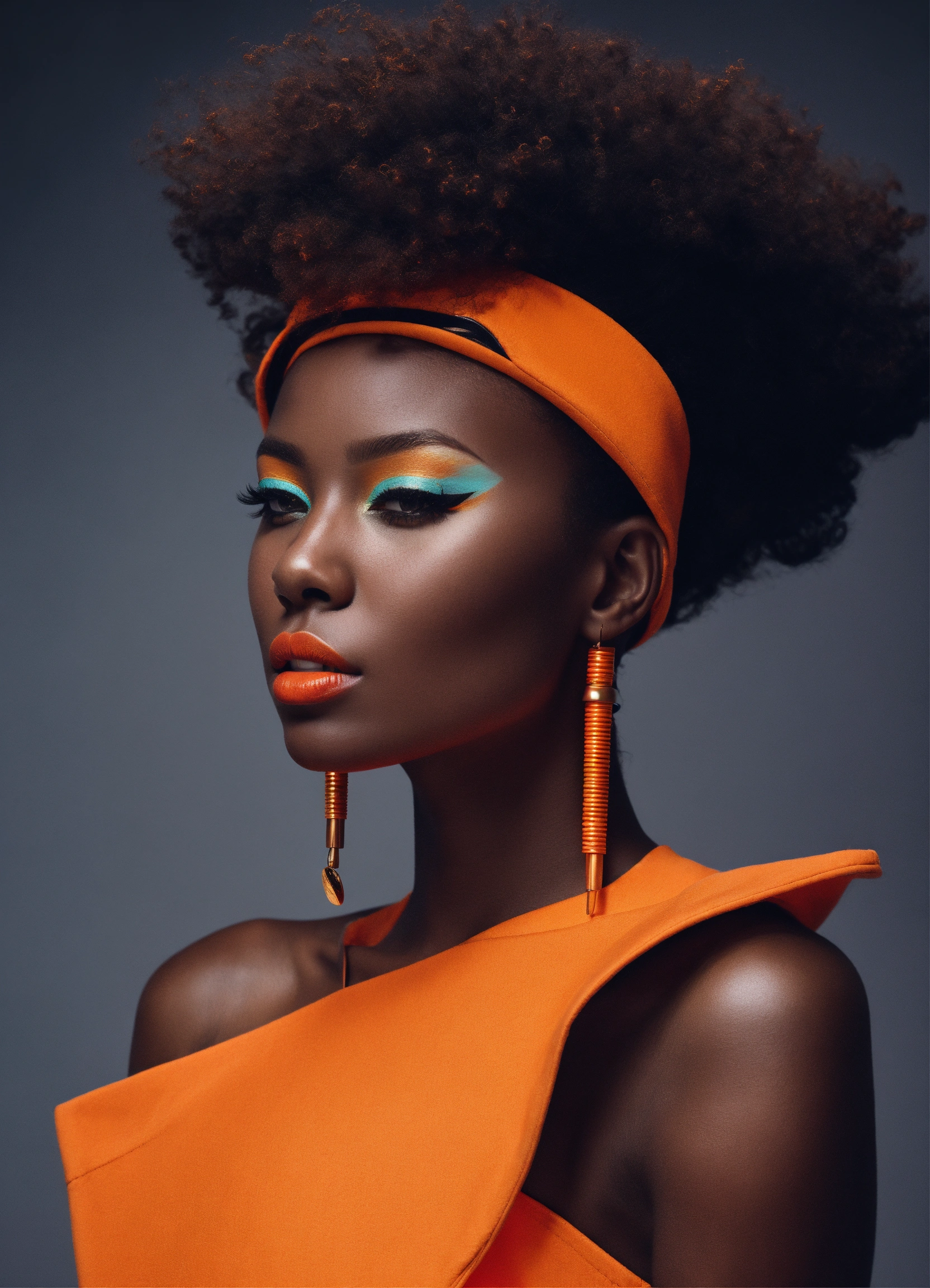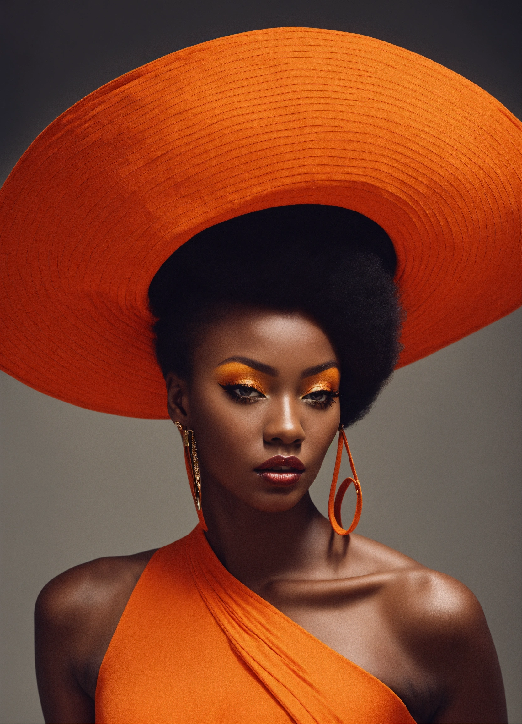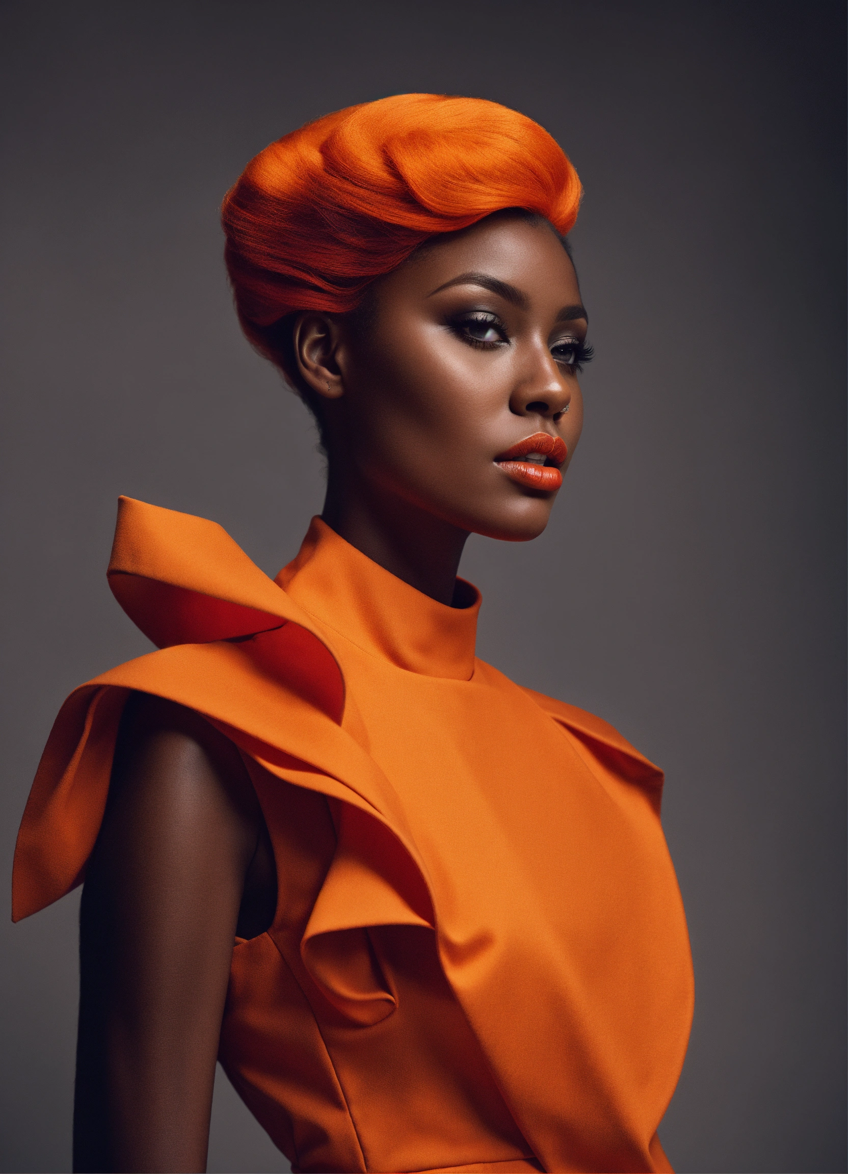 Avante garde high fashion beauty editorial, carmel complexion size 9 black woman dress in orange by flora borsi, style by flora borsi, bold, bright coolers, conceptual bob style hair, ((flora borsi))