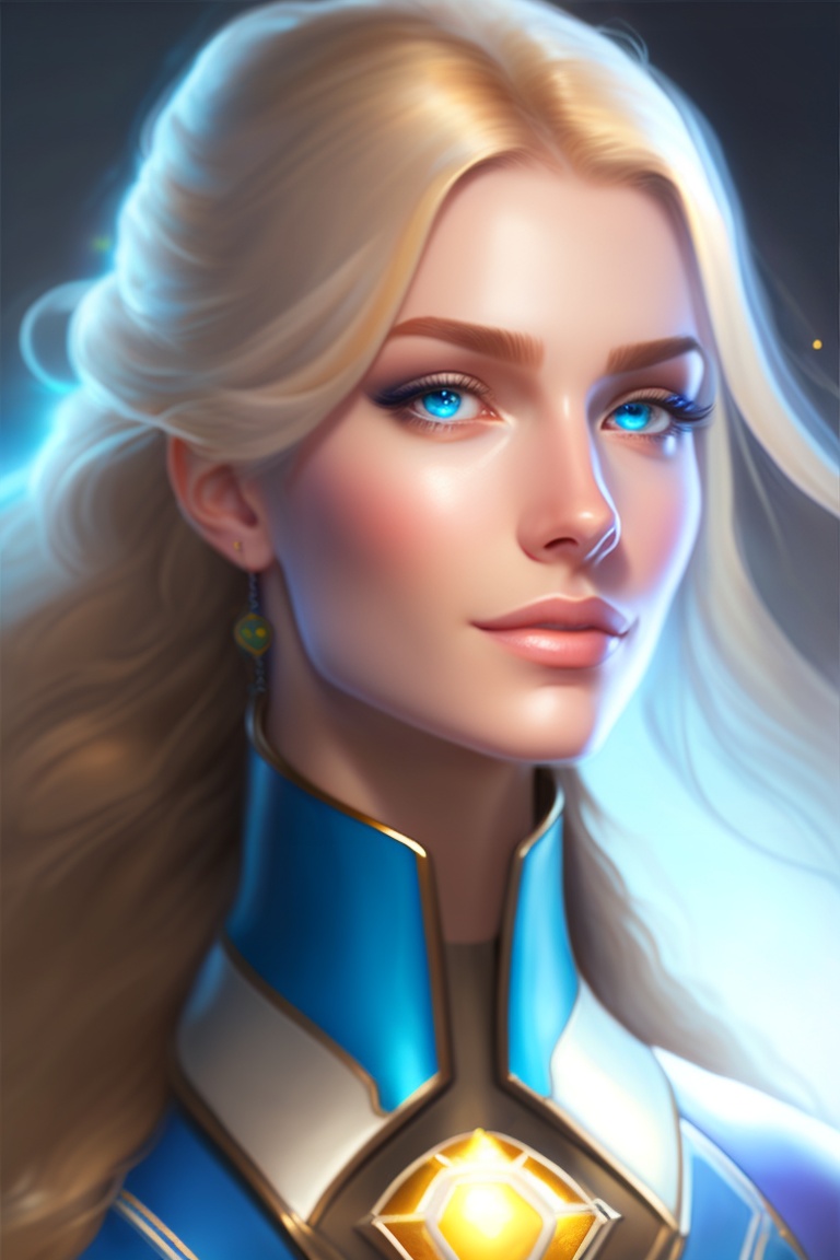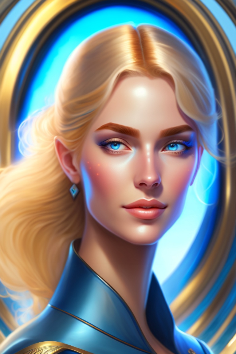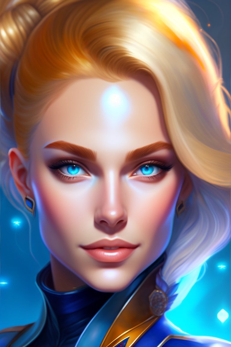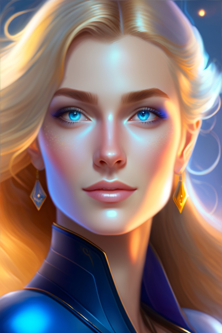 Beautiful pleiadian woman, highly detailed, digital painting, art station, concept art, smooth, sharp focus, illustration, electric light blue eye pupils, blonde golden brown hair back to one ponytail