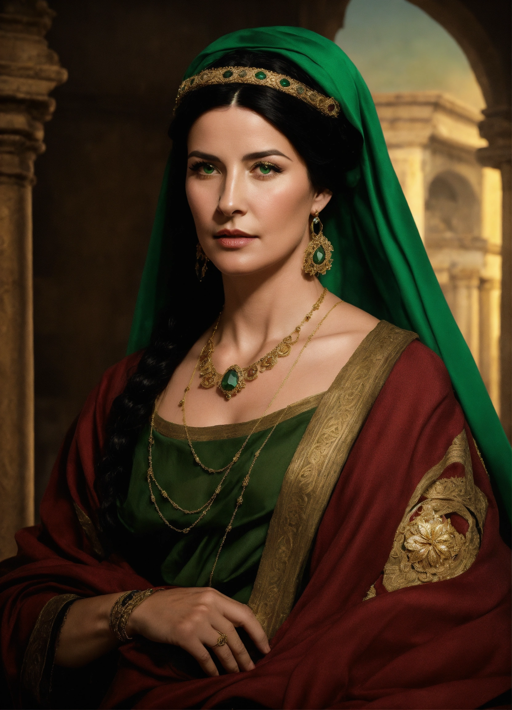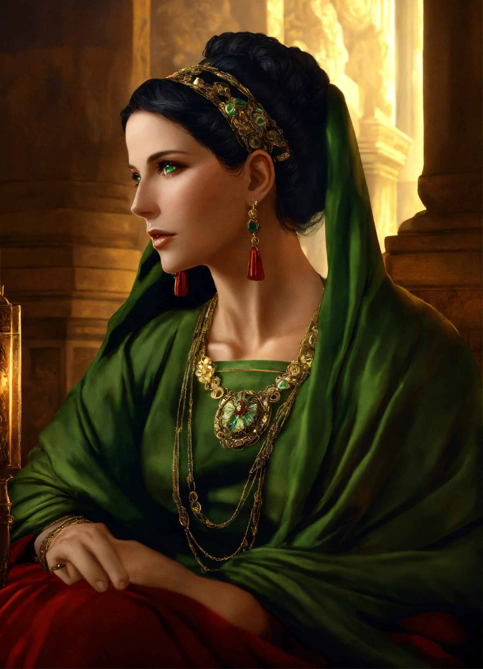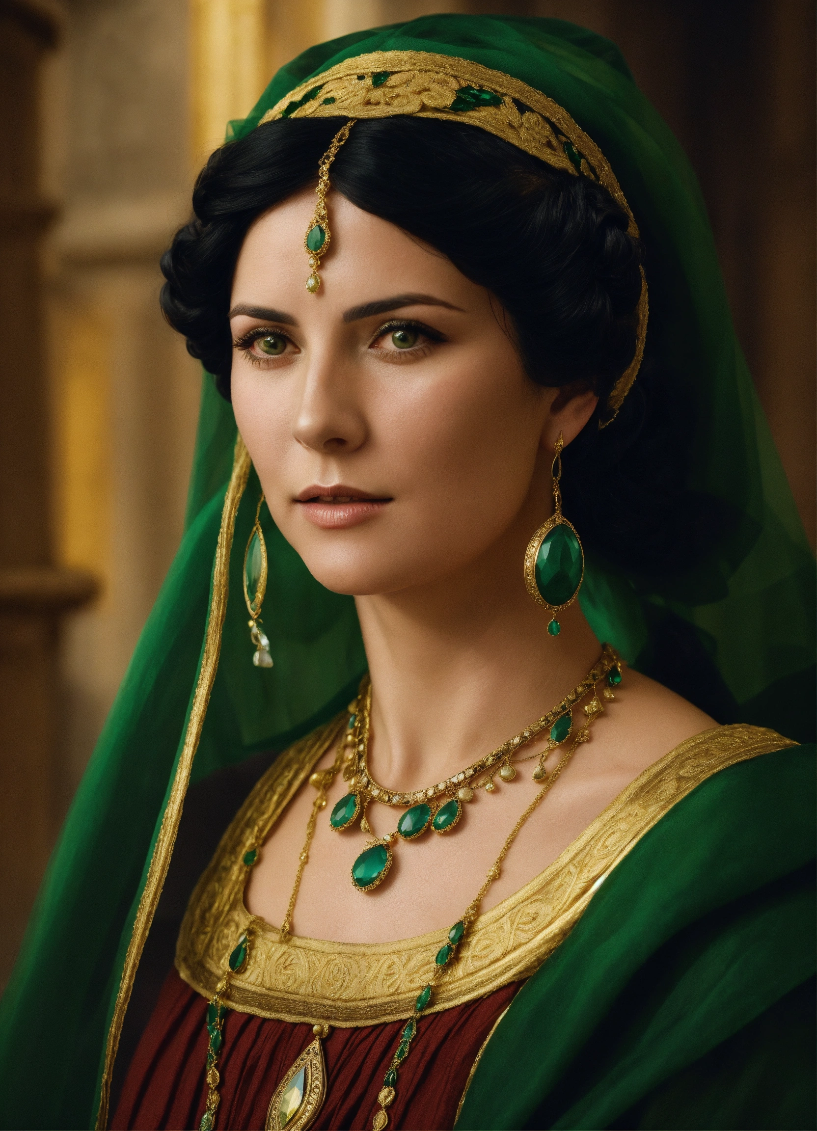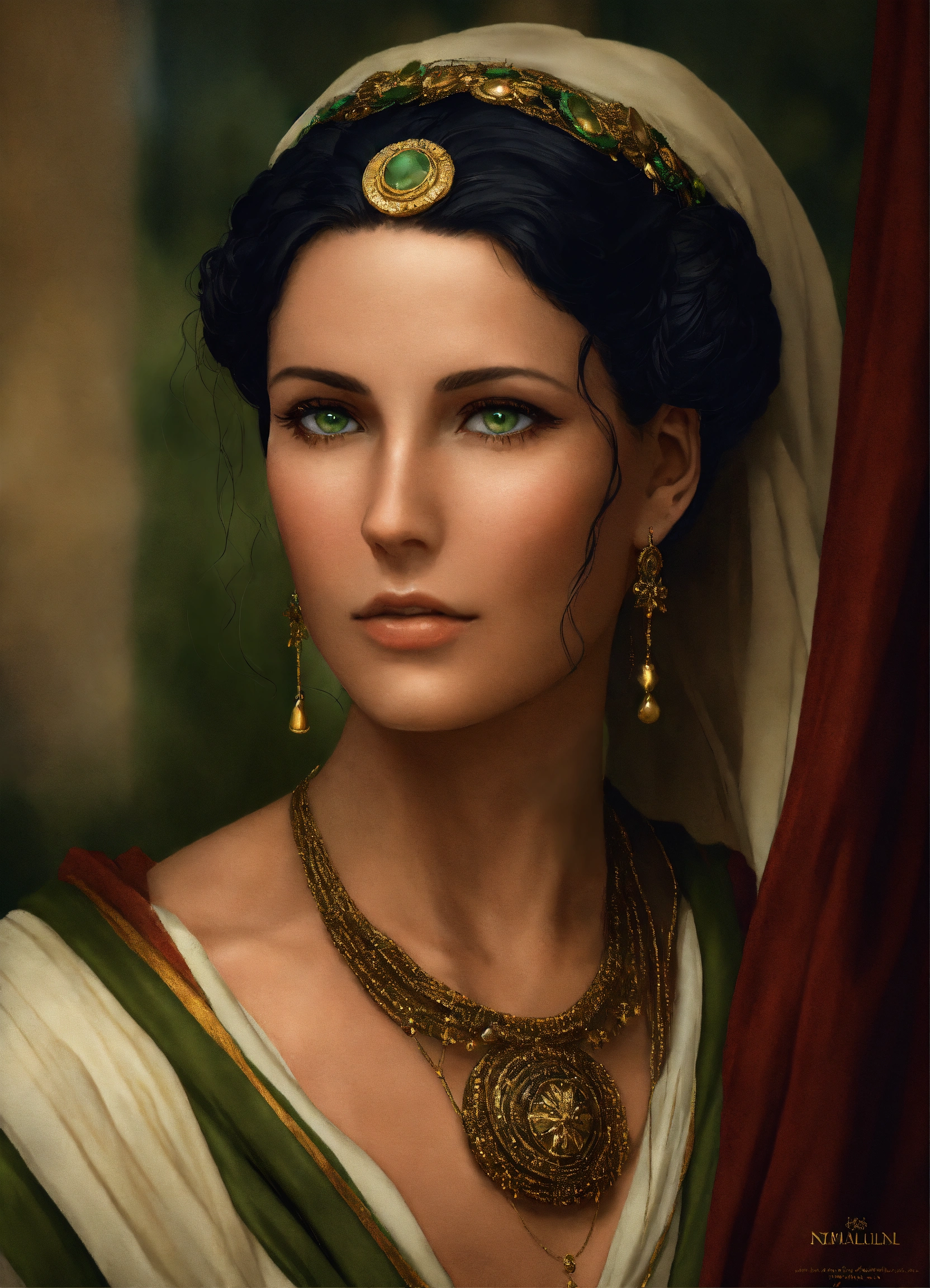 A roman woman with black hair and dark green eyes, the hair is styled in a bun without any jewelry, she wears a veil over her hair, she is 50 years old, she wears a stola and a palla as in ancient rome, she is noble and solemn, not too pretty, it is forbidden to have jewelry and ornaments, photo-realistic