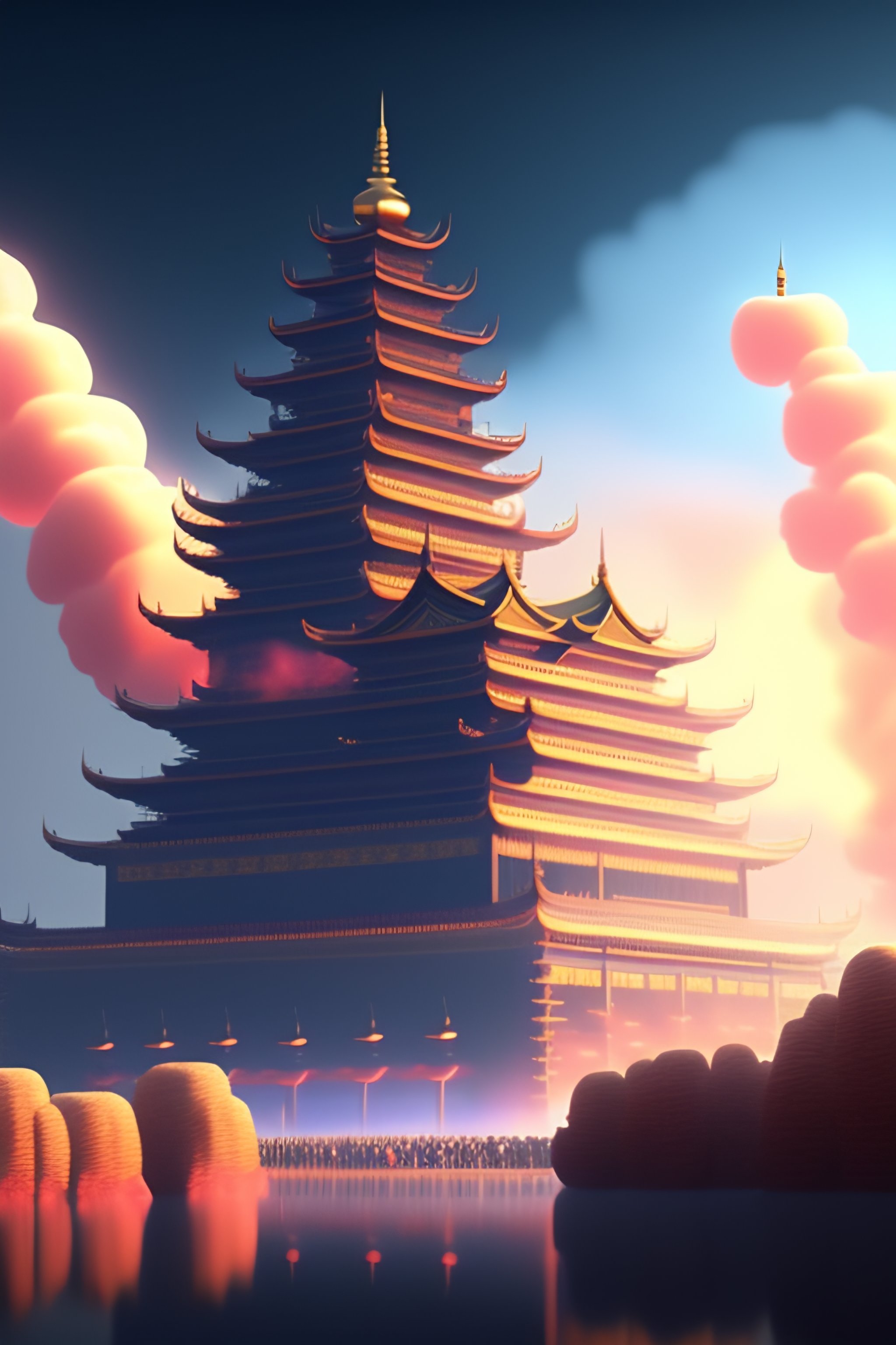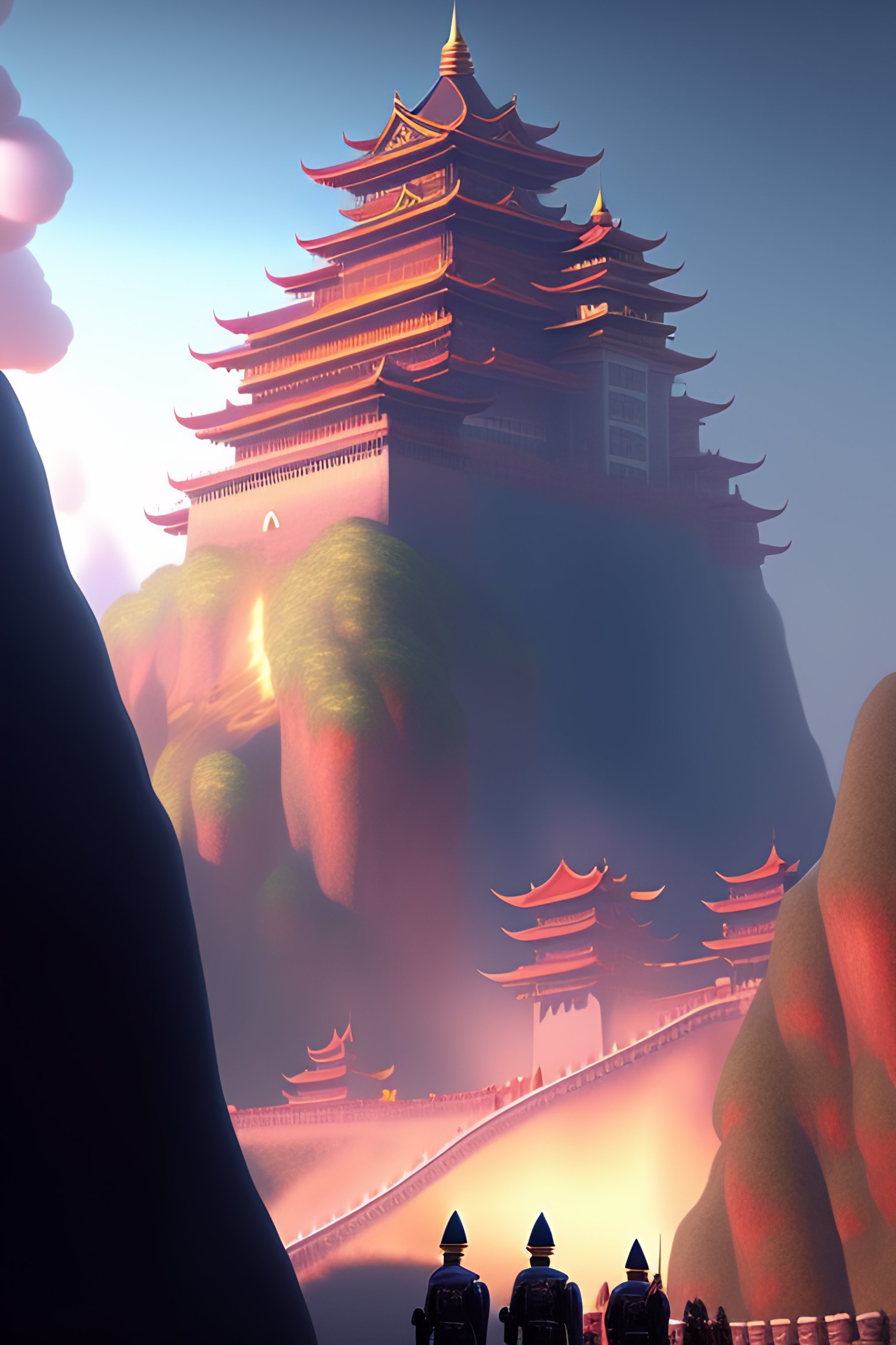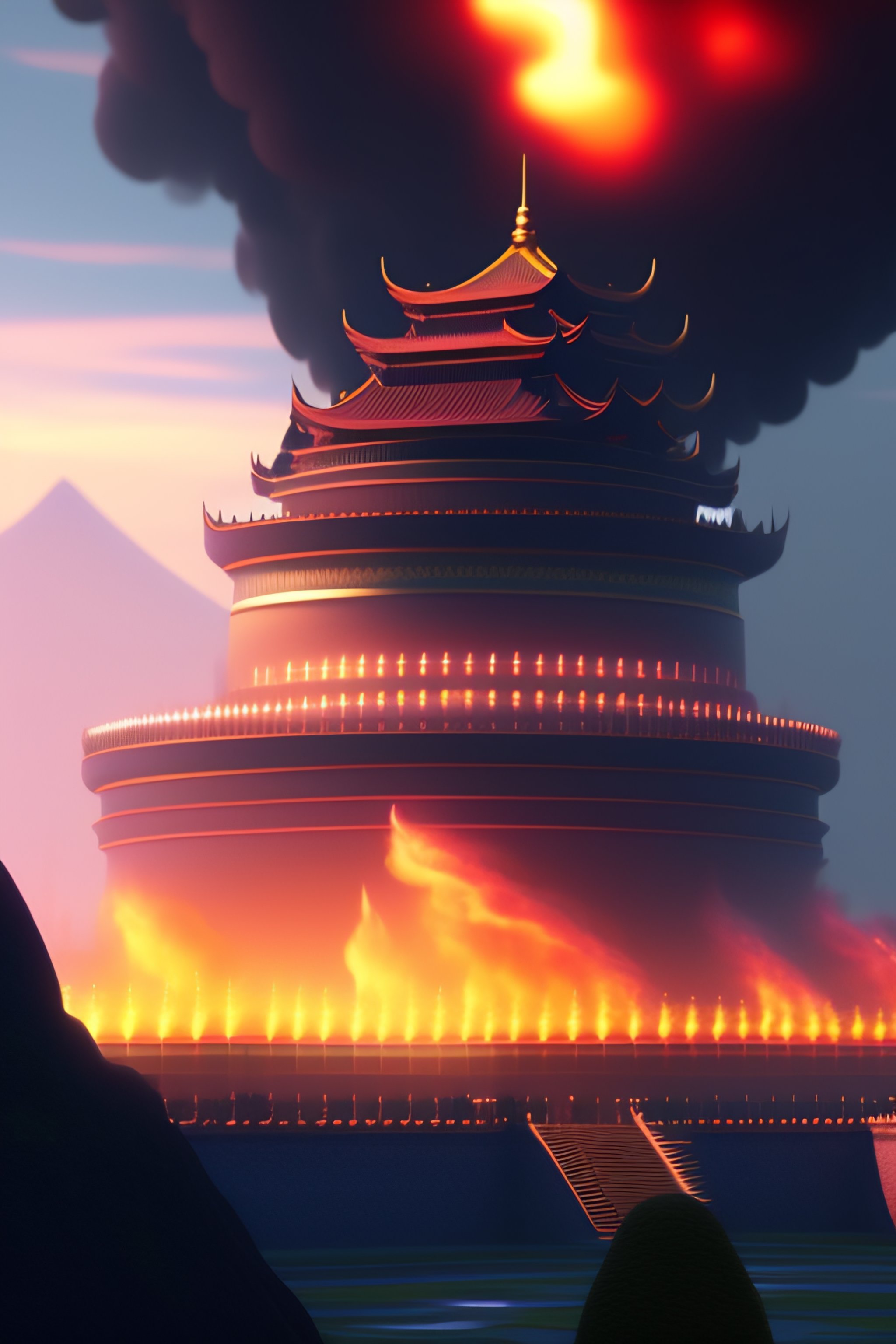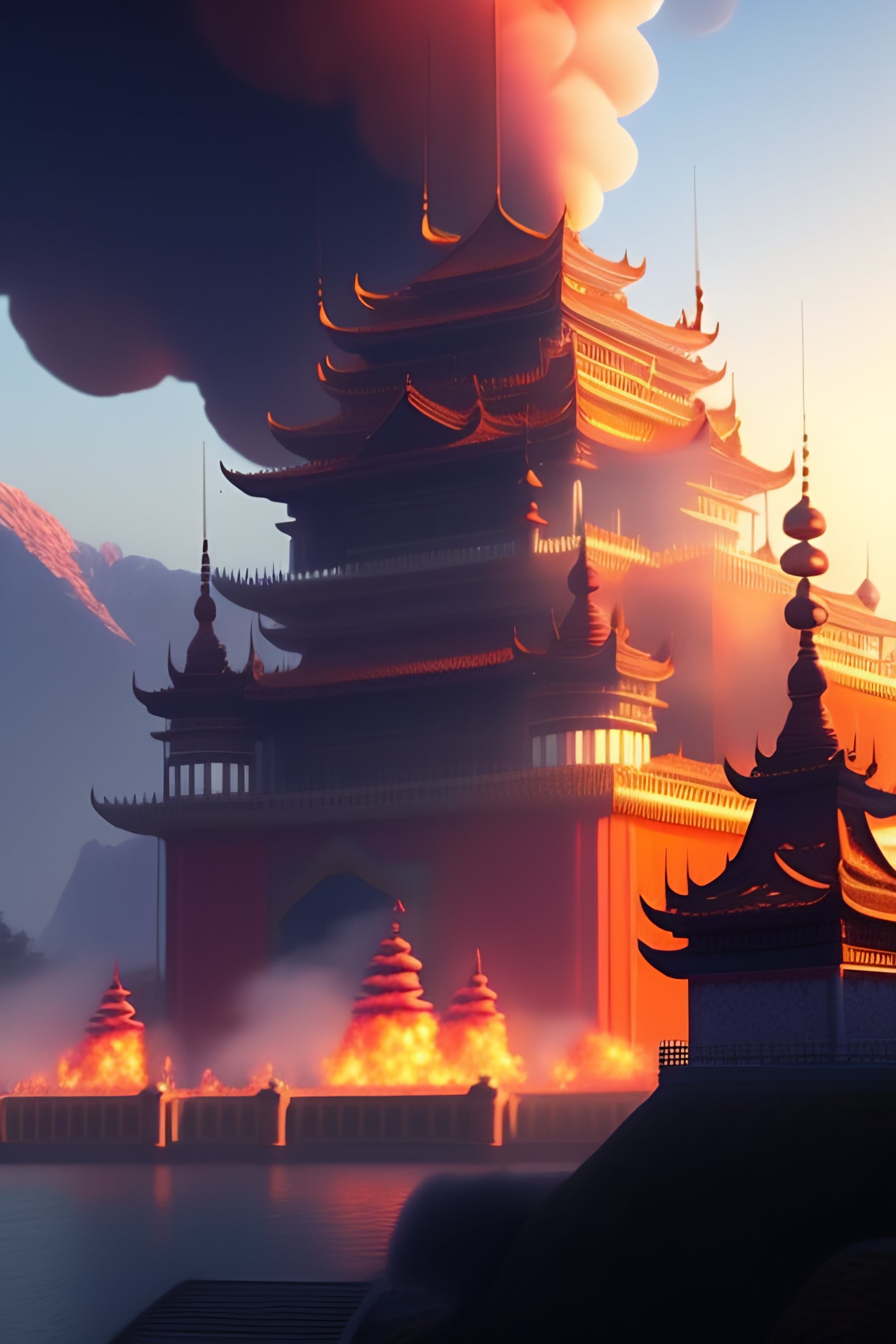 A highly detailed matte painting of a huge chinese castle on fire, fire smoke and explosions, soldiers attacking, by studio ghibli, makoto shinkai, by artgerm, by beeple, volumetric lighting, octane render, 4k resolution, trending on artstation, masterpiece