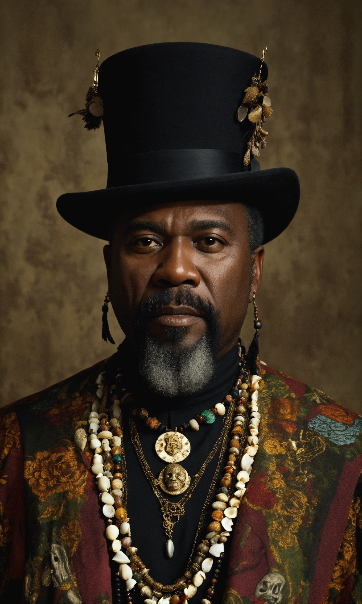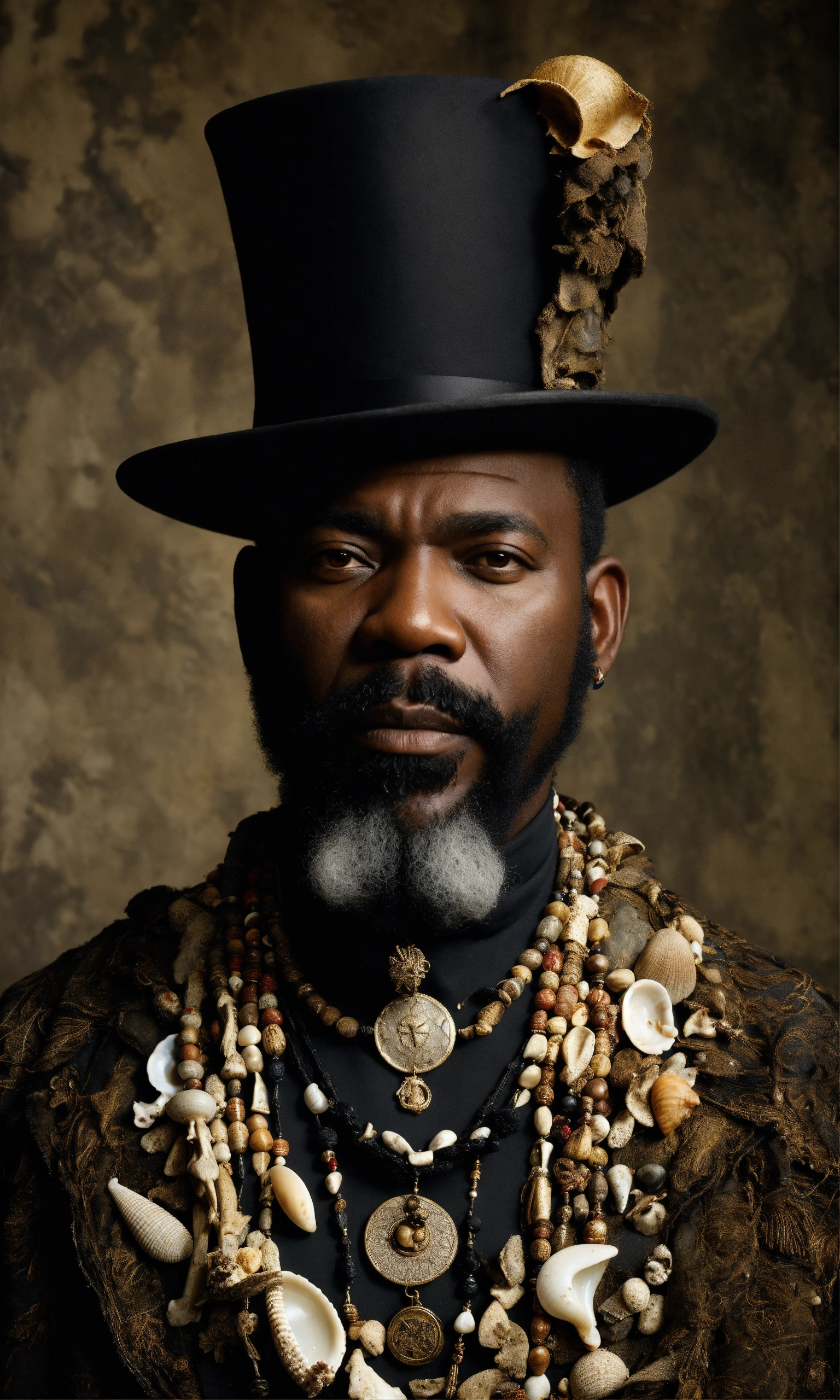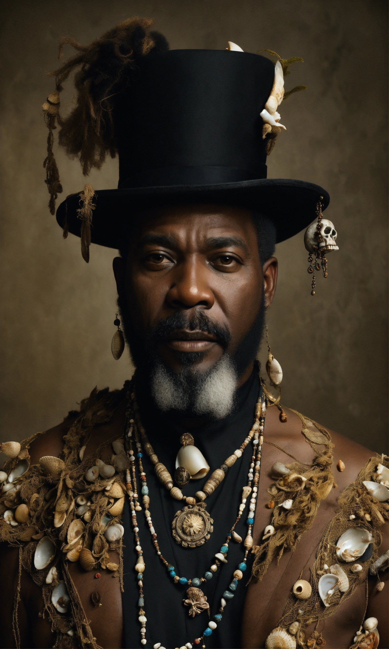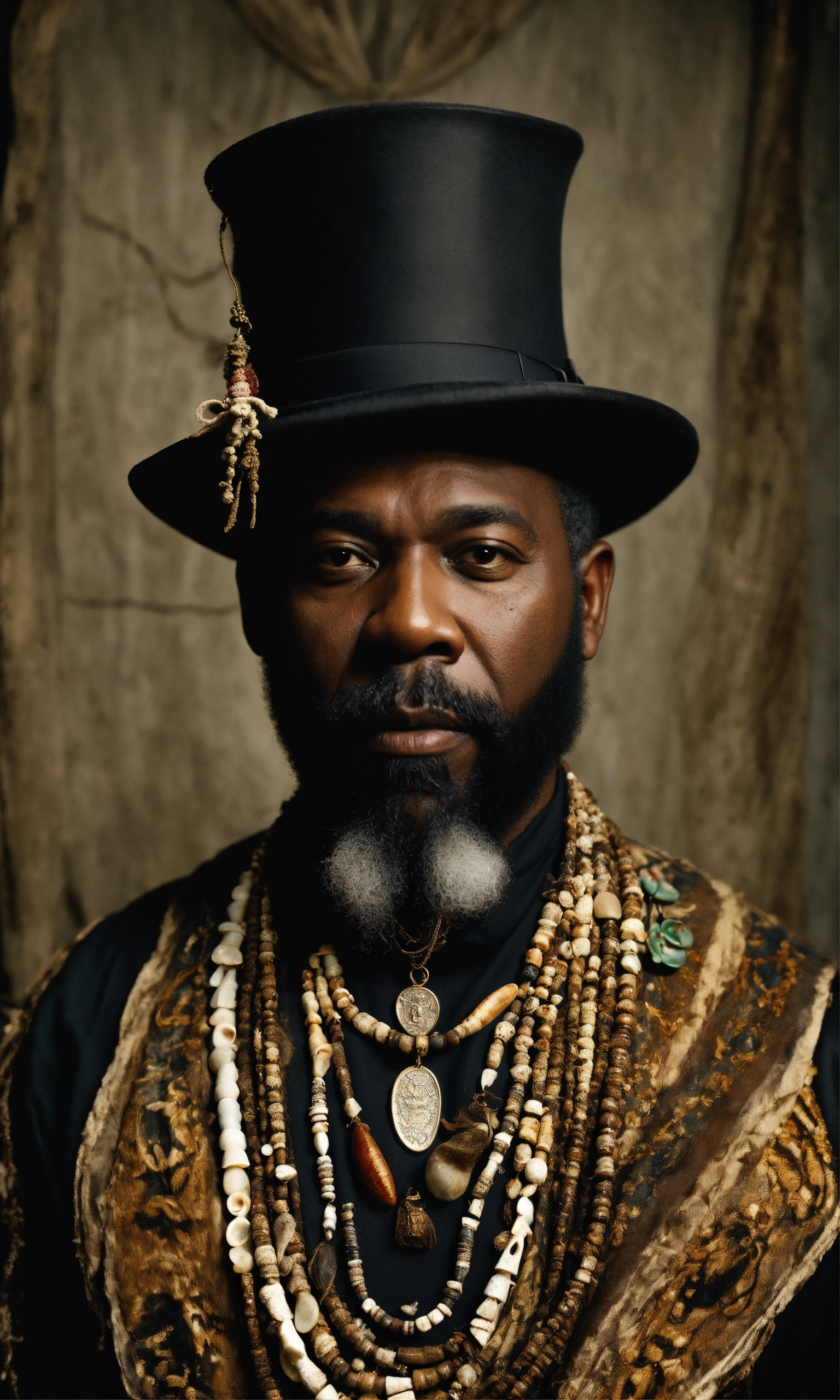 Portrait of middle-aged black man with a beard. no background. a voodoo priest, wearing a black top hat, a necklace made of shells and bones around his neck, hyper-realistic. shot by annie leibowitz.