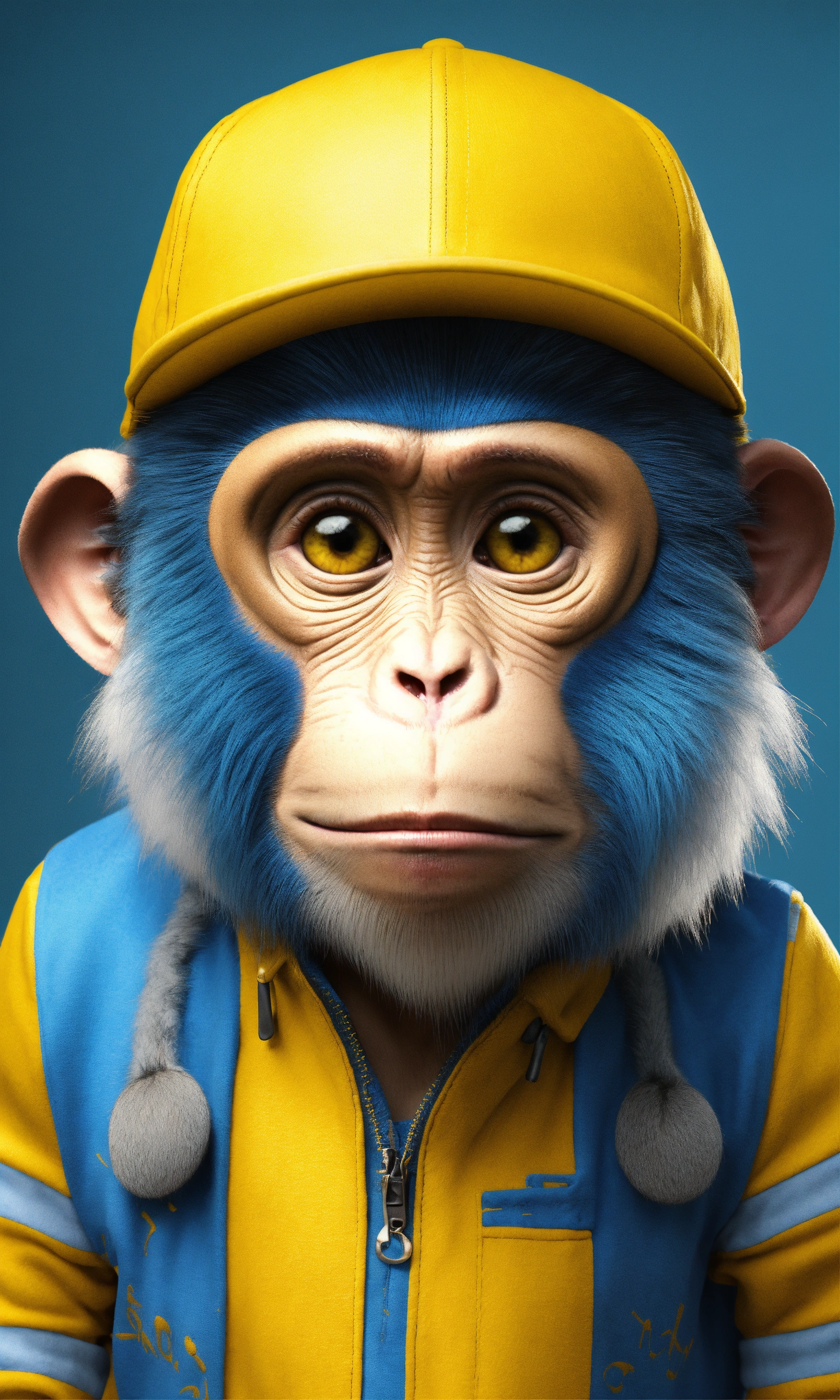 Cartoon monkey with human clothes use the monkey with the yellow and blue cap, monkey haswhite hair with hairy ears and face, render iamge in 4k resolution, empahsize hyper realistic featrures, yellow and blue cap says simon on it