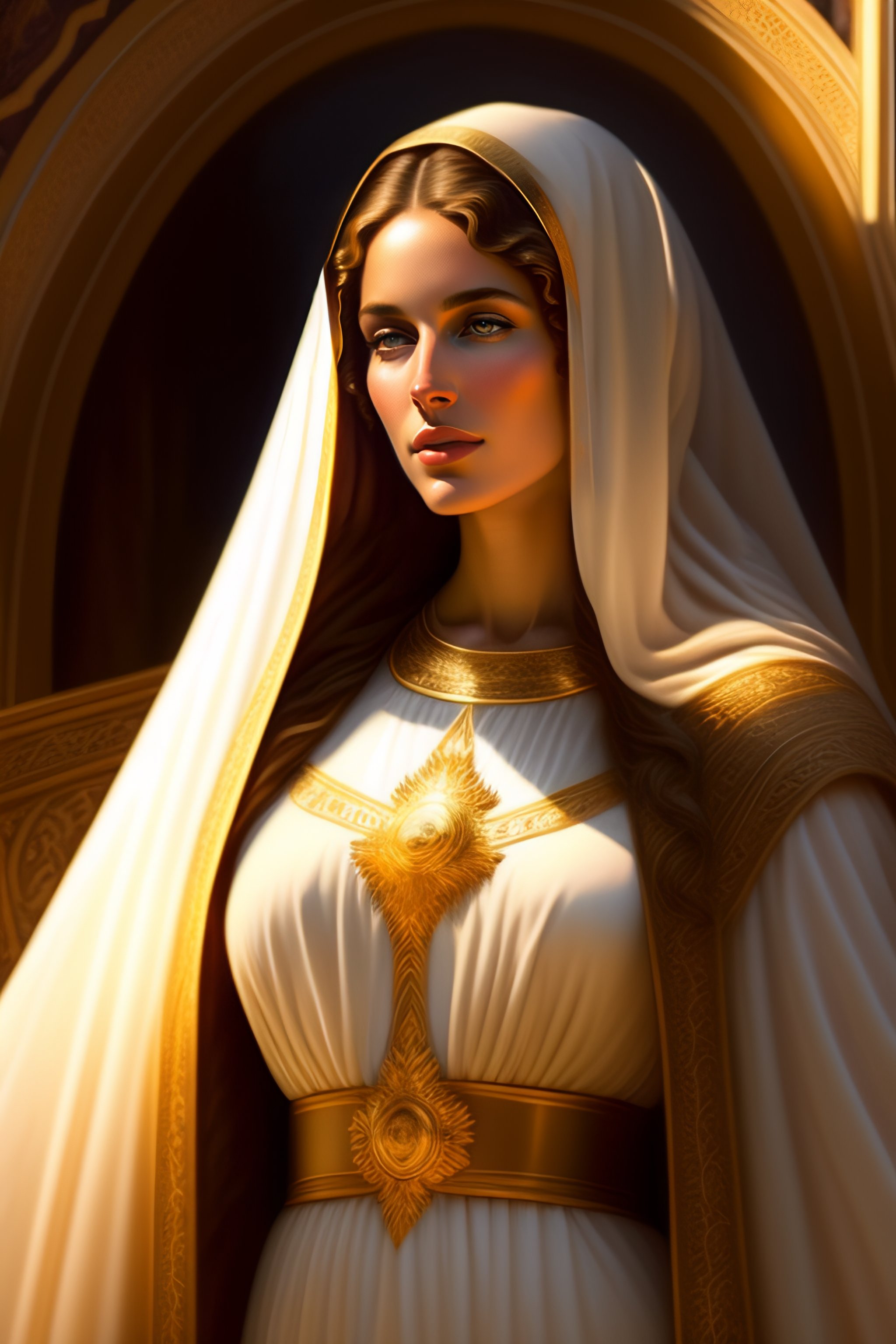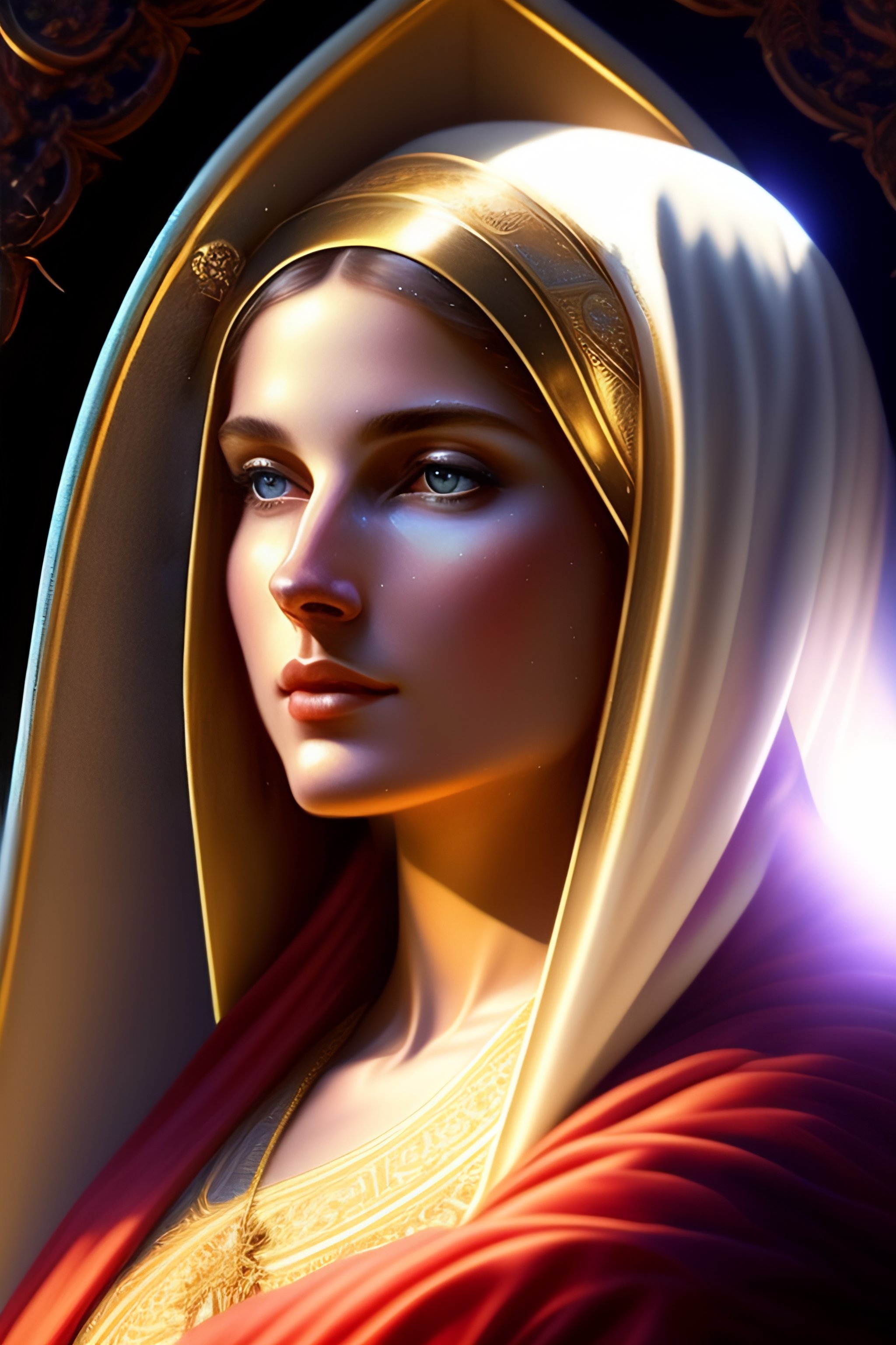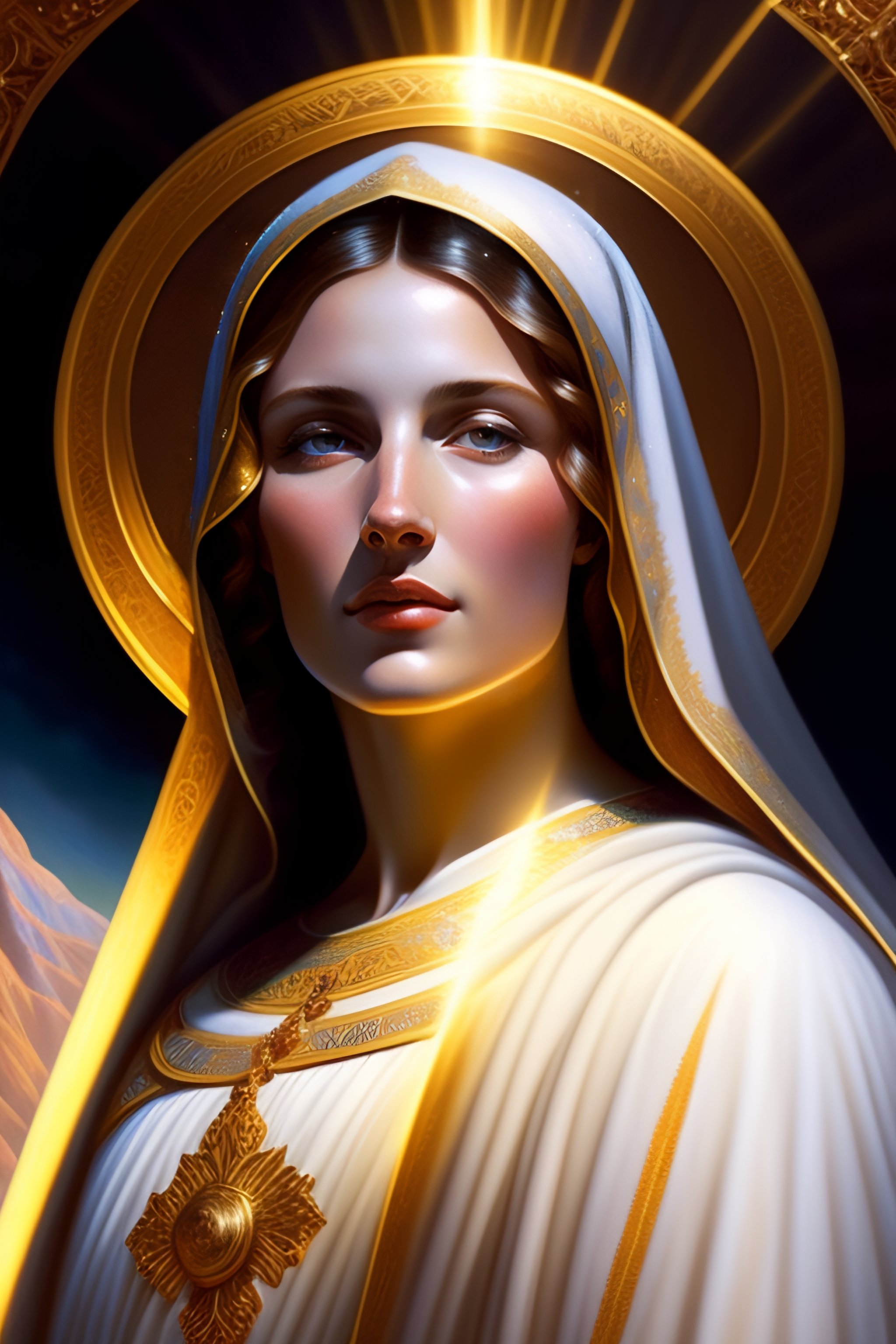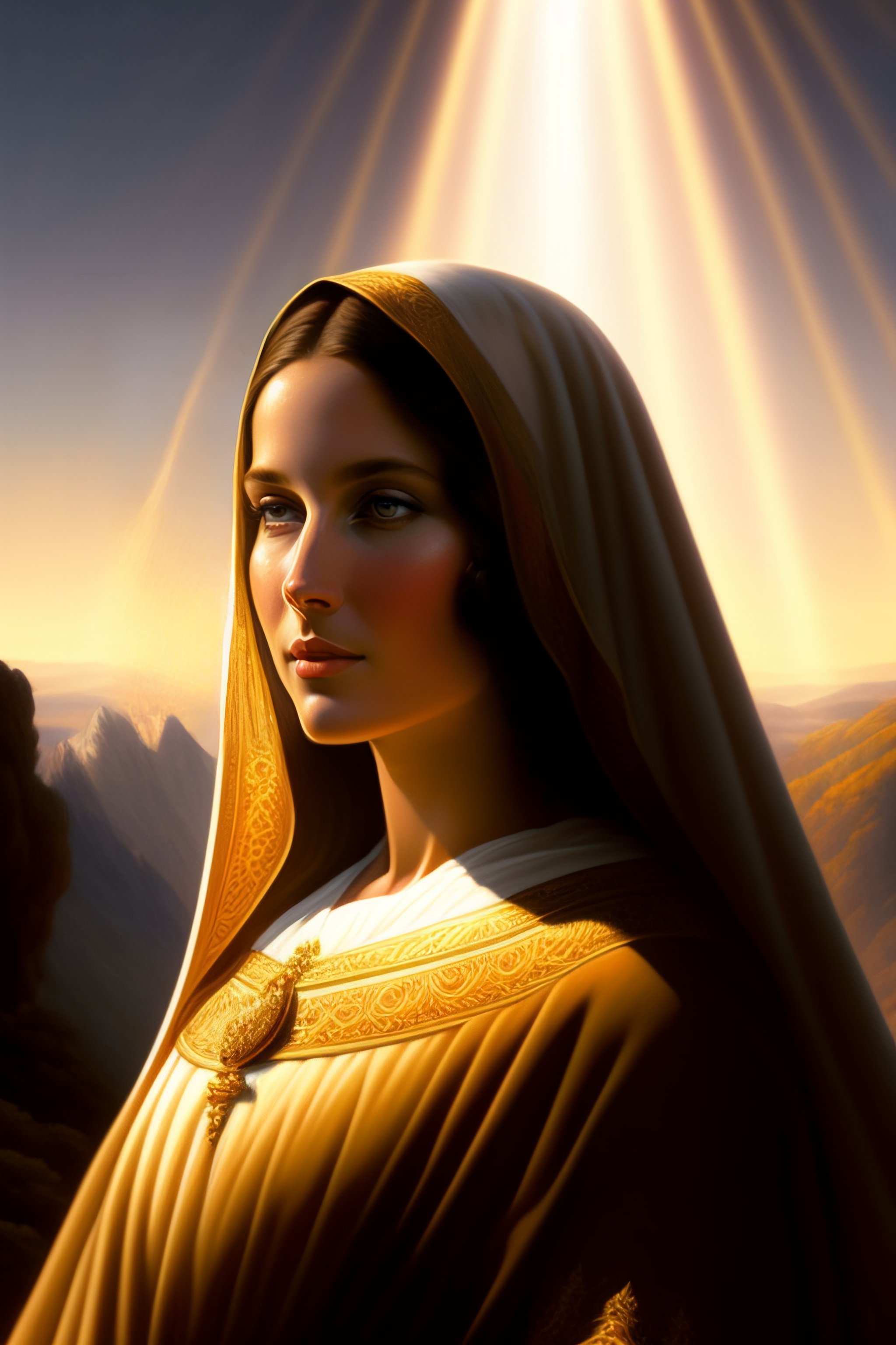 Virgin mary mother of jesus full body with beautiful robe and halo and rays of light coming out of her head on mountain, landscape, intricate, elegant, highly detailed, digital painting, arts station, concept art, soft, sharp focus, illustration, artwork by artgerm and greg rutkowski and tomas scholes and william - adolphe bouguereau