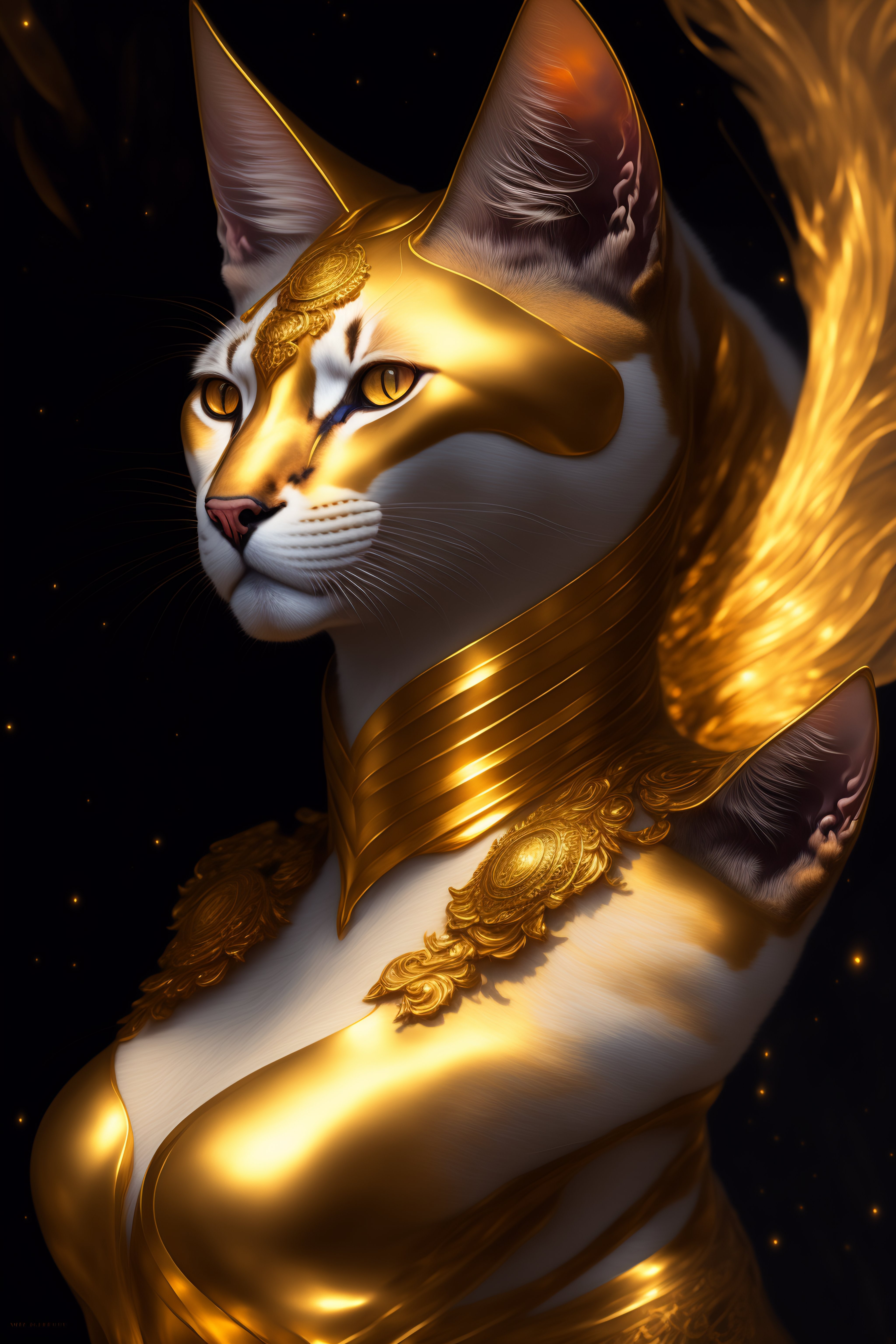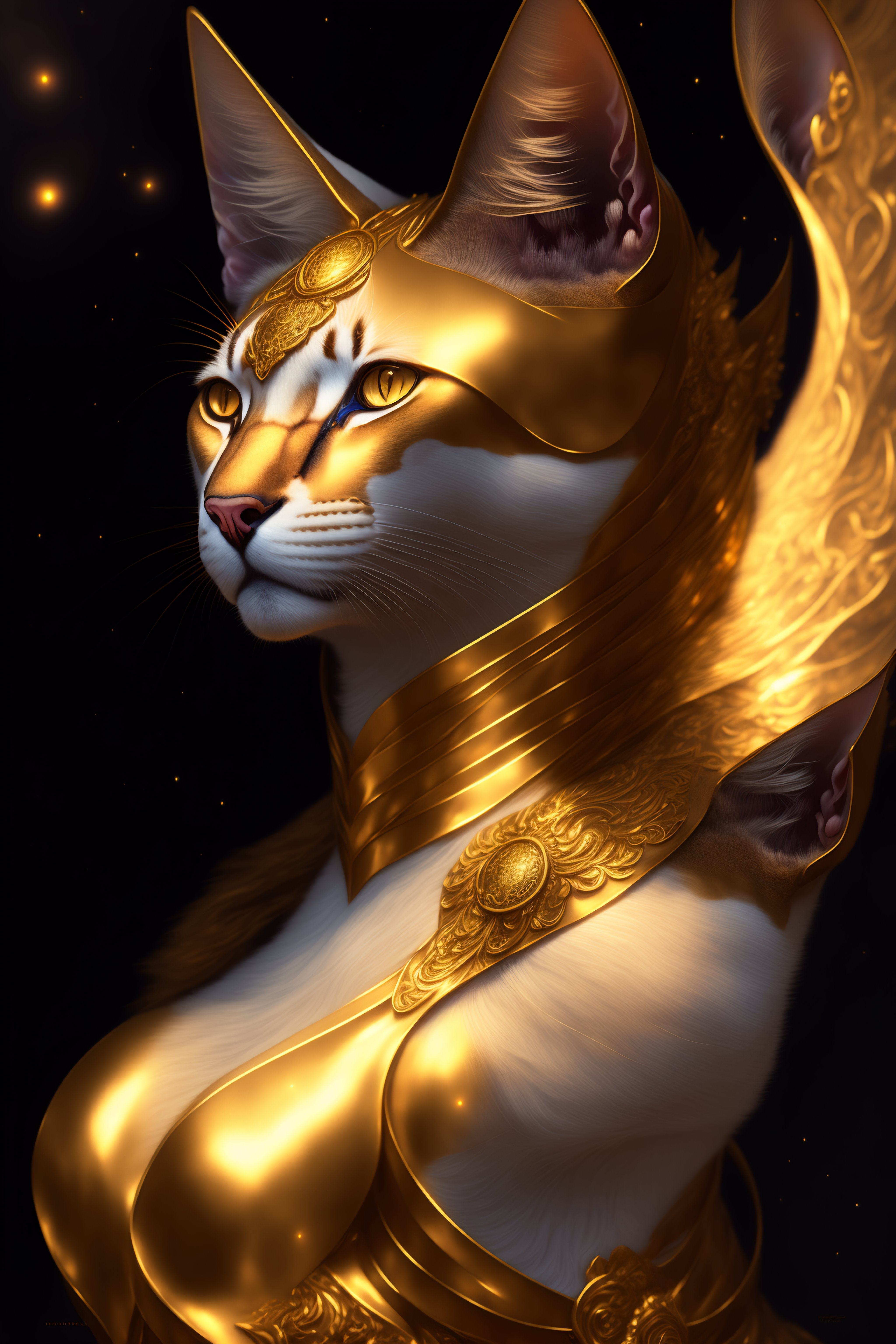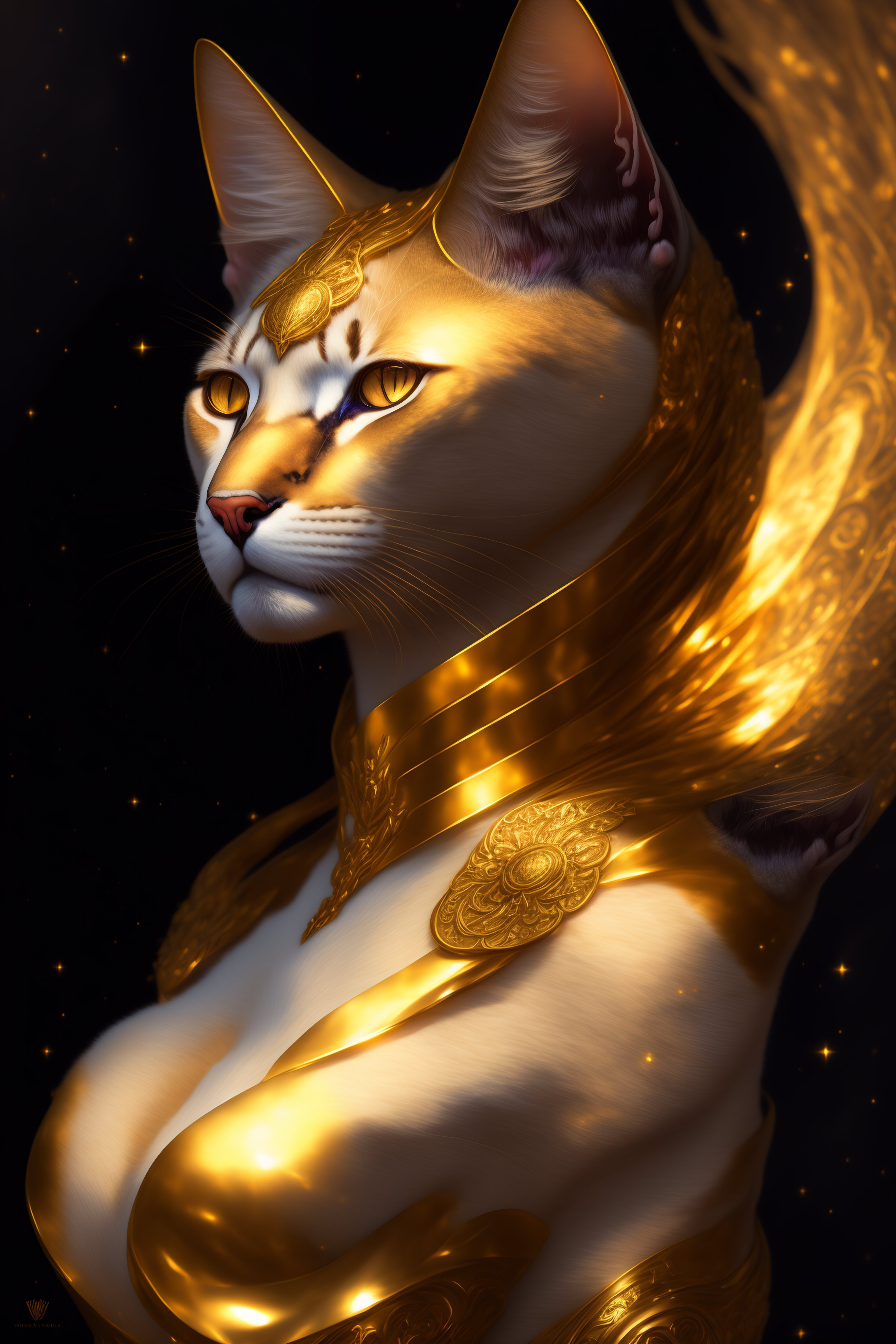 Portrait of a half cat half human, anubis, face of a cat, feline head, golden dress, glow golden tatto, galatic shamen with quantum energy fantasy, fantasy magic, undercut hairstyle, dark light night, intricate, elegant, sharp focus, illustration, highly detailed, digital painting, concept art, matte, art by wlop and artgerm and greg rutkowski and alphonse mucha, masterpiece