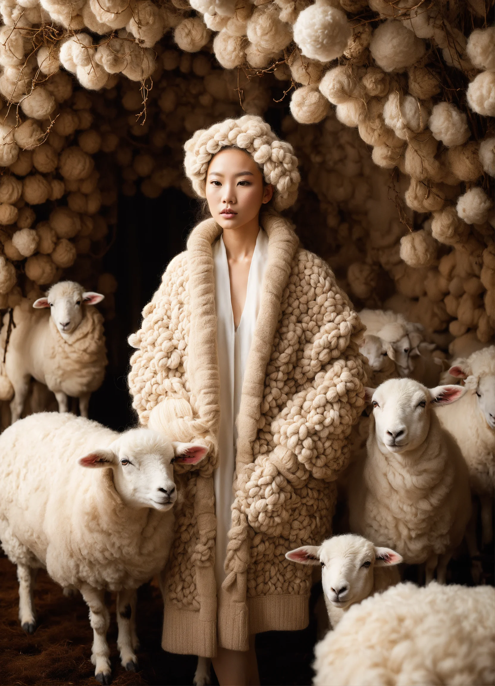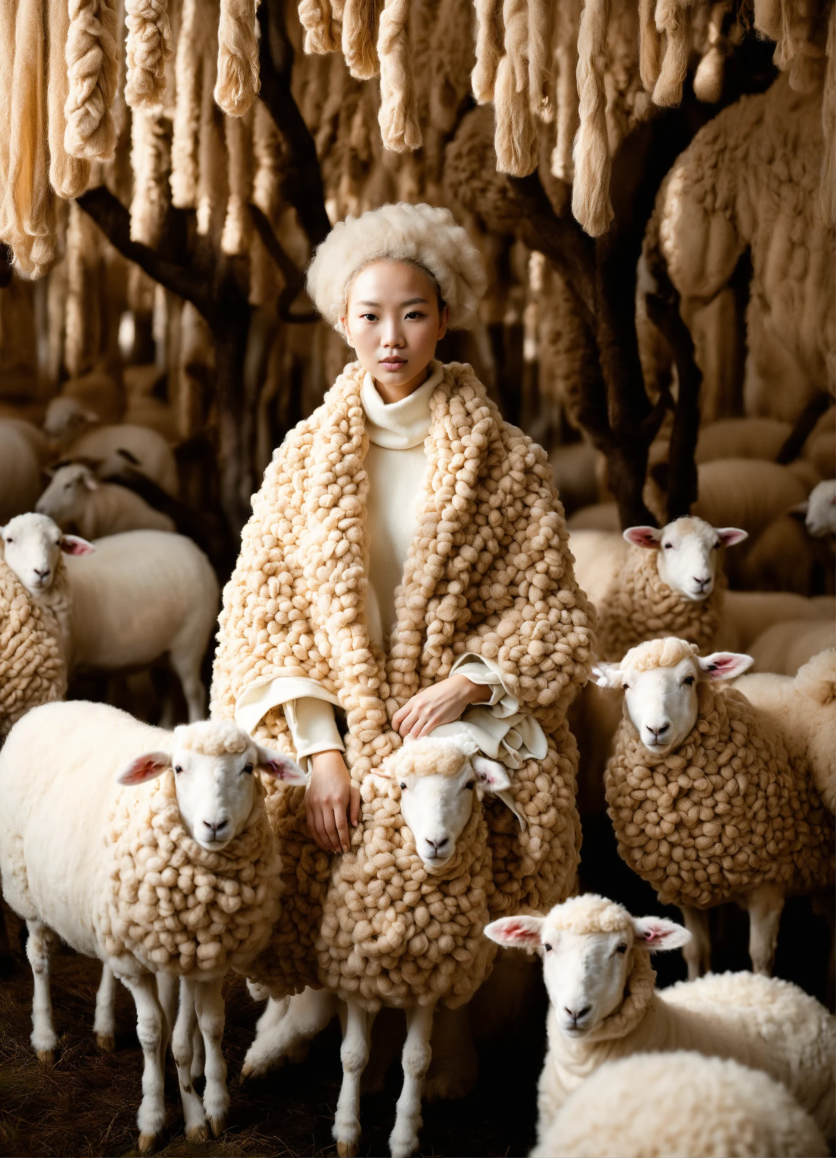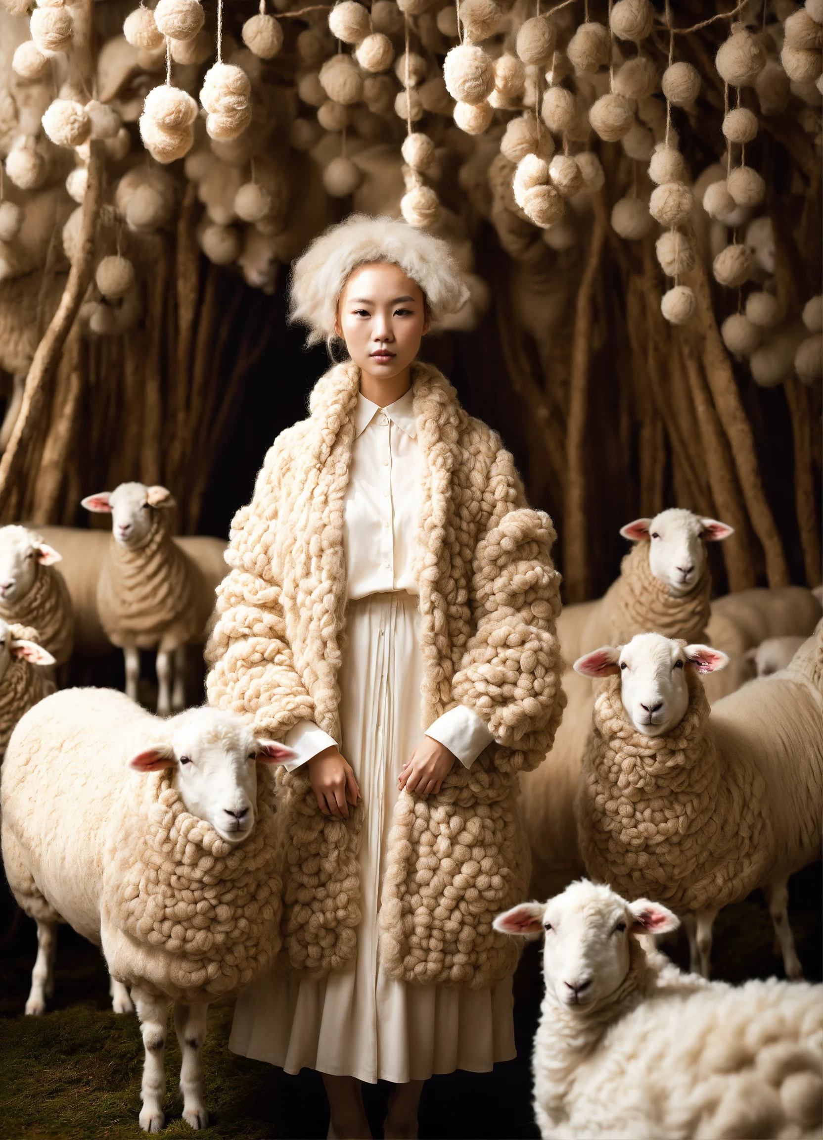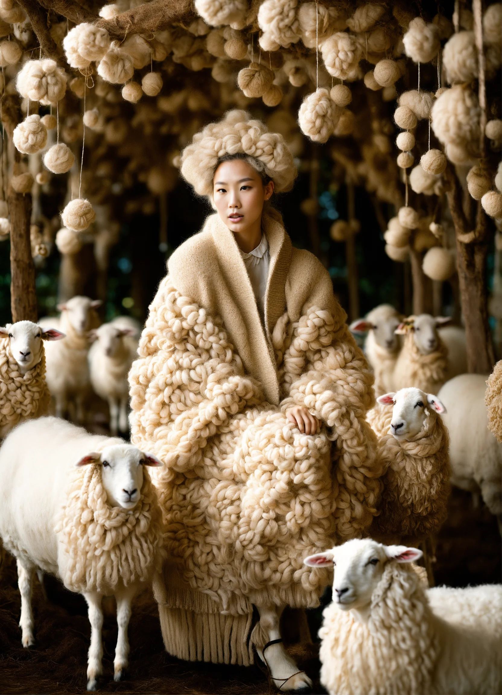 Albino-asian model, thick, wild, giant albino-beige wool yarn hair balls. very large, thick, beige woolly sheep’s clothes, holds a baby. surrounded by sheep and big wool trees. everything is made out of sheep’s wool. model matches the sheep.