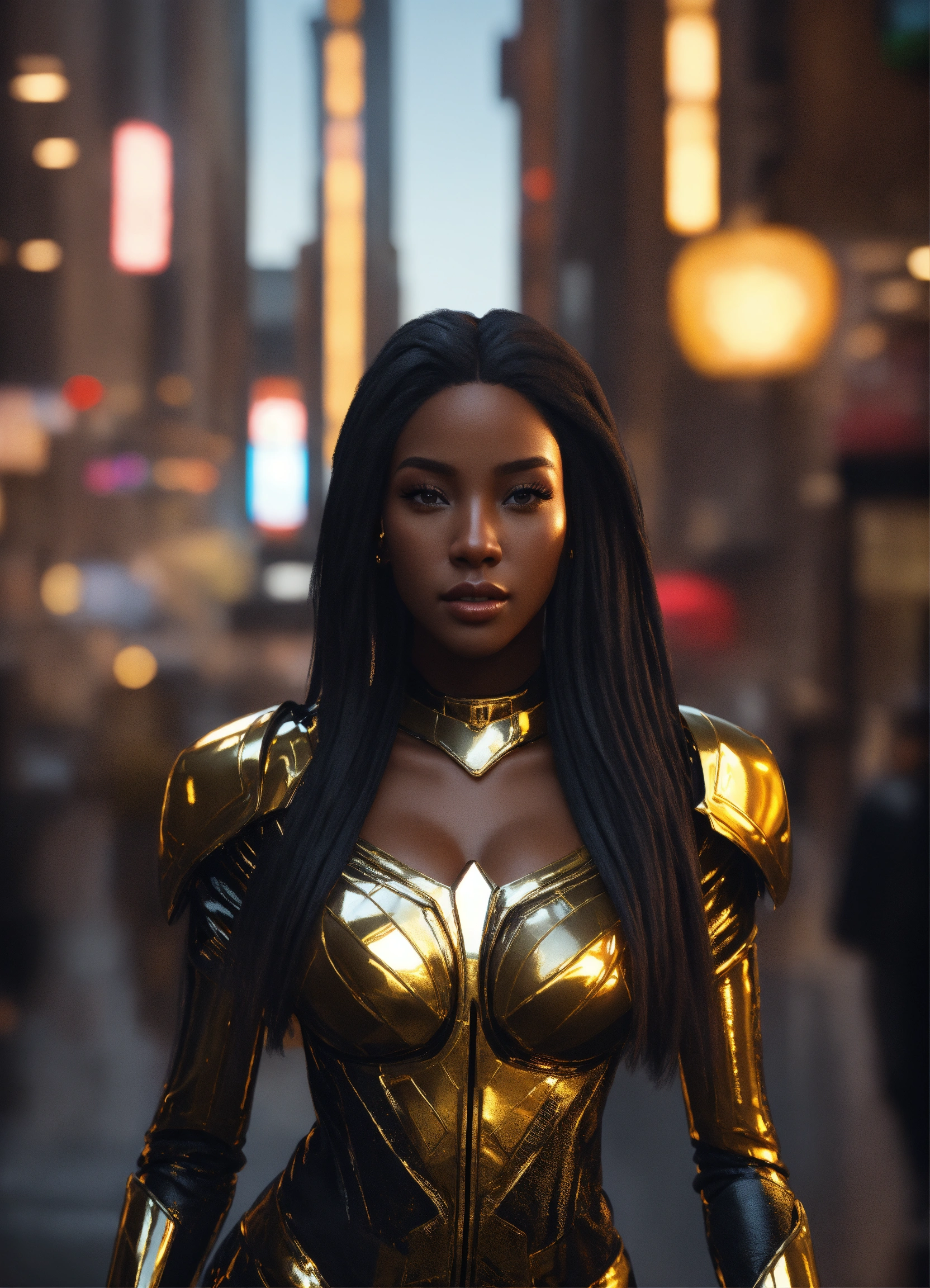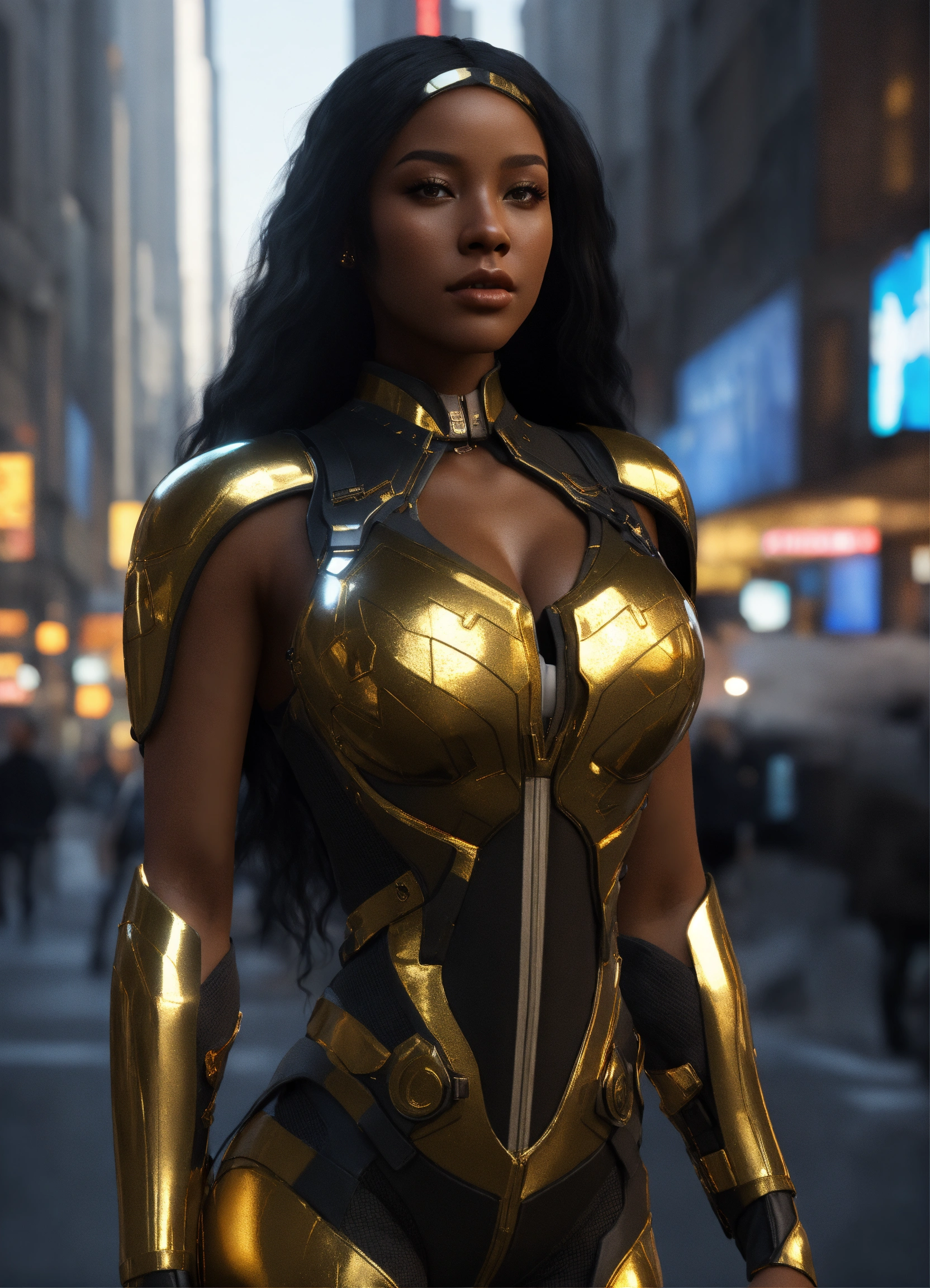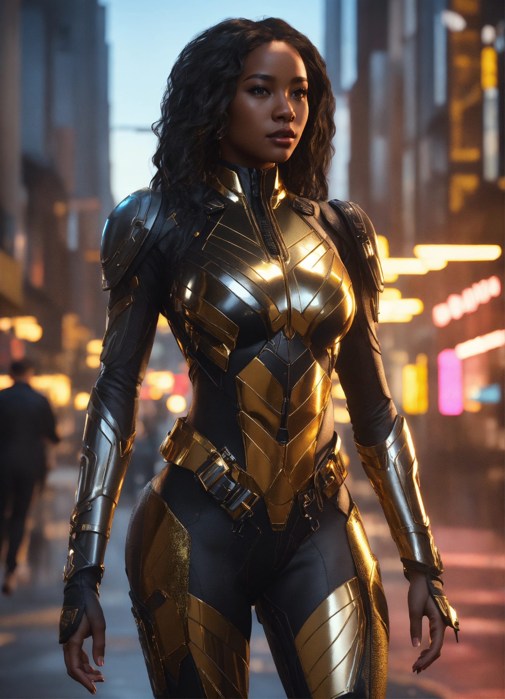 A beautiful, shapely black female goddess with long hair, perfect face, full lips, dark skinned, most beautiful woman in the world, shapely hour-glass figure, stunning woman wearing a gold and black super spy stealth suit, walking in new york city, fully covered, in gray background, 8k resolution concept art portrait dynamic lighting hyperdetailed intricately detailed splash art trending on artstation unreal engine 5 volumetric lighting