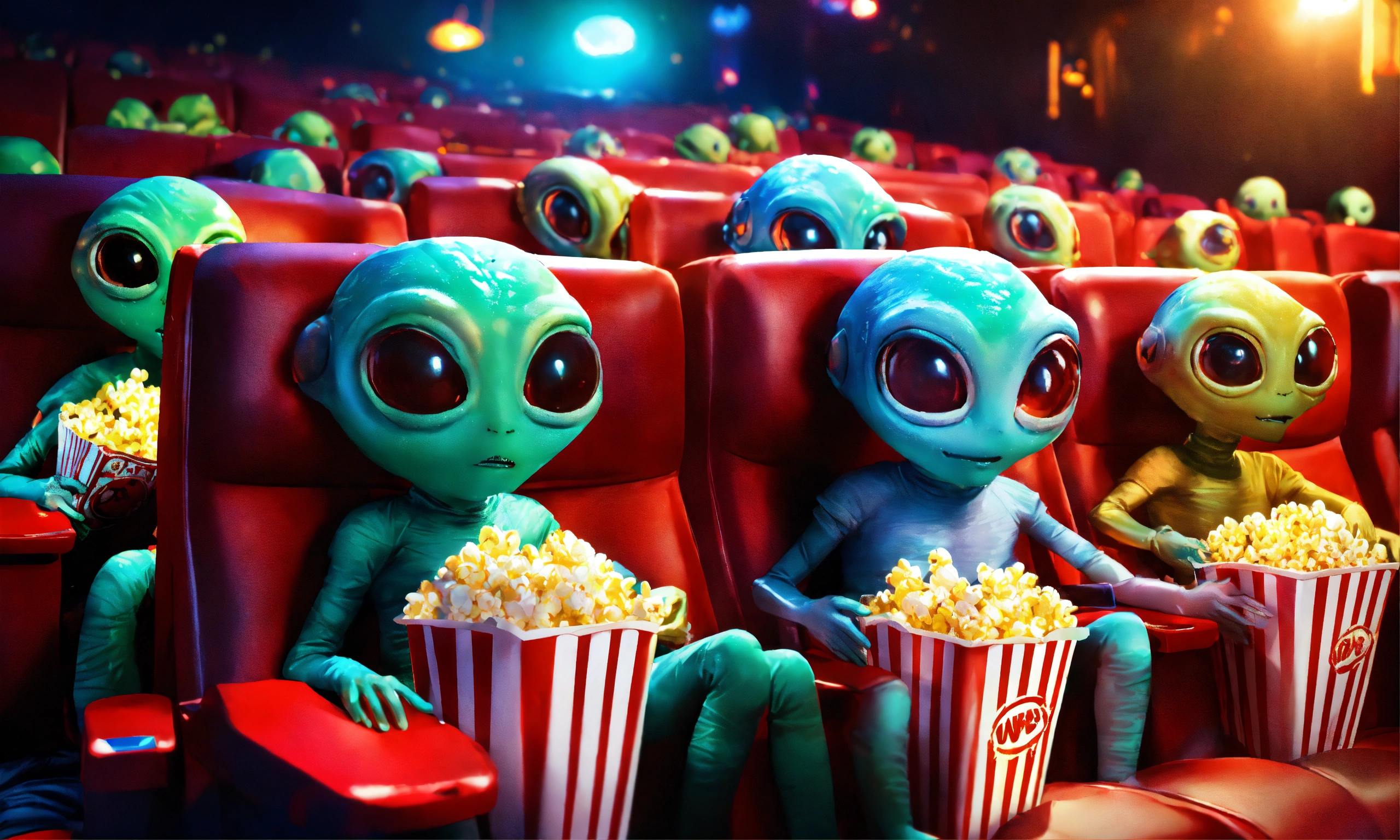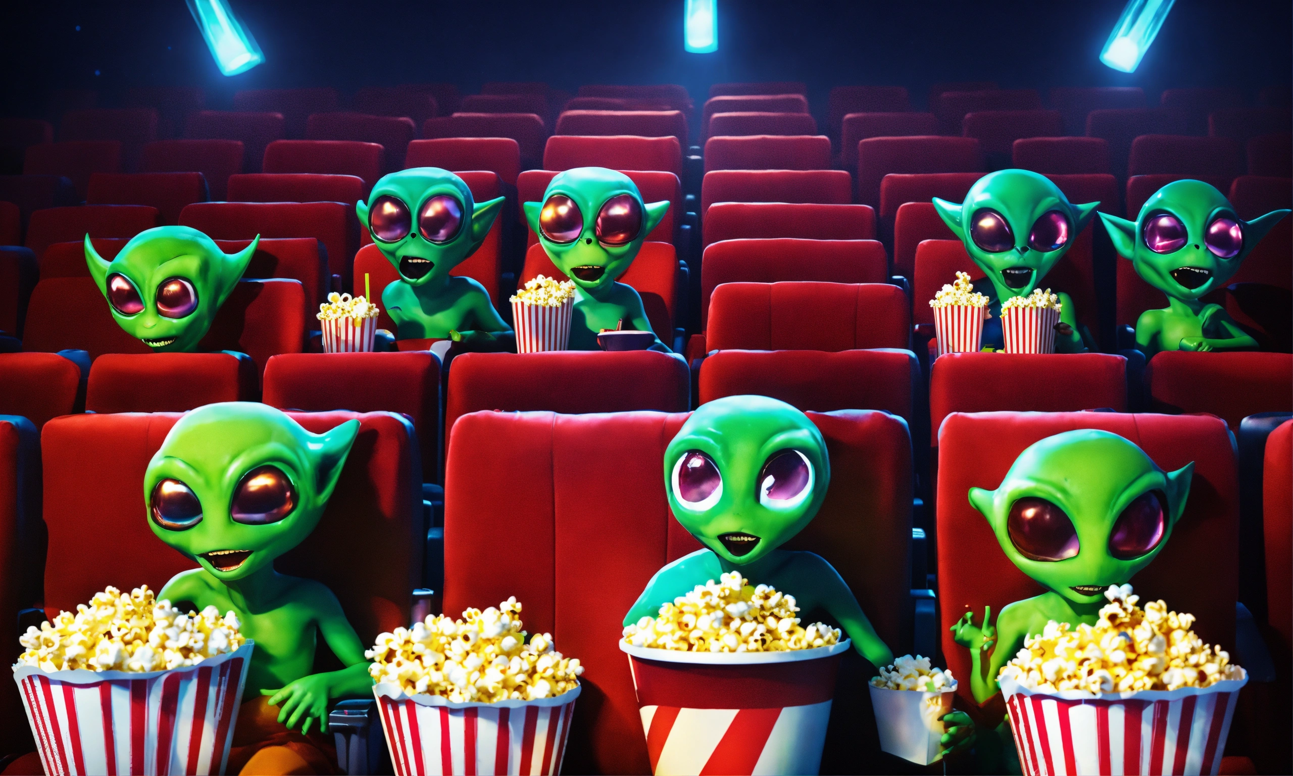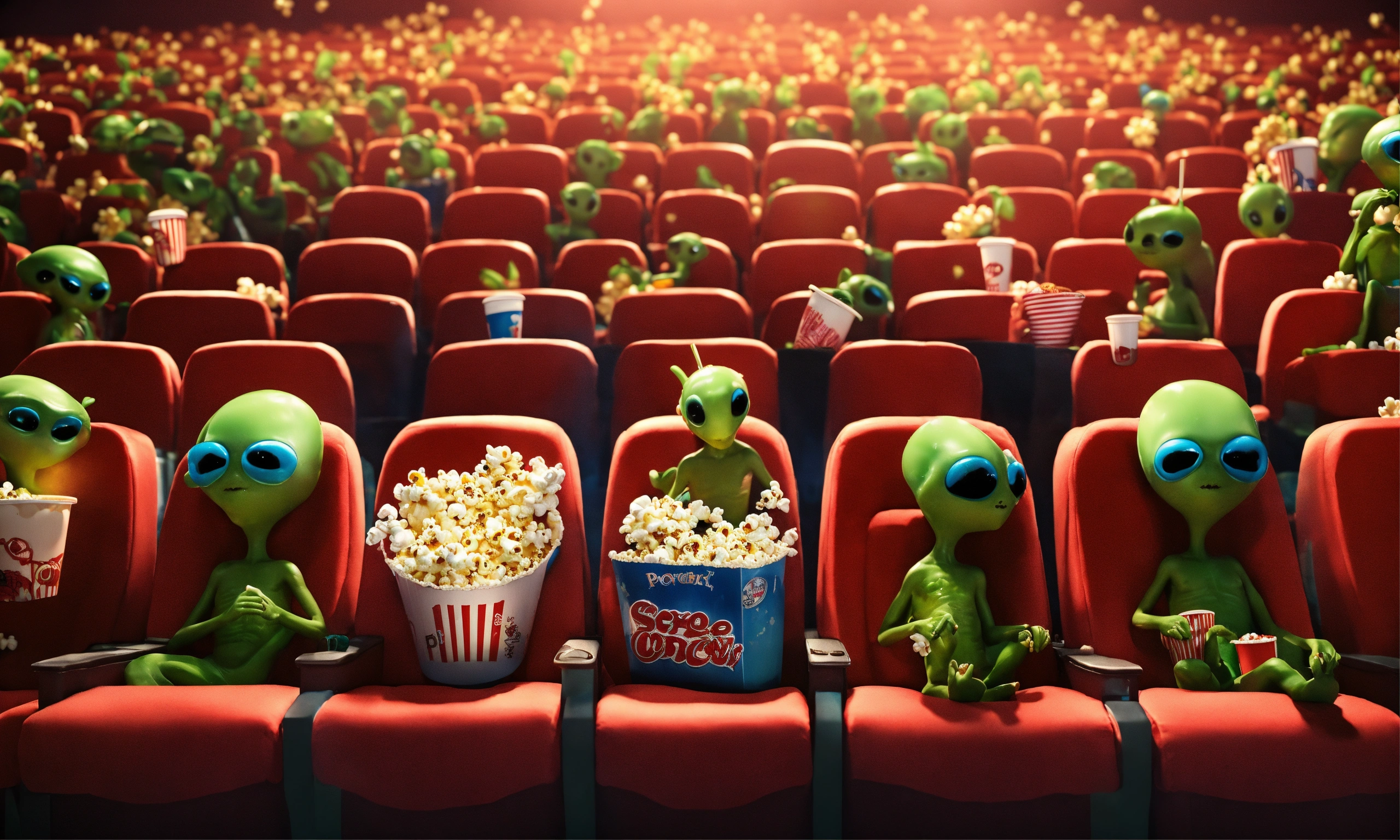 A lot of cute aliens sitting in a movie theater eating popcorn and drinking soft drink watching a movie in the dark