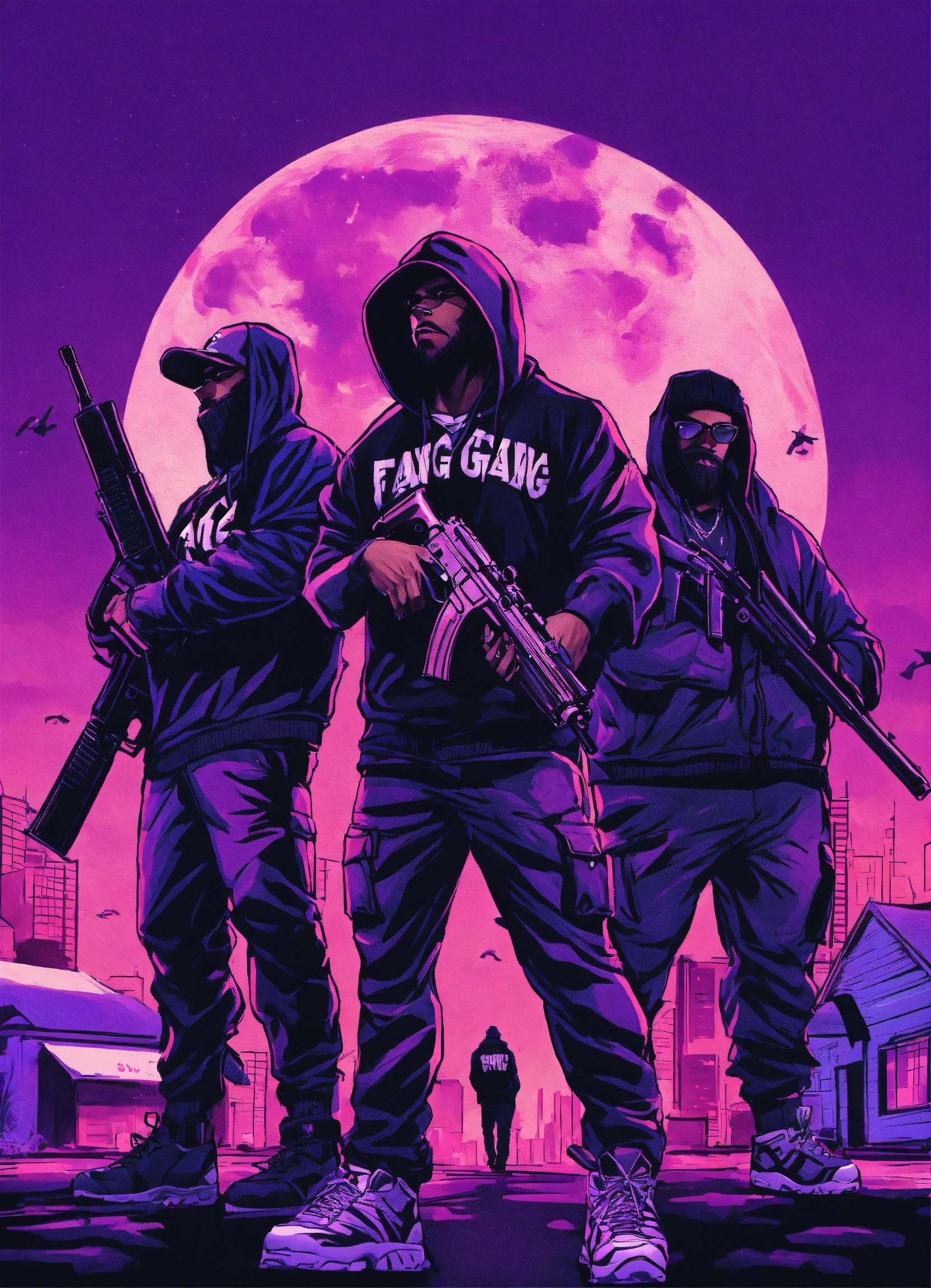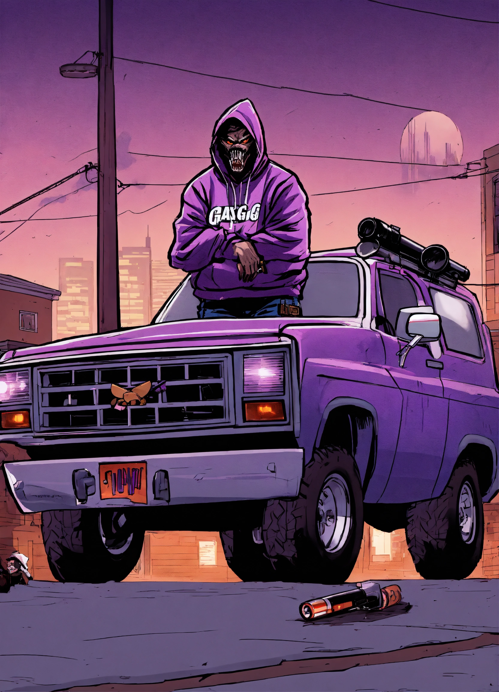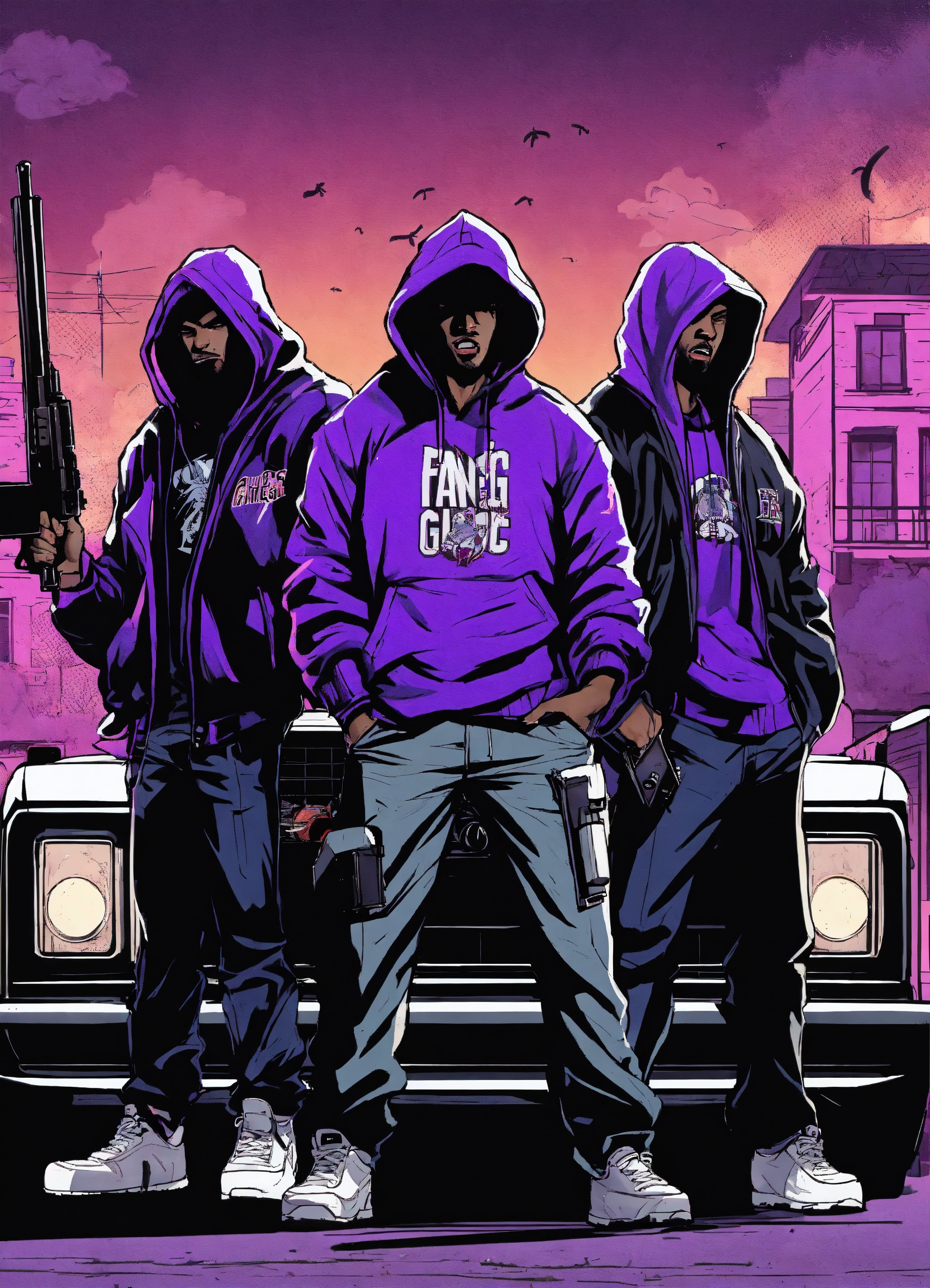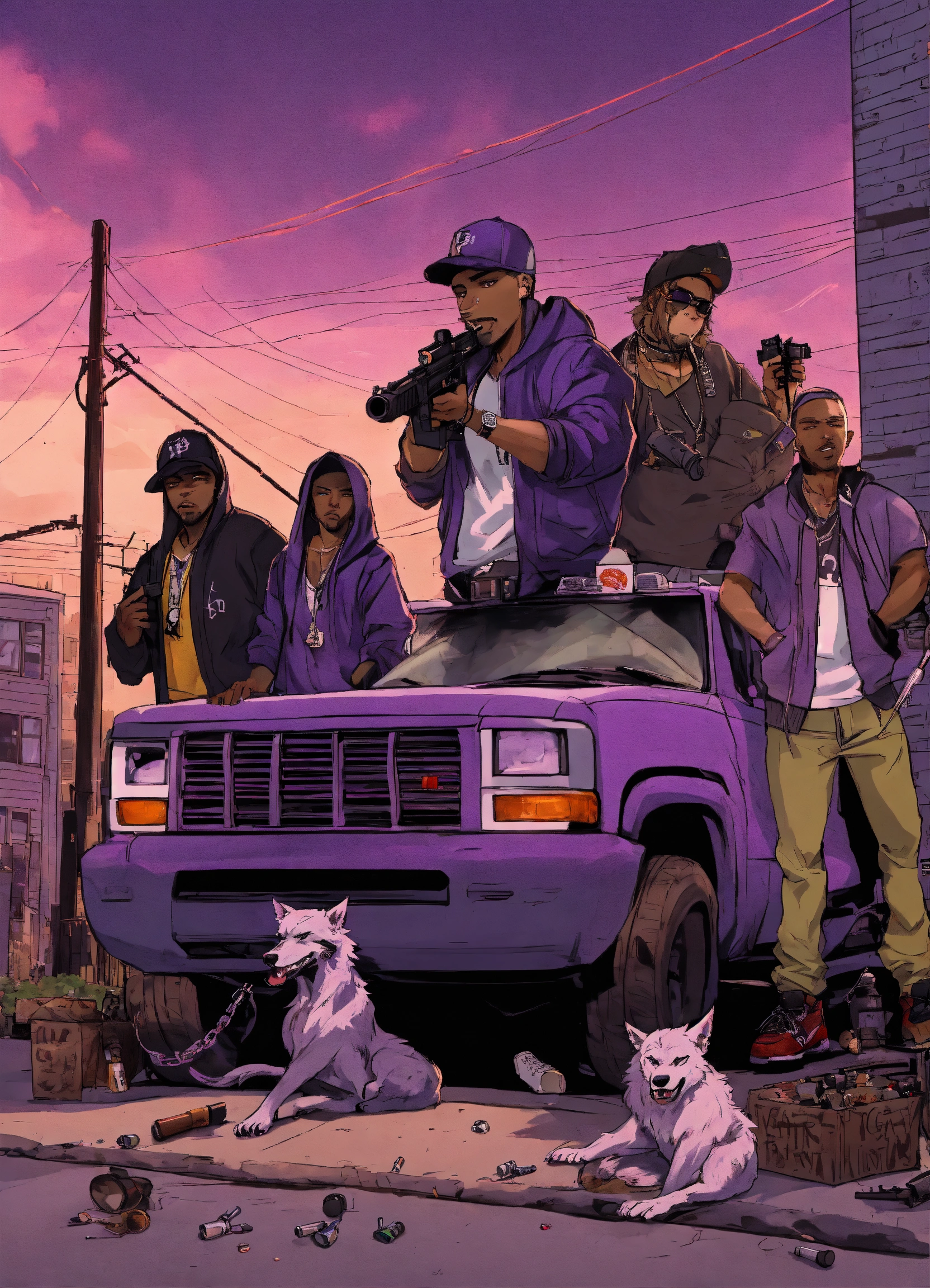 Gangster werewolves, in hoodies and baseball caps with the words fang gang in purple chicago background, guns bullets, suv truck with rims, loading weapons, standing in front of a trap house in urban city neighborhood