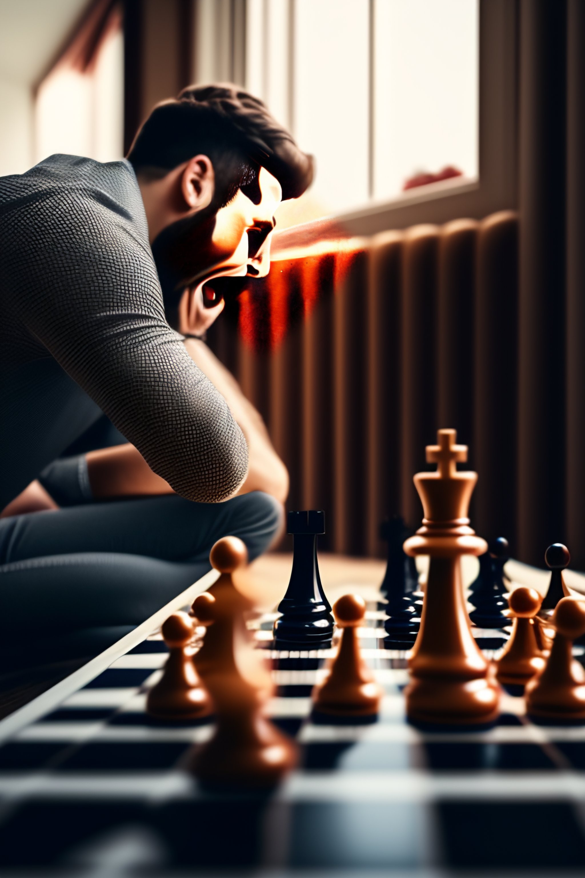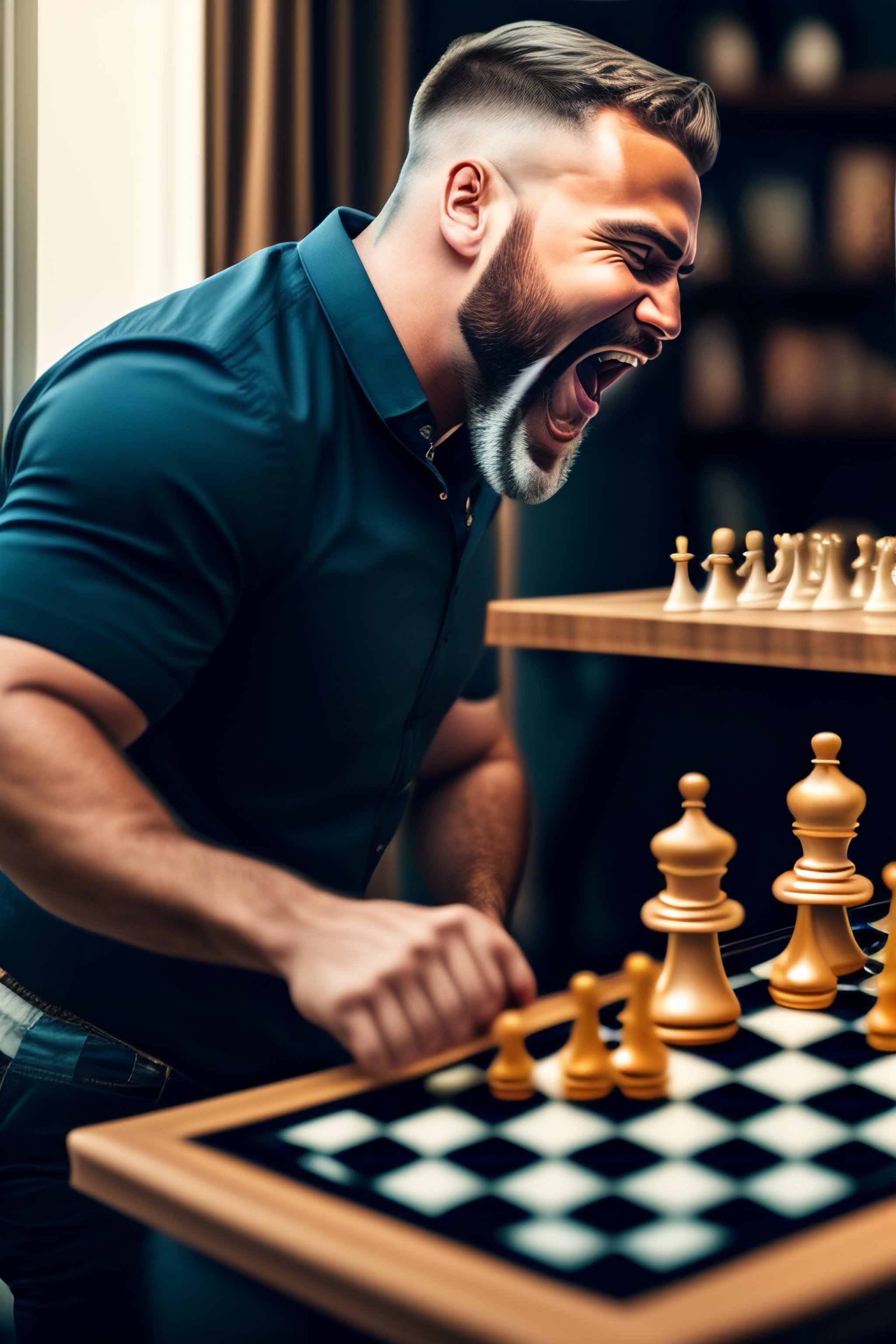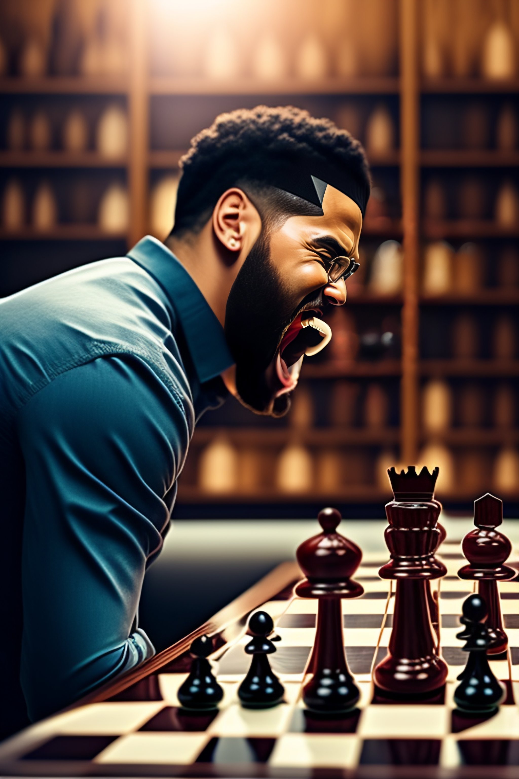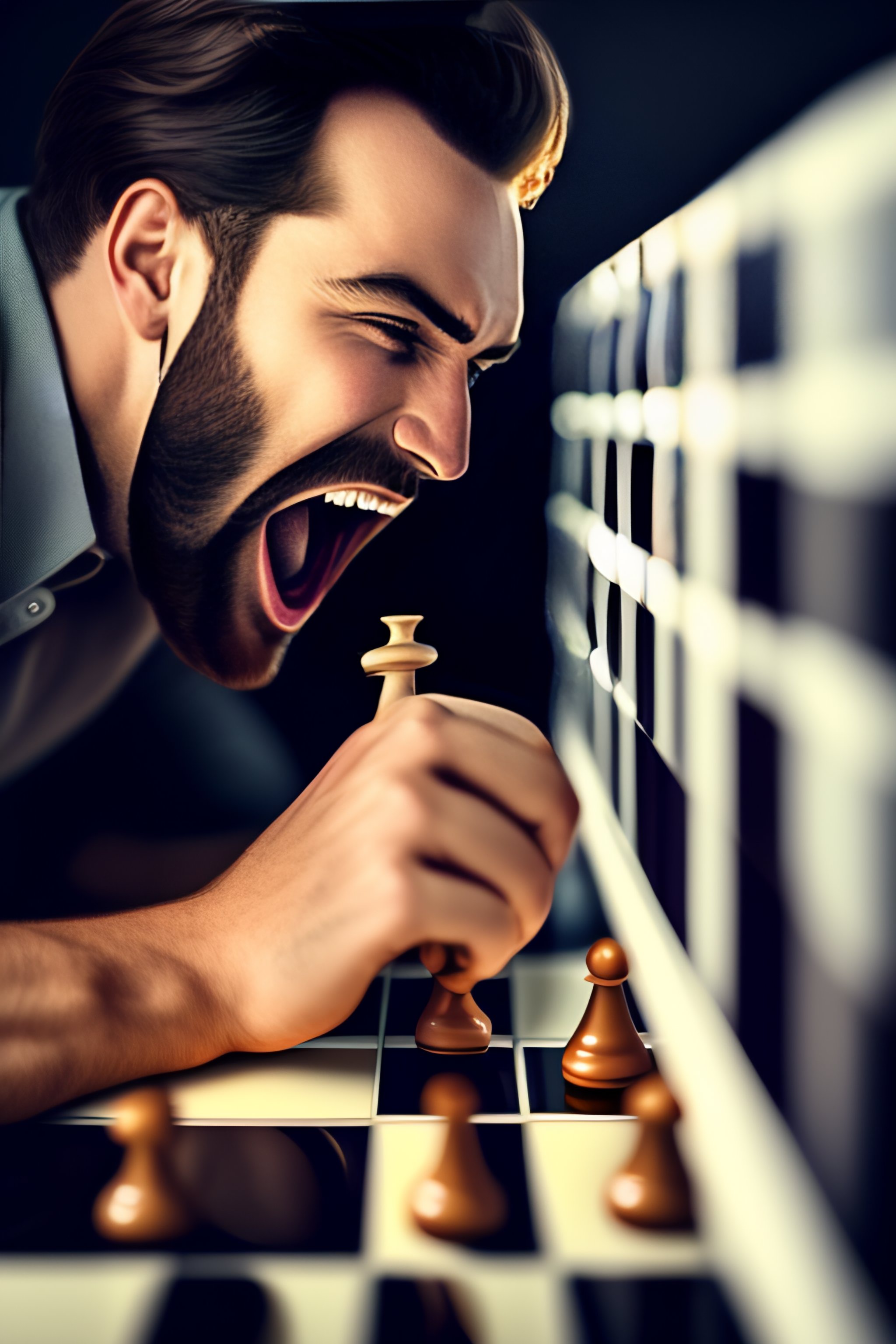 Man looking at a chessboard and screaming with excitement