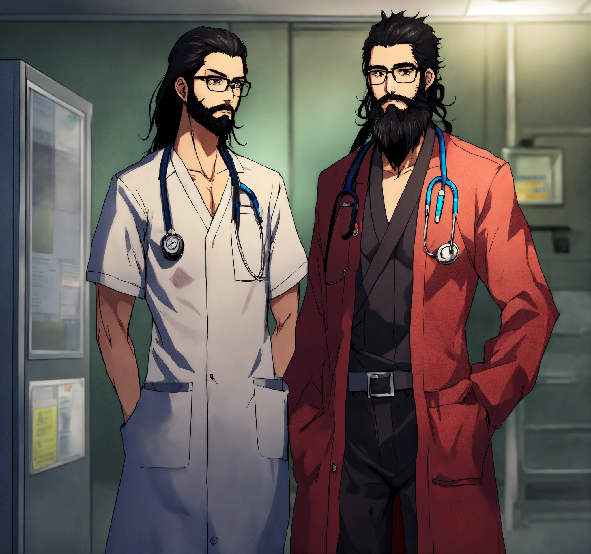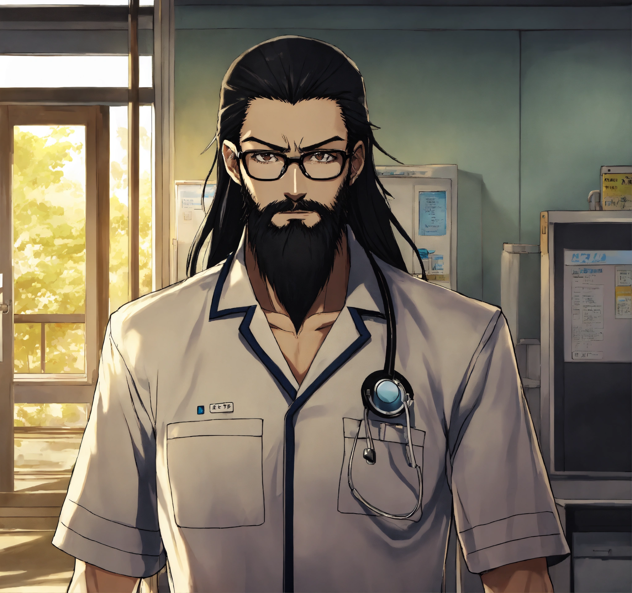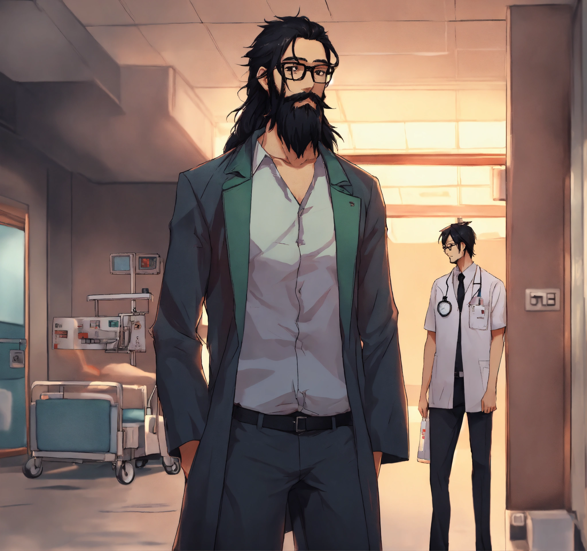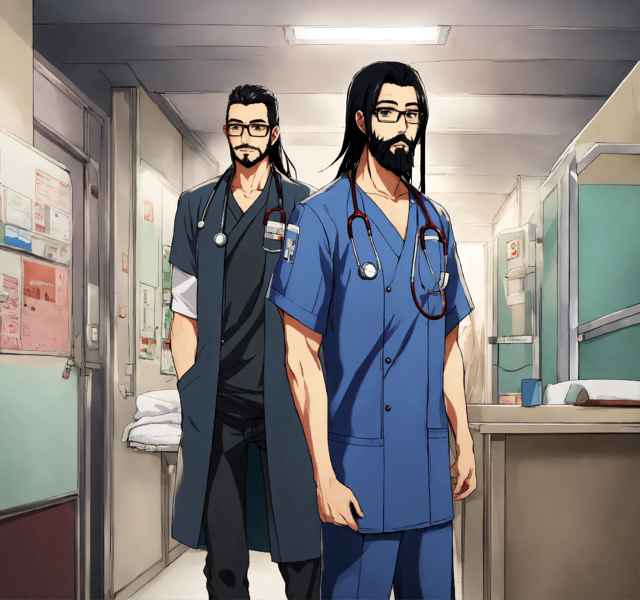 Hospital nurse man skinny and tall with black long hair and black beard with glasses ripped body anime style