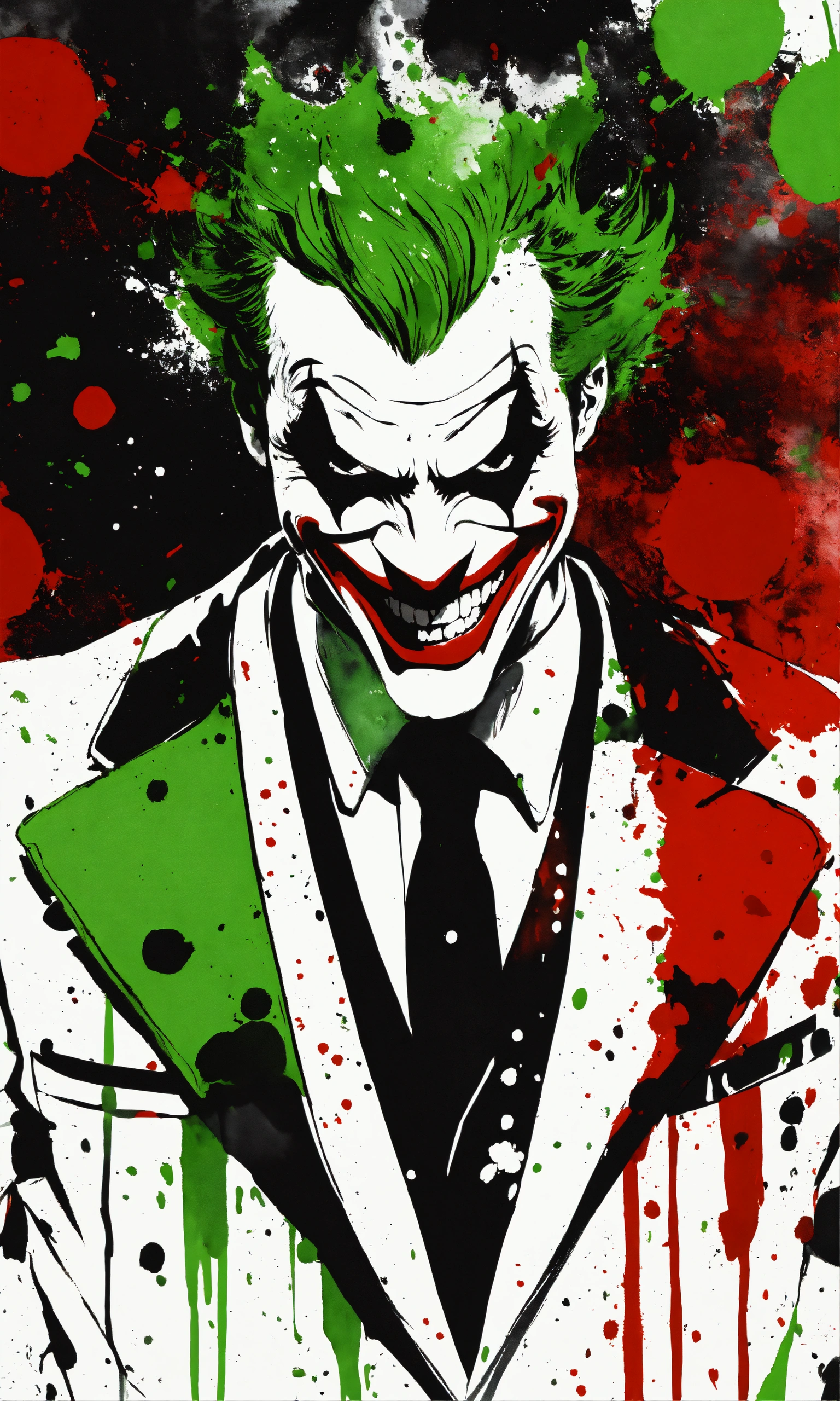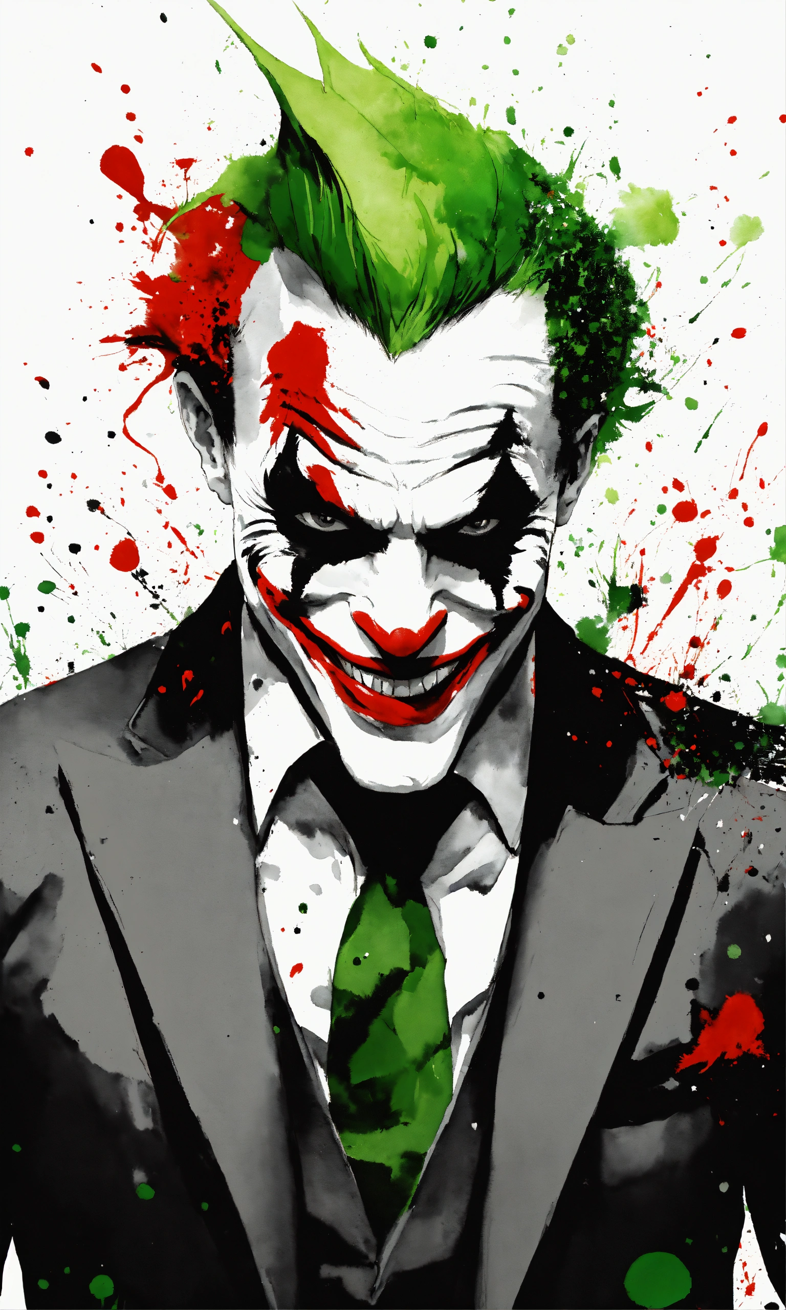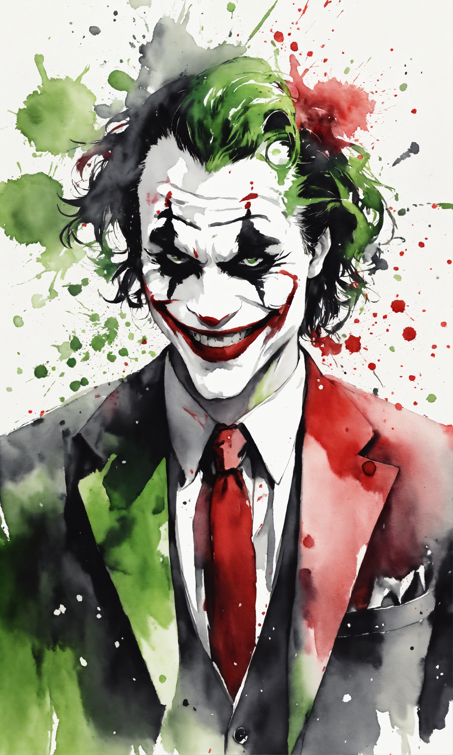 White background, a black and white smiling joker, red and green, half body portrait, suit and tie, front view, black and white, splatter watercolor, b & w