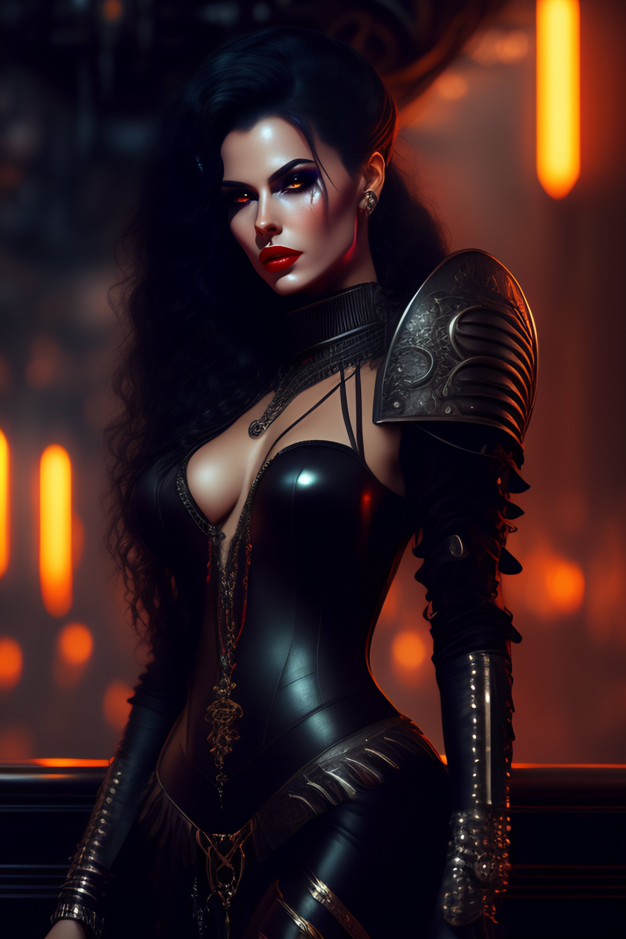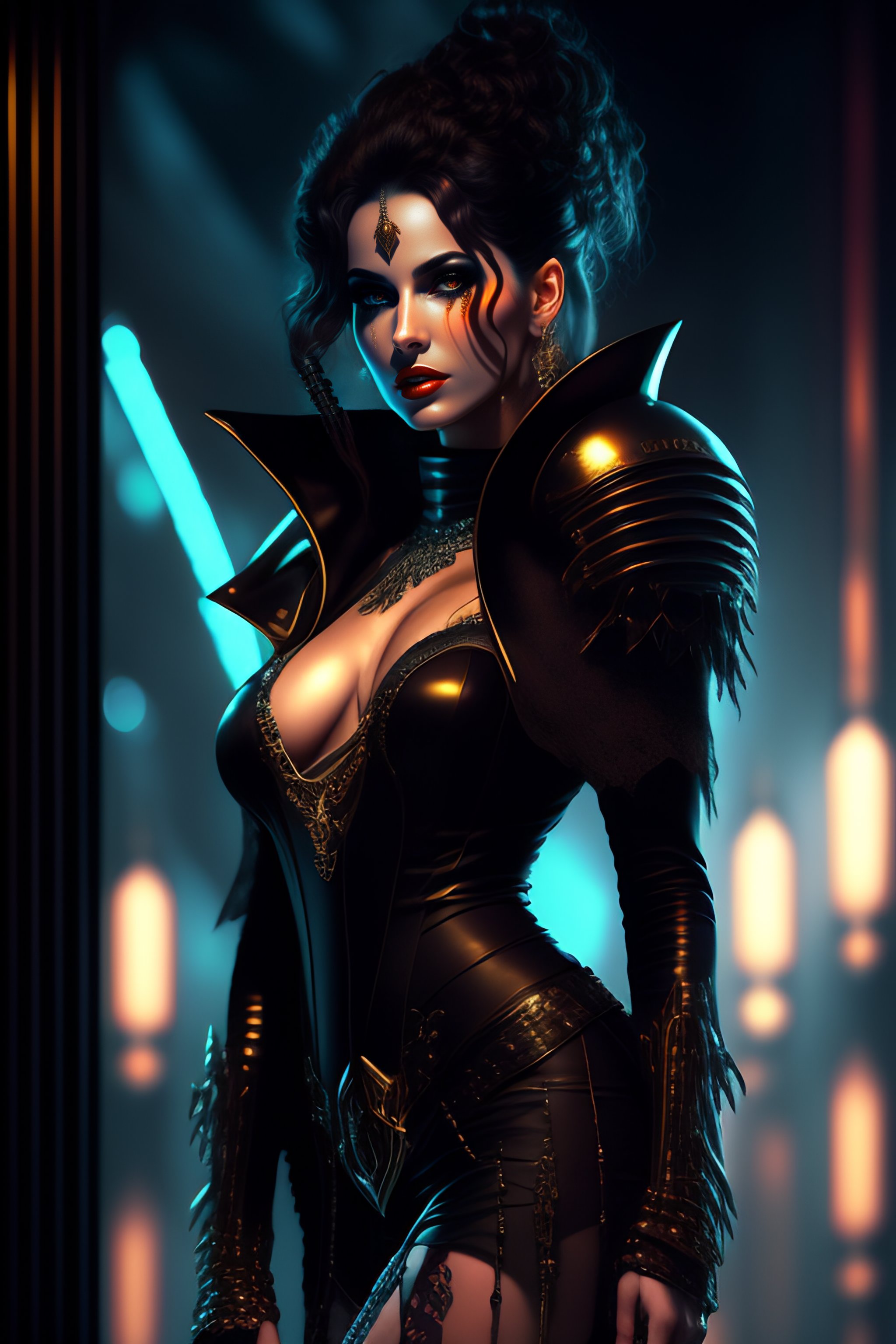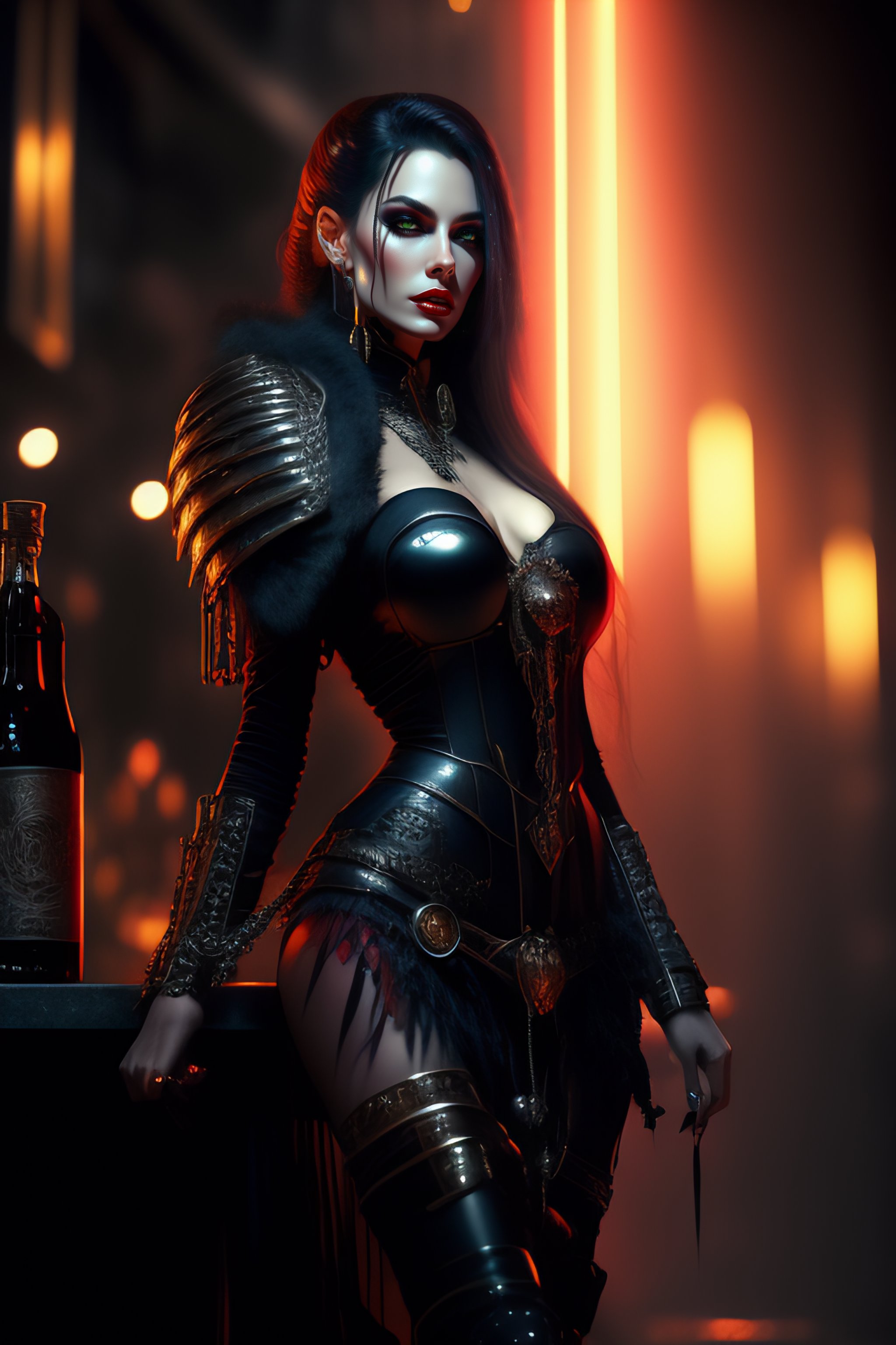 Female vampire, full body cinematic style digital art render with mechanical and futuristic details in a cyberpunk underworld, (((drinking a bloody cocktail))), moody atmospheric lighting, bizarre, dangerous, art by louis royo and giger
