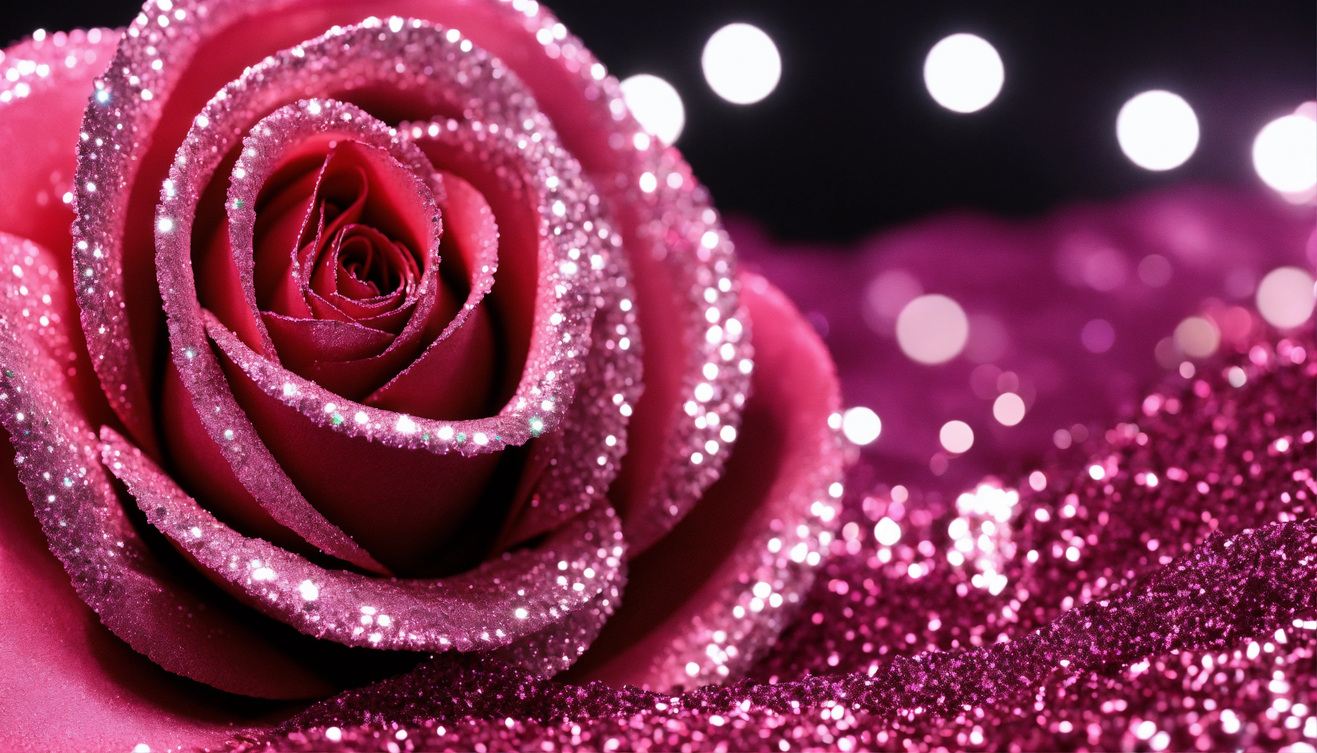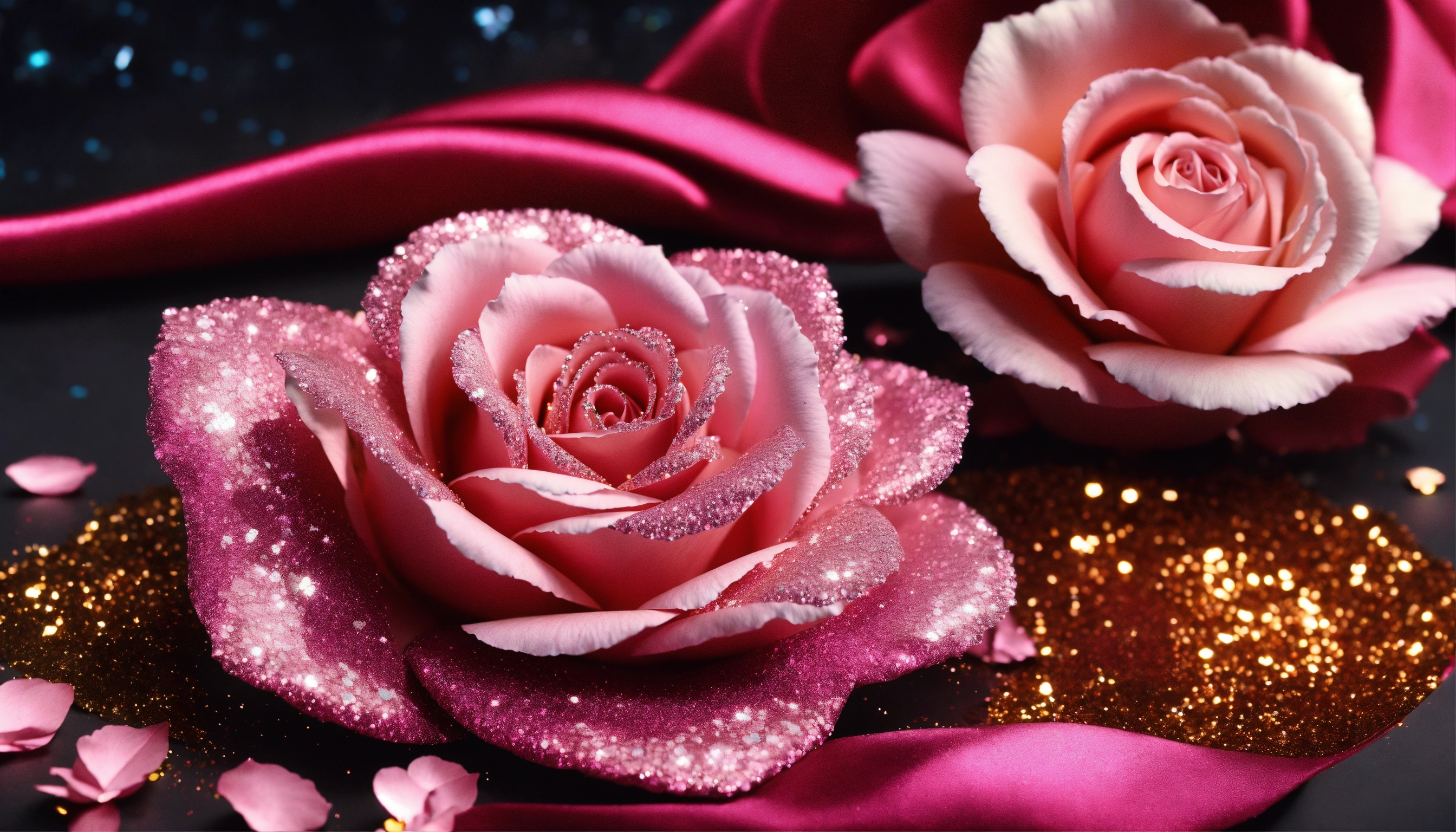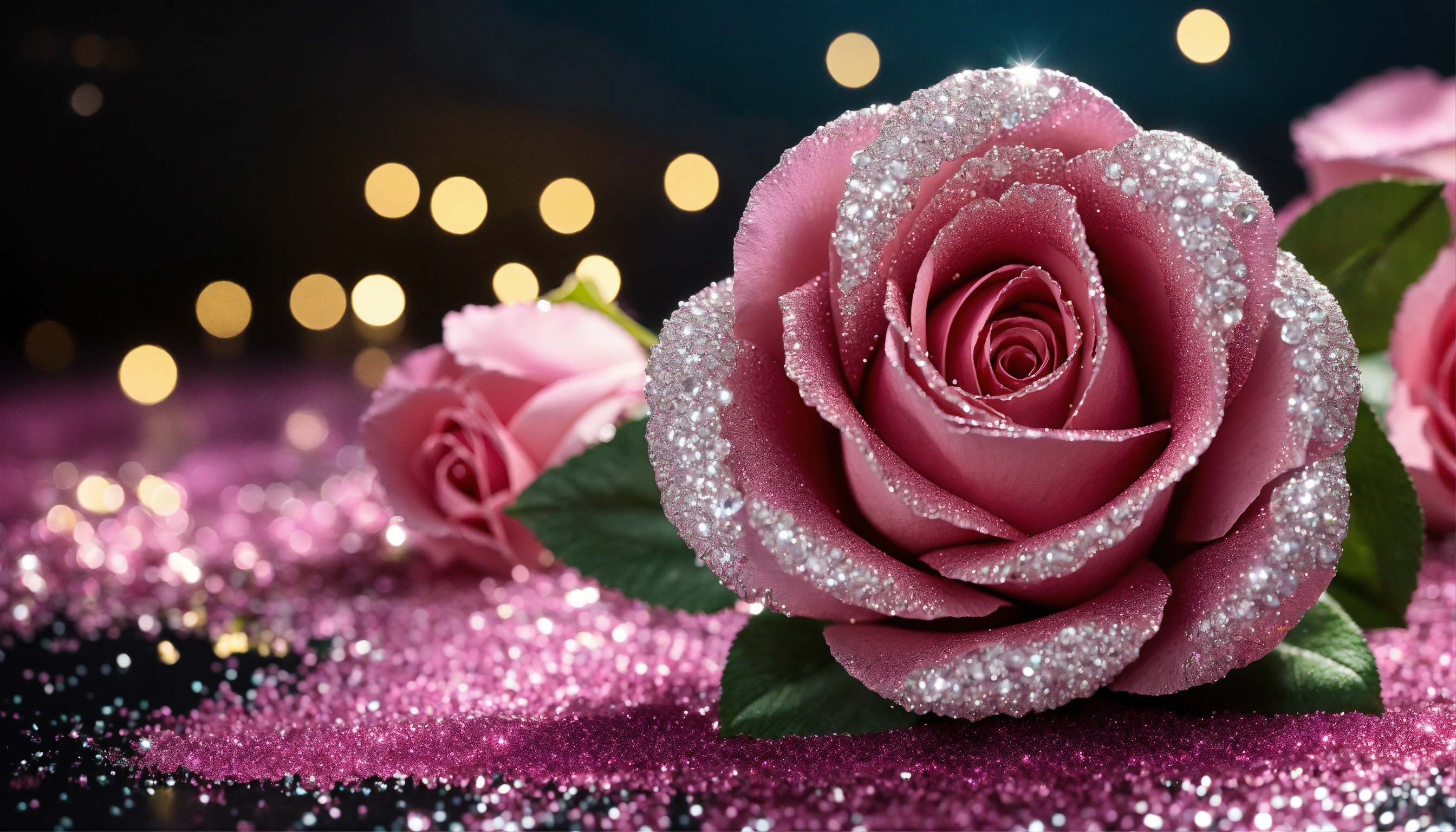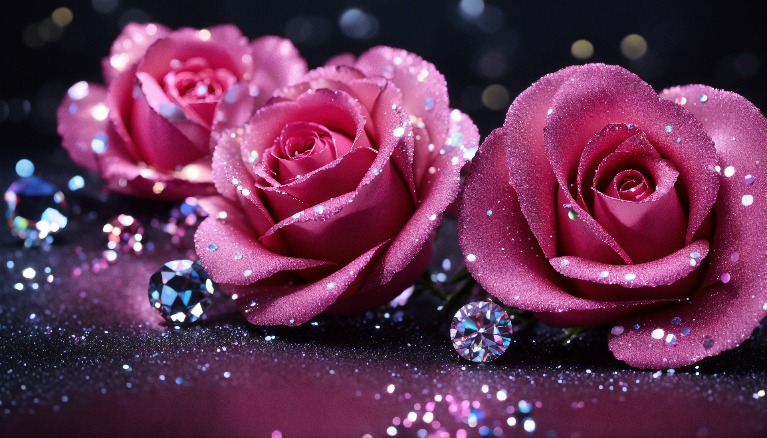 Rosas realistas 3d com perola de diamante, no canto esquerdo da tela, fundo preto, detalhes de glitter rosa