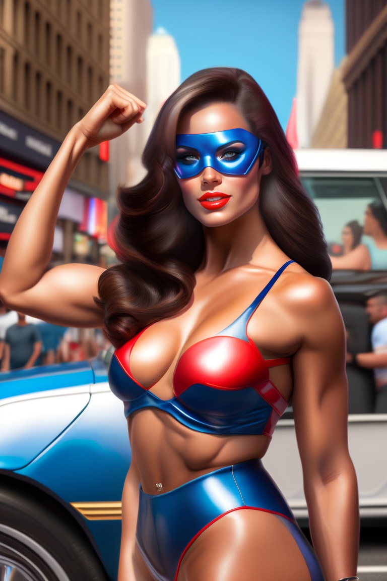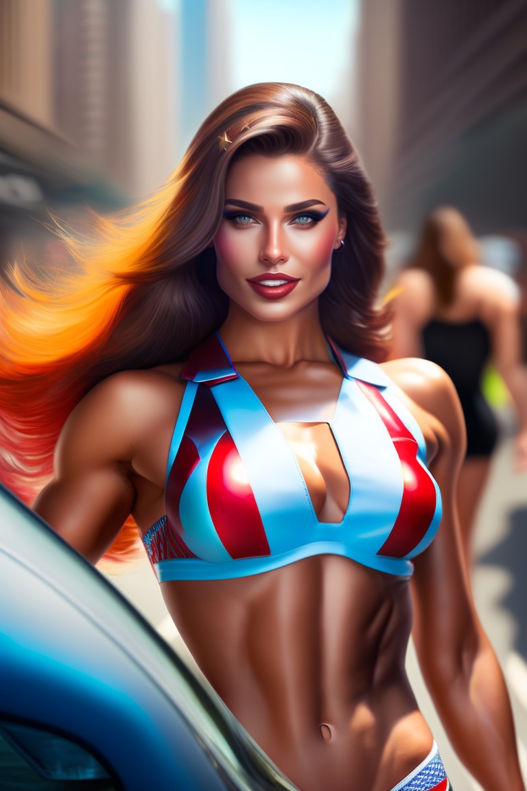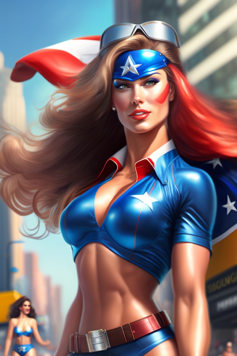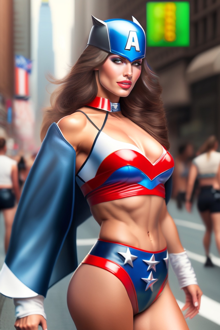 Realistic sexy women as captain america in bikini, in a crowded road of new york, hyper realistic, detailed photo, sharp focus