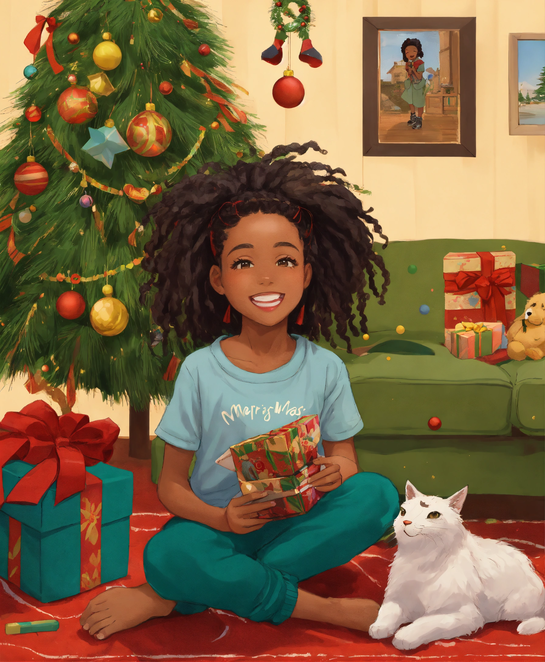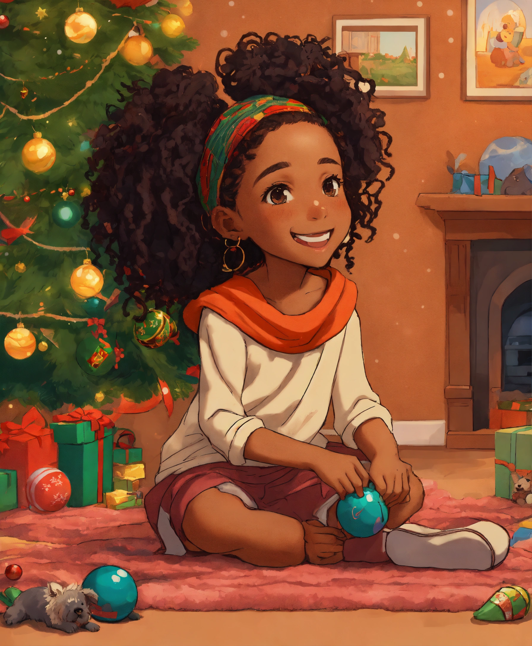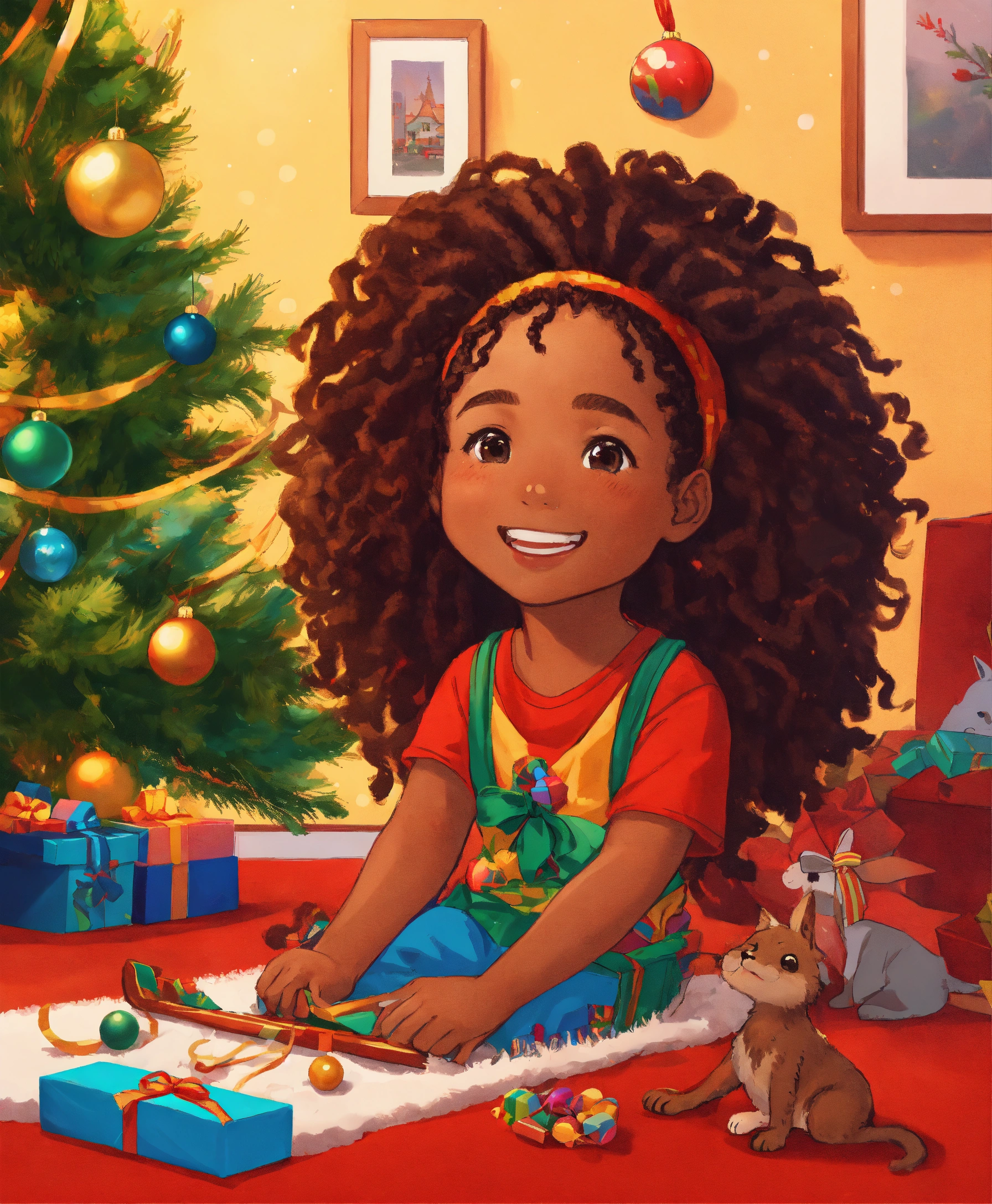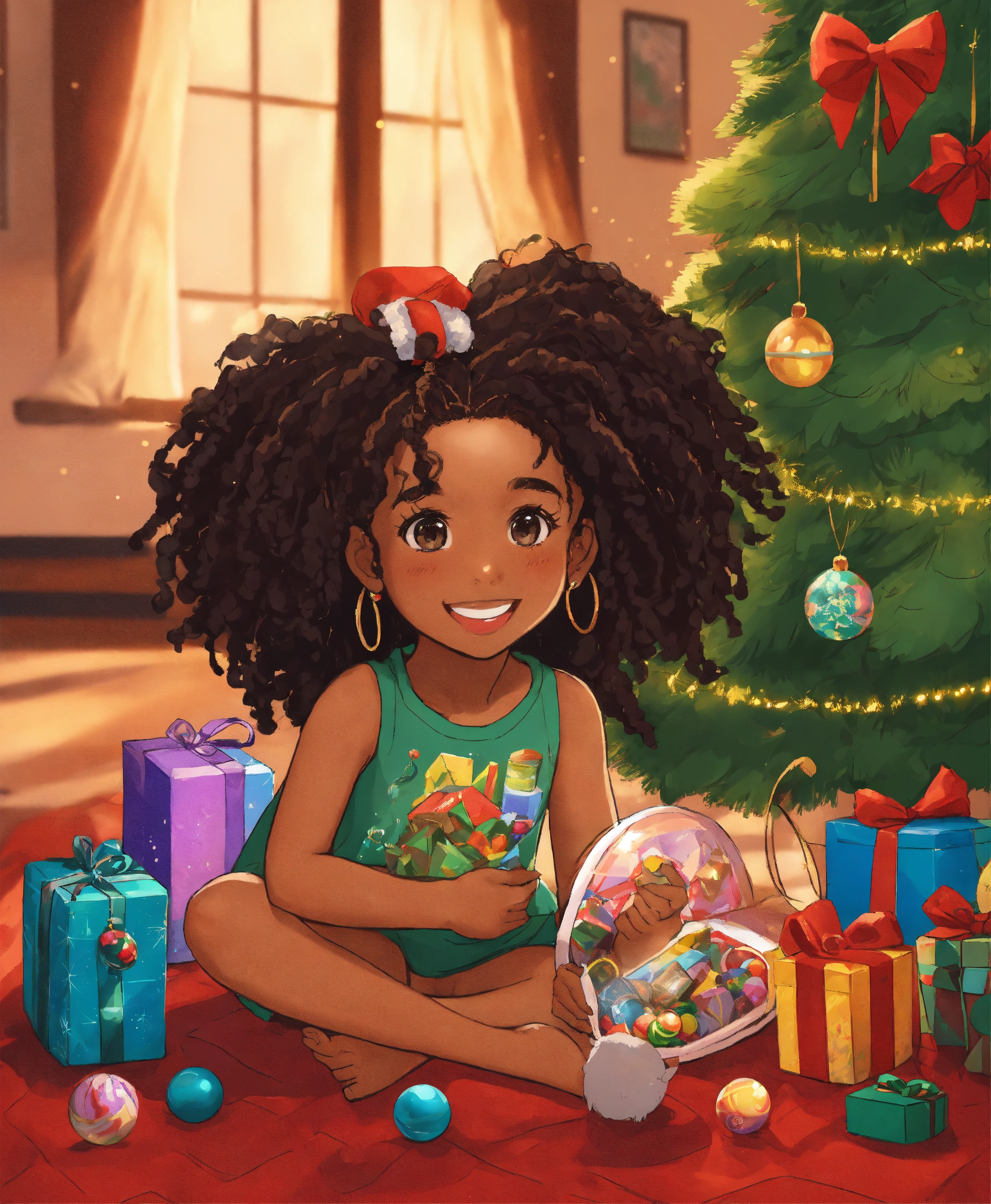 A happy little black spanish mixed girl. hair in african locs. playing with toys under the christmas tree in family room. simple art inspired by studio ghibli's visual style. detailed, clear background, full picture of room