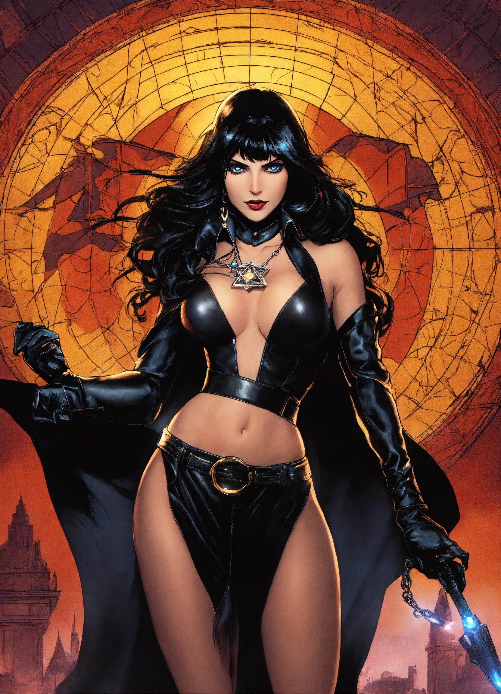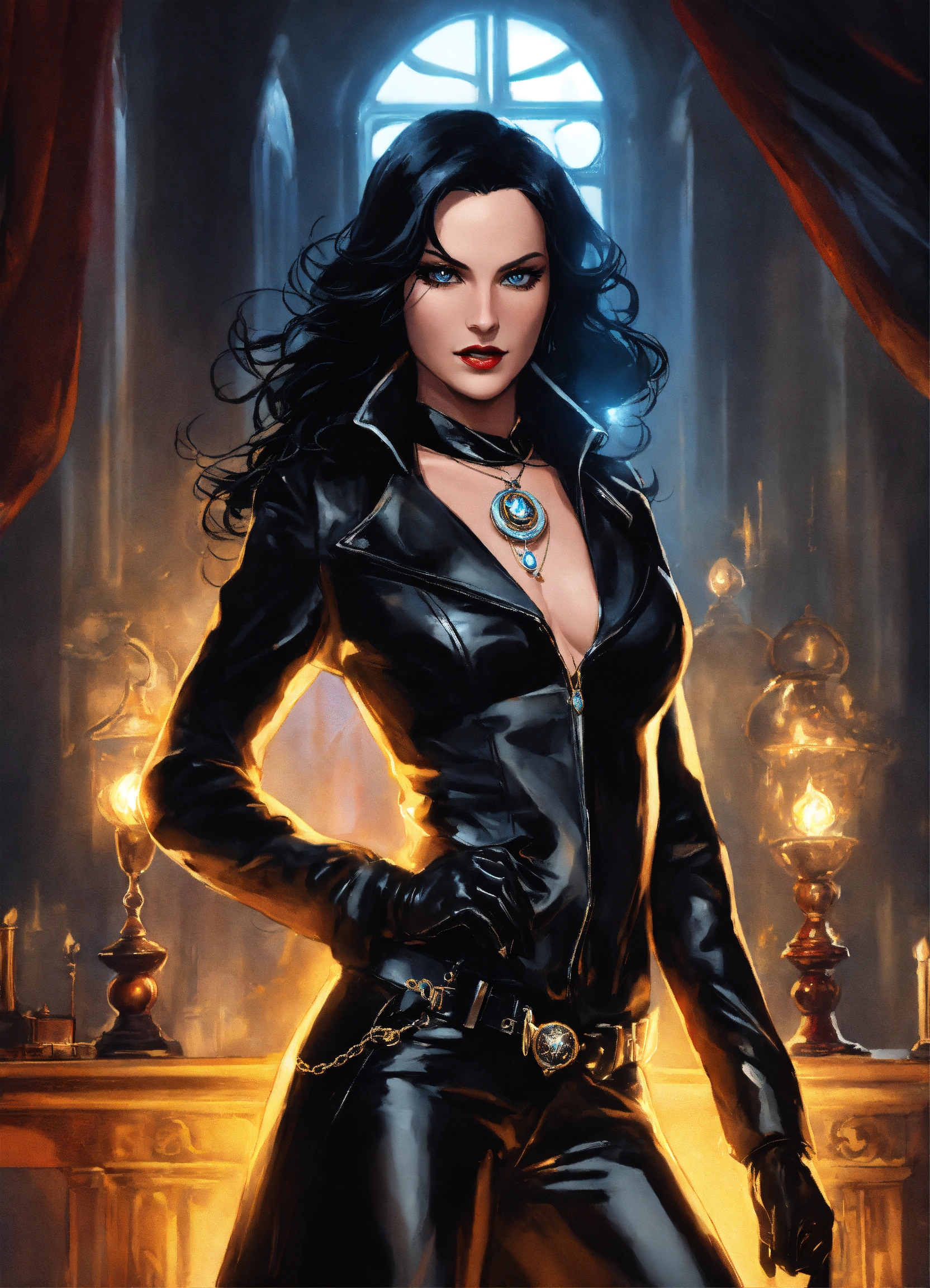 Powerful hypnotic black magic dc universe, zatanna wearing black leather boots & gloves with evil deep spellbind bewitching eyes hypnotizing me with a pendant