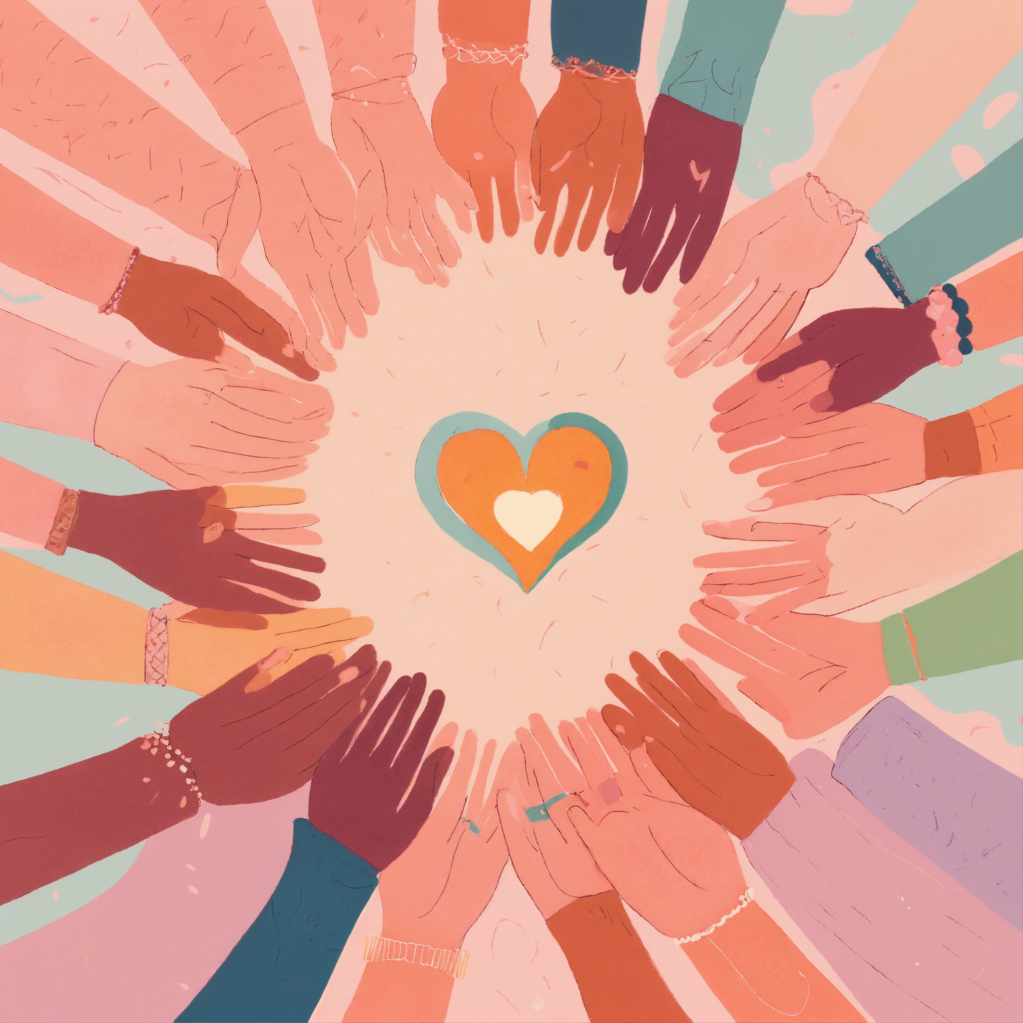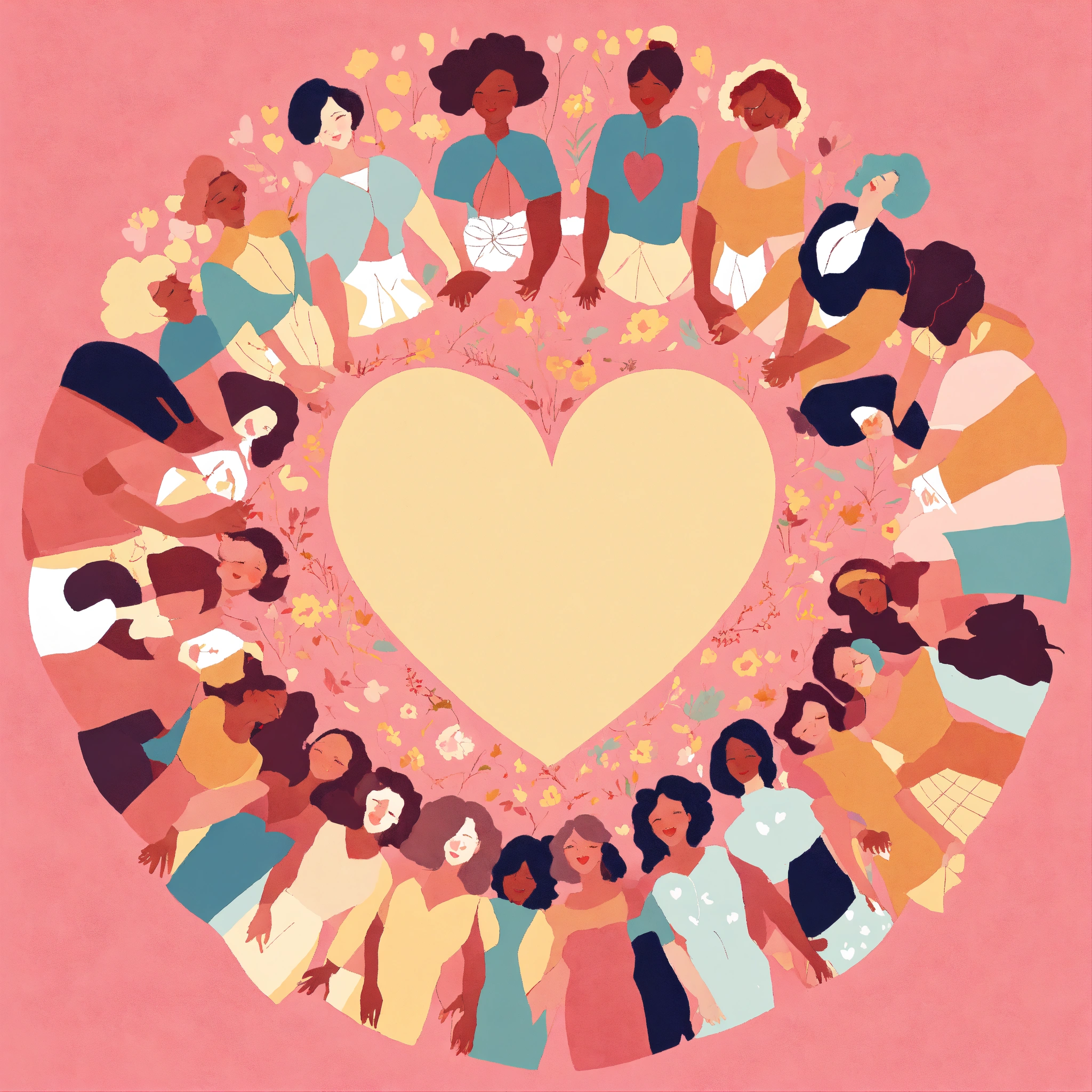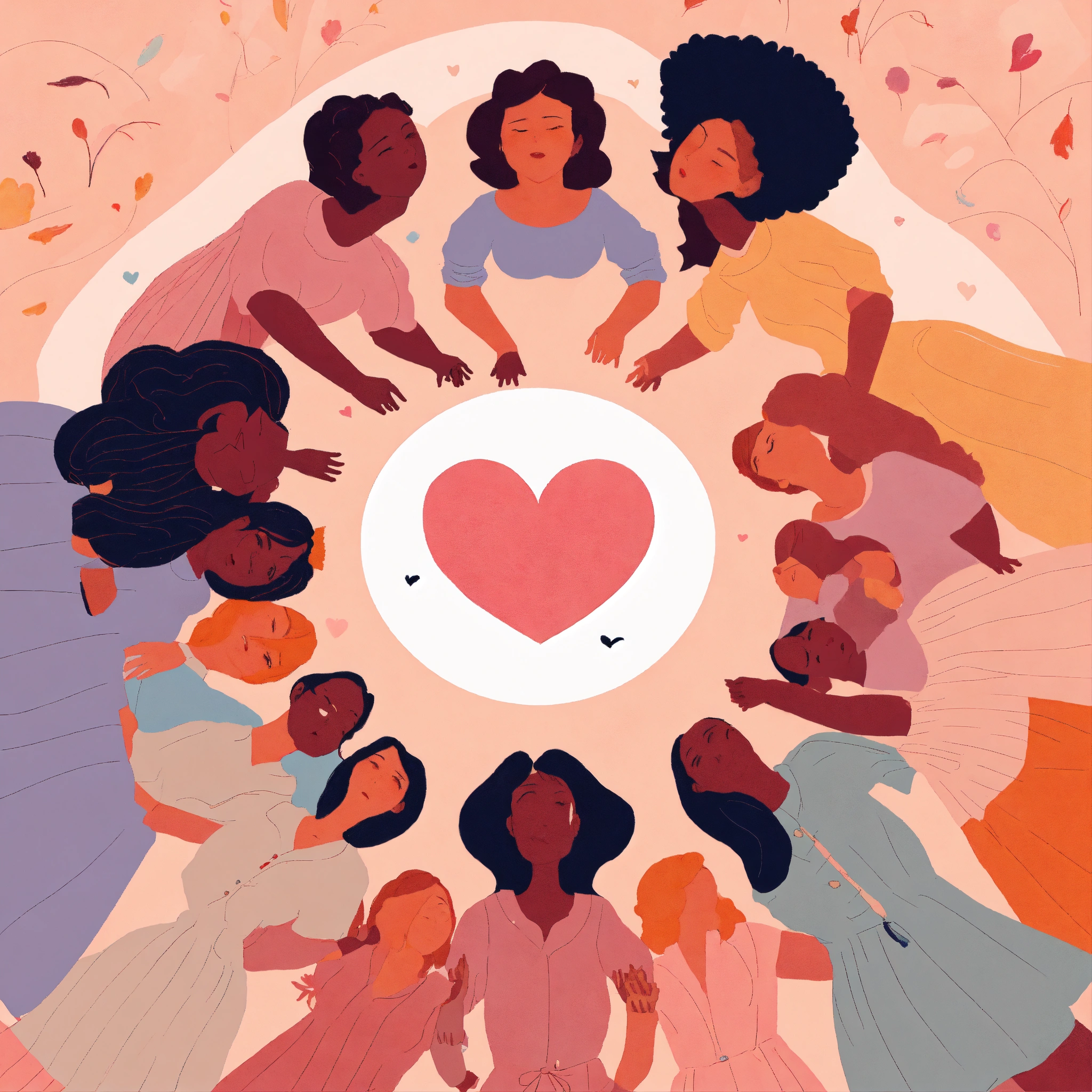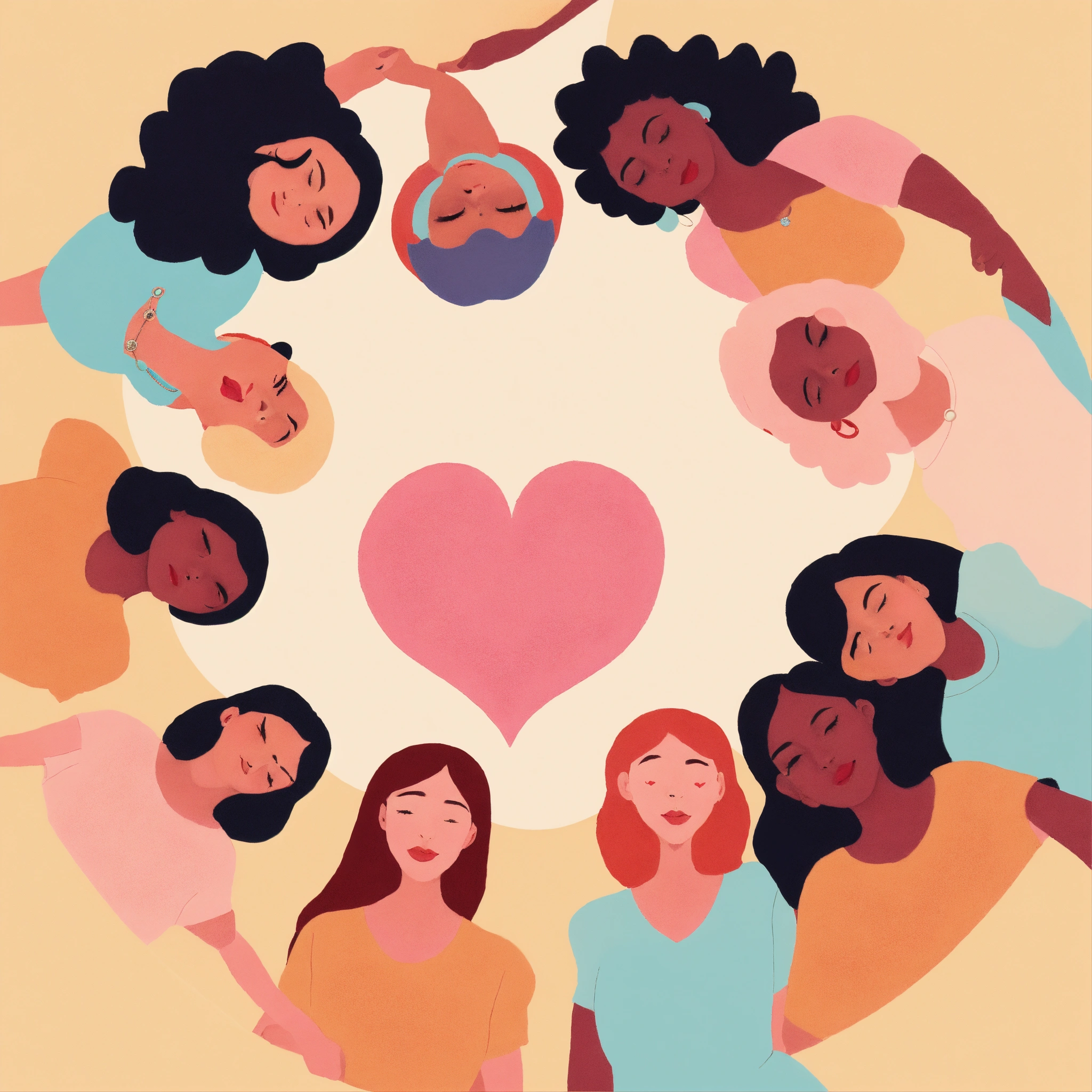 Pastel tones illustration of a group of caucasian women holding hands in a circle with a heart in the center, powerful, loving, united, detailed faces, worm's-eye perspective