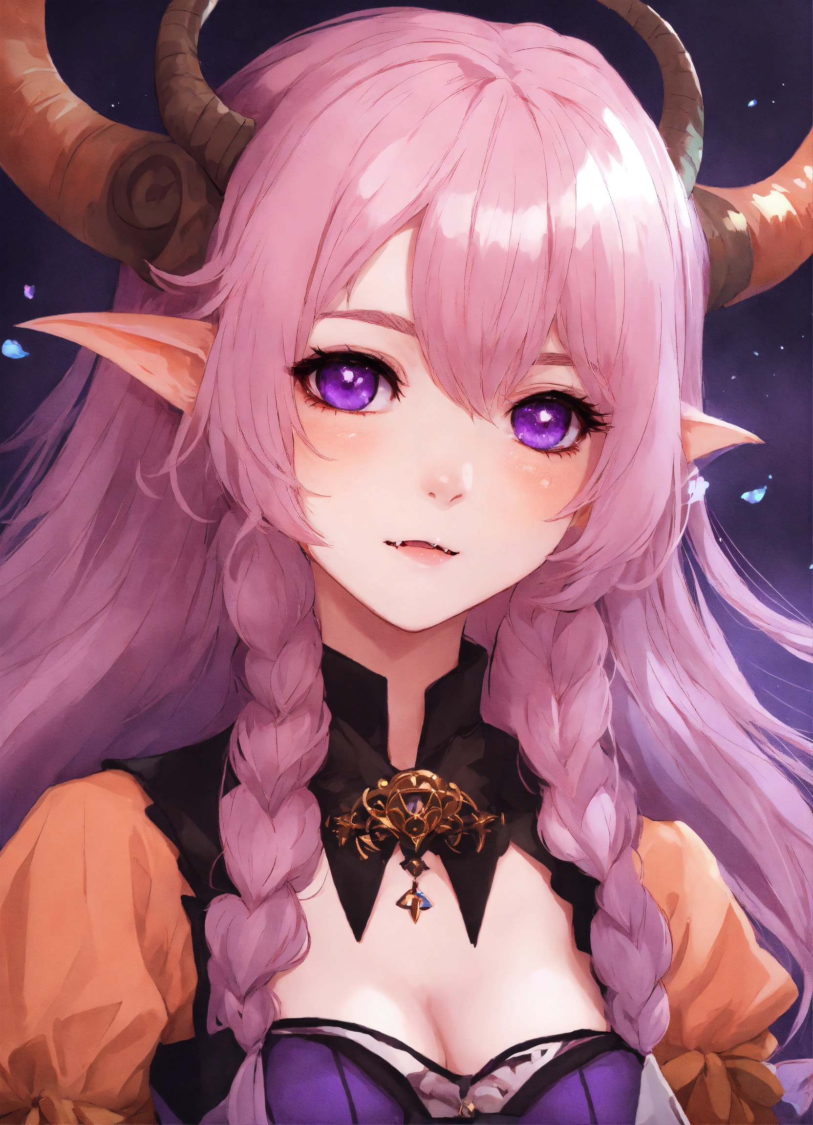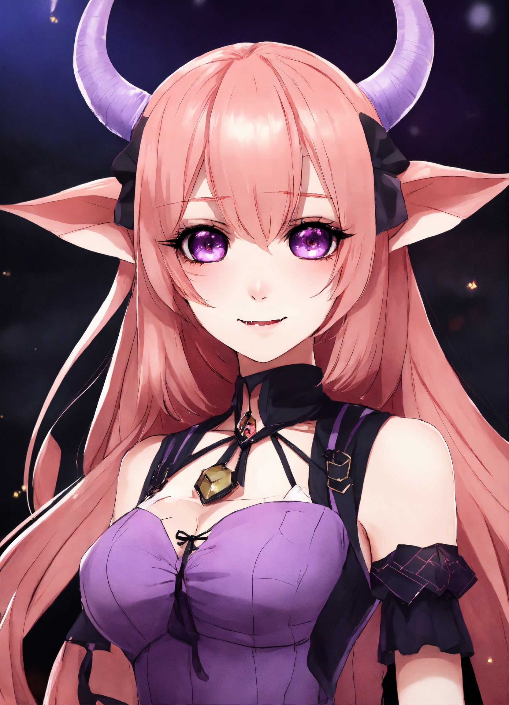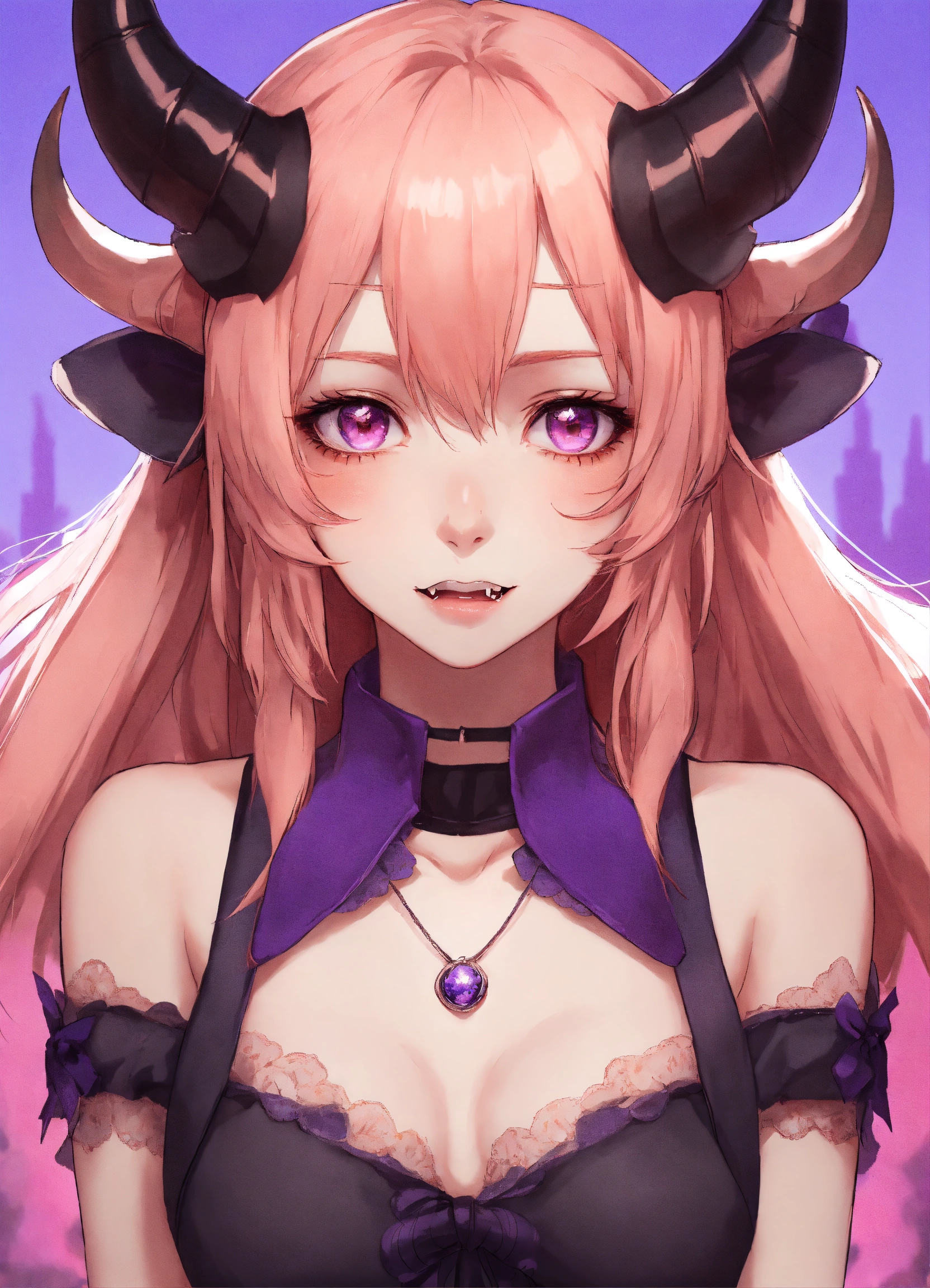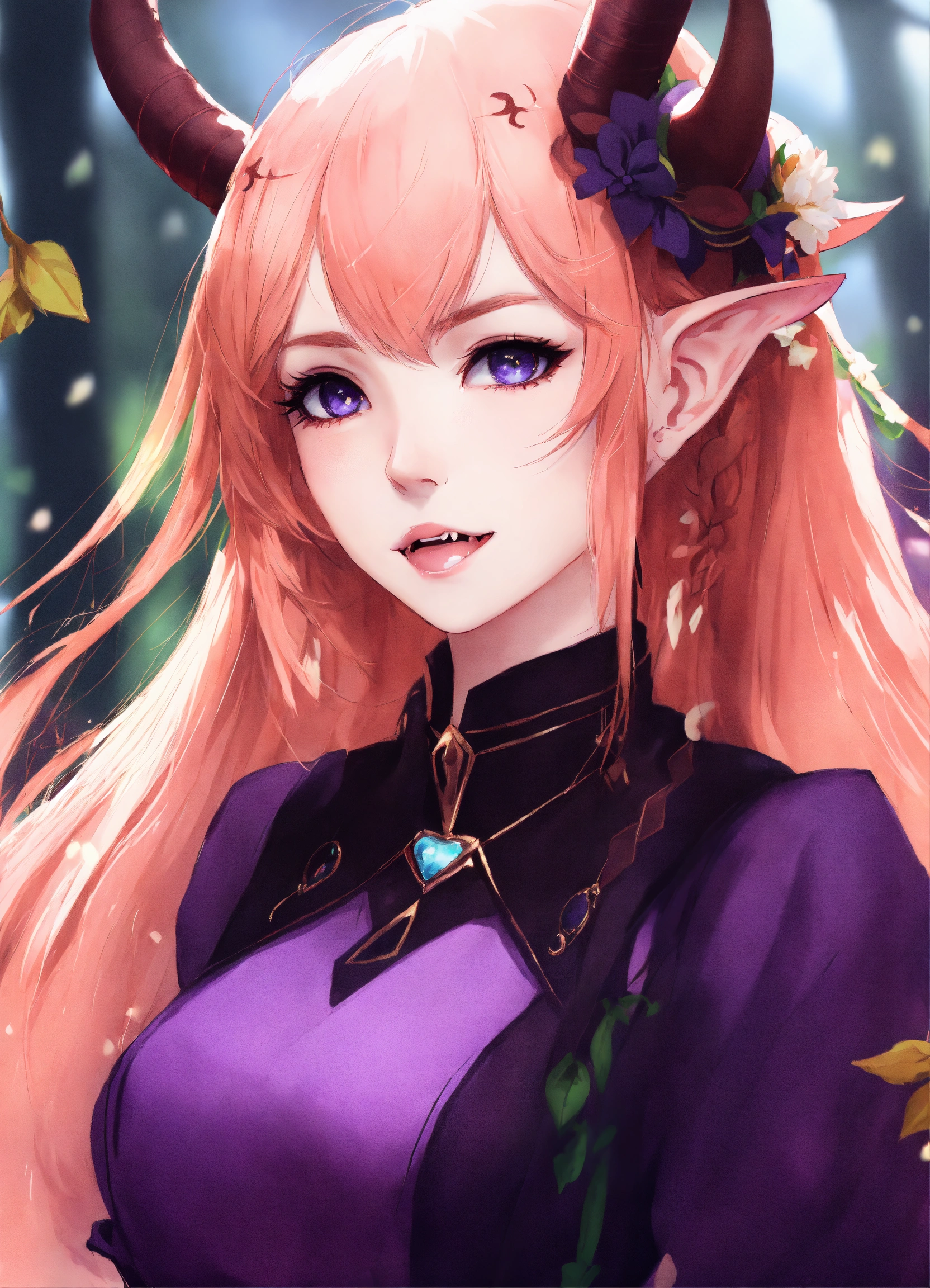 Cute anime girl, peach hair, pale skin, very coherent, eye color purple, fangs, elf ears, black horns