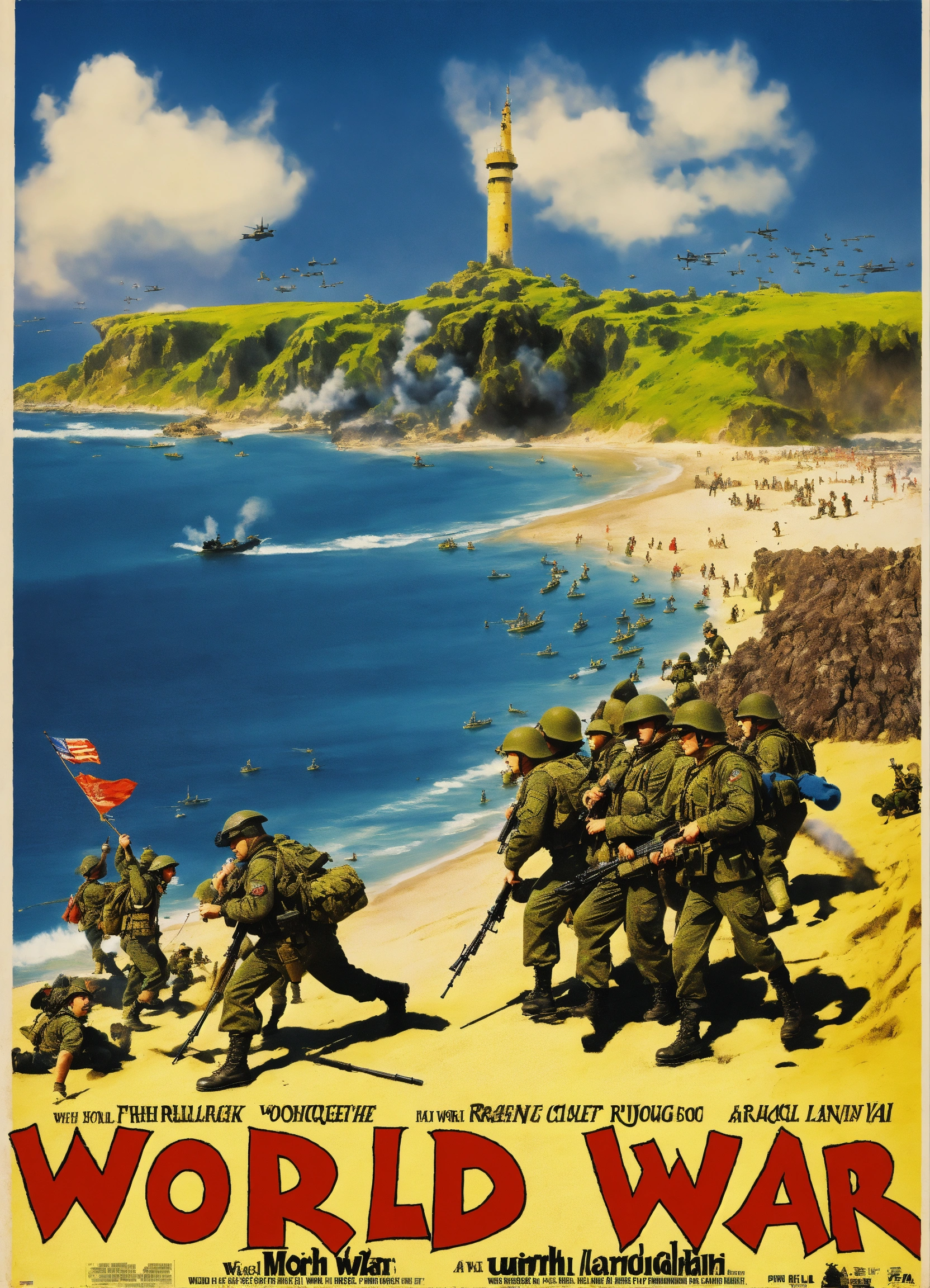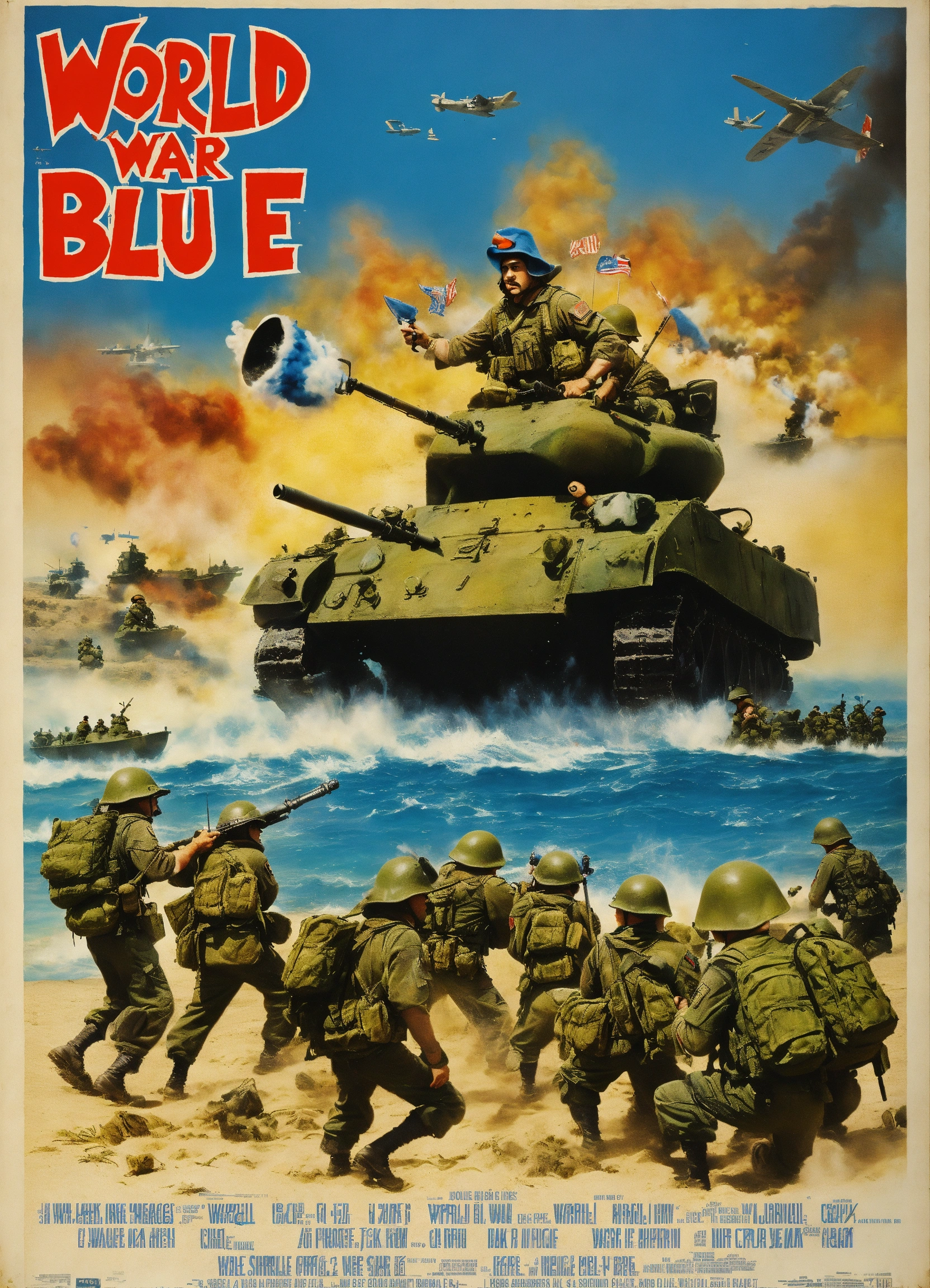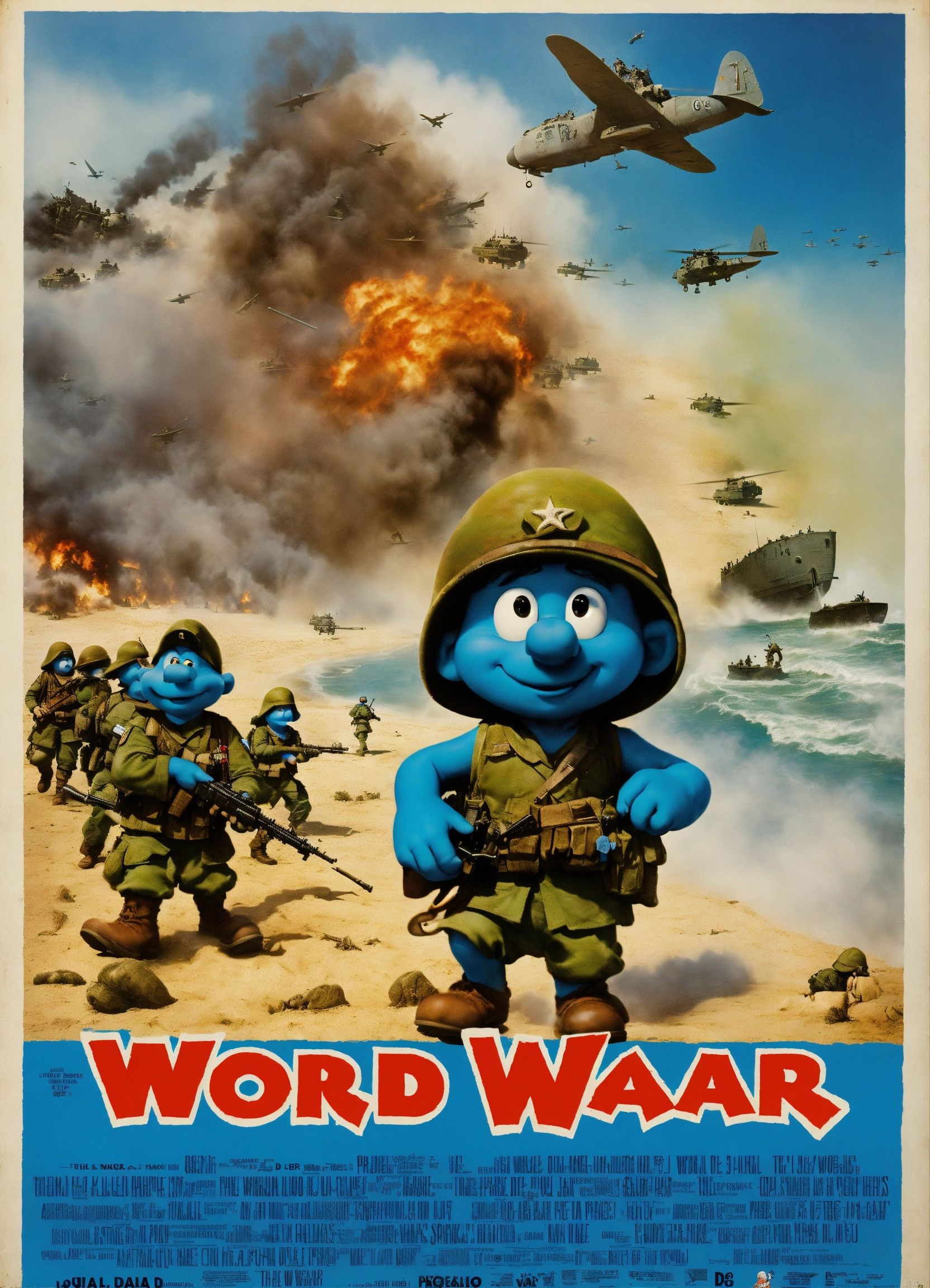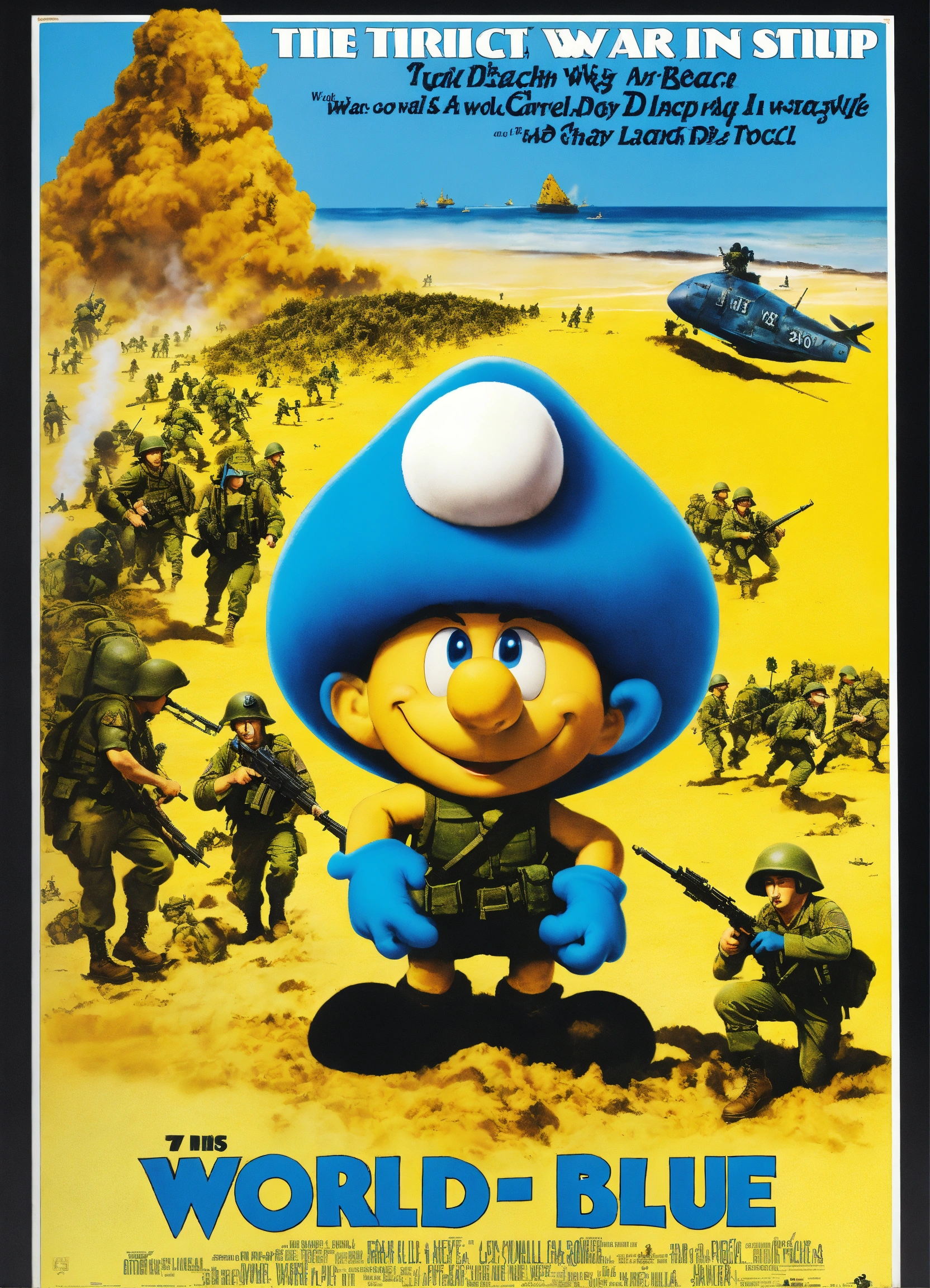 A movie poster for "world war blue" a war movie, in witch the smurfs invade fragle rock with a d day like beach landing.