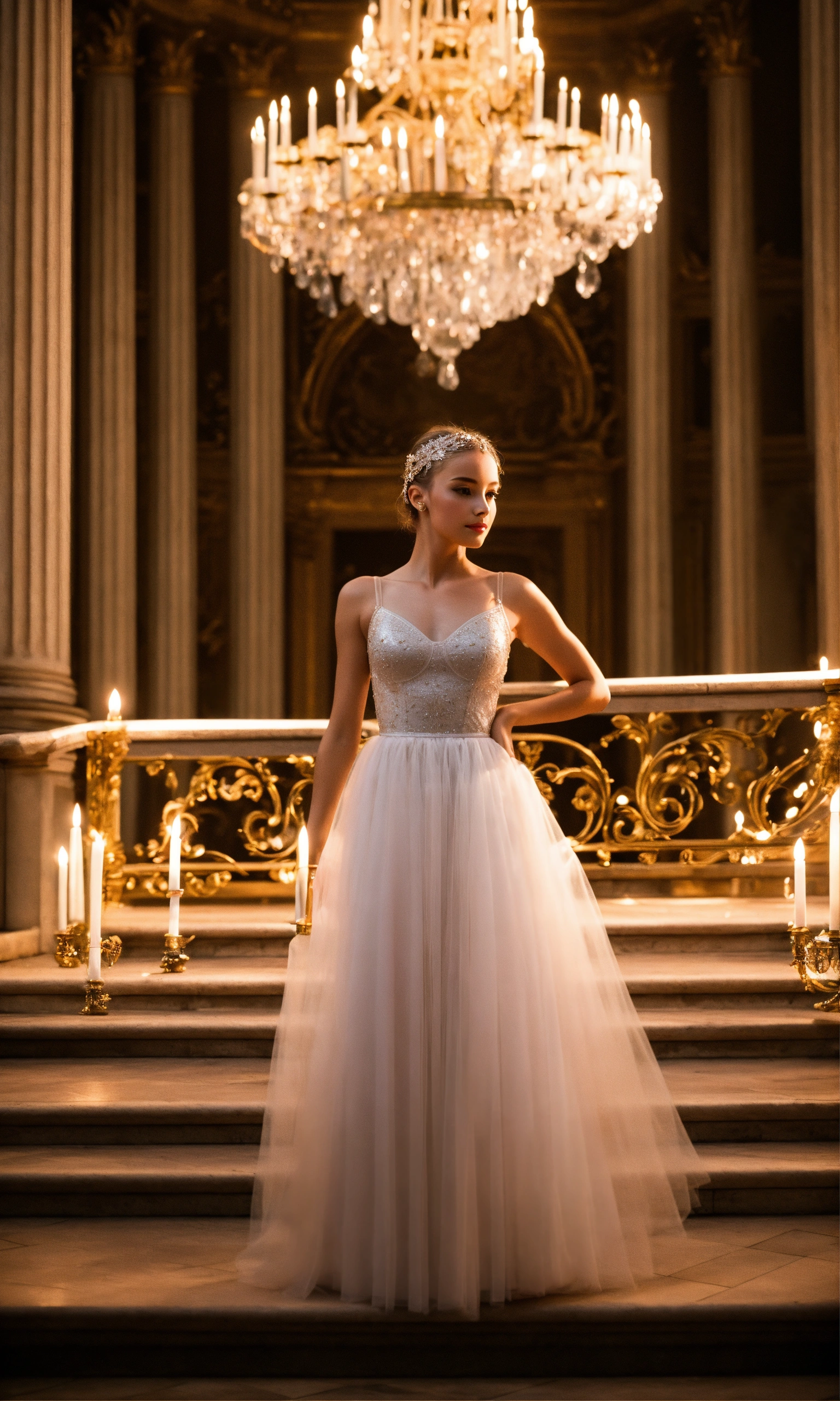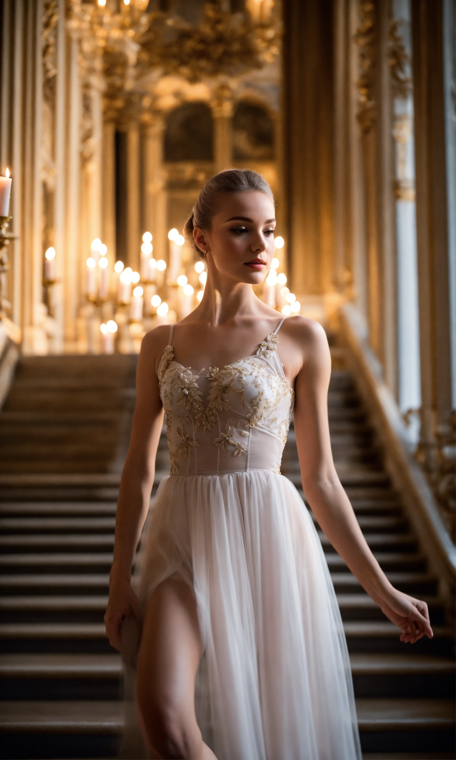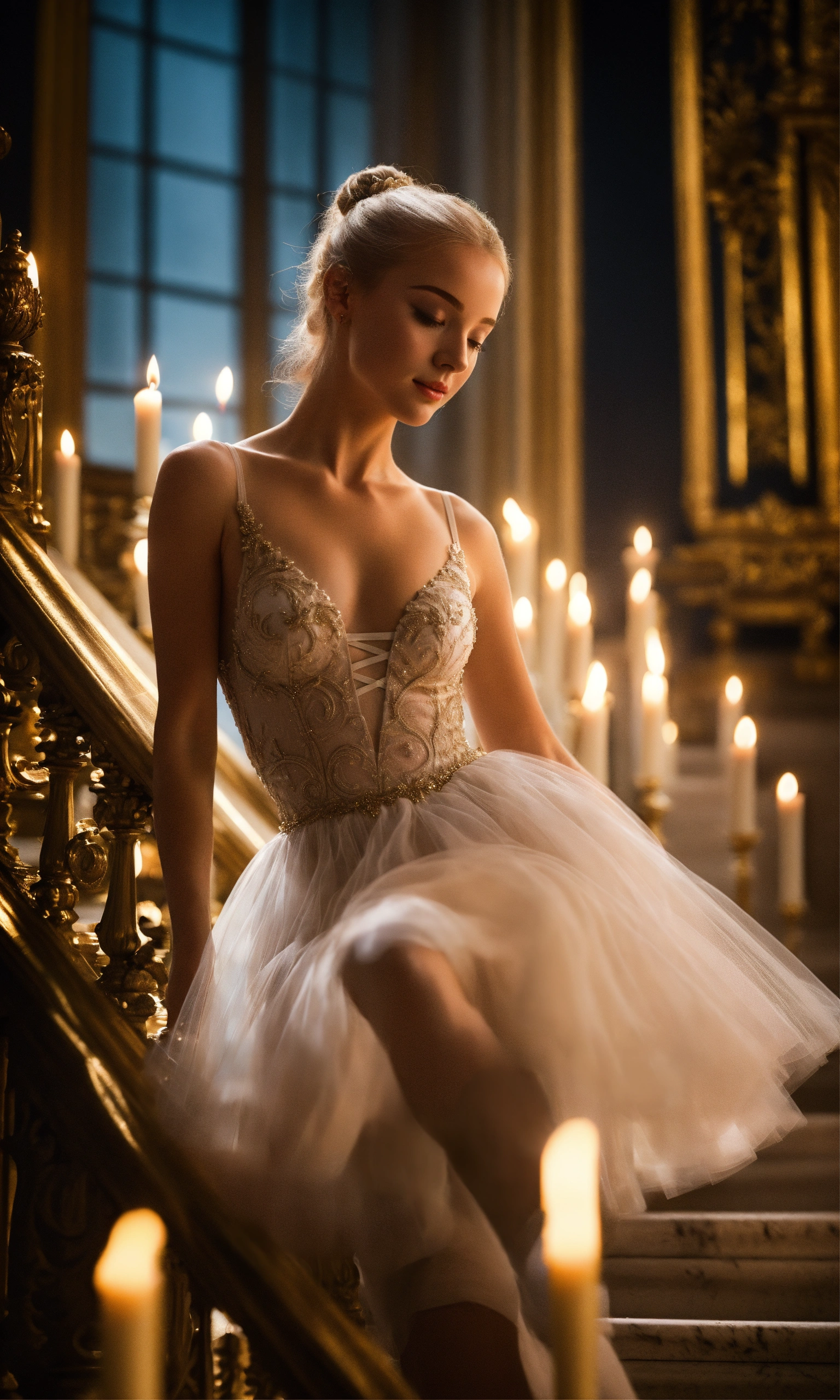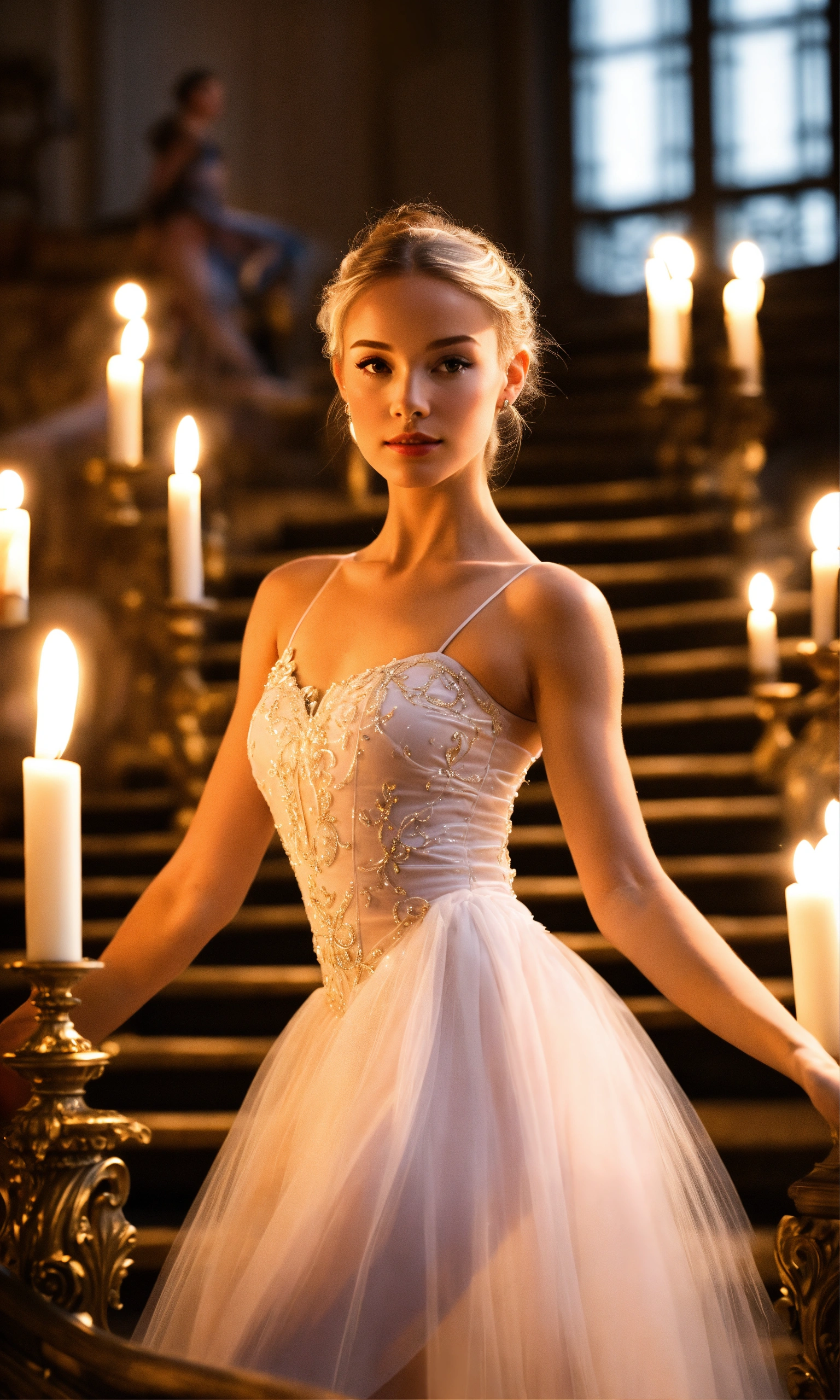 Focus on the face, close-up on the ballerina, ballet dancer, blonde woman, with ballerinas, with a beautiful short white dress with a transparent design, backlighting behind the dancer, photograph, on a staircase of the palace of versailles, with candles, ultra quality, realistic photographic rendering, cinematic, photo with canon eos 5d mark iv, cinematic, realistic, black background, photo fusion, sfx photo.