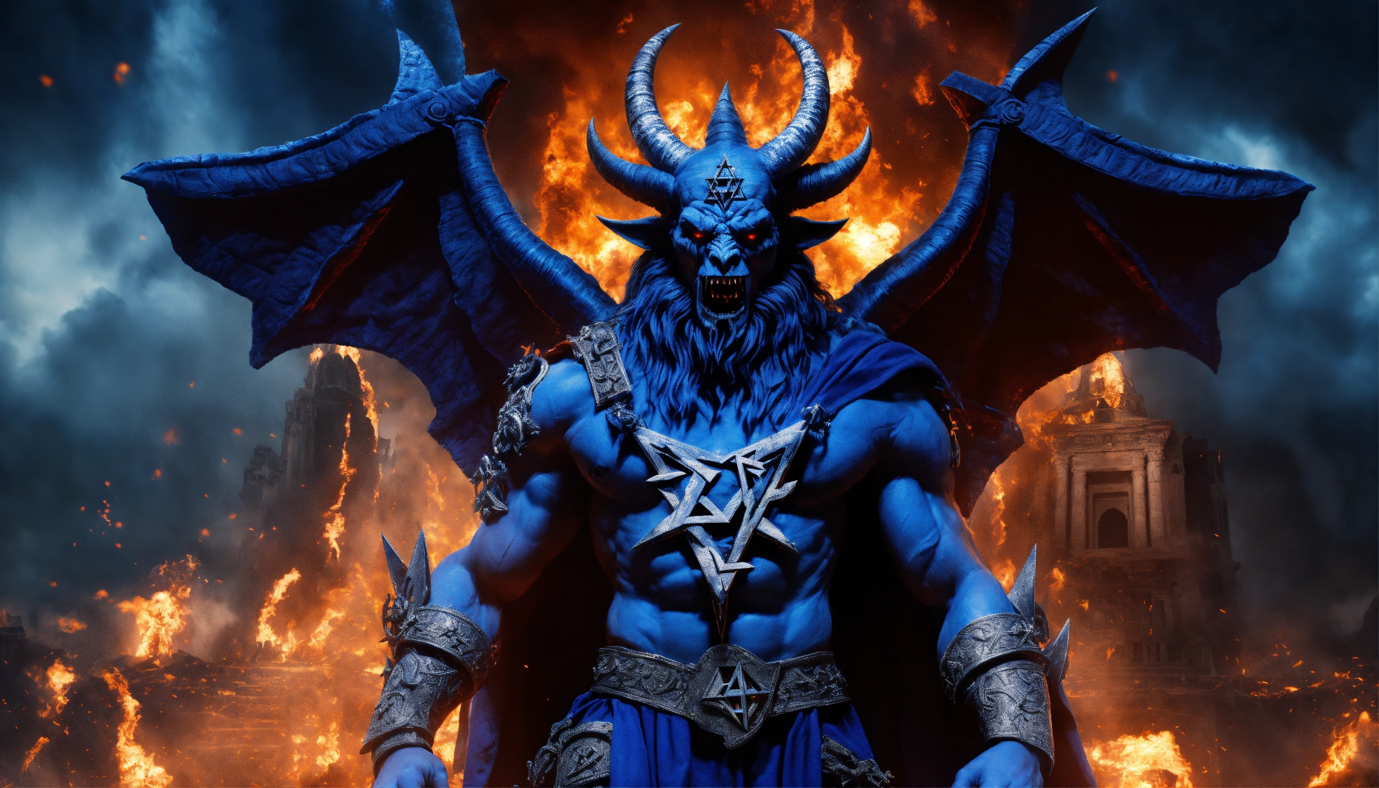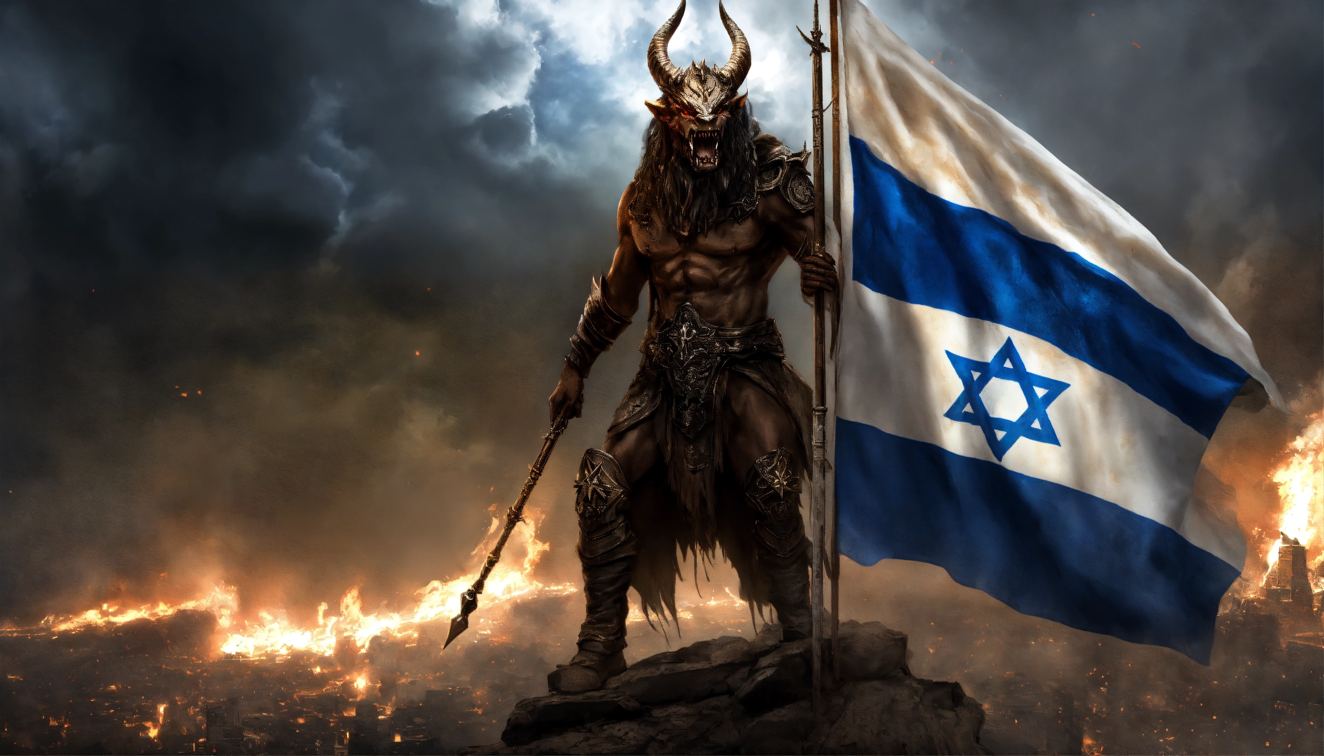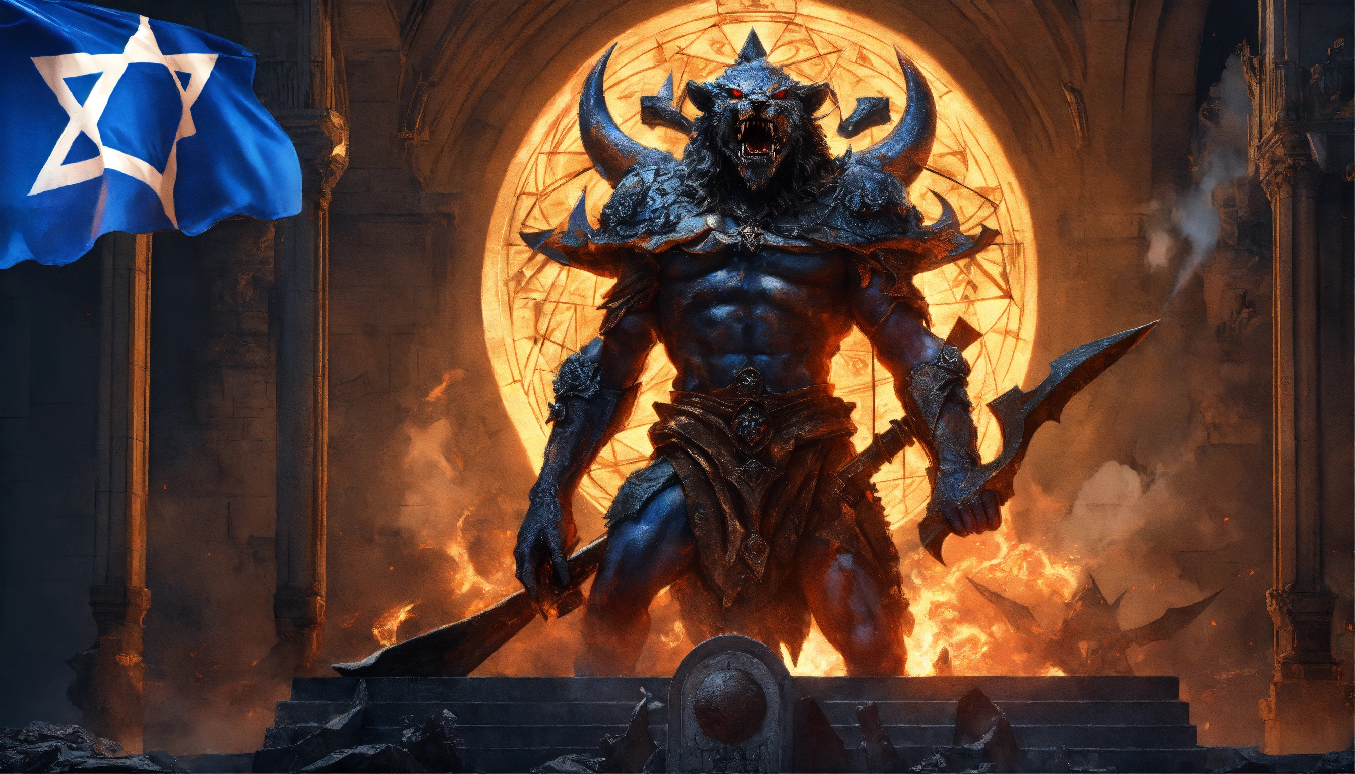 Evil demonic israel demon with an israeli flag and the 6 pointed star of david, beast with an armageddon demon, ominous, inspired by apollyon, highly detailed and realistic, extremely creative and unique, israel flag, star of david, divine inspiration, synagogue of satan, cast in blue and white and destruction, apocalyptic israel